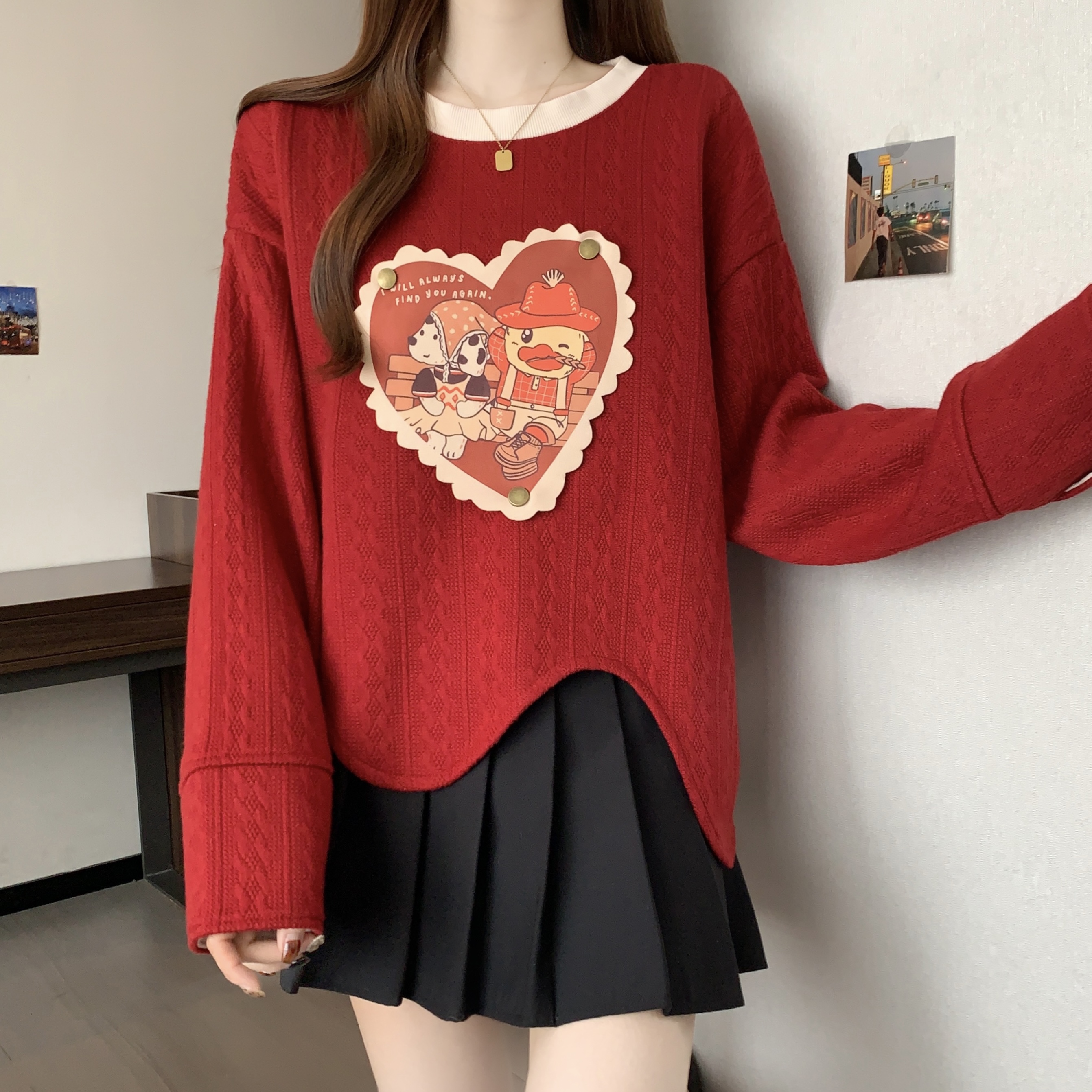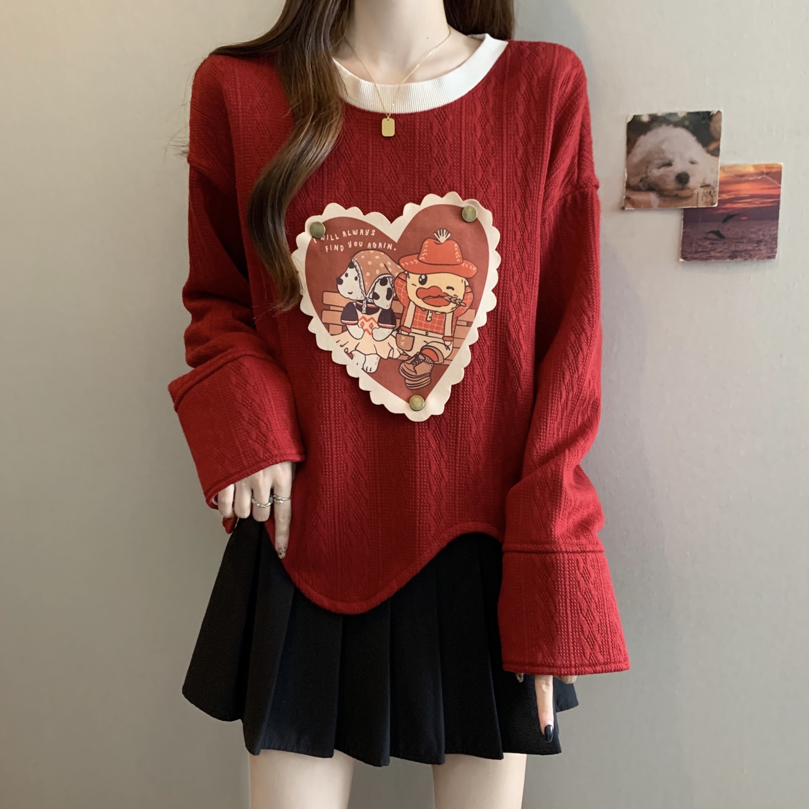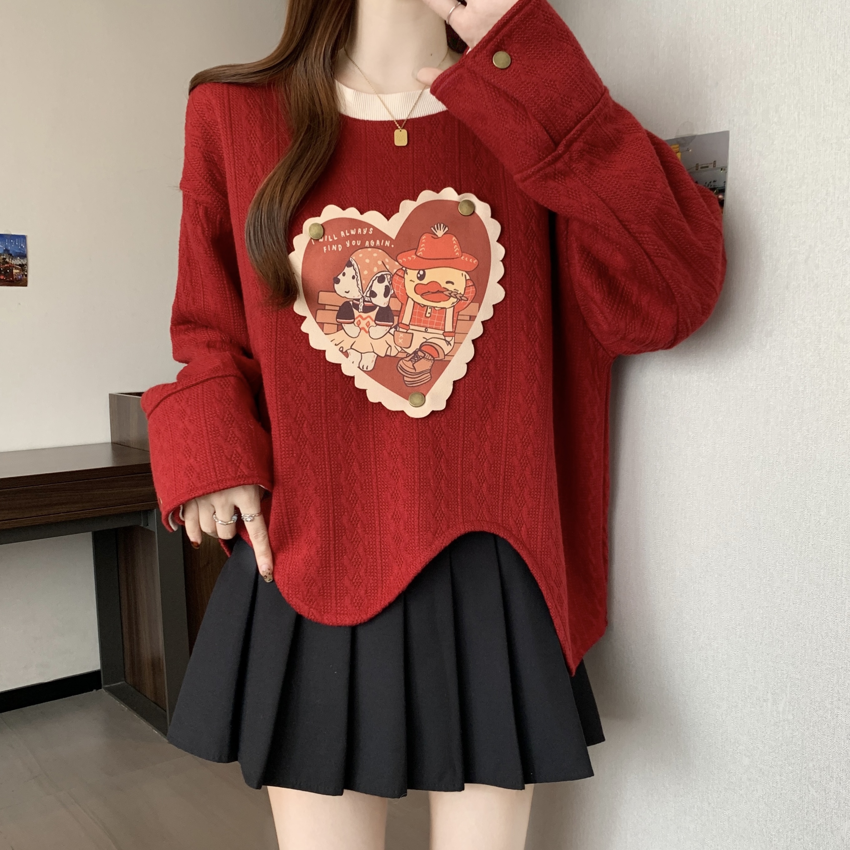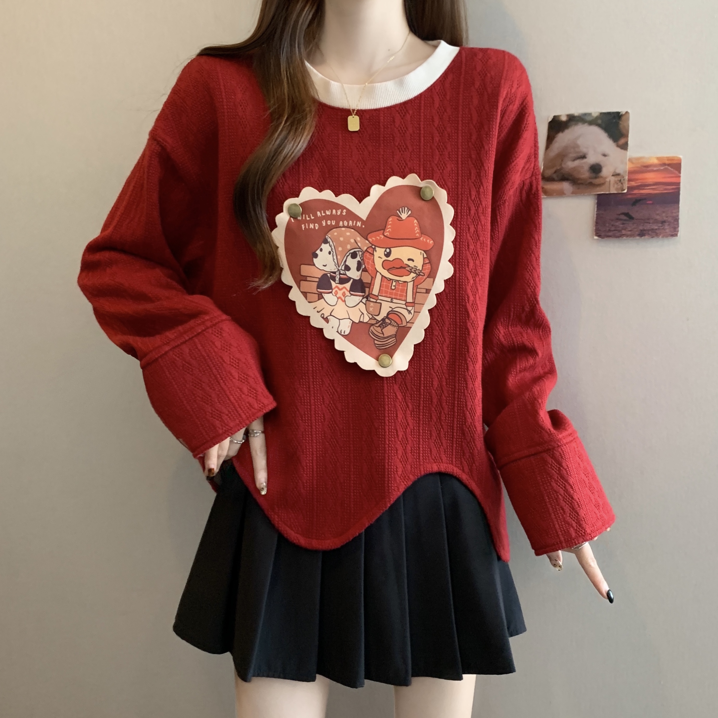 MY14206# 新款大码女装新款时尚设计感不规则爱心印花红色百搭卫衣女裝貨源服裝批發