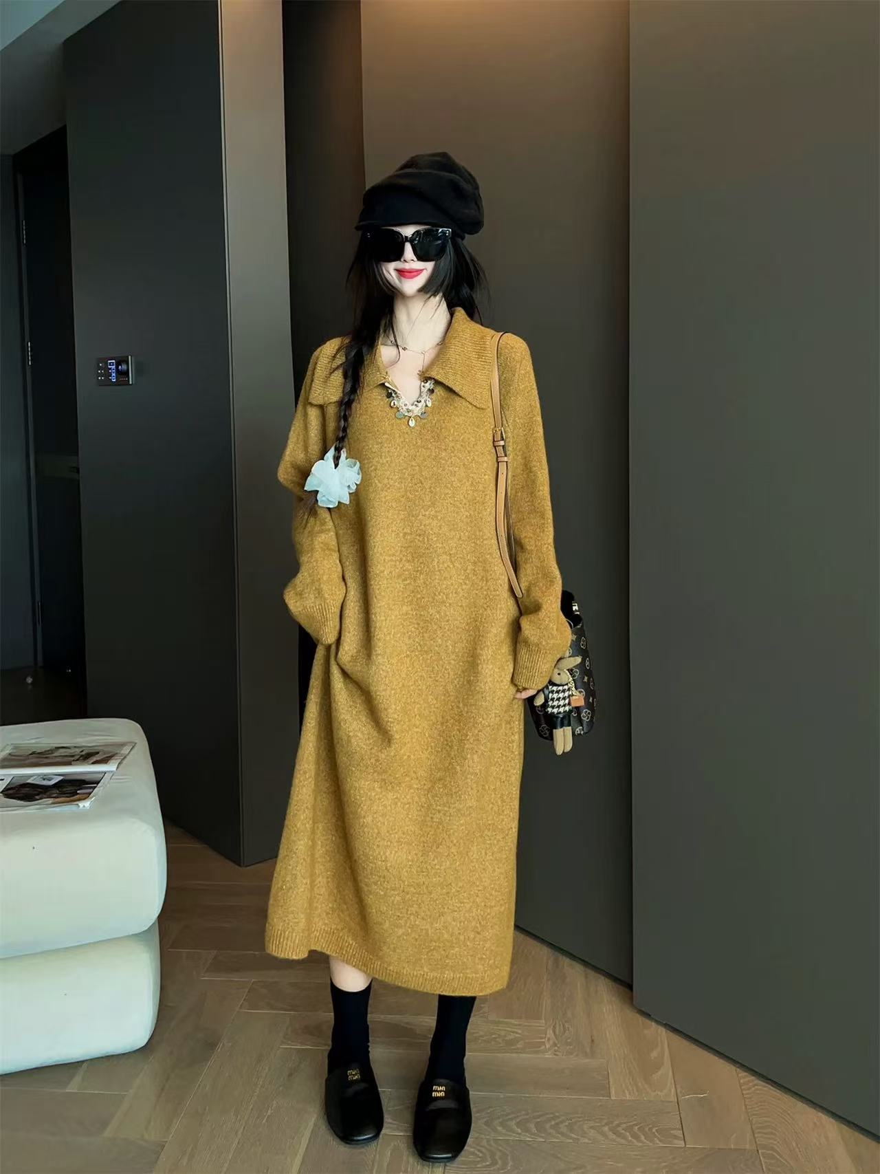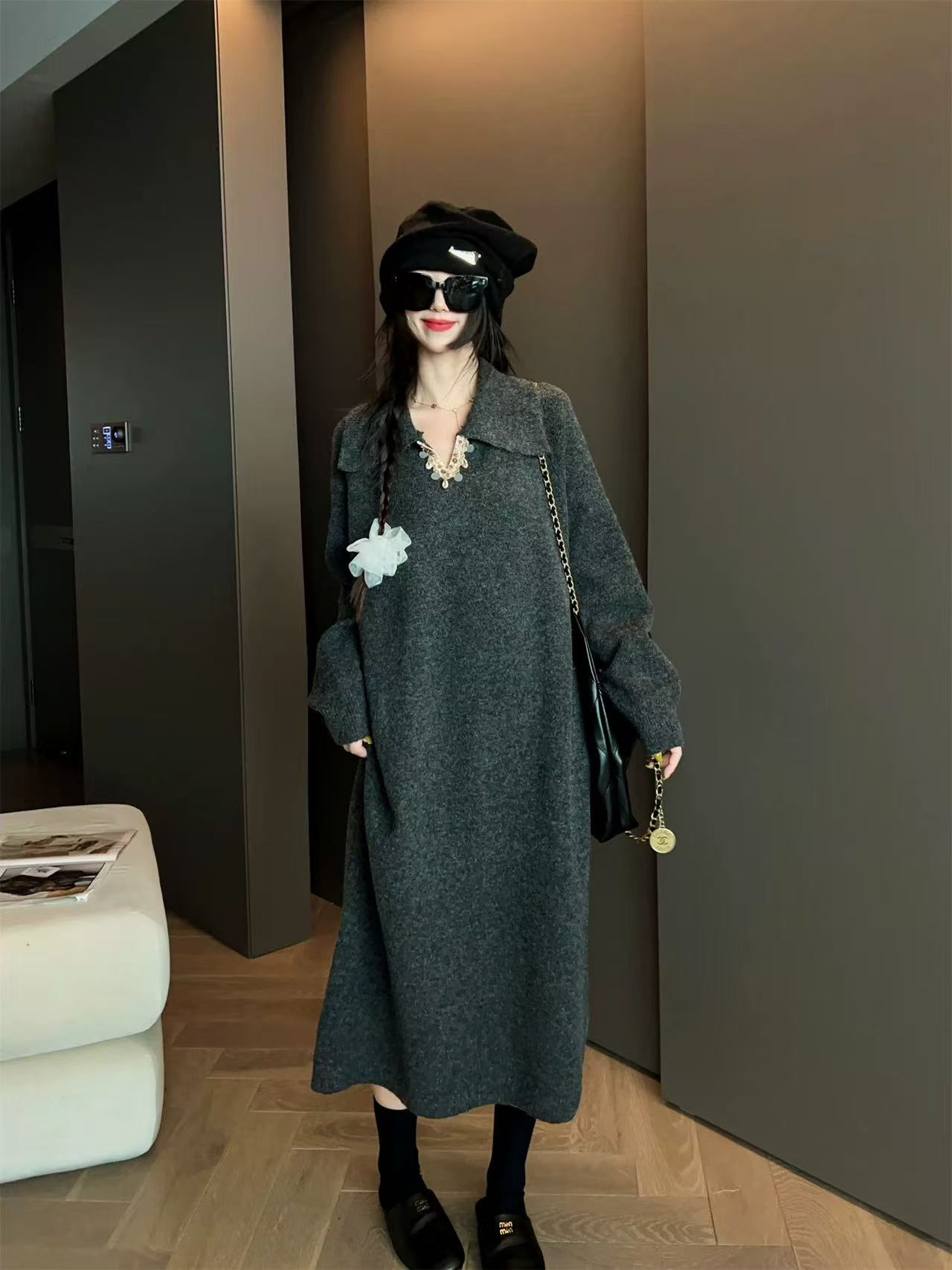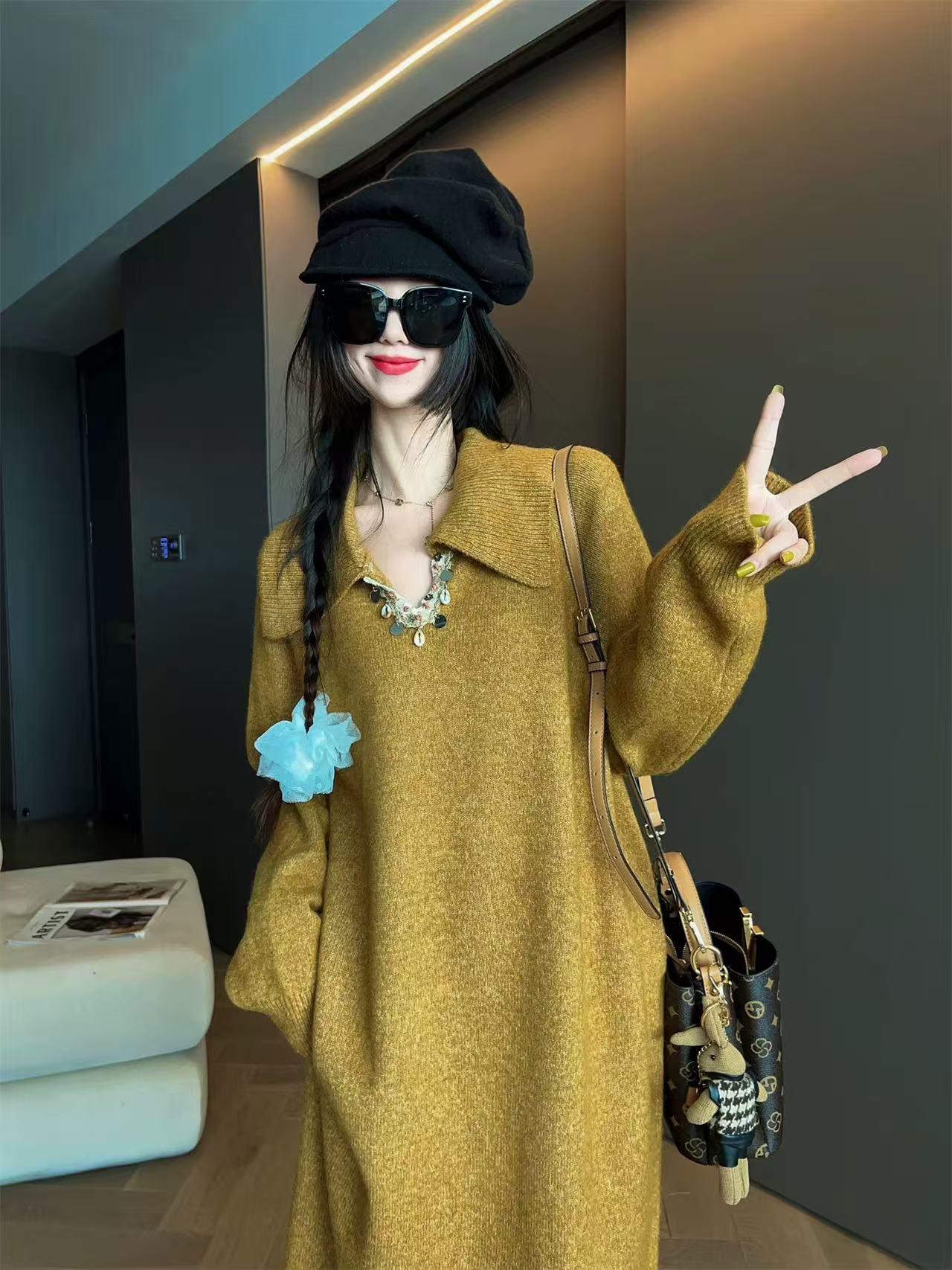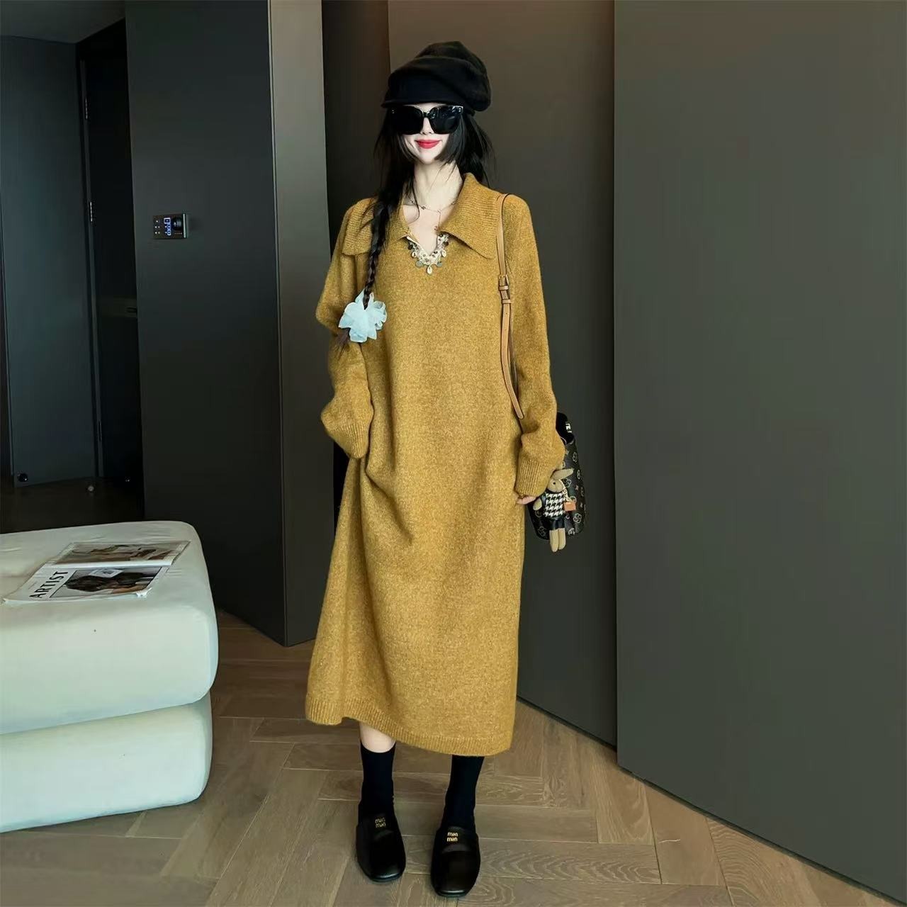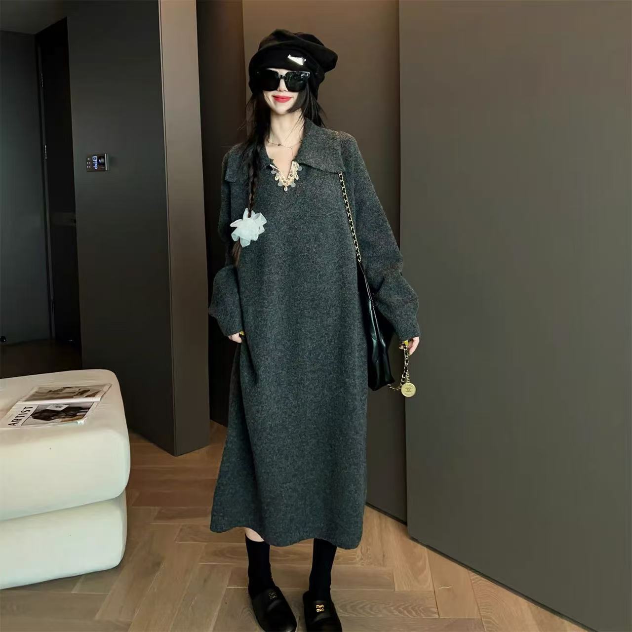 MY14210# MRS SHAO复古v领长款毛衣女装新款宽松休闲慵懒风上衣裙女裝貨源服裝批發
