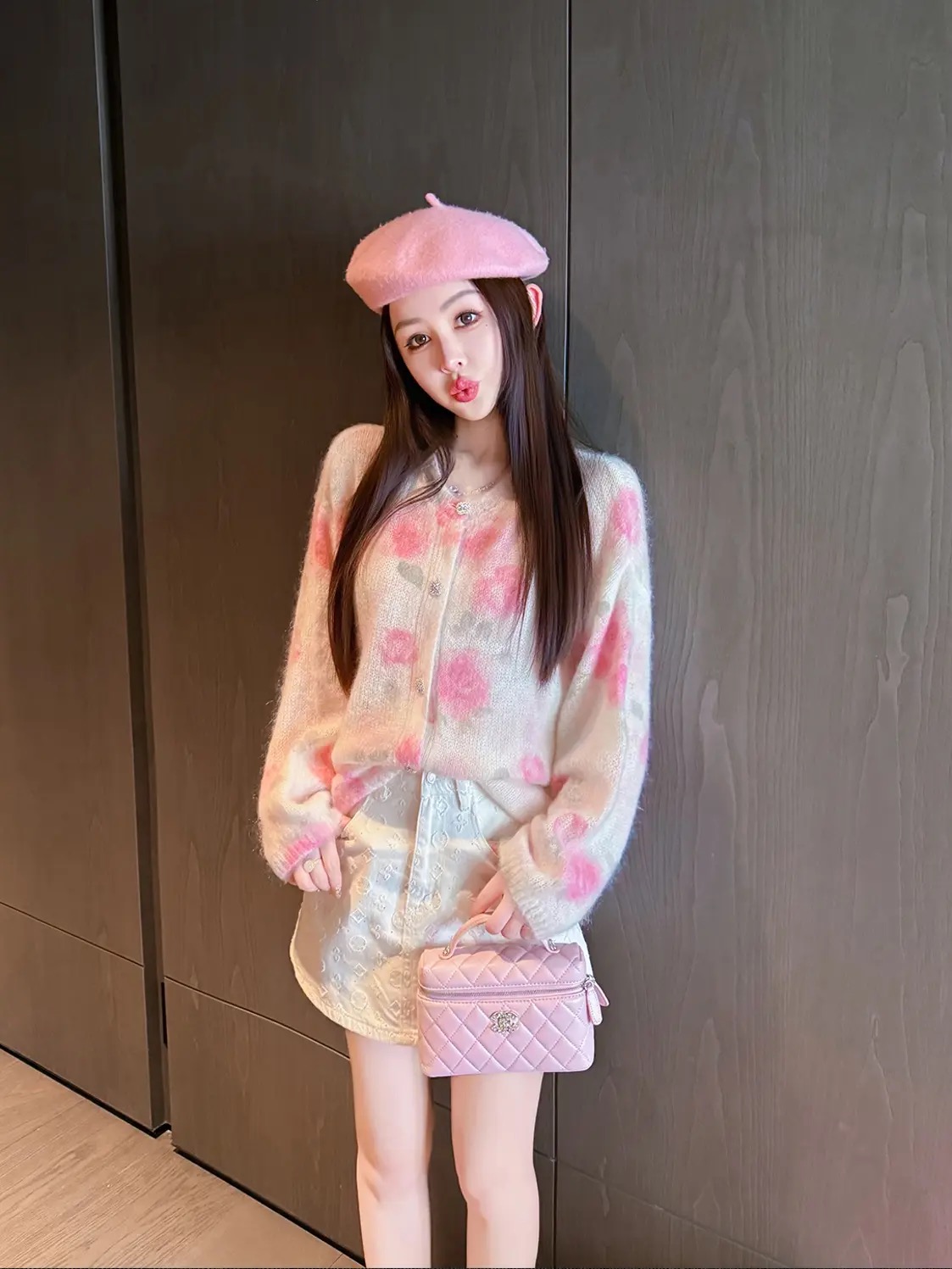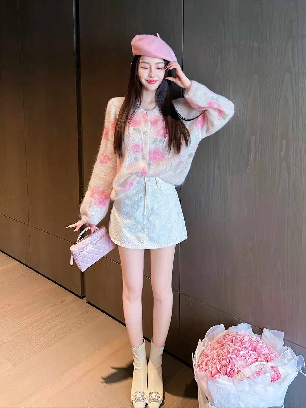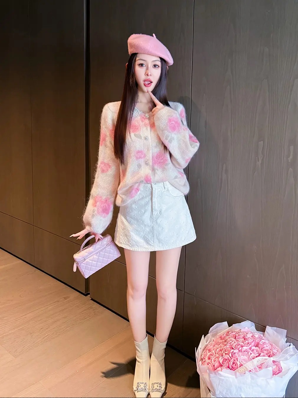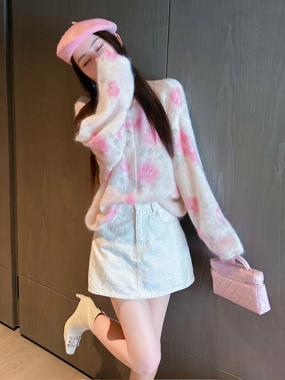MY14212# 玫瑰梦境浪漫粉花印花水钻纽扣马海毛绵羊毛圆领开杉女裝貨源服裝批發