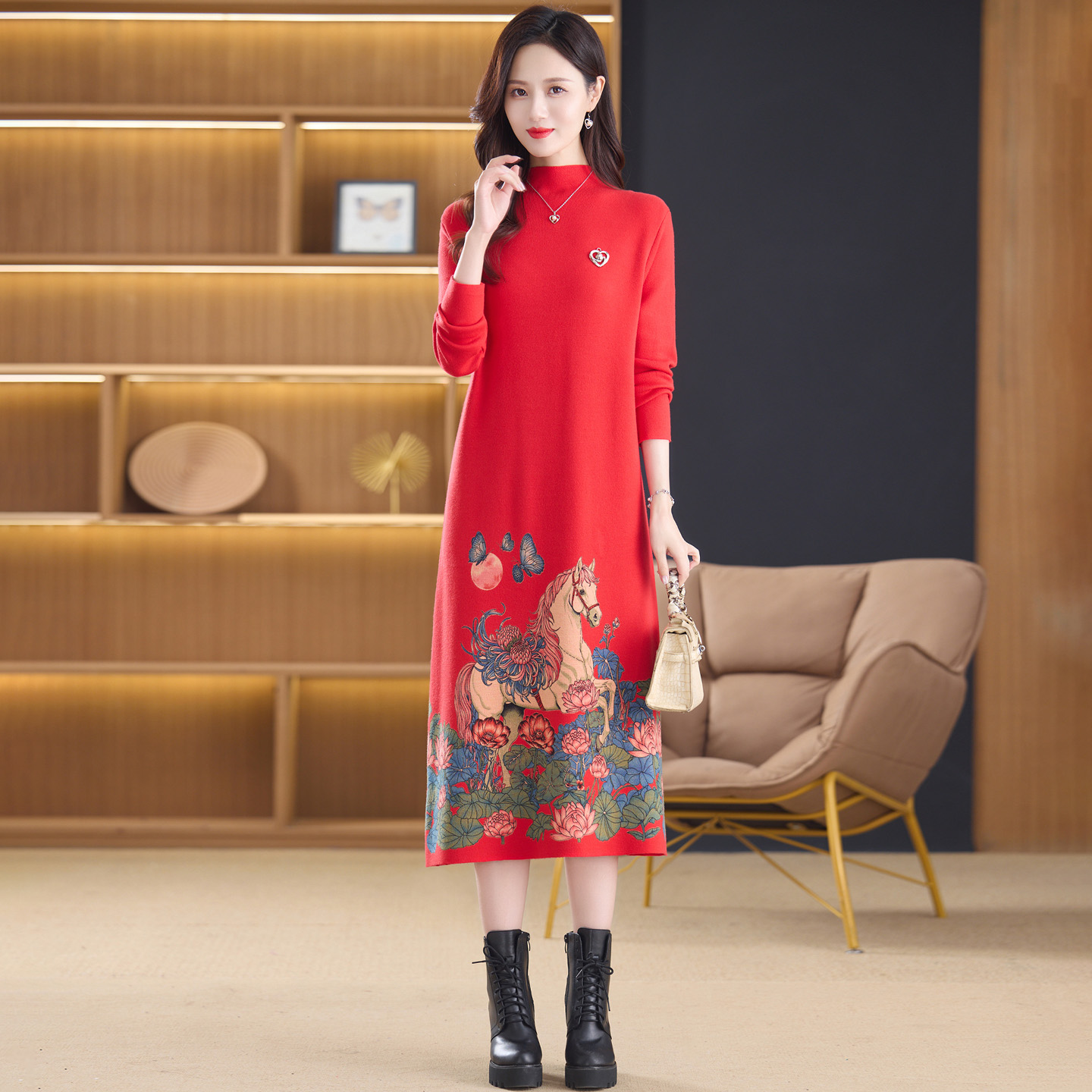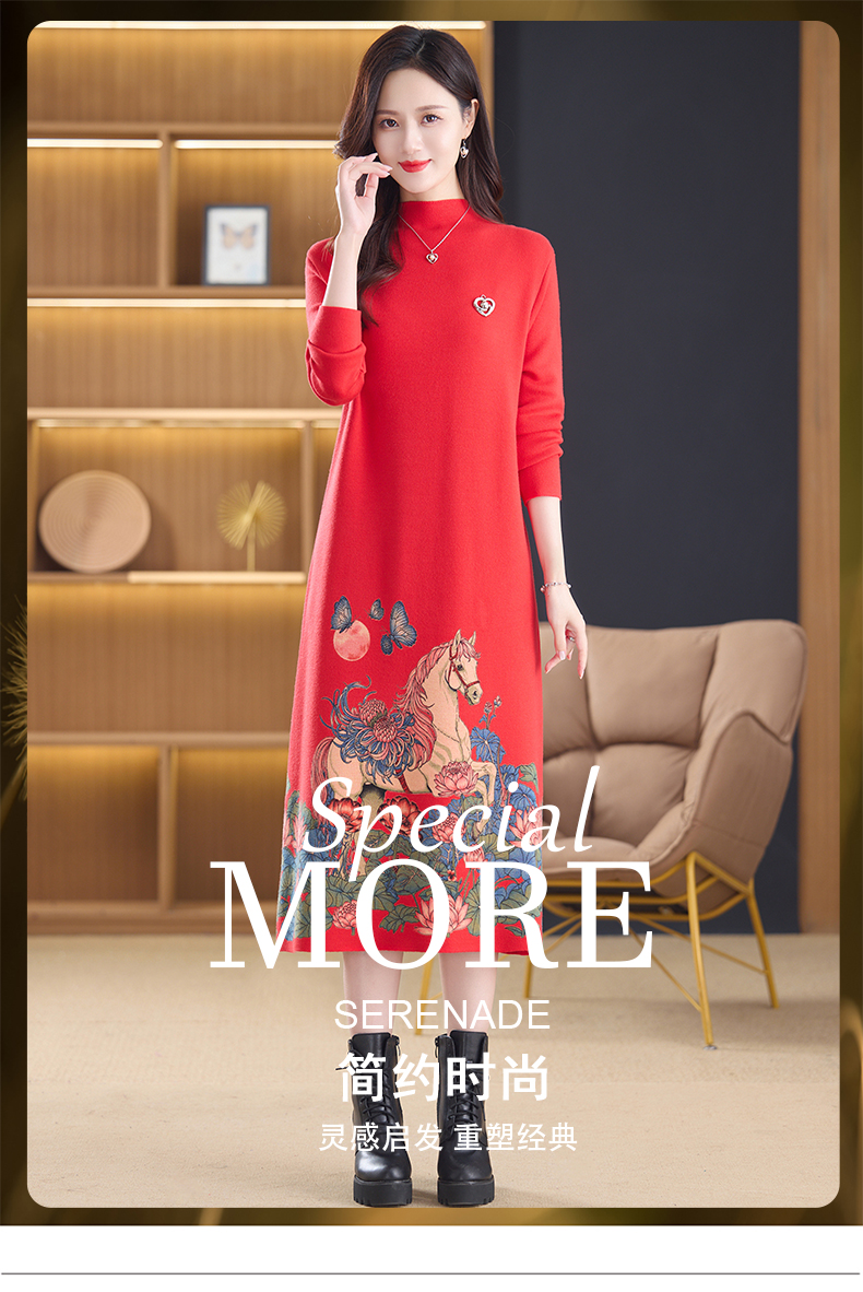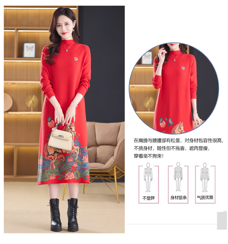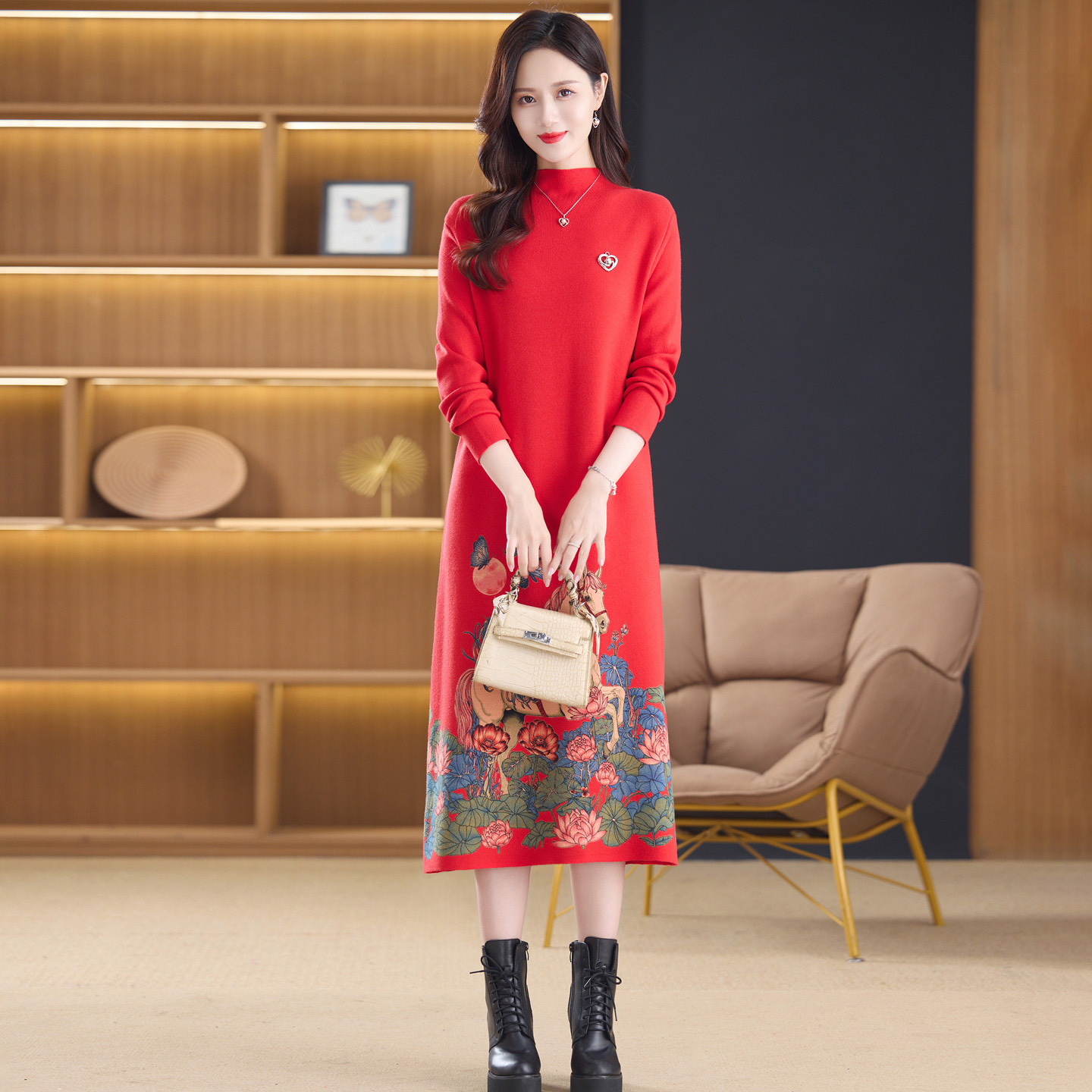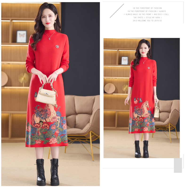MY14393# 针织印花连衣裙新款女装洋气中长款打底毛衣裙子气质显瘦女裝貨源服裝批發