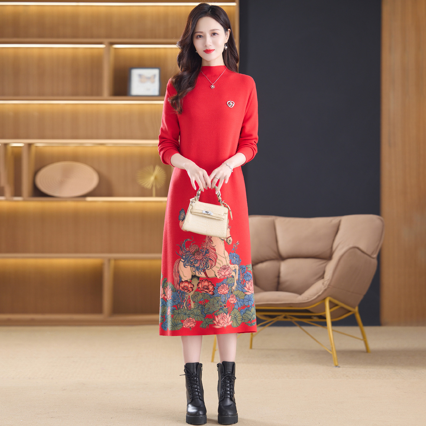 MY14394# 针织印花连衣裙新款女装洋气中长款打底毛衣裙子气质显瘦女裝...