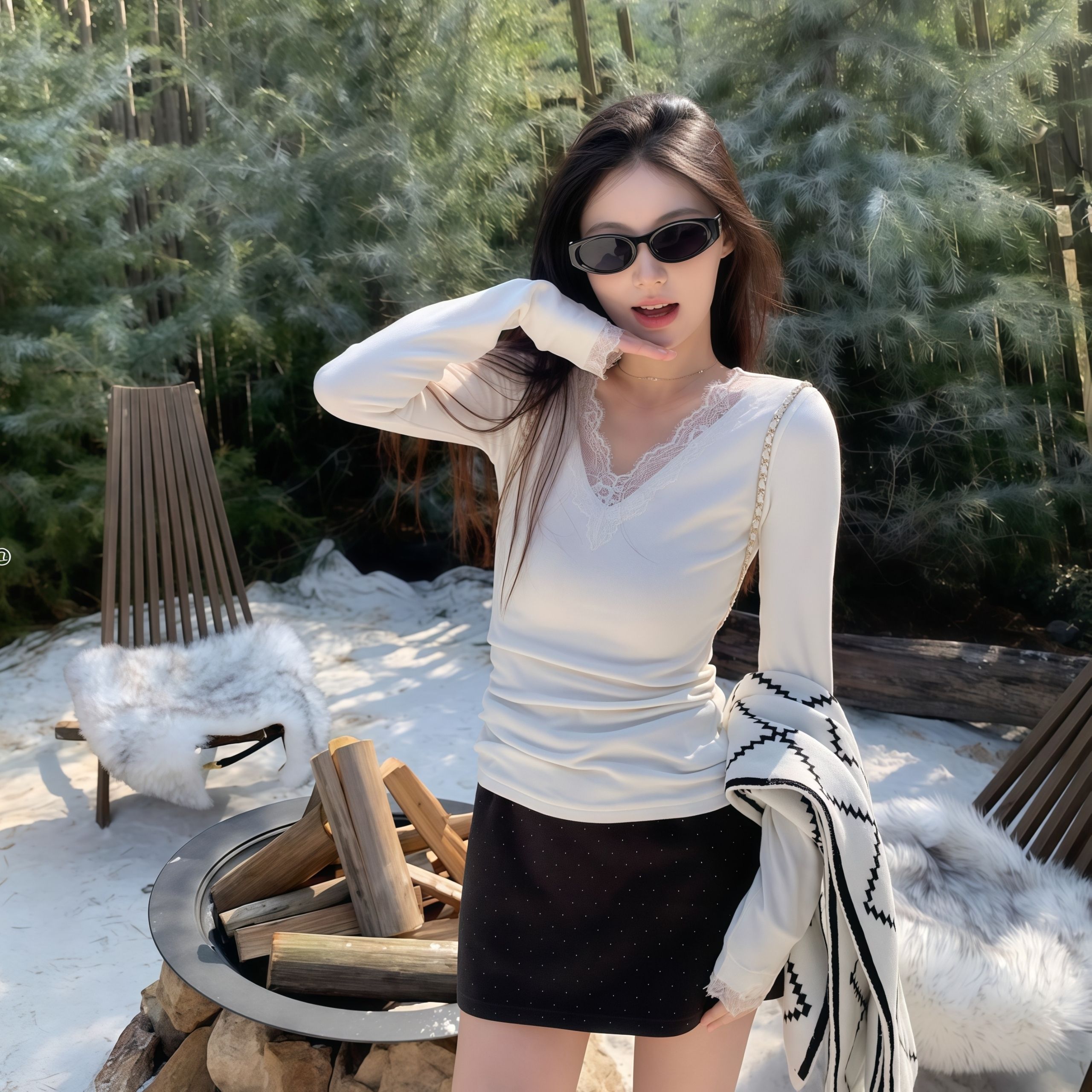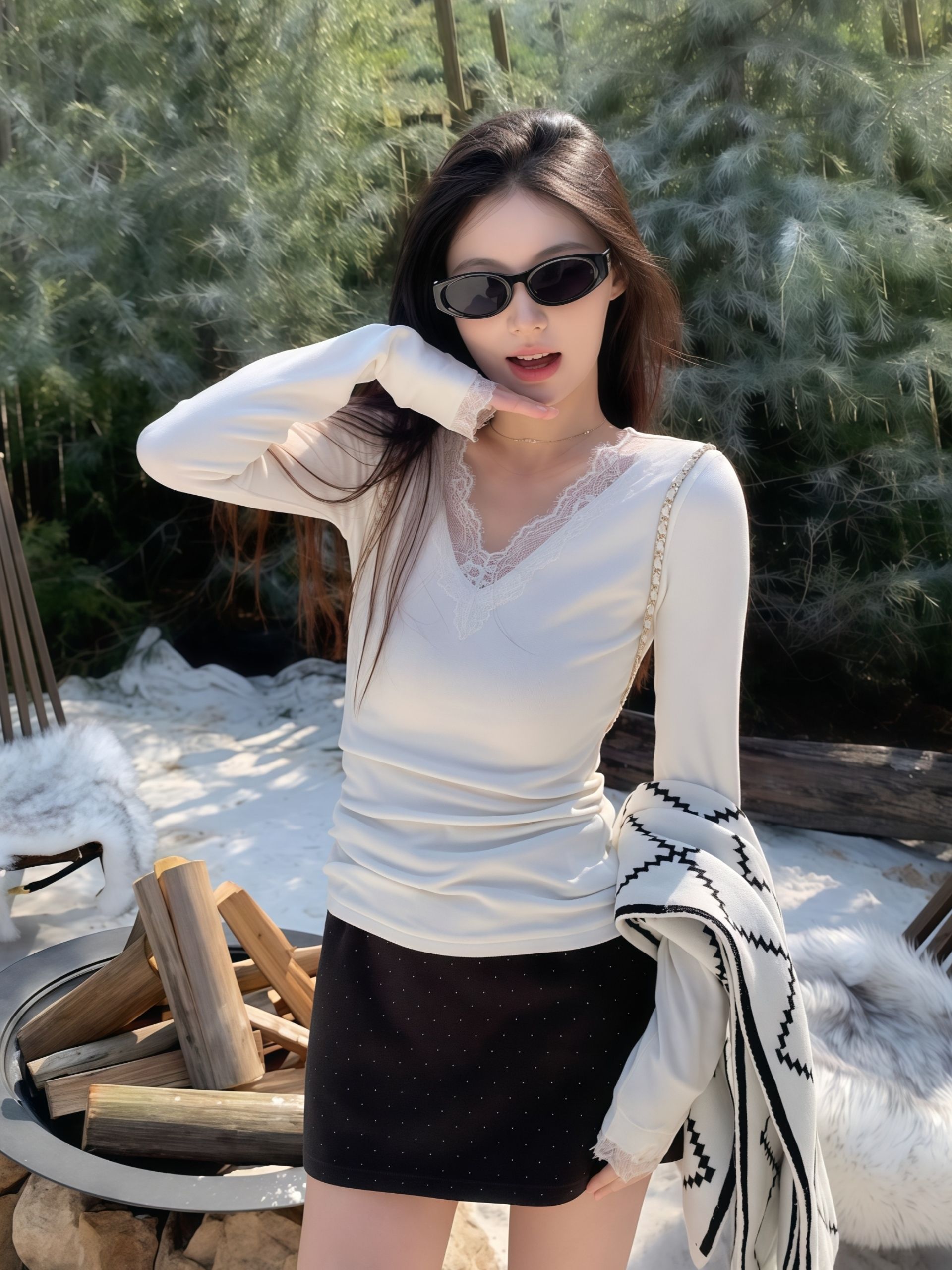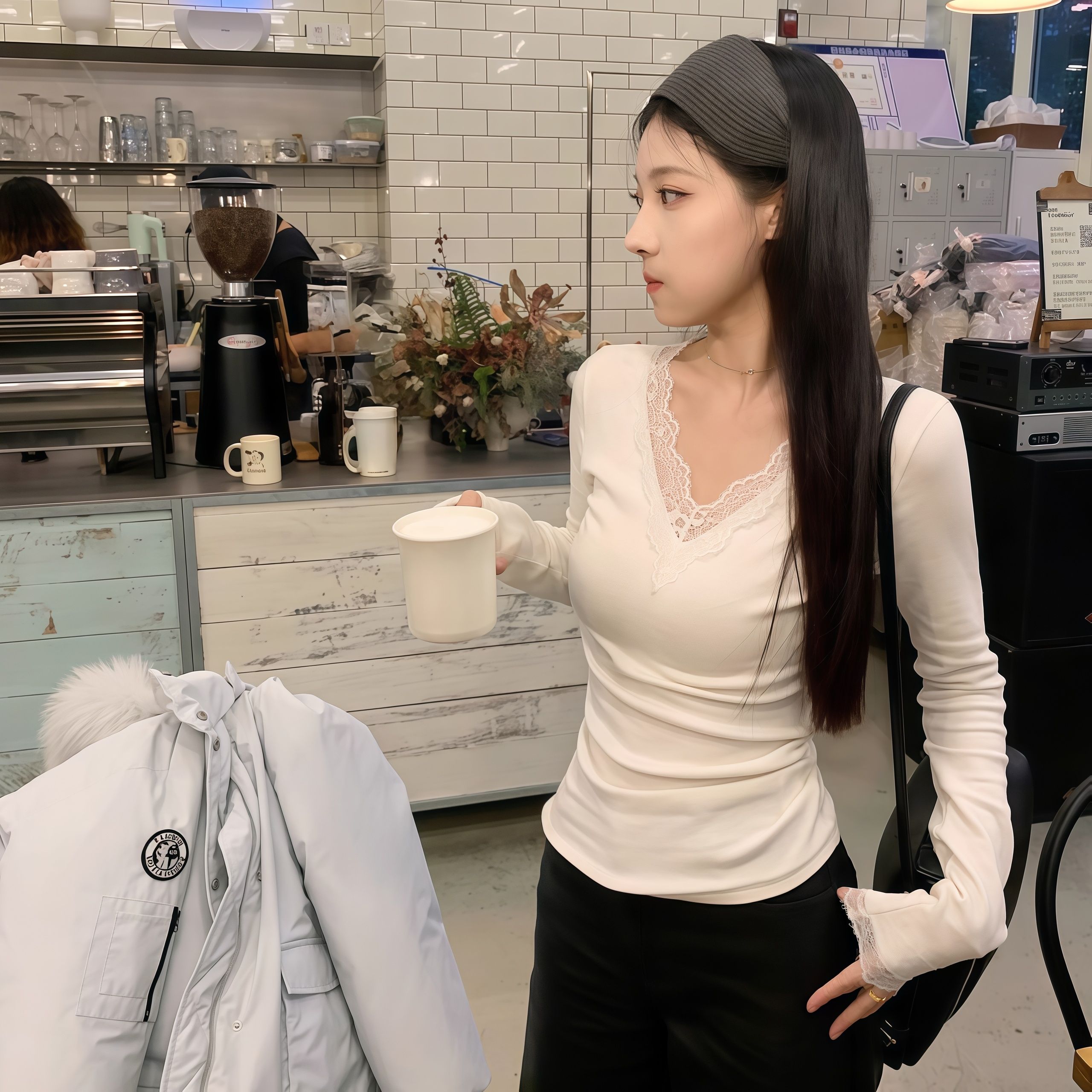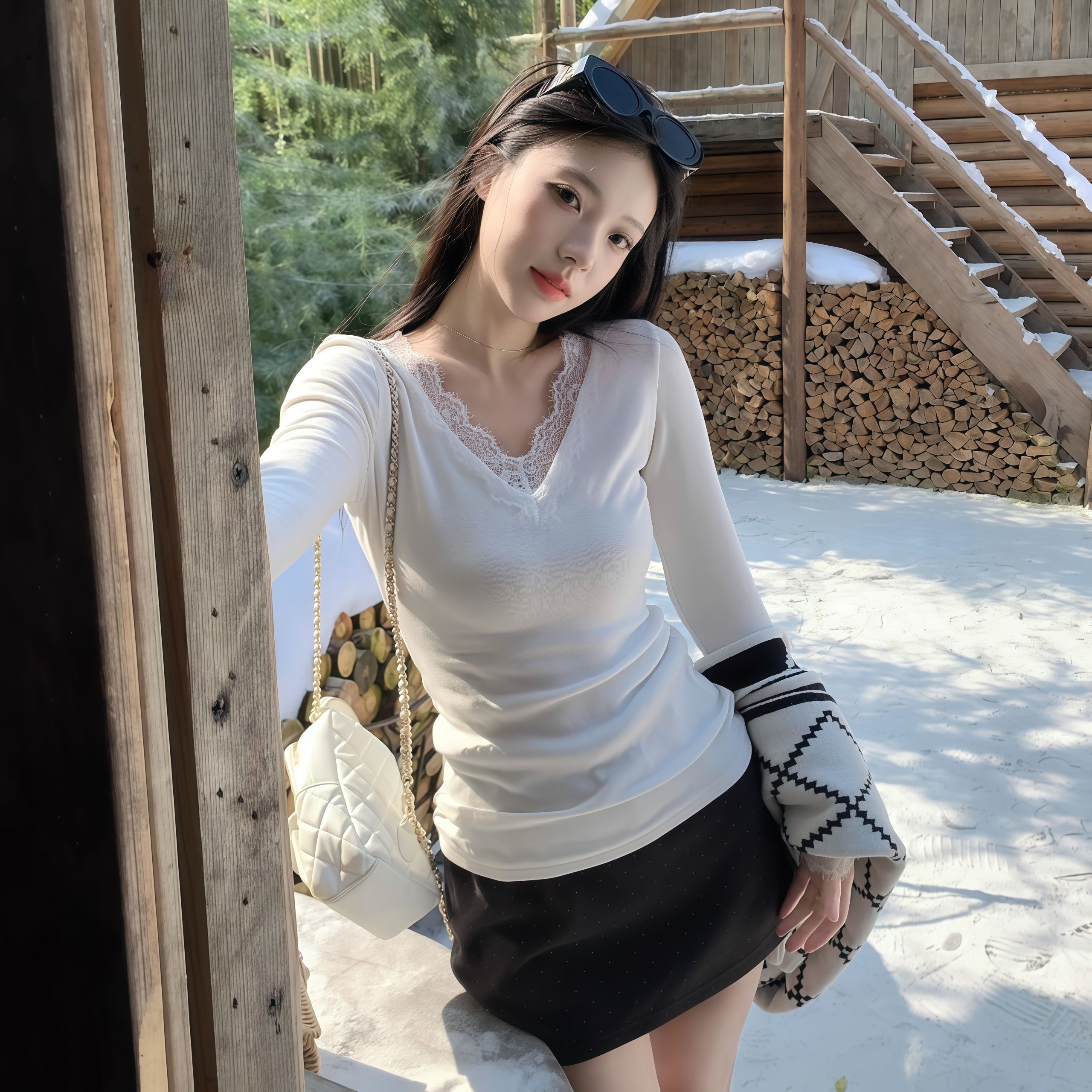 MY14406# 甜辣妹白色蕾丝花边V领打底衫纯欲风长袖上衣女裝貨源服裝批發