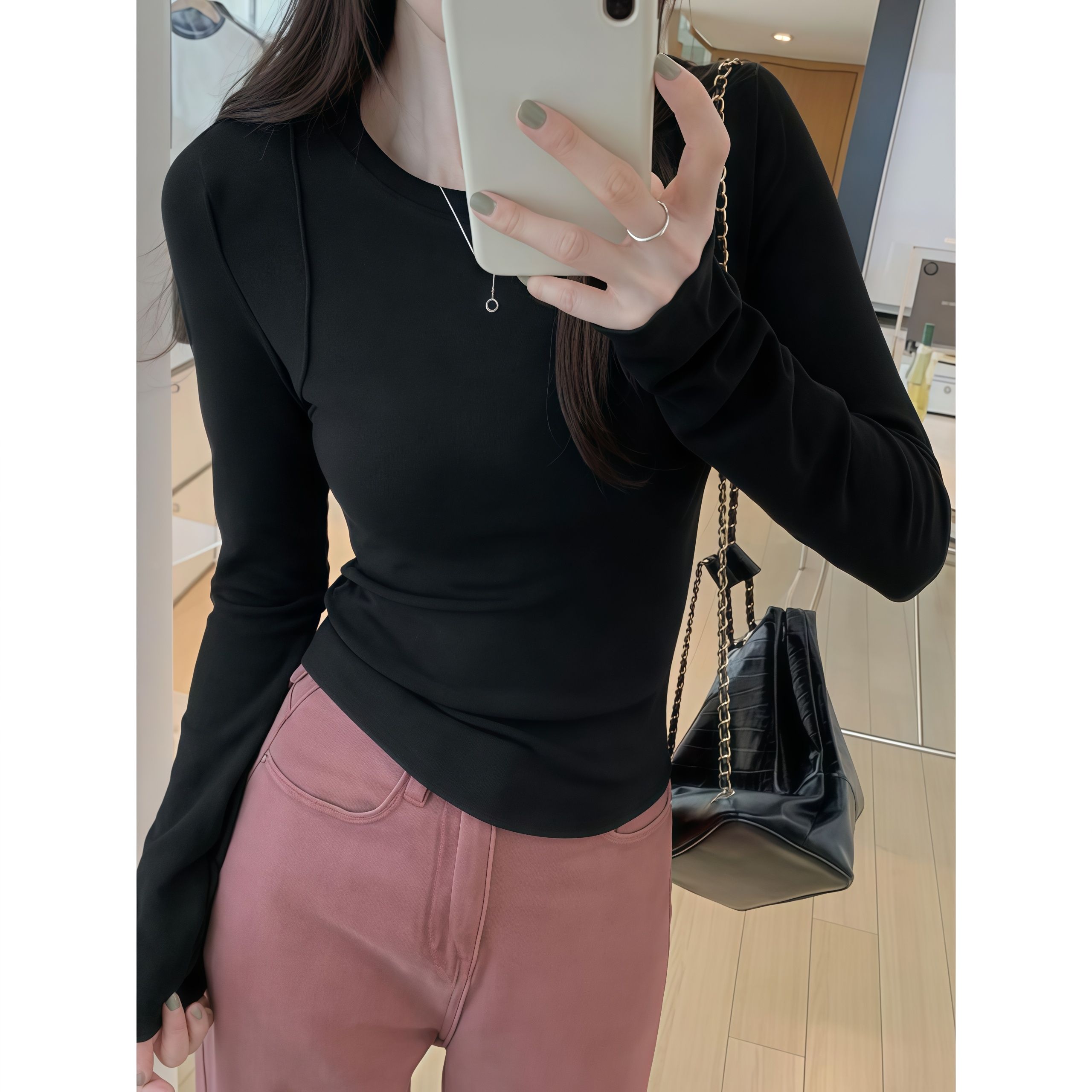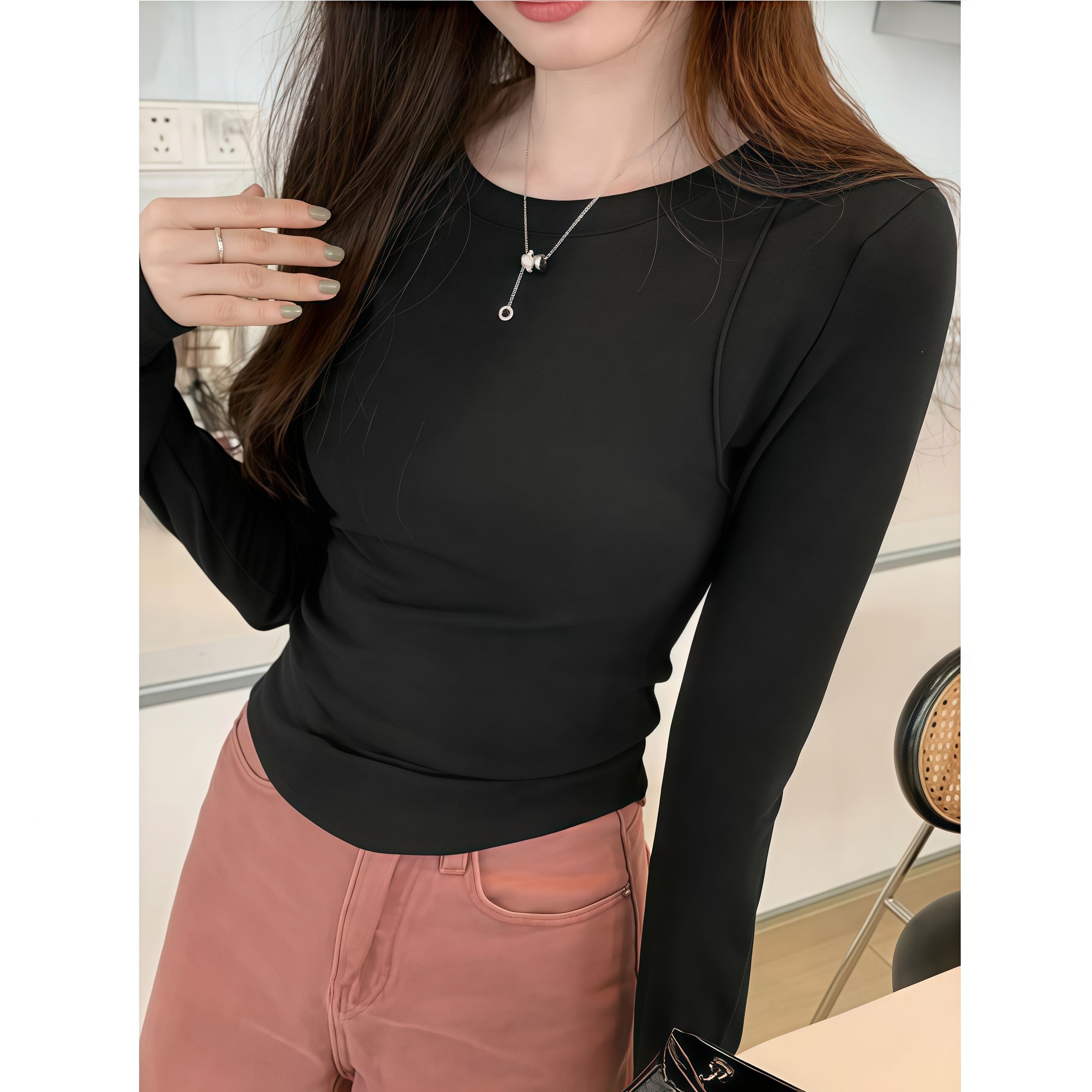 MY14409# ch纯色净版美式正肩长袖t恤新款chic修身鱼骨打底衫上衣女裝貨源服裝批發