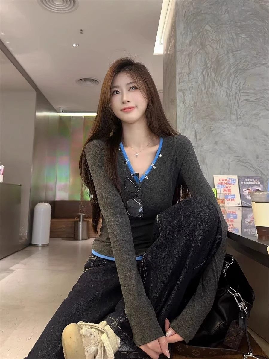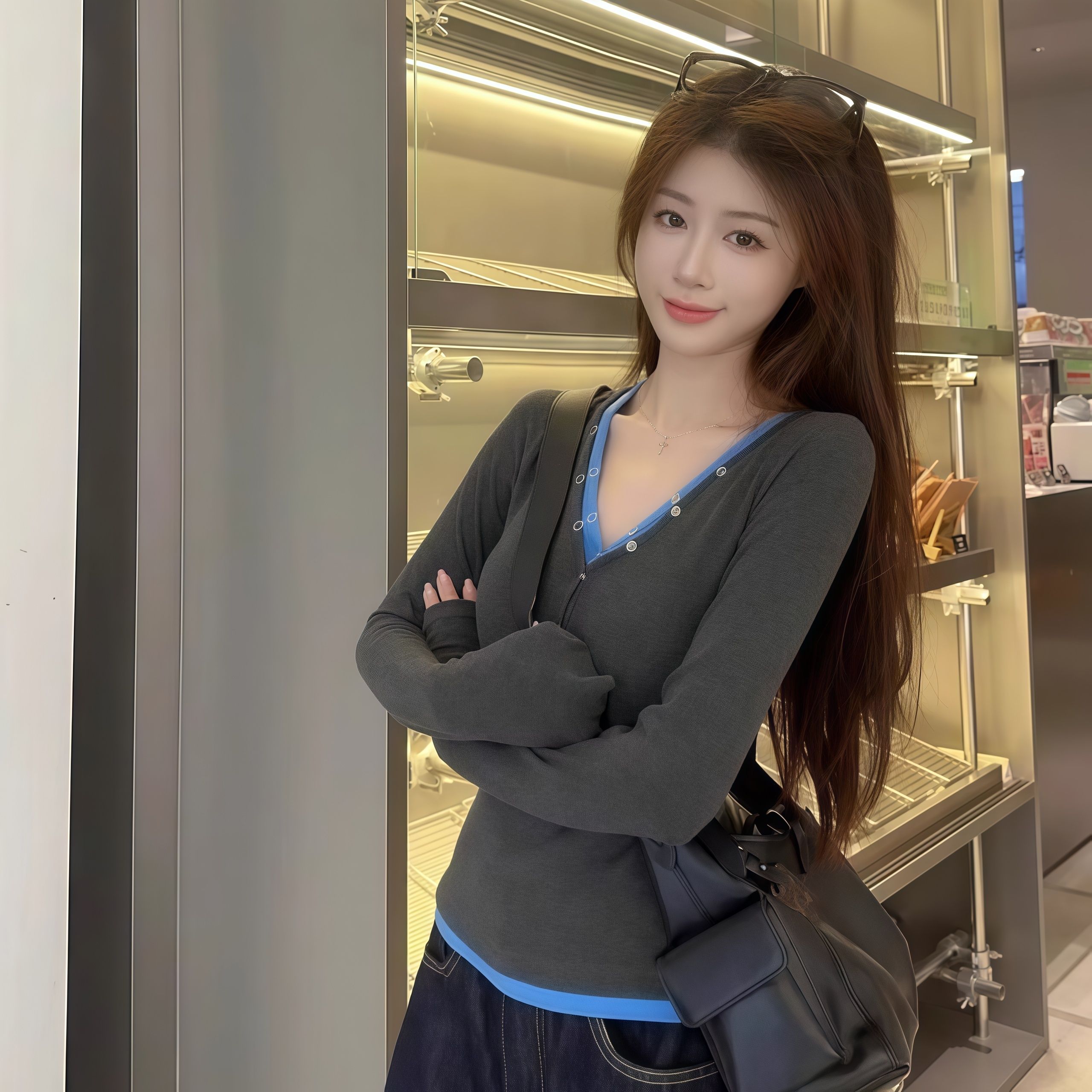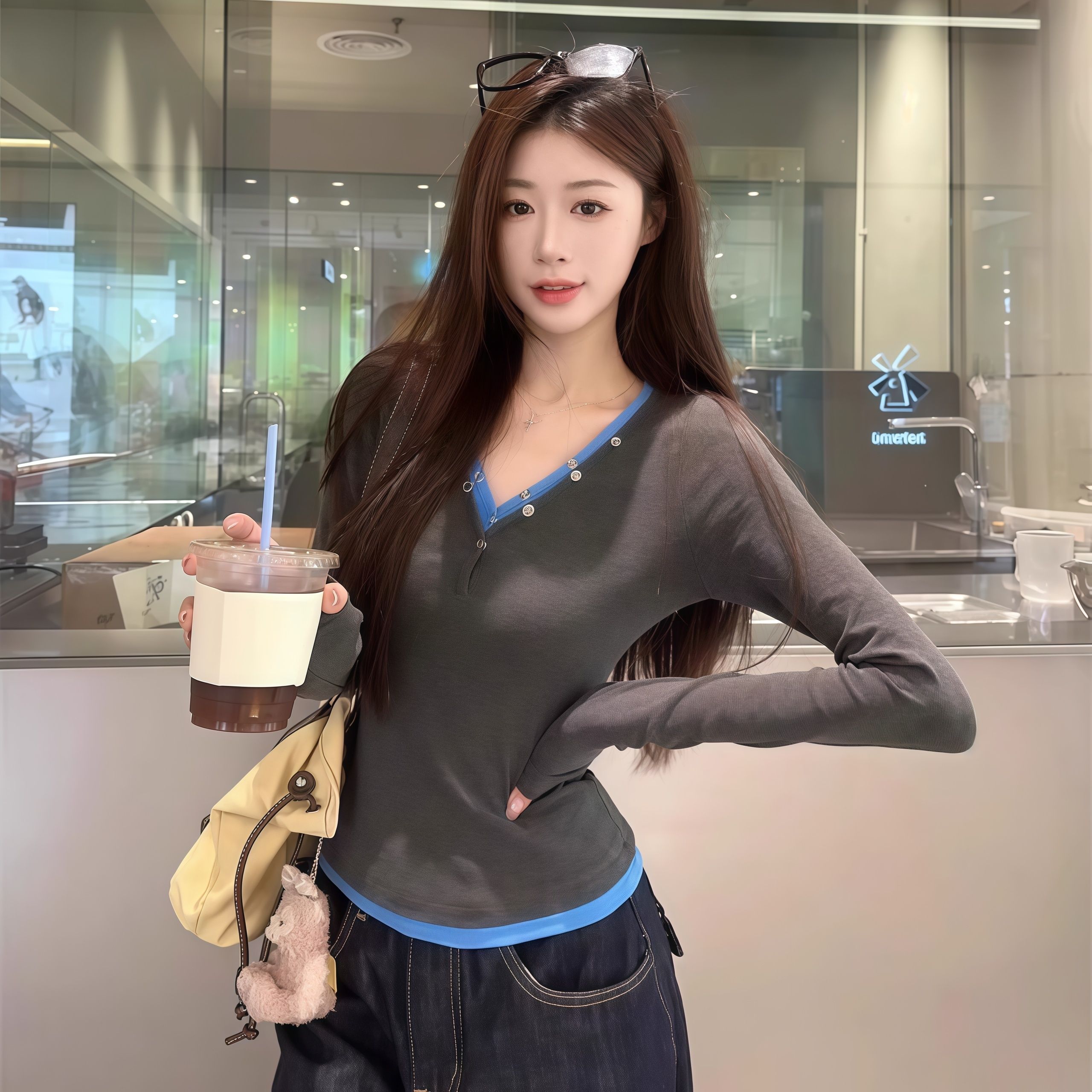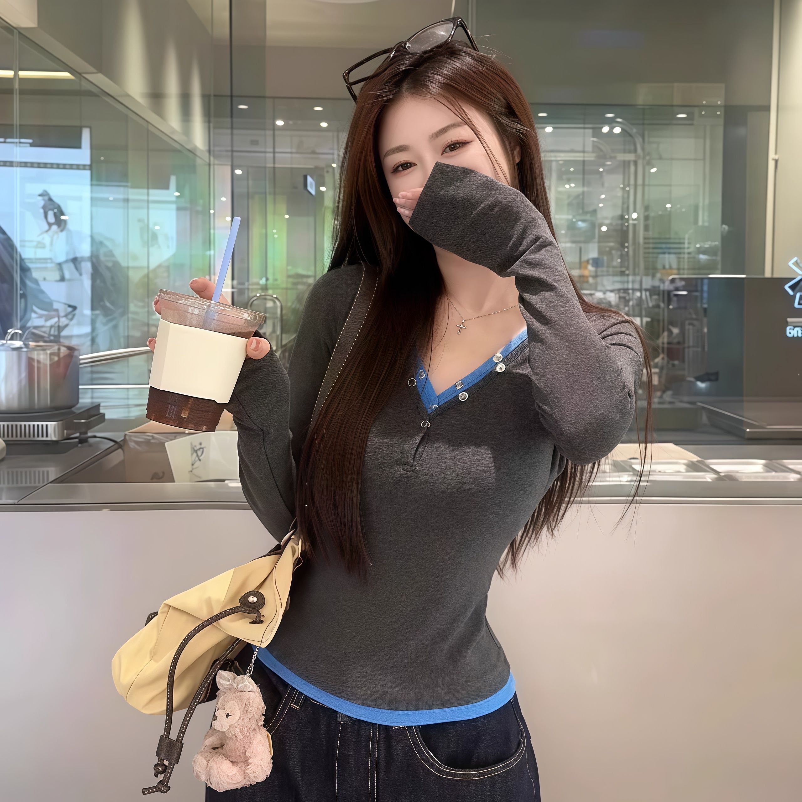 MY14410# 美式拼接撞色V领长袖T恤女内搭打底衫修身假两件上衣女裝貨源服裝批發