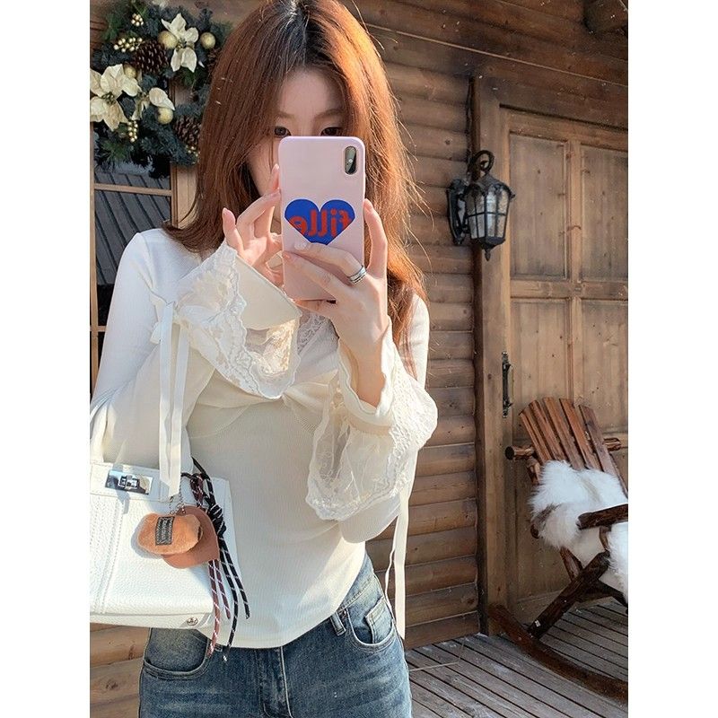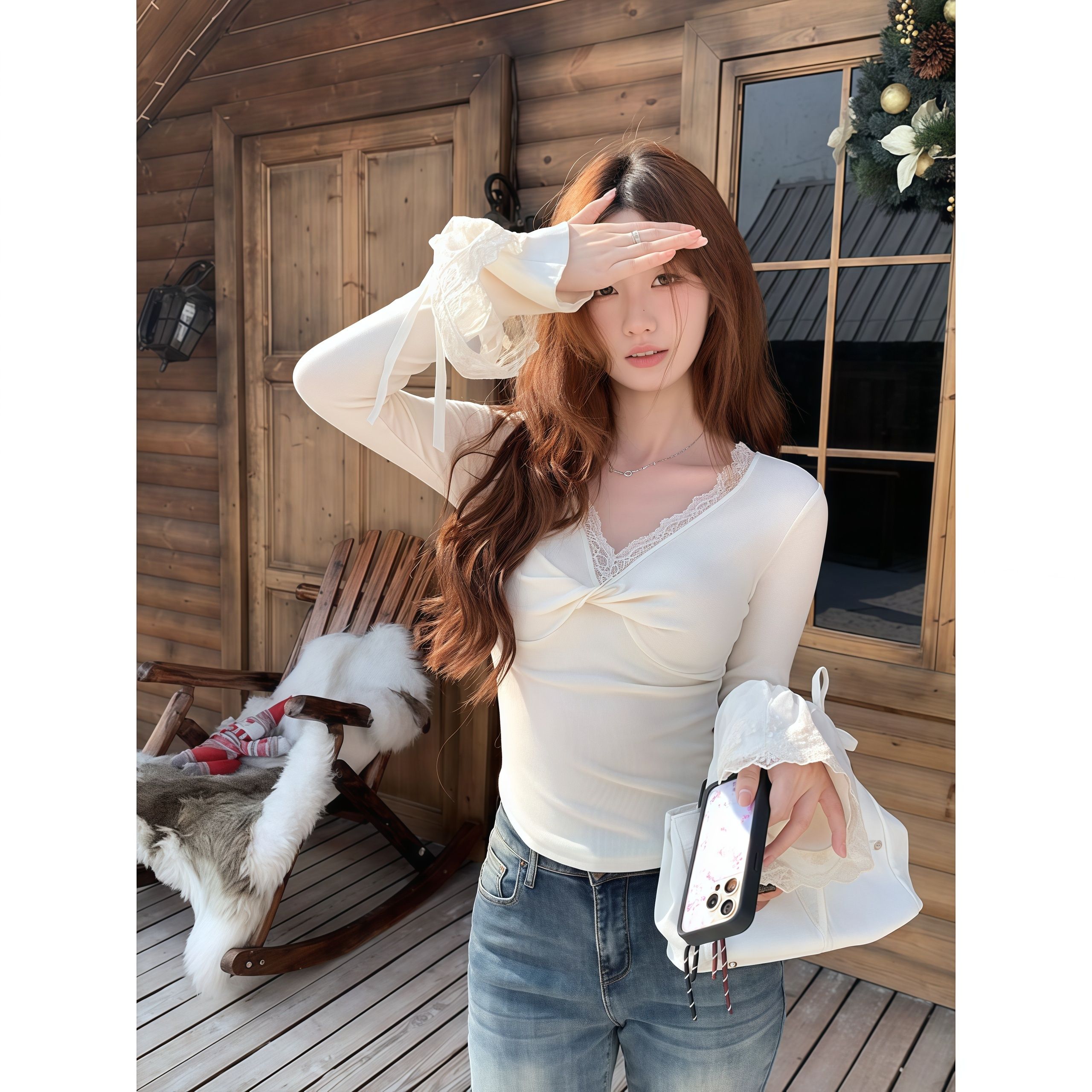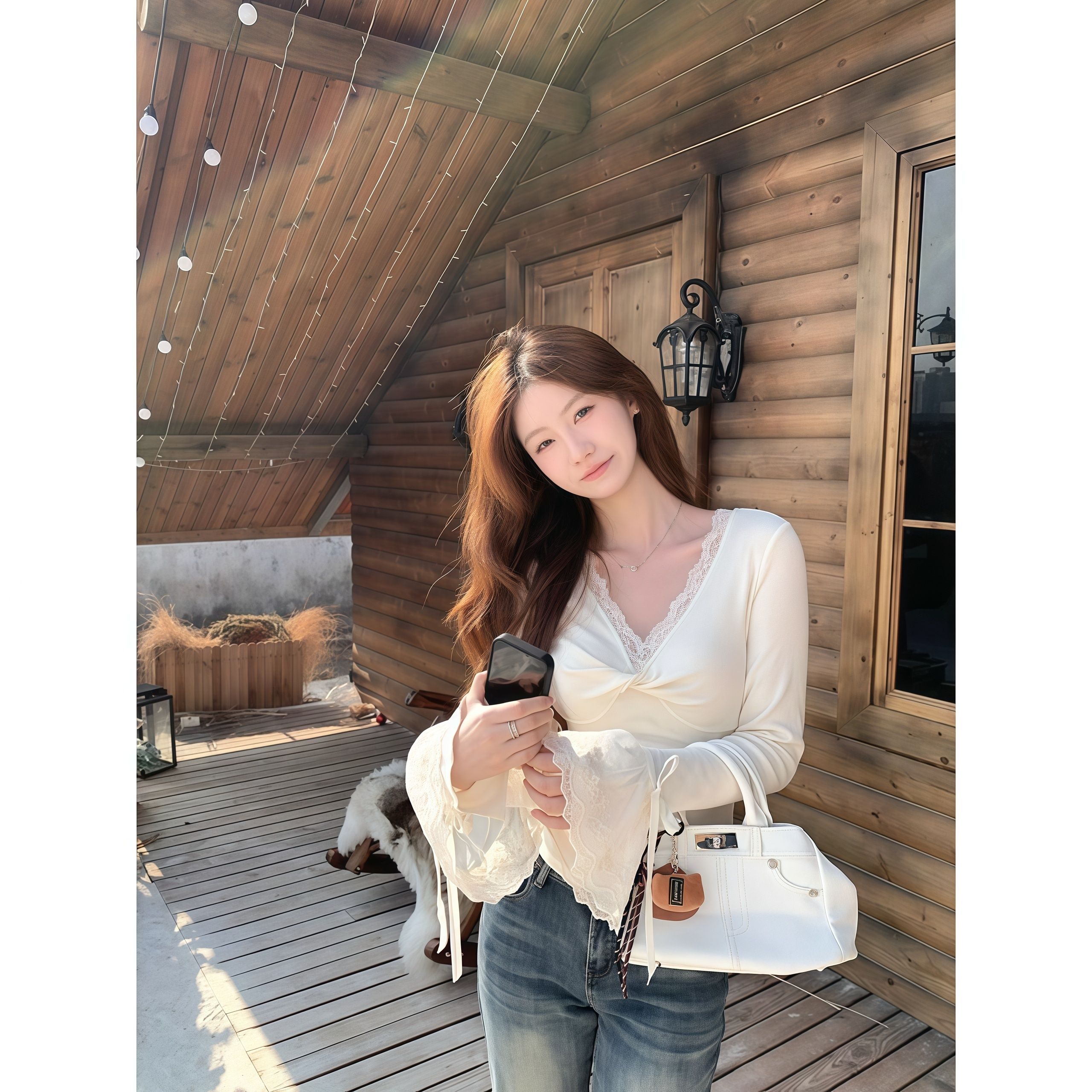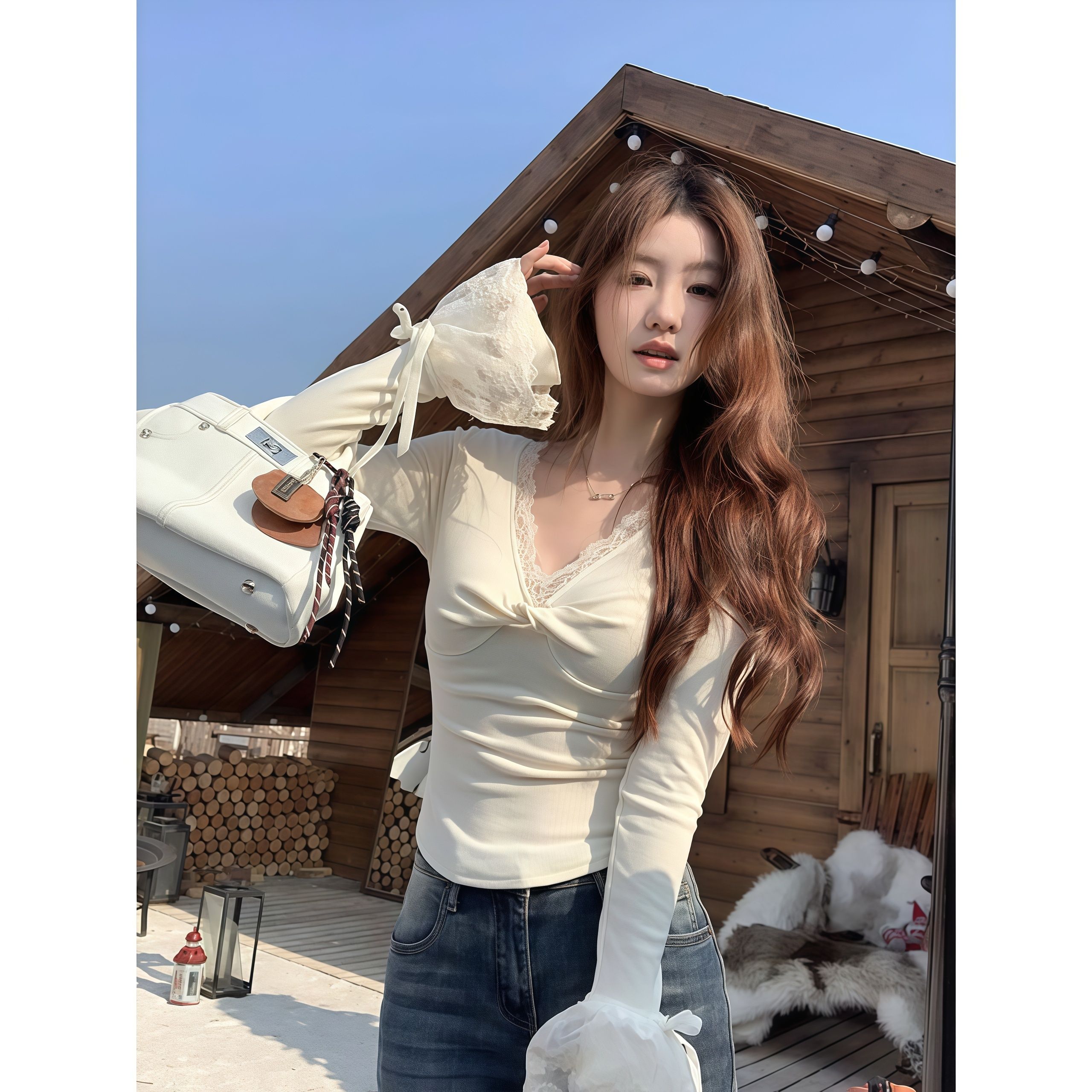MY14411# 杏色V领扭结蕾丝拼接T恤女喇叭袖打底修身显瘦上衣女裝貨源服裝批發