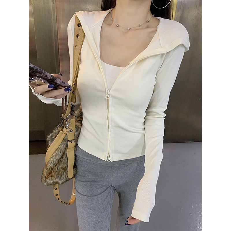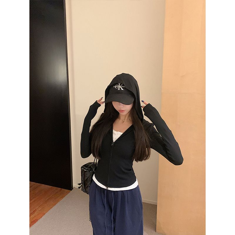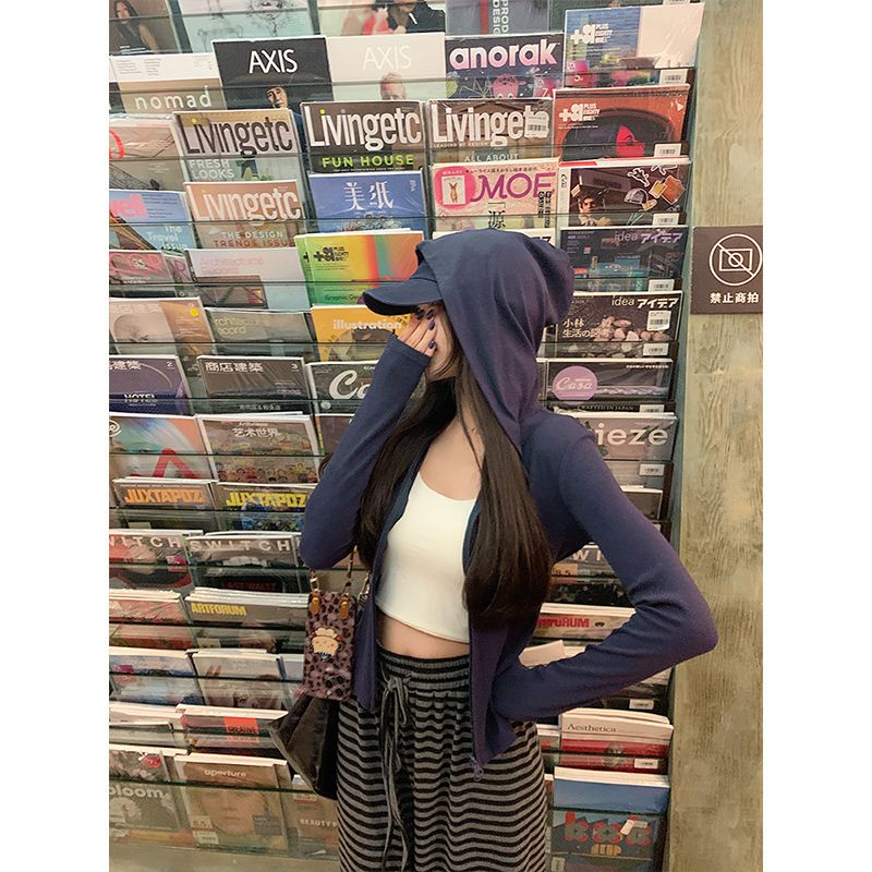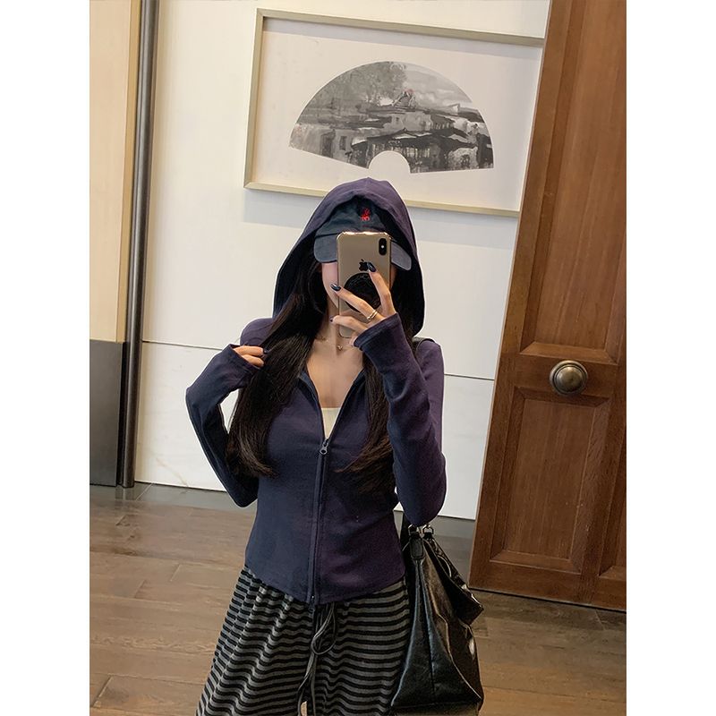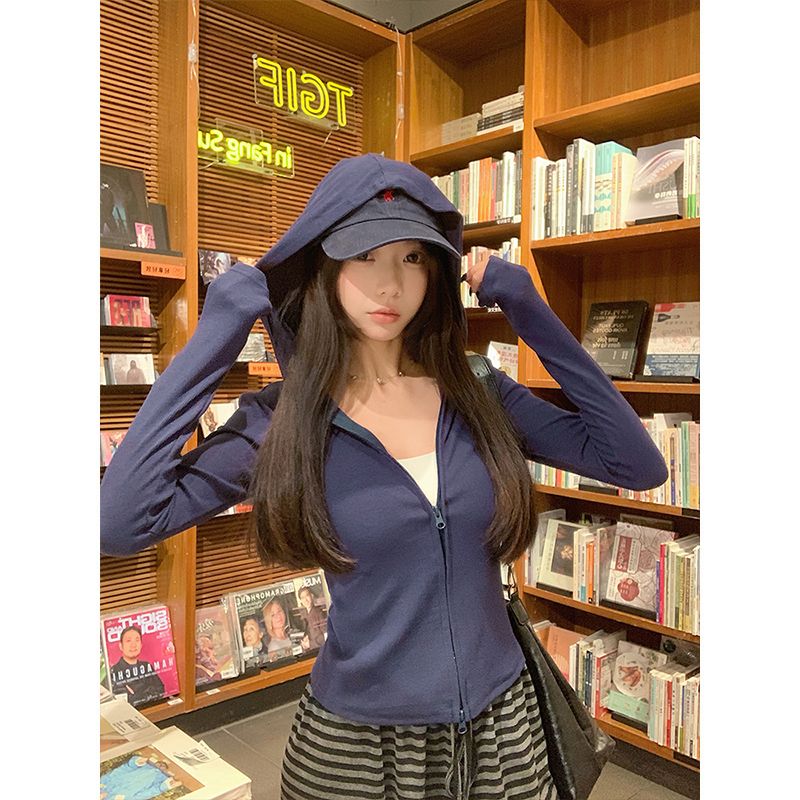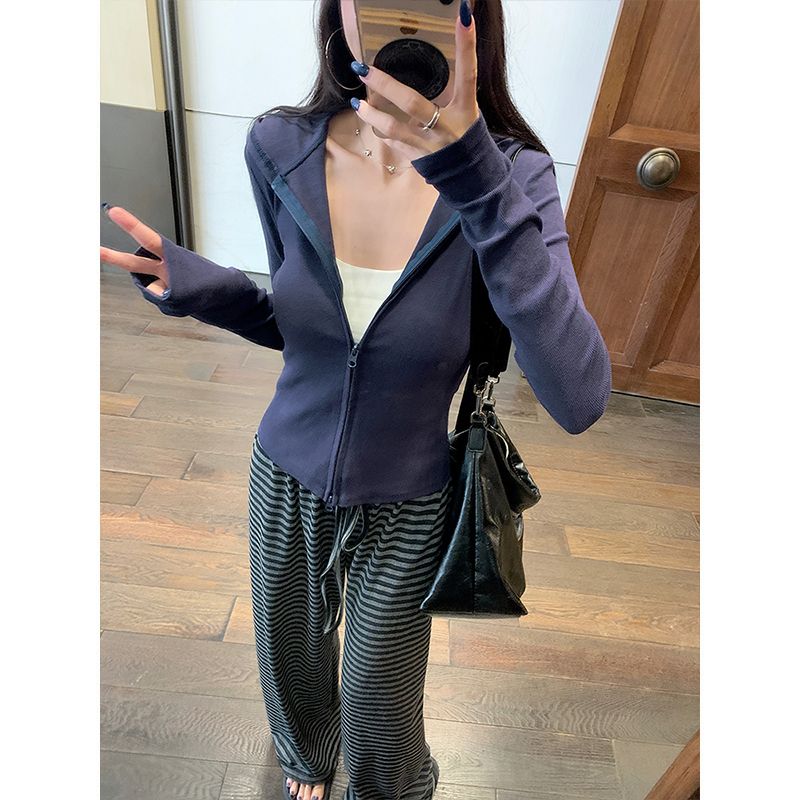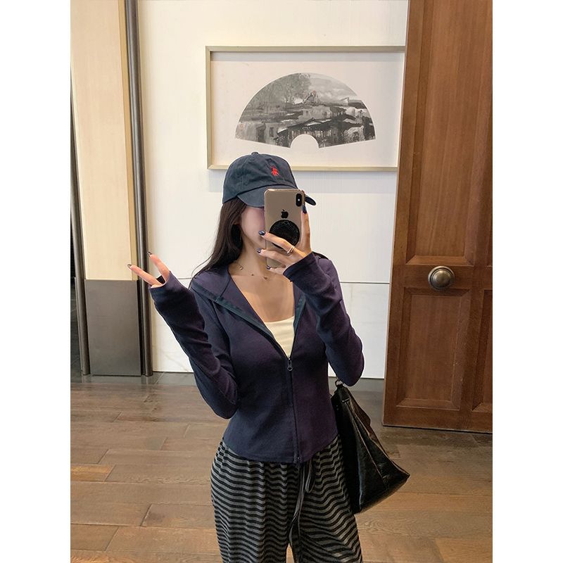 MY14412# 甜辣藏青连帽卫衣外套新款修身显瘦百搭双拉链长袖上衣女裝貨源服裝批發