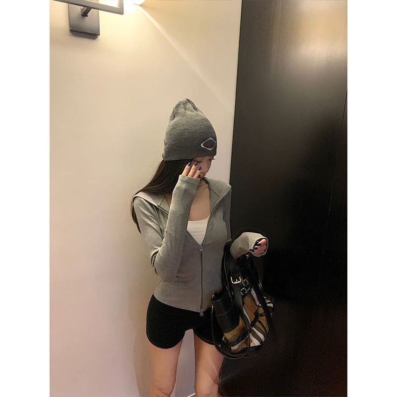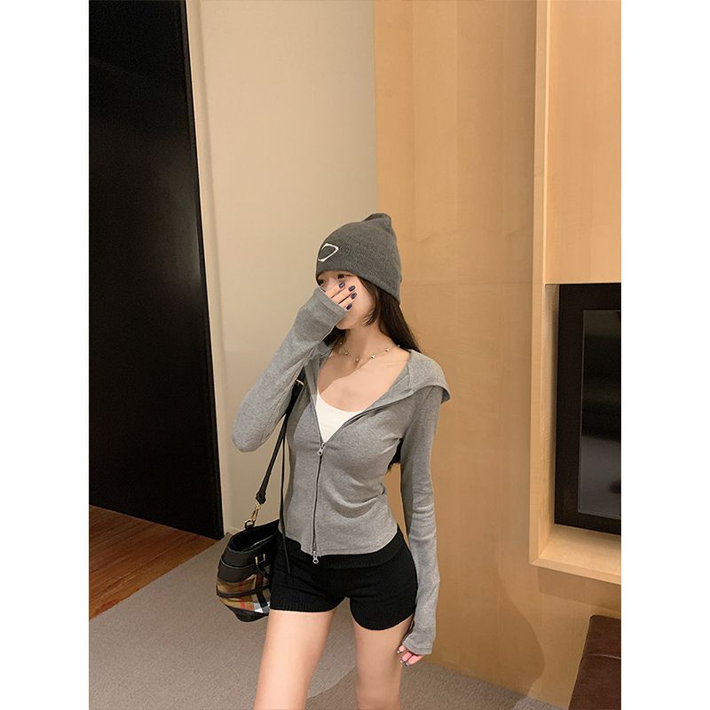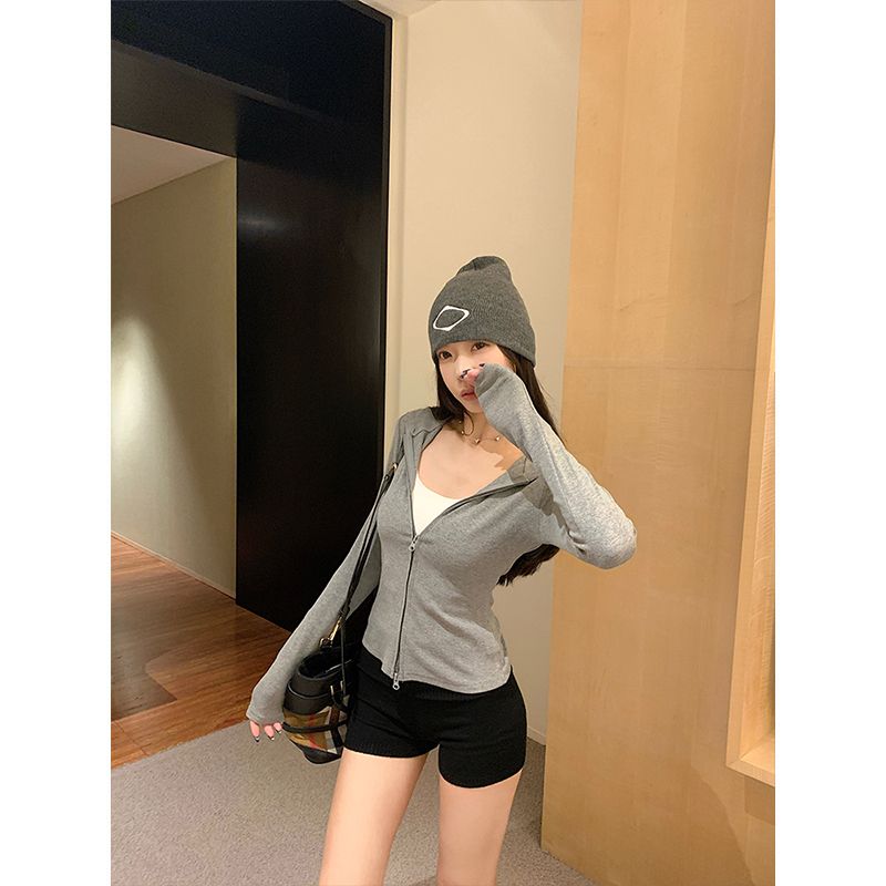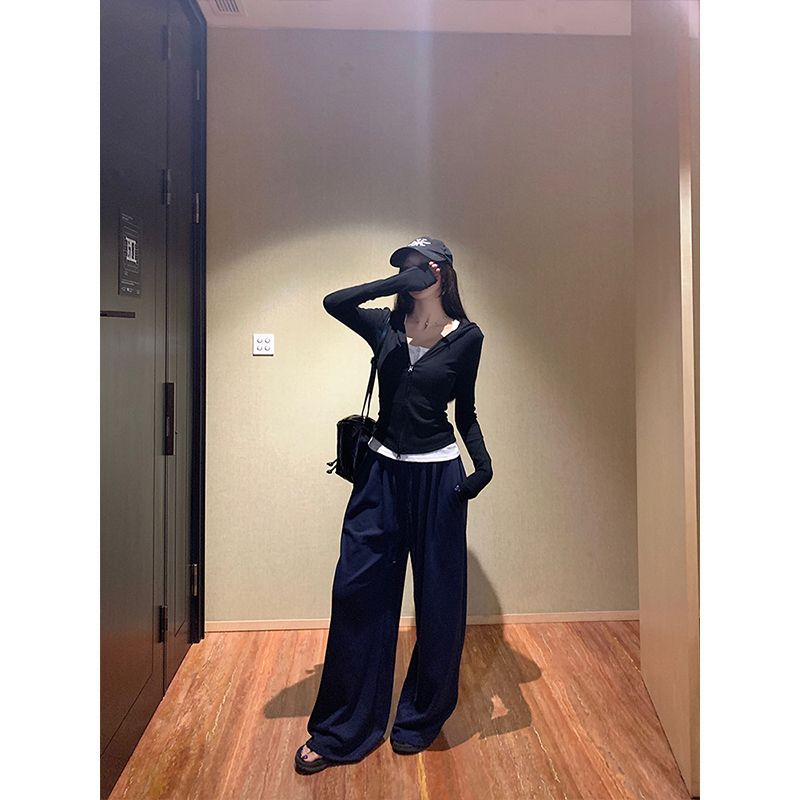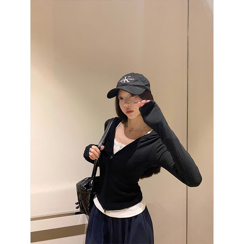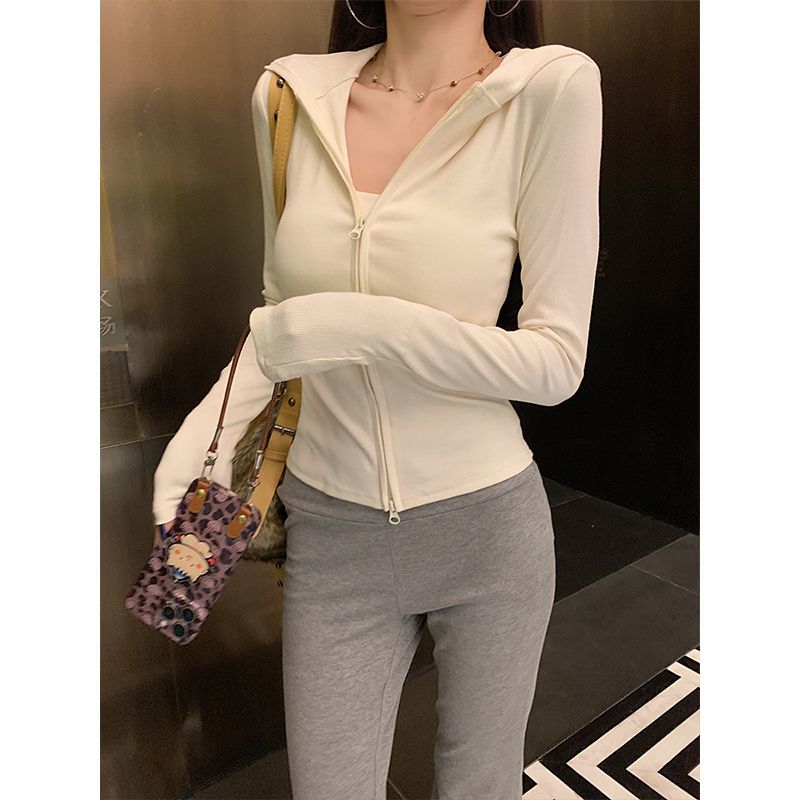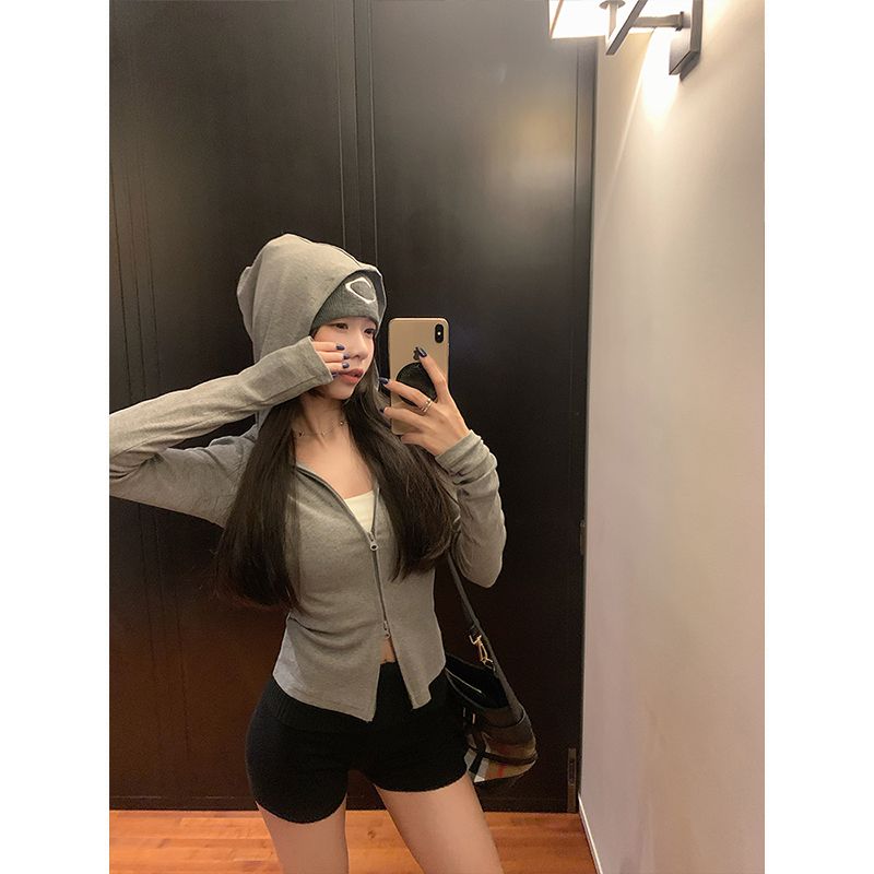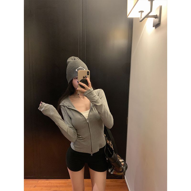 MY14412# 甜辣藏青连帽卫衣外套新款修身显瘦百搭双拉链长袖上衣女裝貨源服裝批發