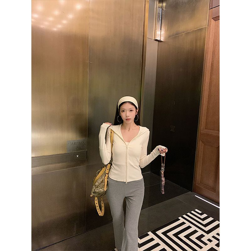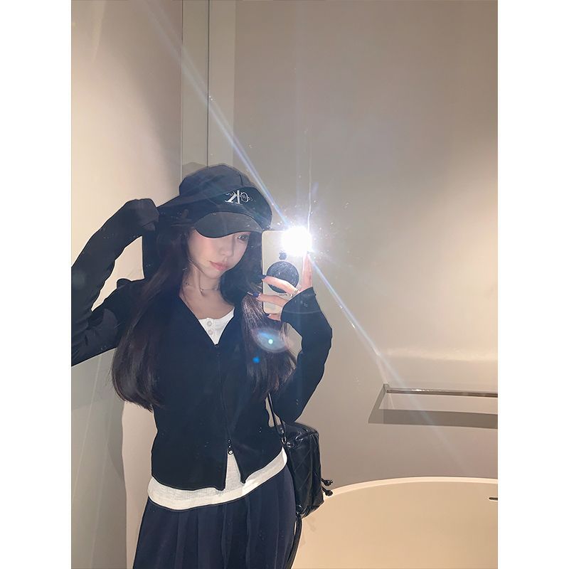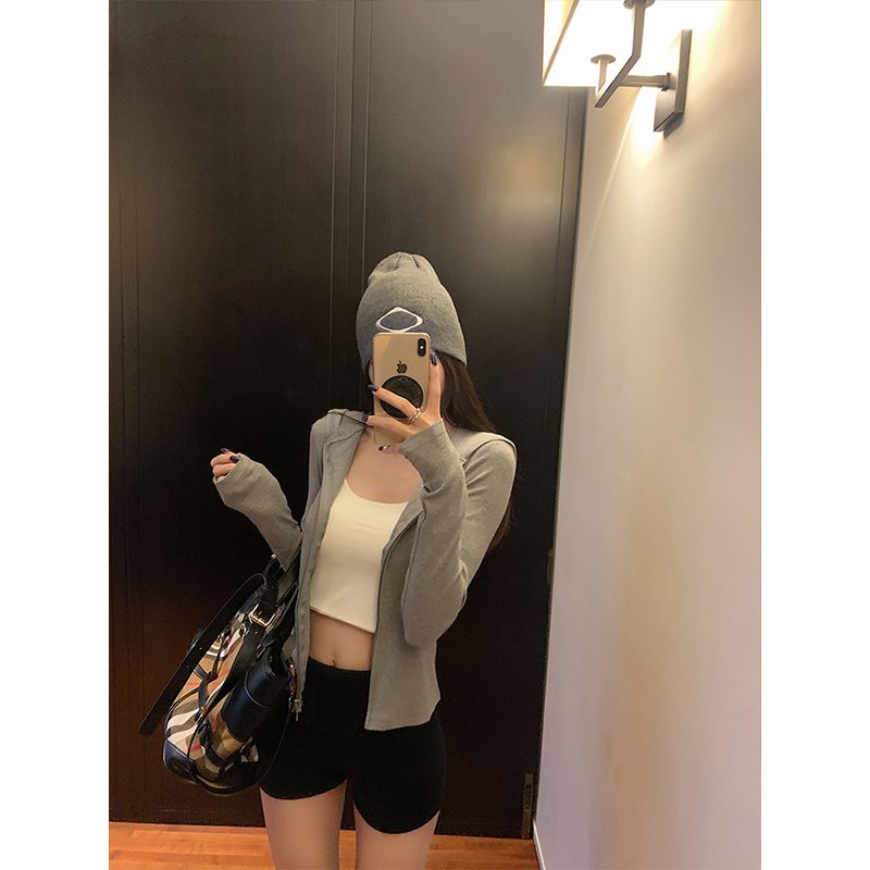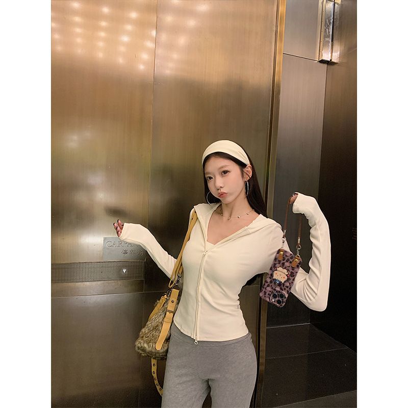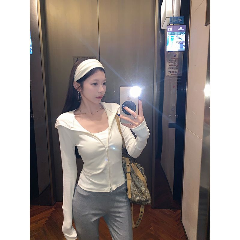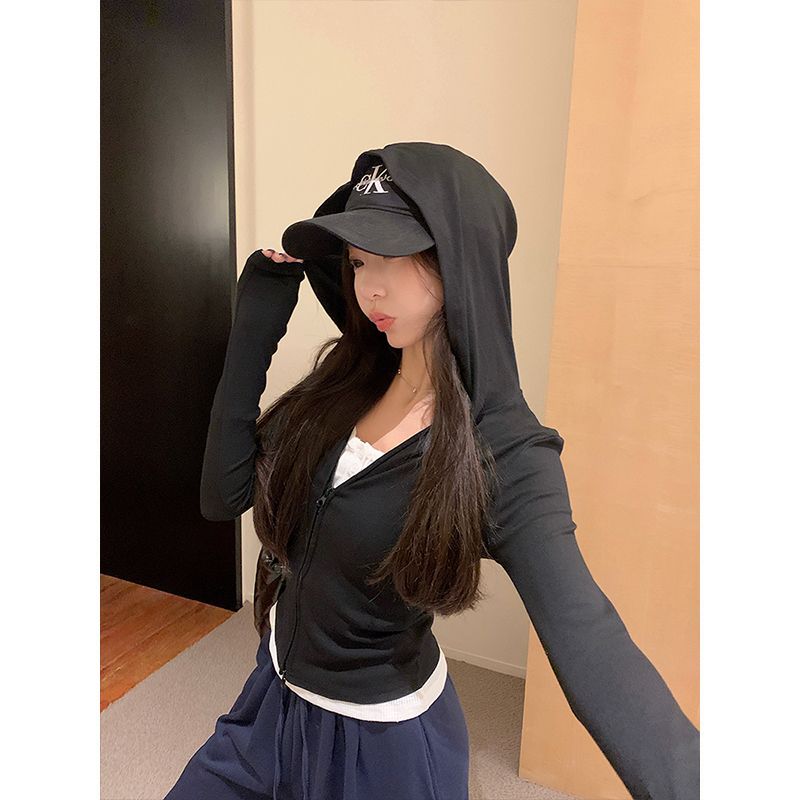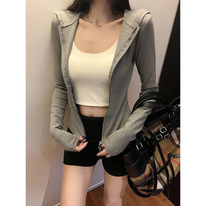 MY14412# 甜辣藏青连帽卫衣外套新款修身显瘦百搭双拉链长袖上衣女裝貨源服裝批發