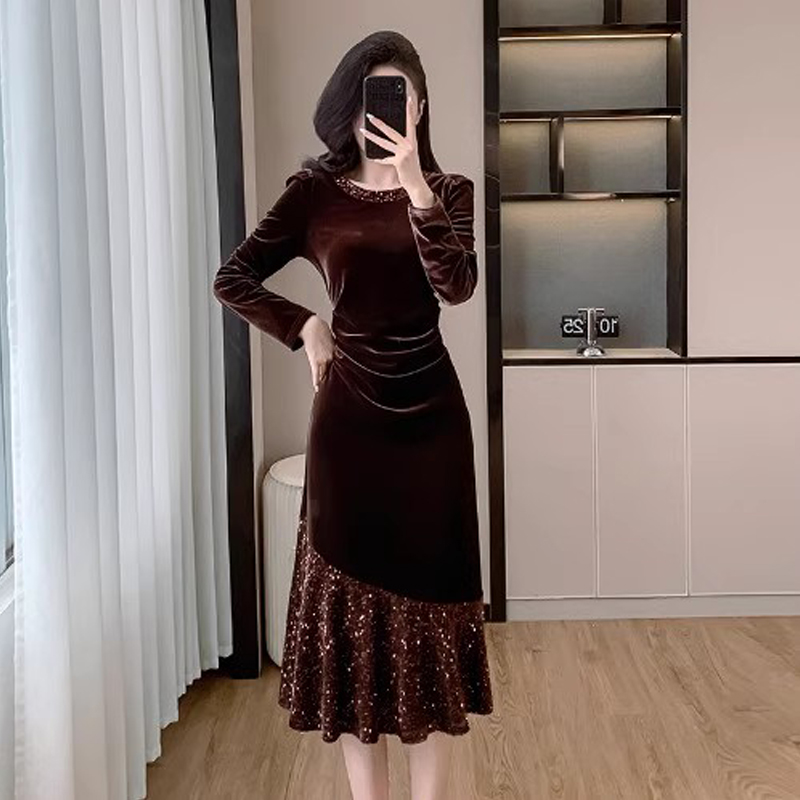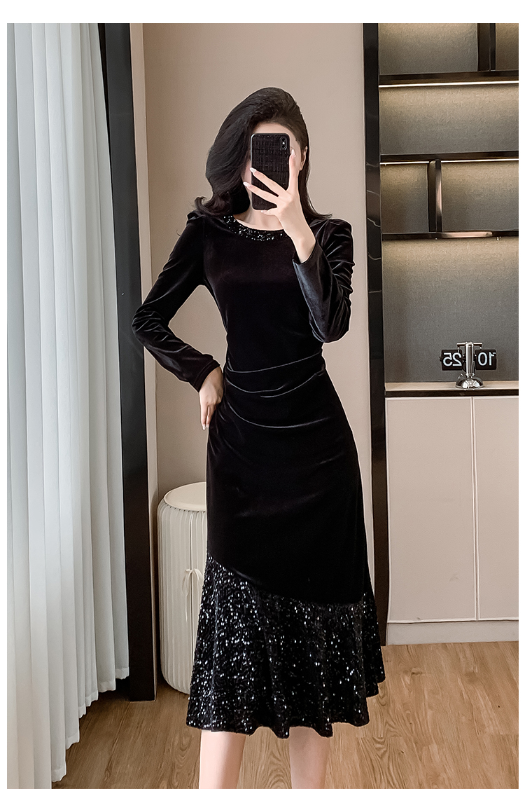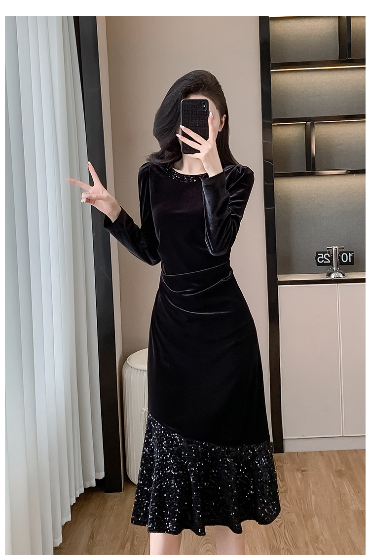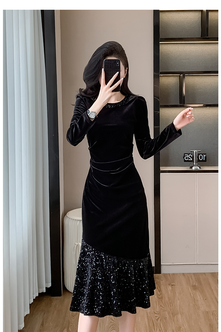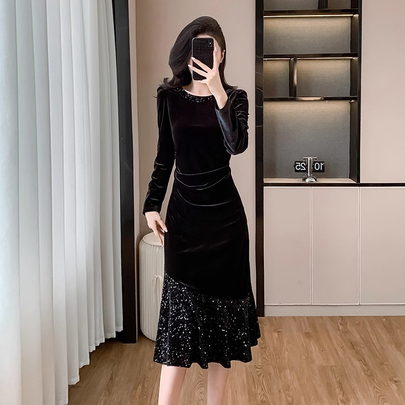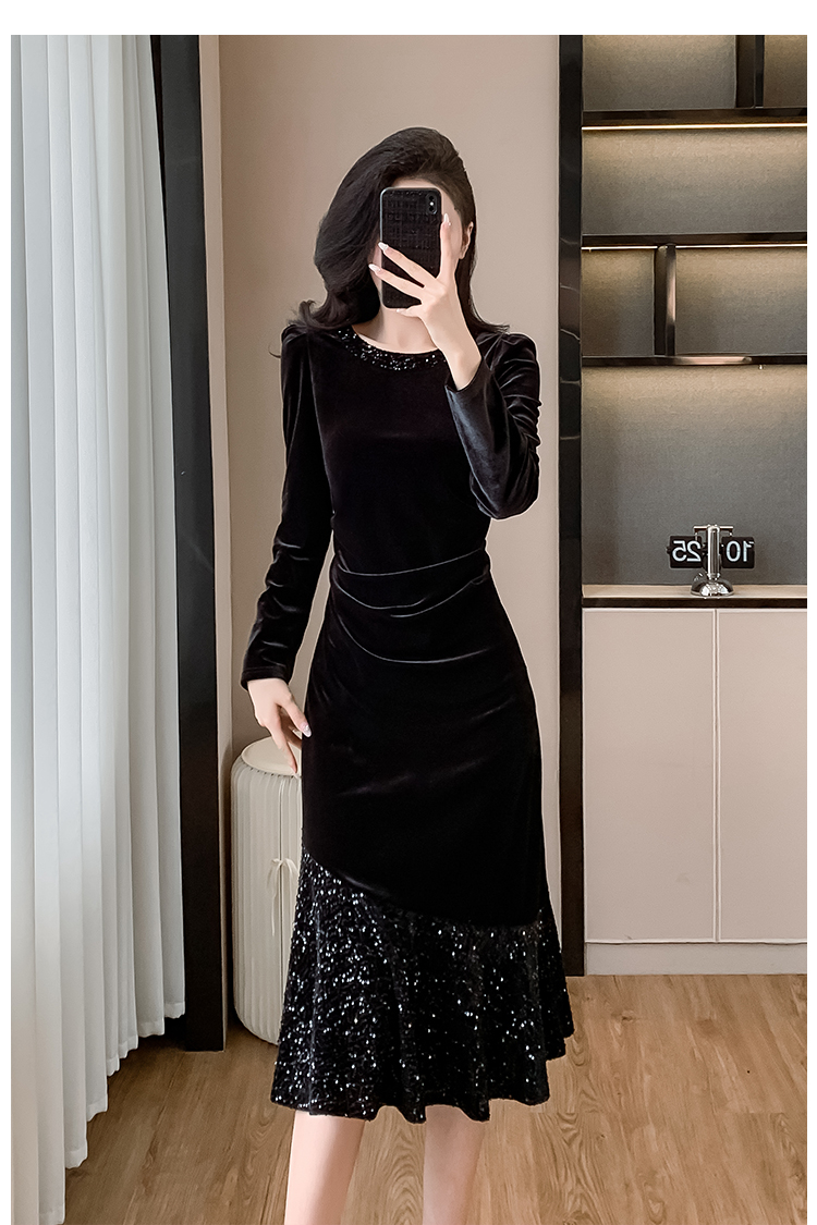 MY14418# 金丝绒连衣裙长袖收腰显瘦亮片鱼尾裙气质名媛年会礼服裙女裝貨源服裝批發