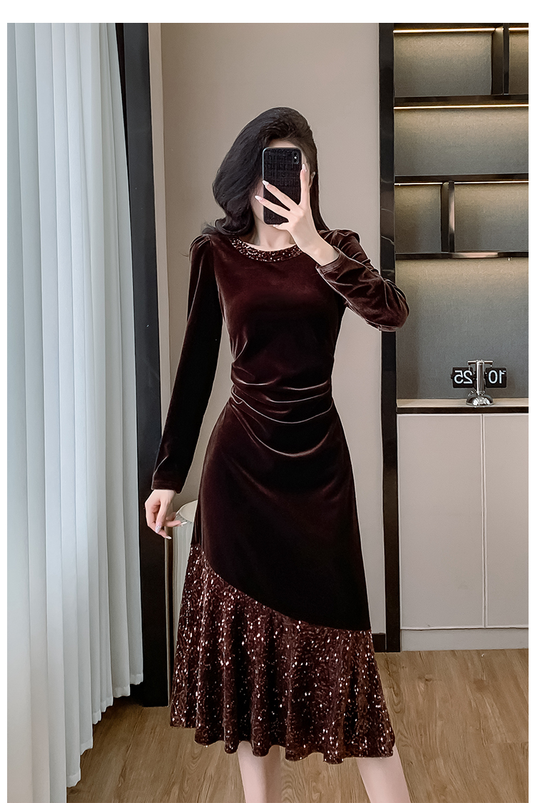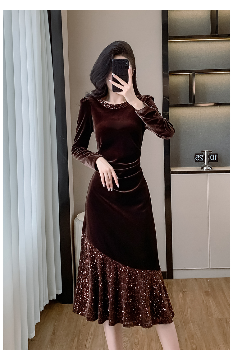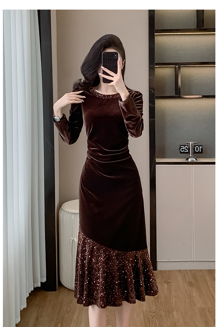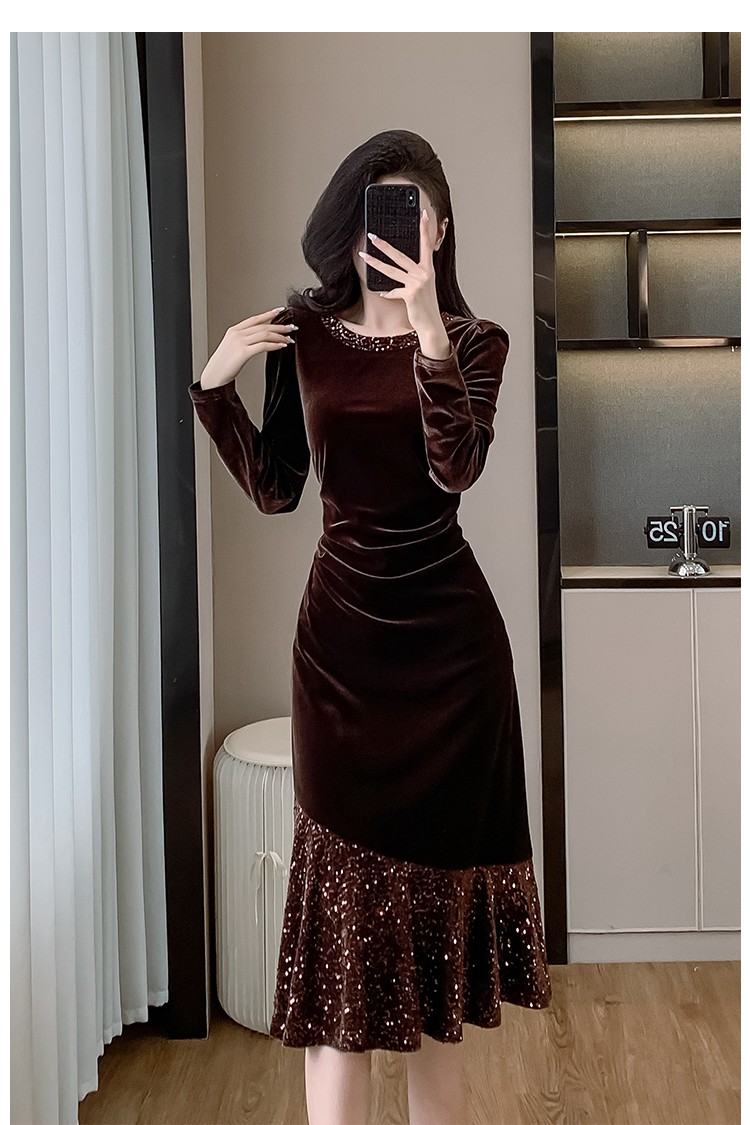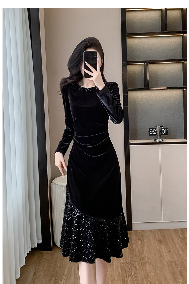 MY14418# 金丝绒连衣裙长袖收腰显瘦亮片鱼尾裙气质名媛年会礼服裙女裝貨源服裝批發