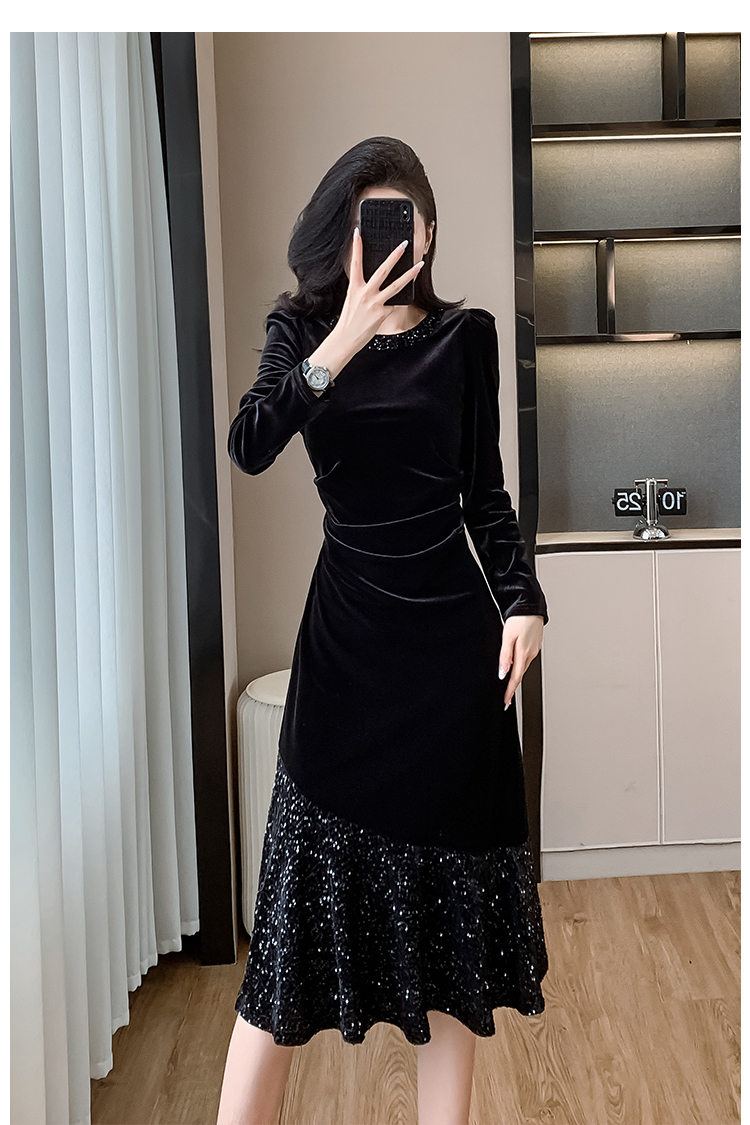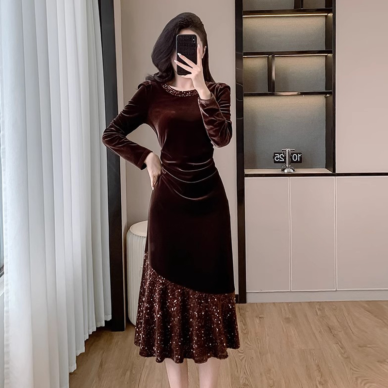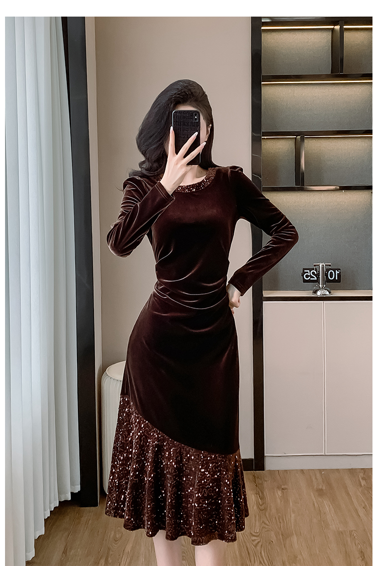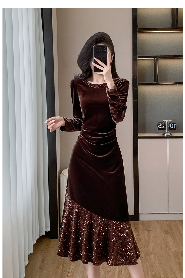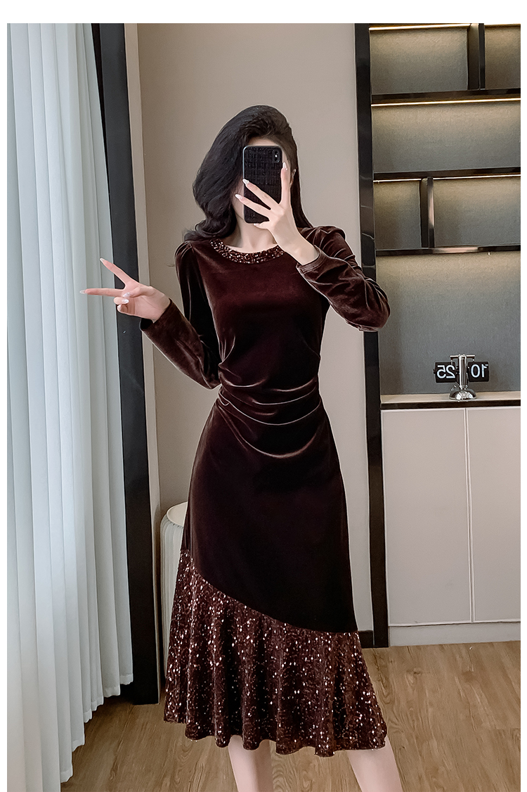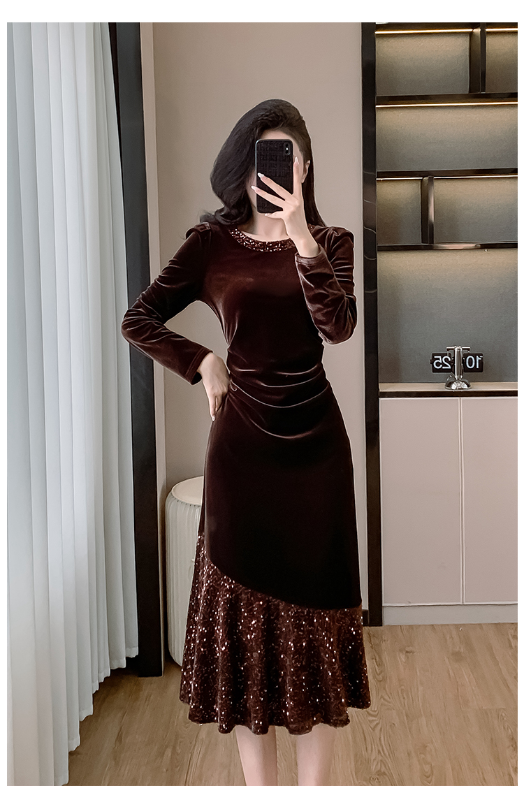 MY14418# 金丝绒连衣裙长袖收腰显瘦亮片鱼尾裙气质名媛年会礼服裙女裝貨源服裝批發