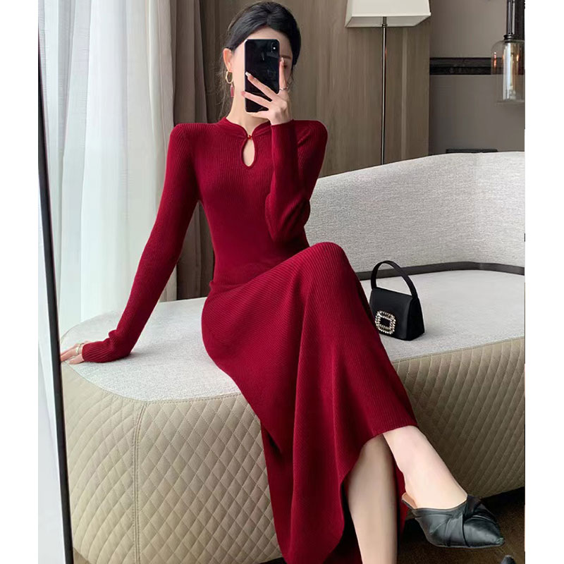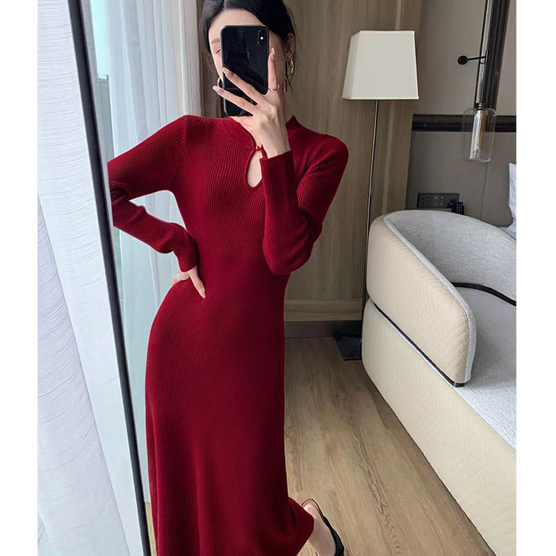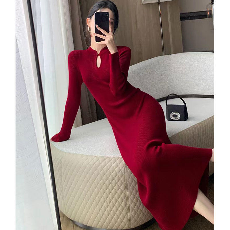 MY14429# 圣诞高级温柔风红色连衣裙胖mm修身显瘦新中式喜庆宴会长裙女裝貨源服裝批發