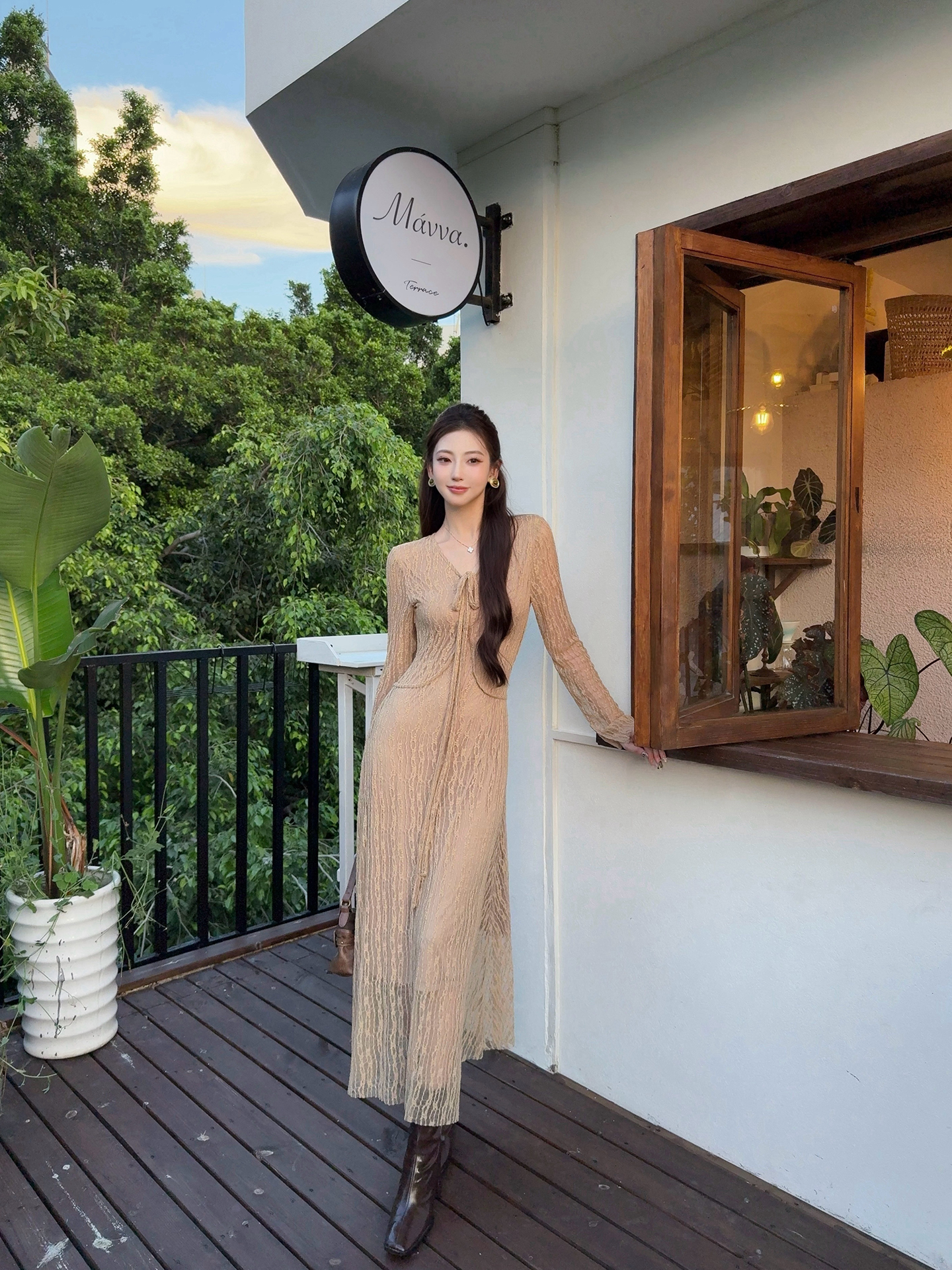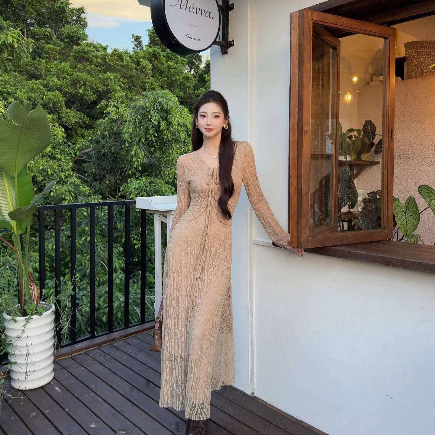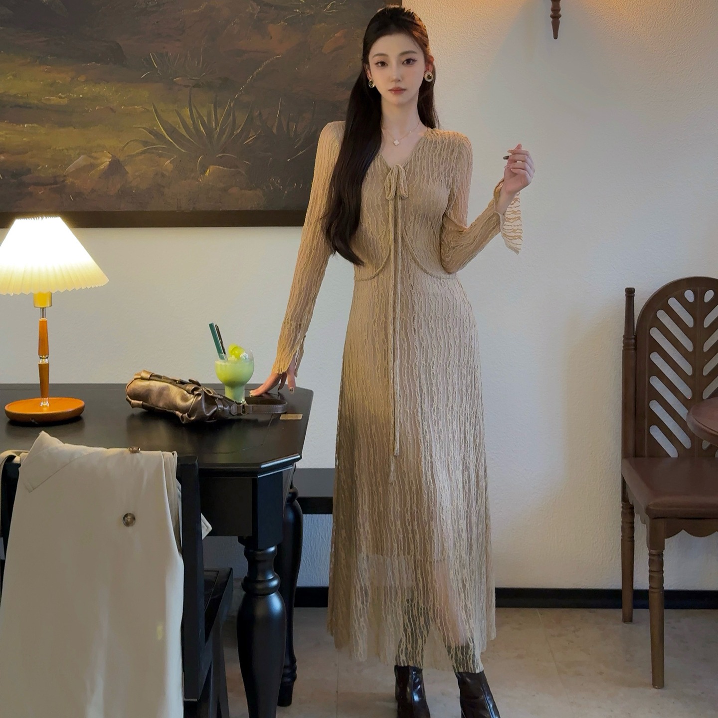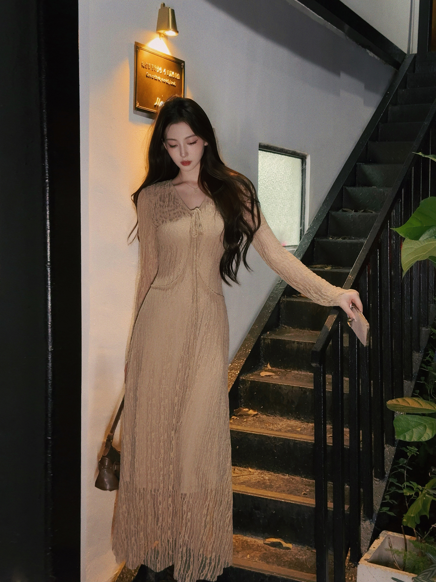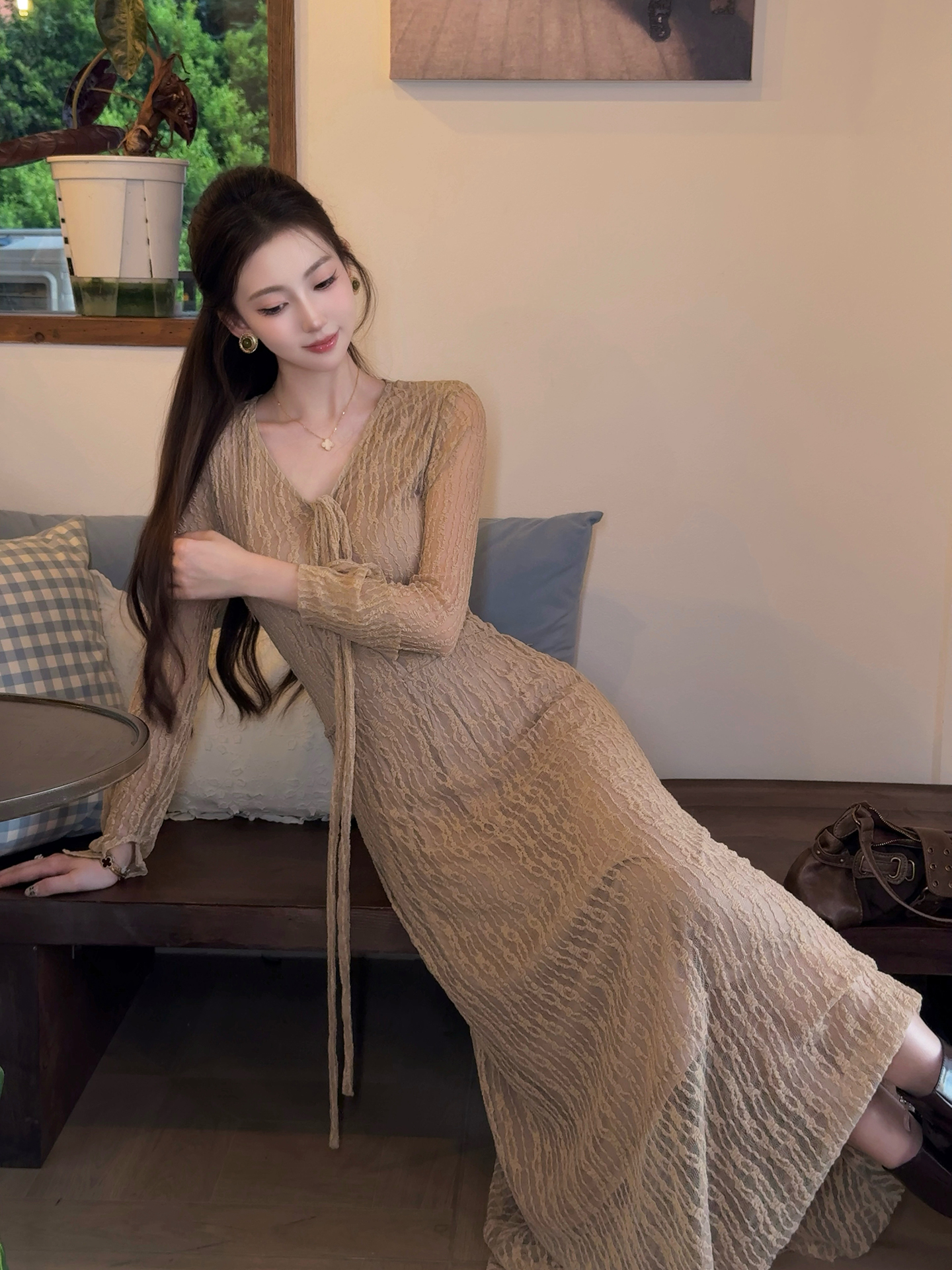 MY14435# 小丽 拾雾山雨法式喇叭袖针织长裙收腰包臀鱼尾裙蕾丝v领连衣裙女裝貨源服裝批發