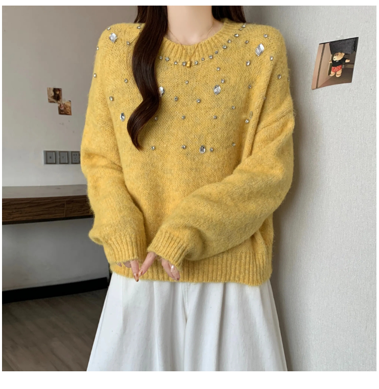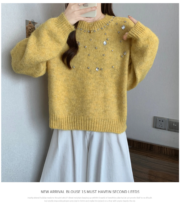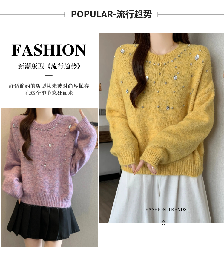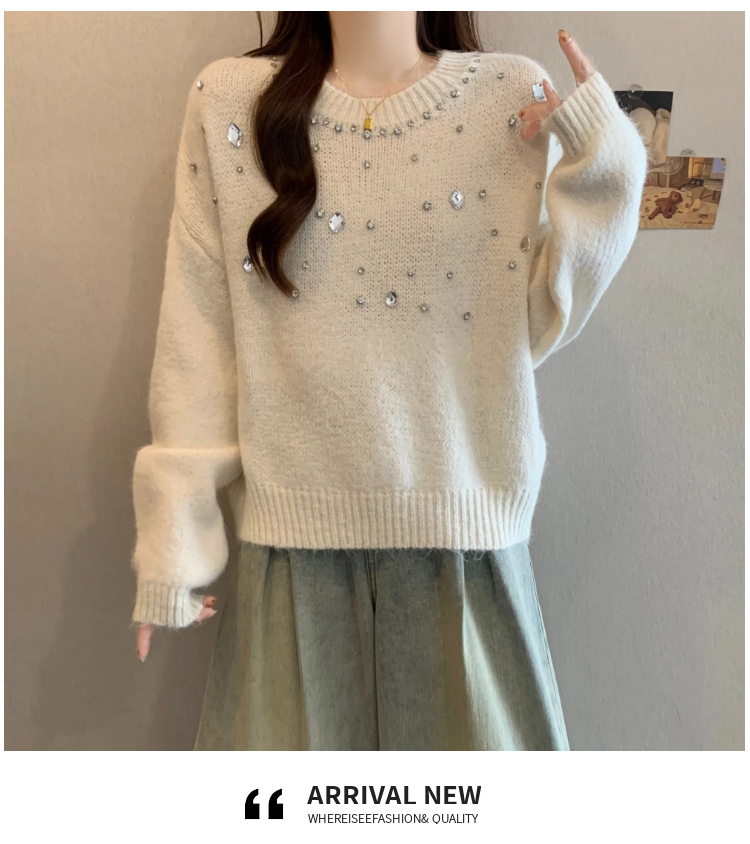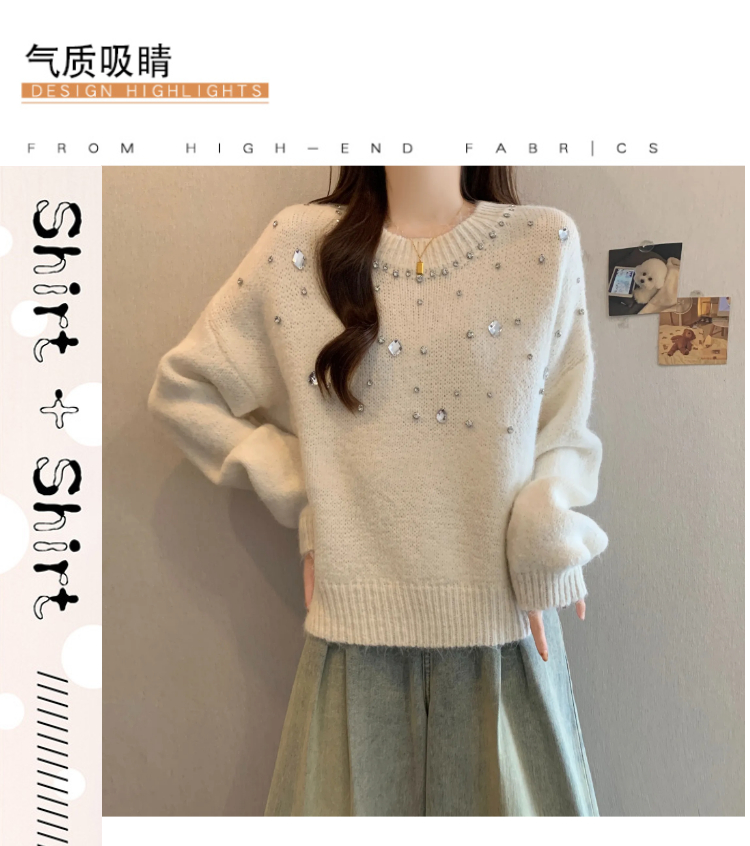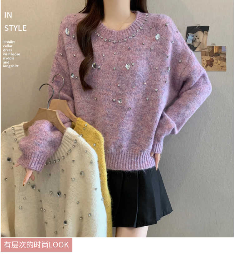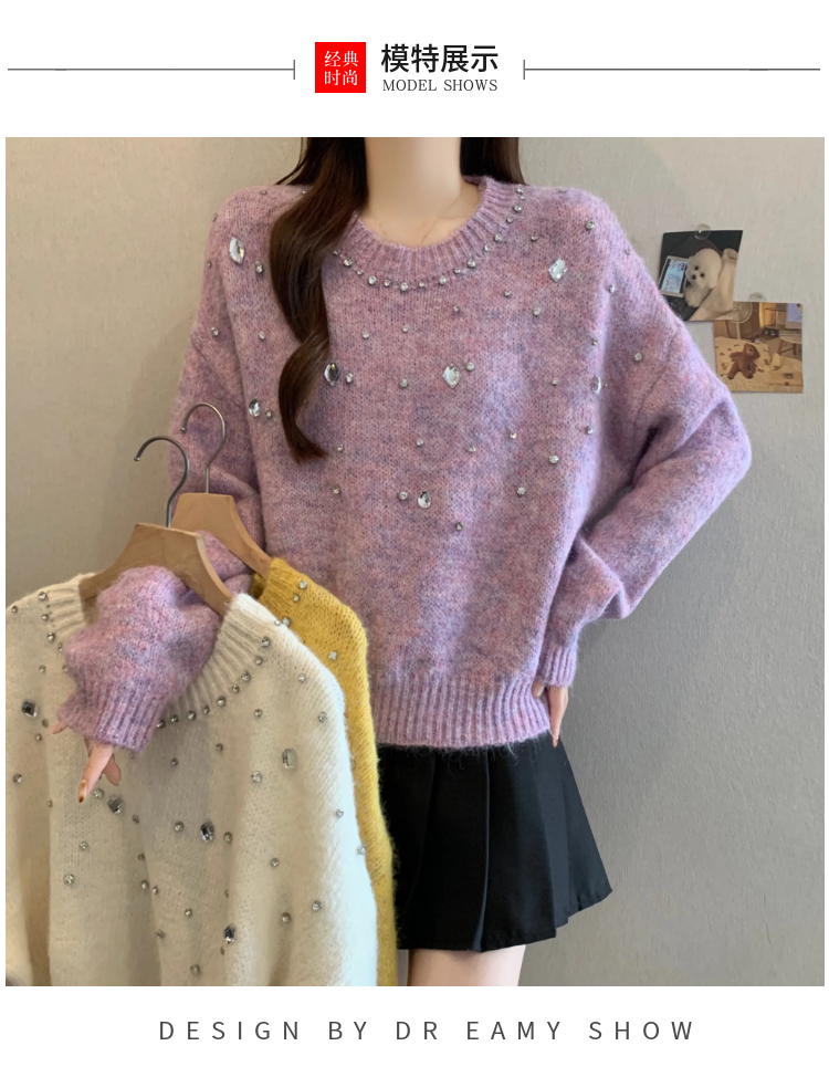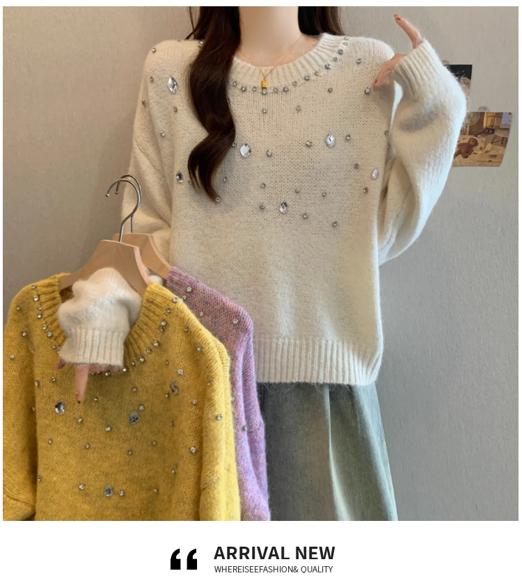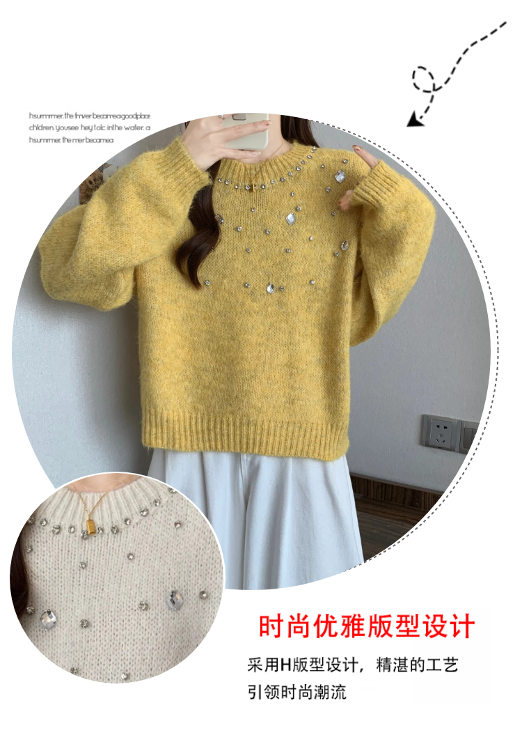 MY14438# 大码烫钻针织衫毛衣女款慵懒风休闲宽松显瘦巨好看毛衣女女裝貨源服裝批發
