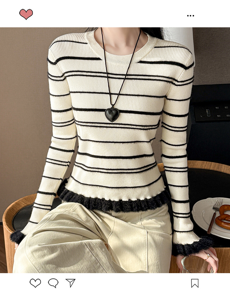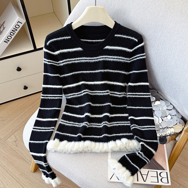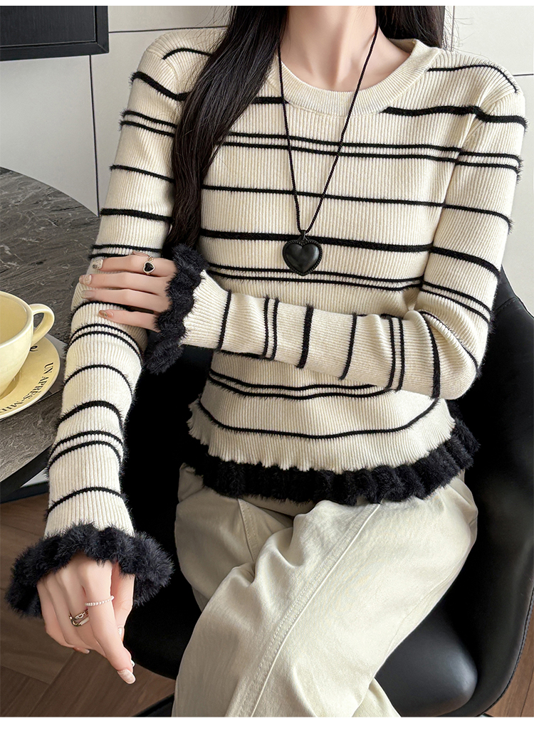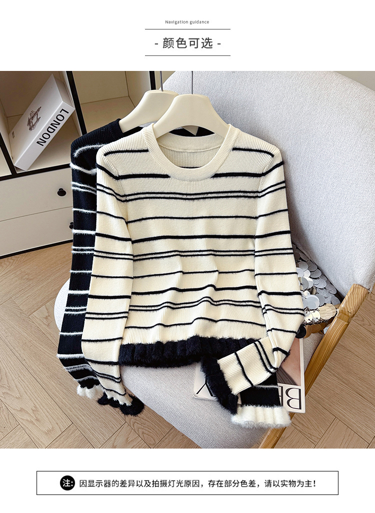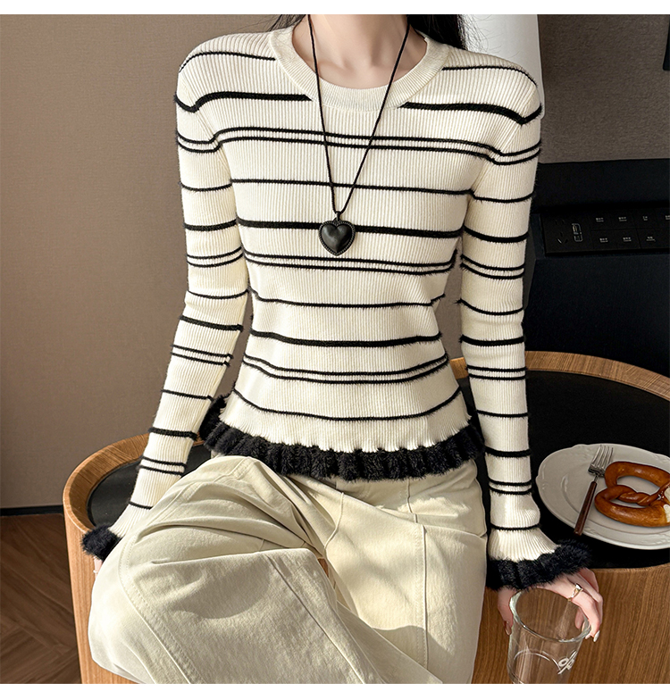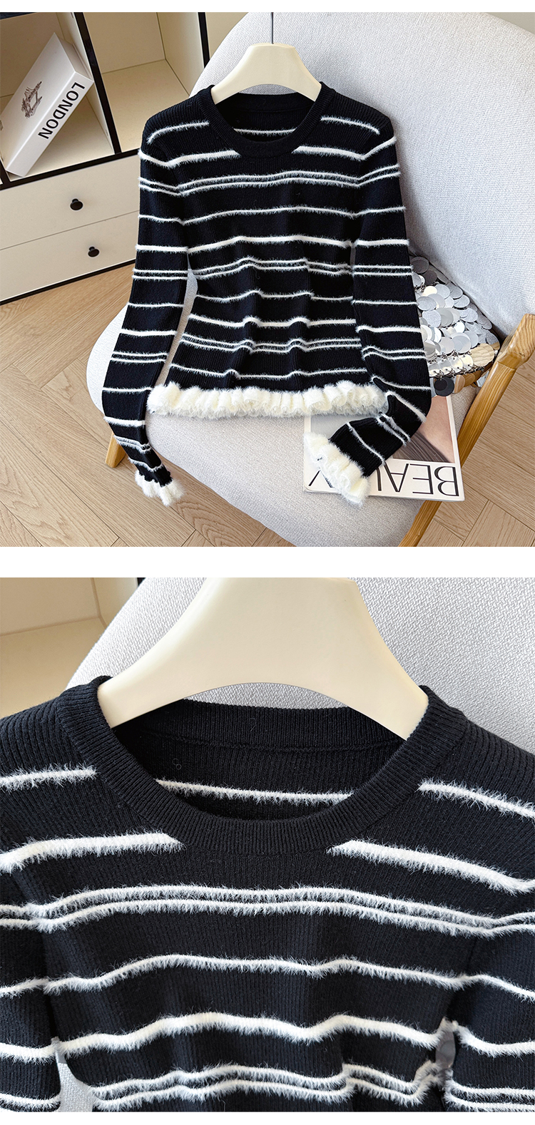 MY14455# 毛衣圆领套头毛绒木耳边针织衫女加厚条纹打底衫内搭外穿女裝貨源服裝批發