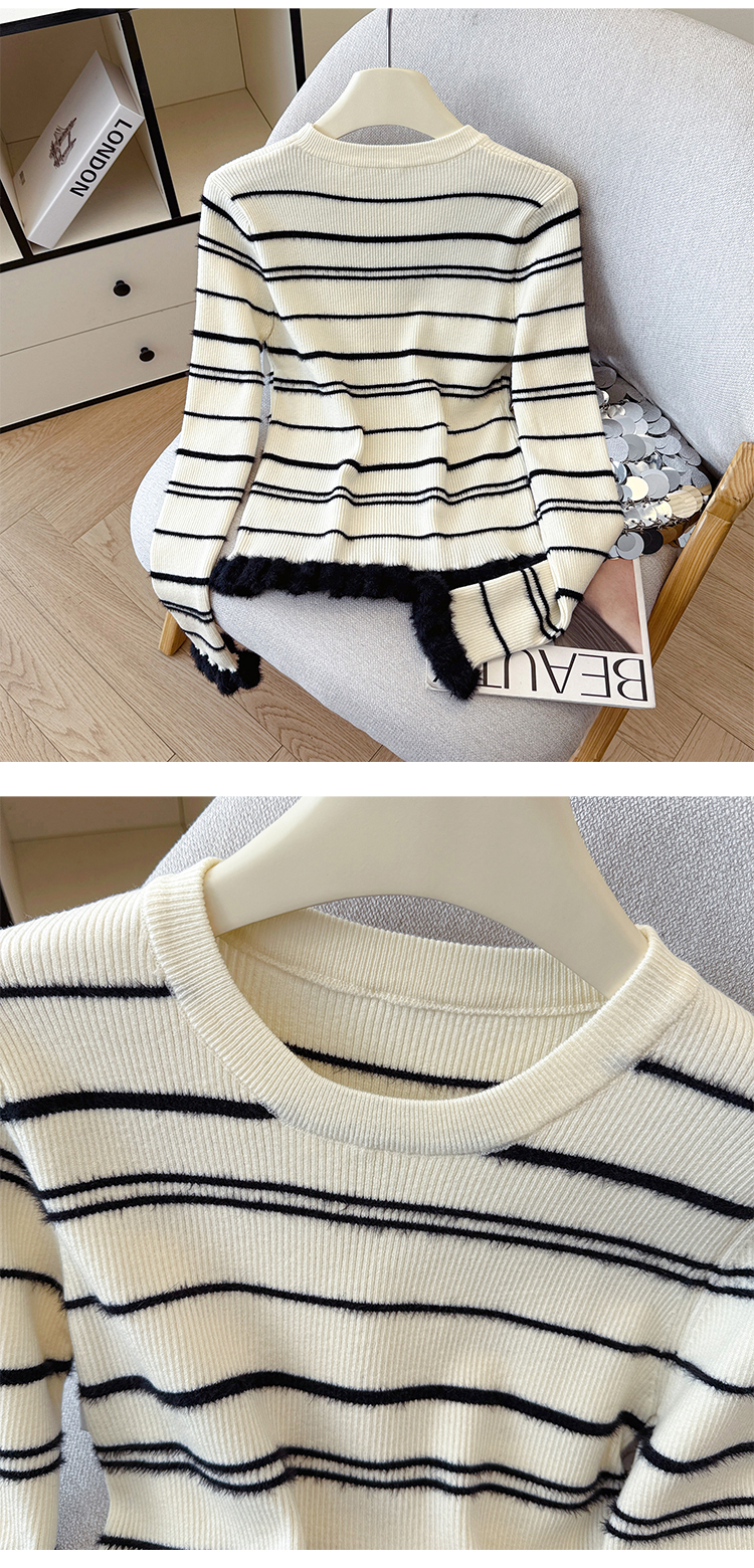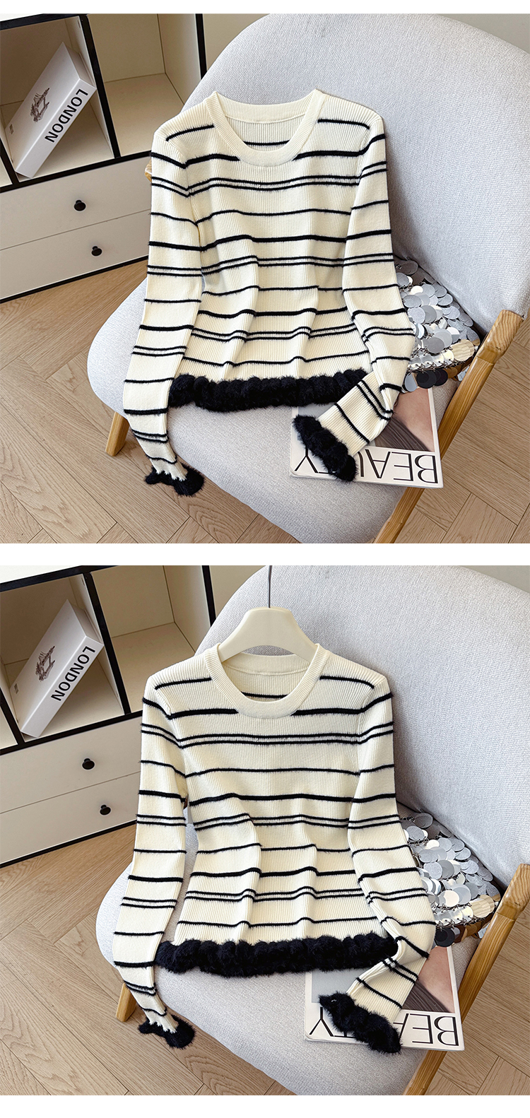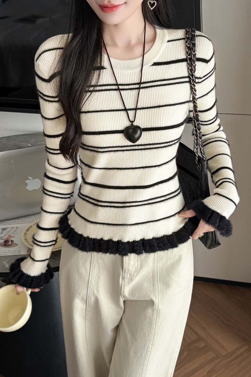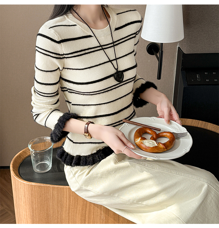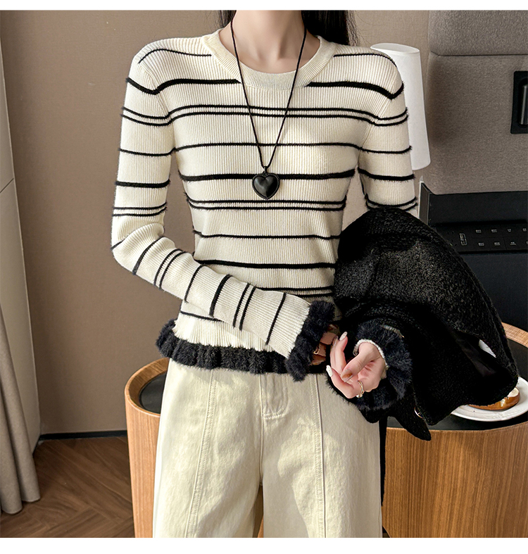 MY14455# 毛衣圆领套头毛绒木耳边针织衫女加厚条纹打底衫内搭外穿女裝貨源服裝批發