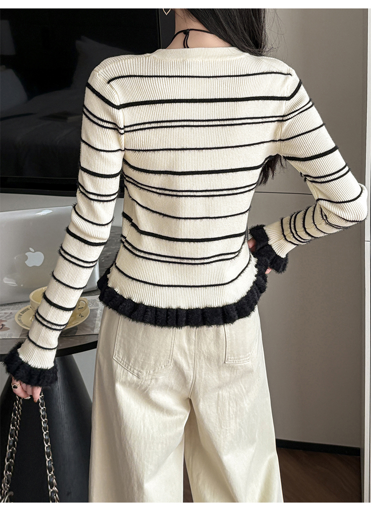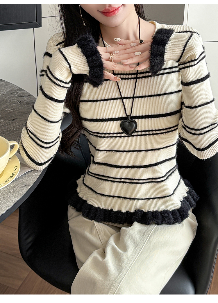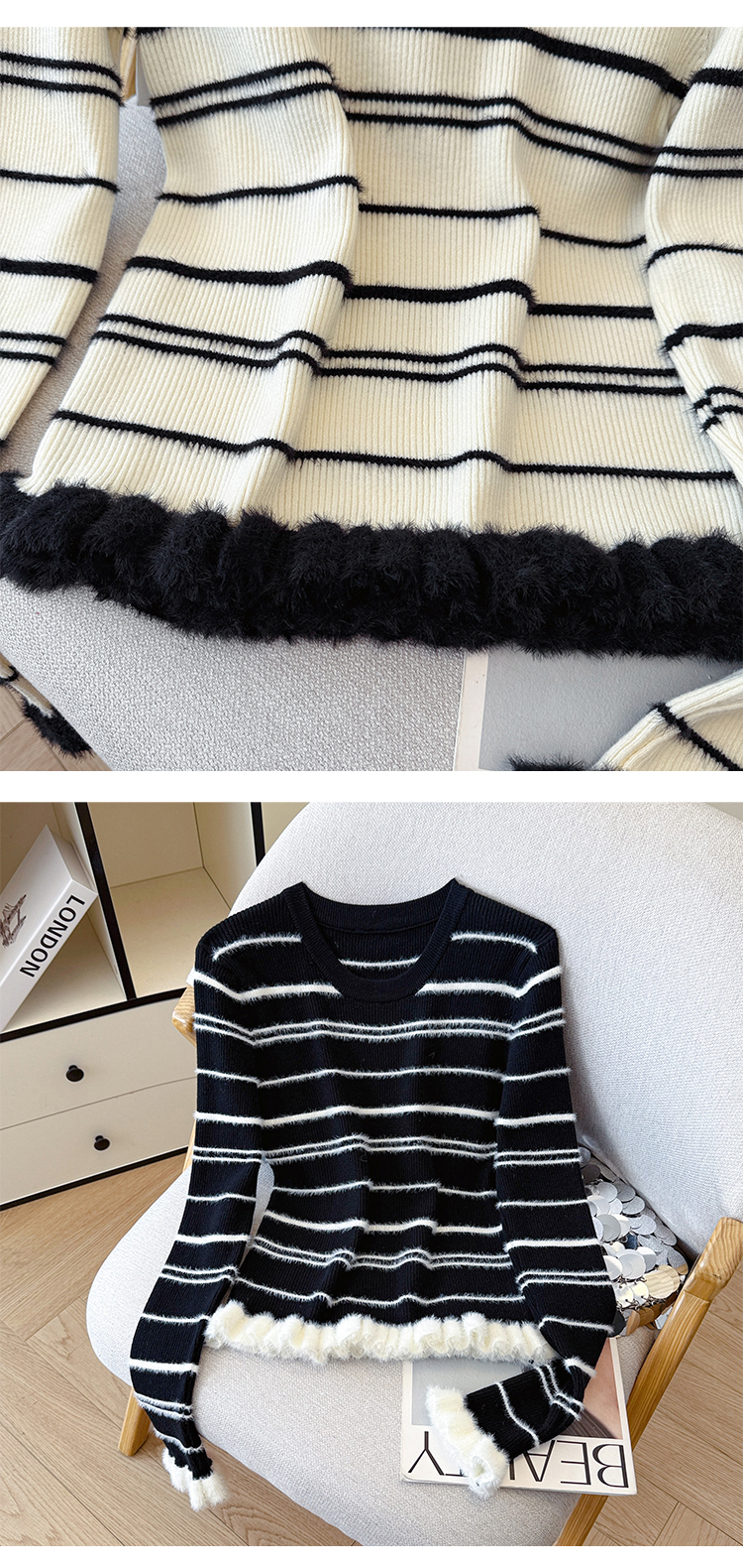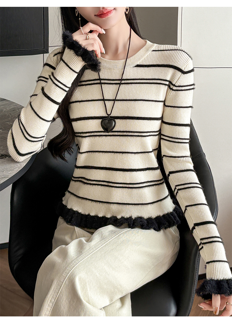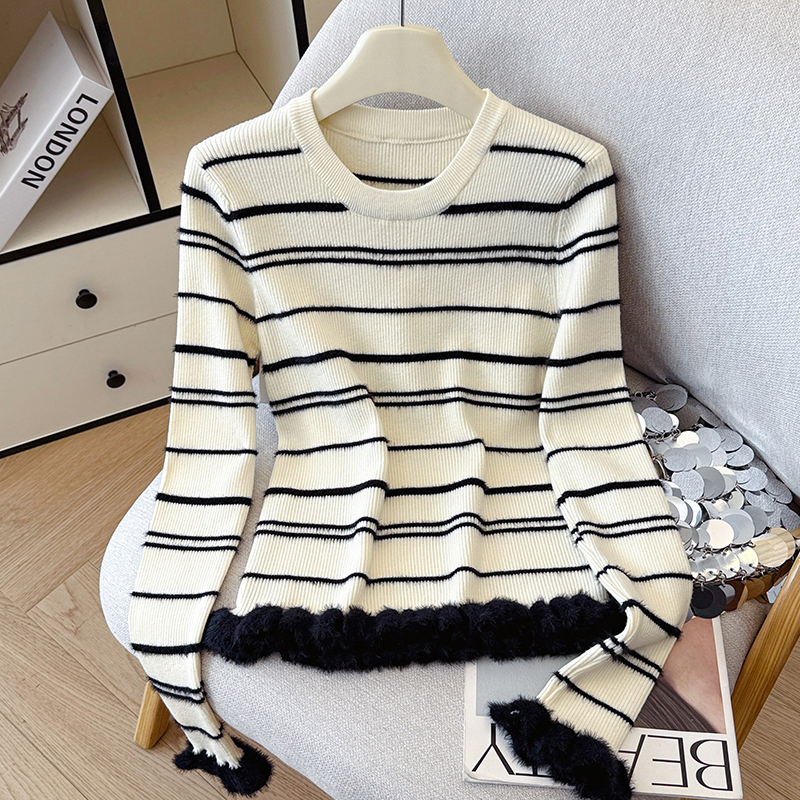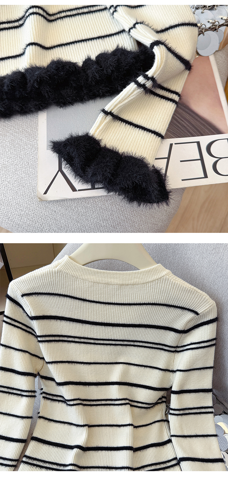 MY14455# 毛衣圆领套头毛绒木耳边针织衫女加厚条纹打底衫内搭外穿女裝貨源服裝批發