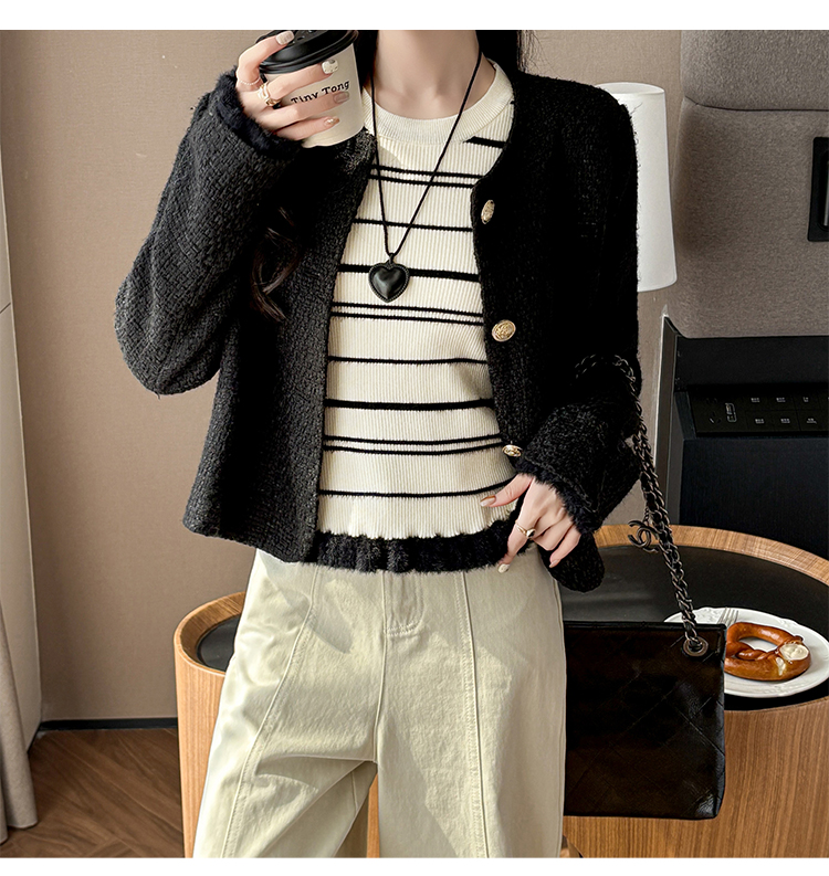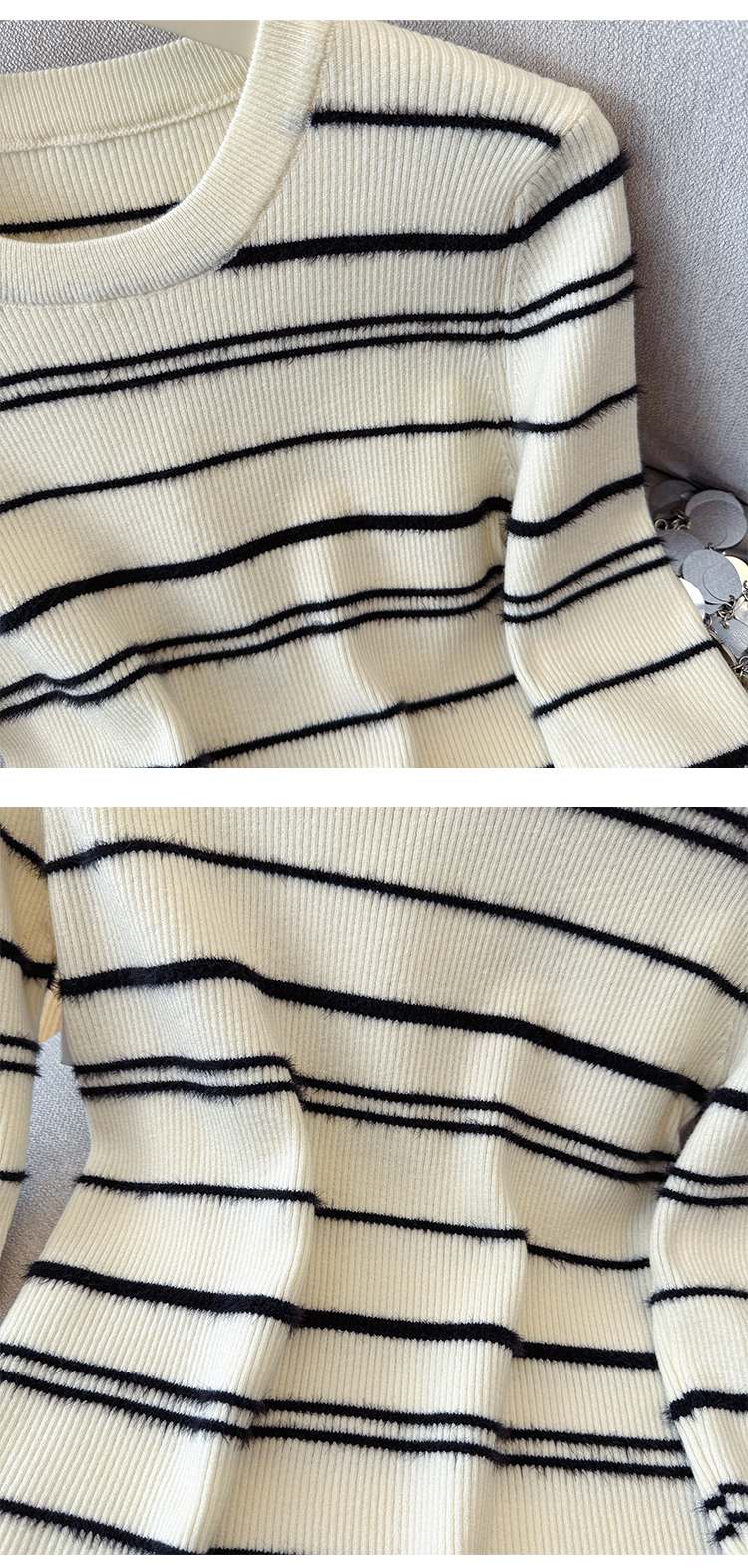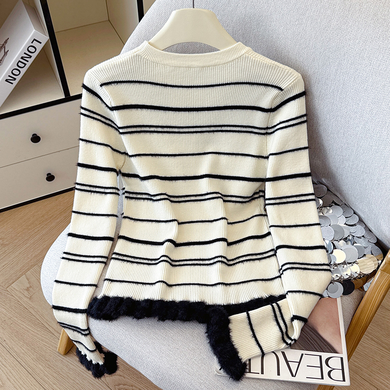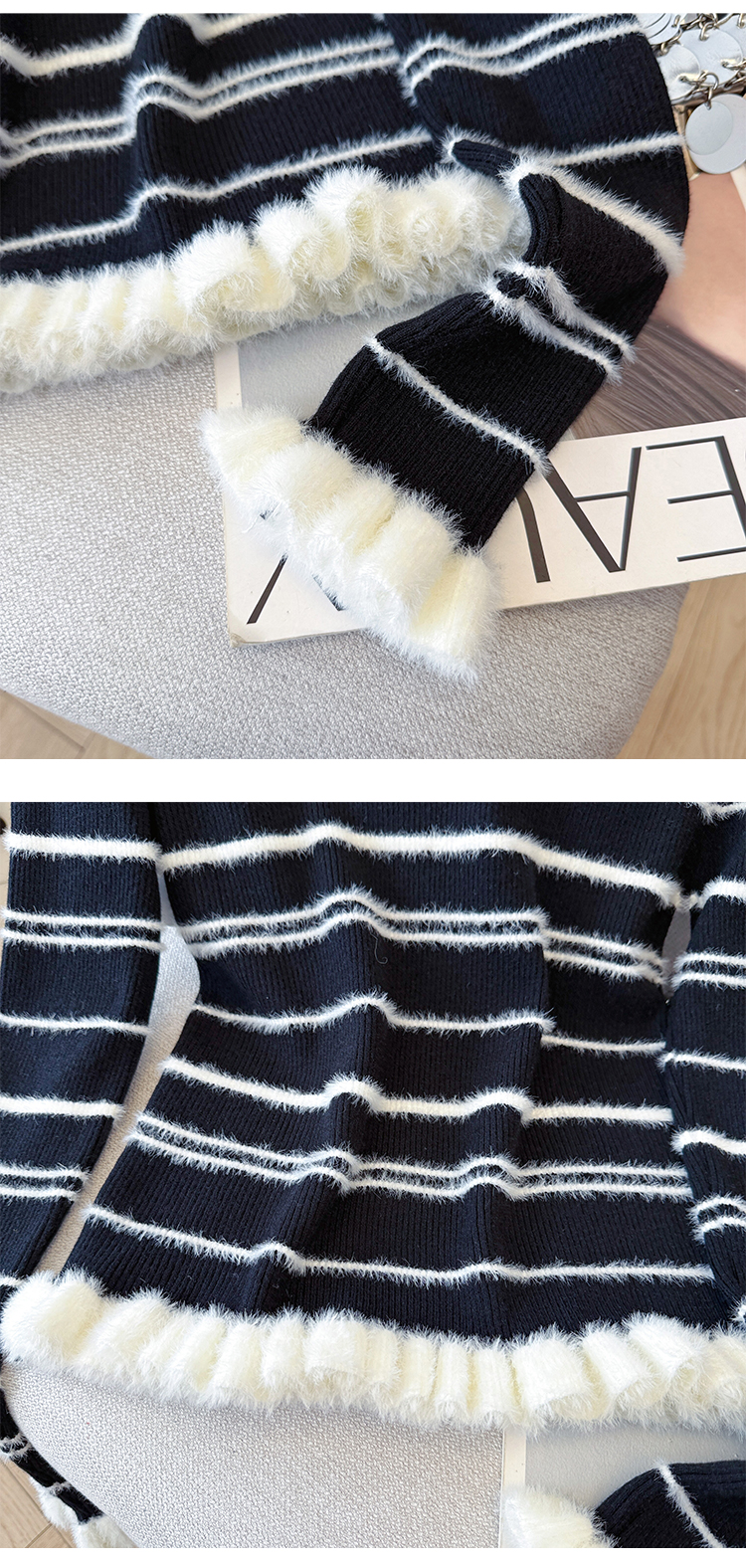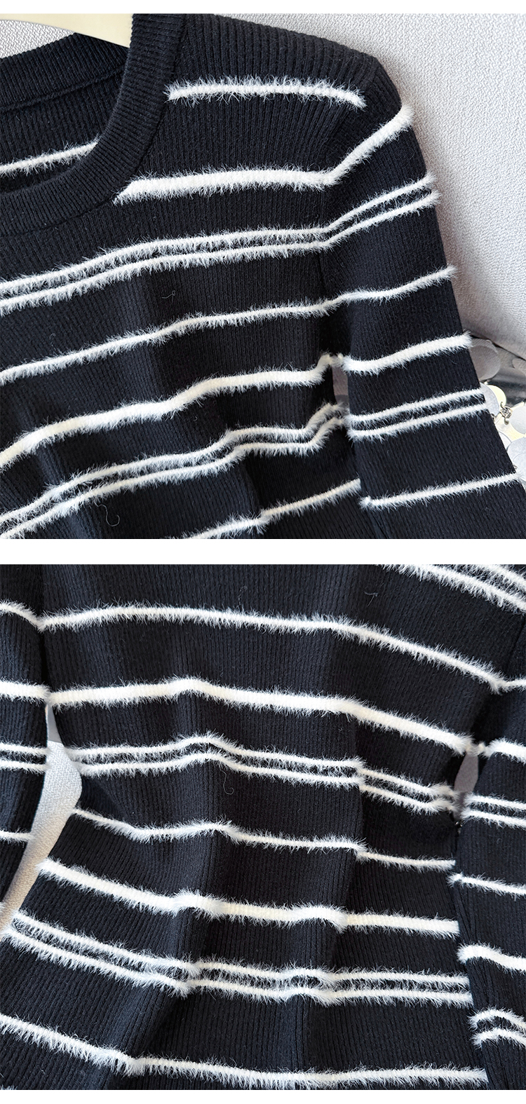 MY14455# 毛衣圆领套头毛绒木耳边针织衫女加厚条纹打底衫内搭外穿女裝貨源服裝批發