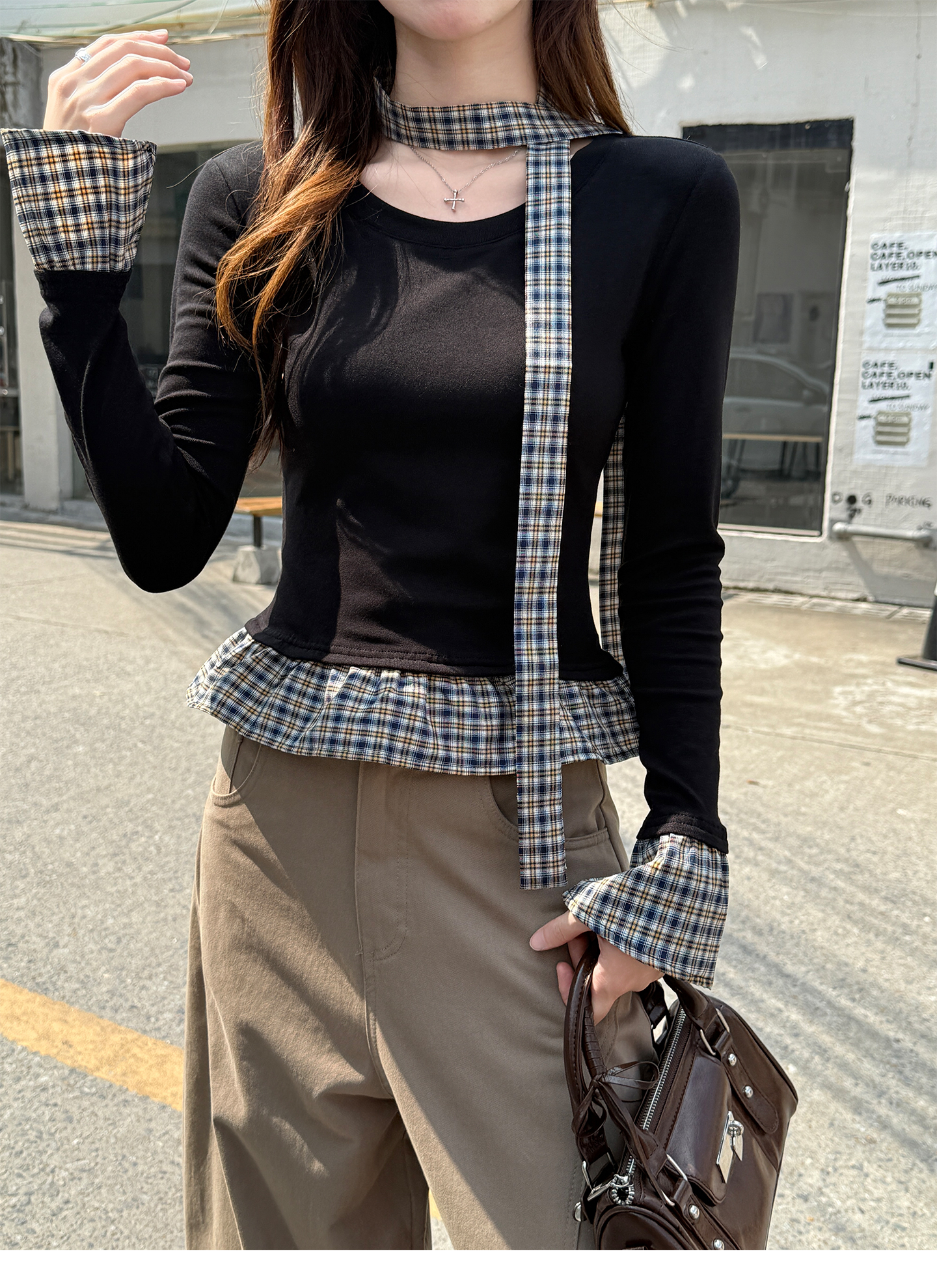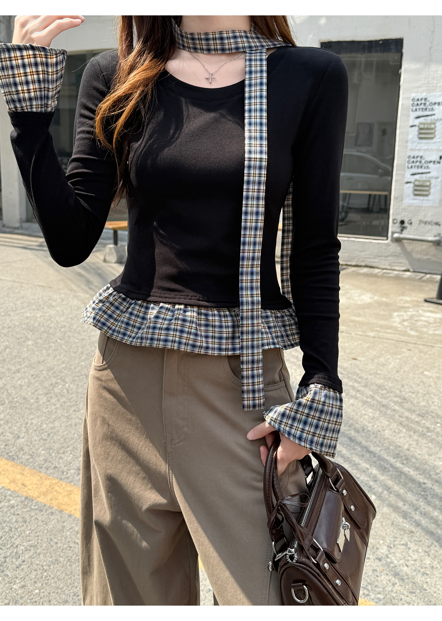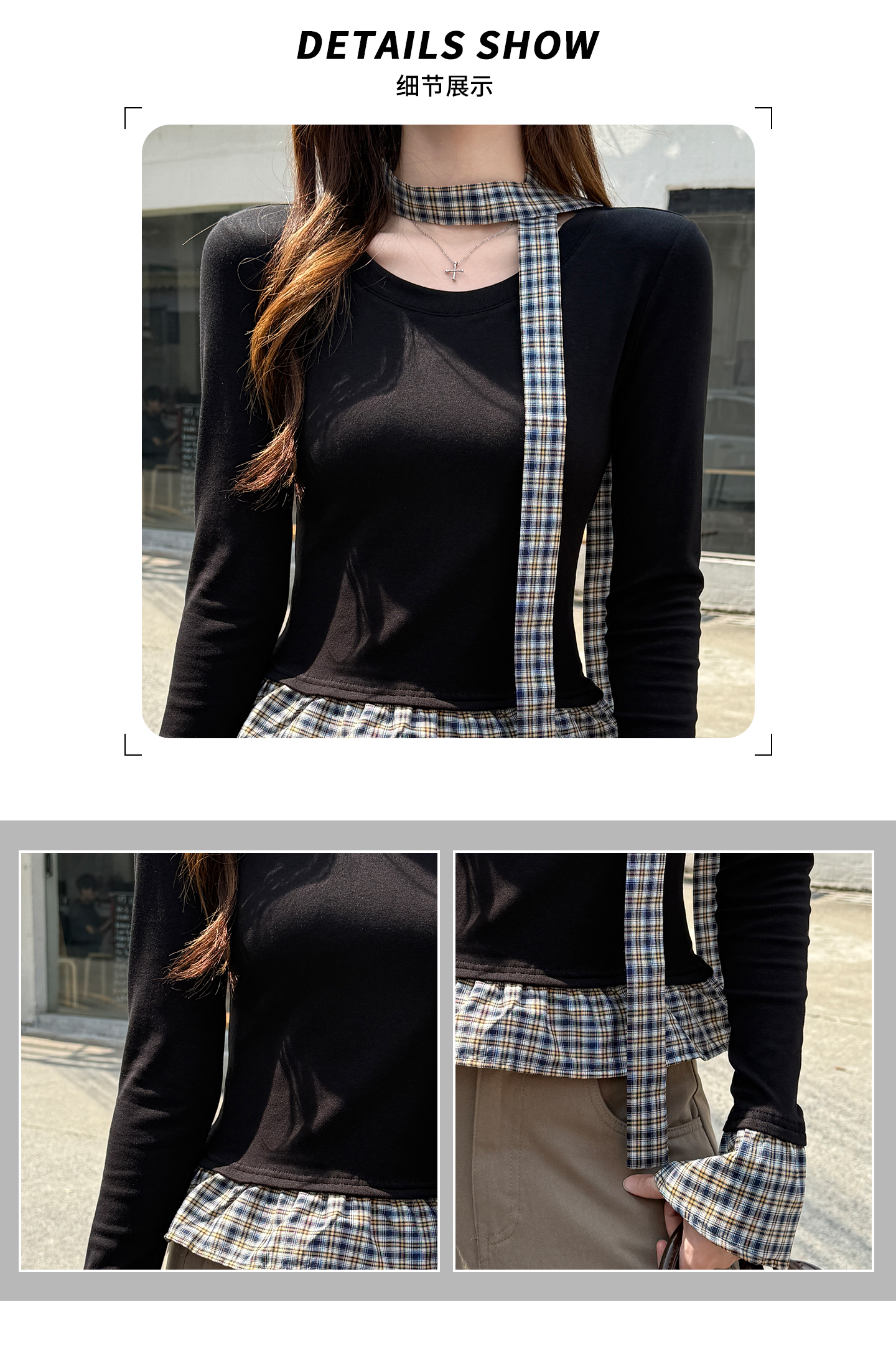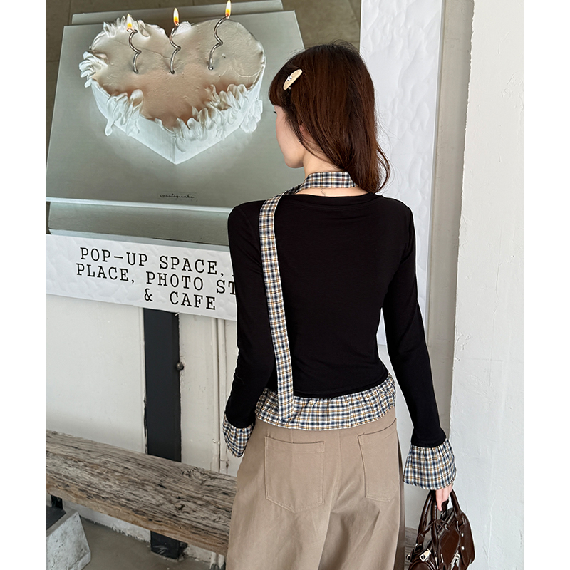 MY14498# 黑色格纹拼接花边假两件打底衫女内搭秋冬设计感长袖t恤女裝貨源服裝批發