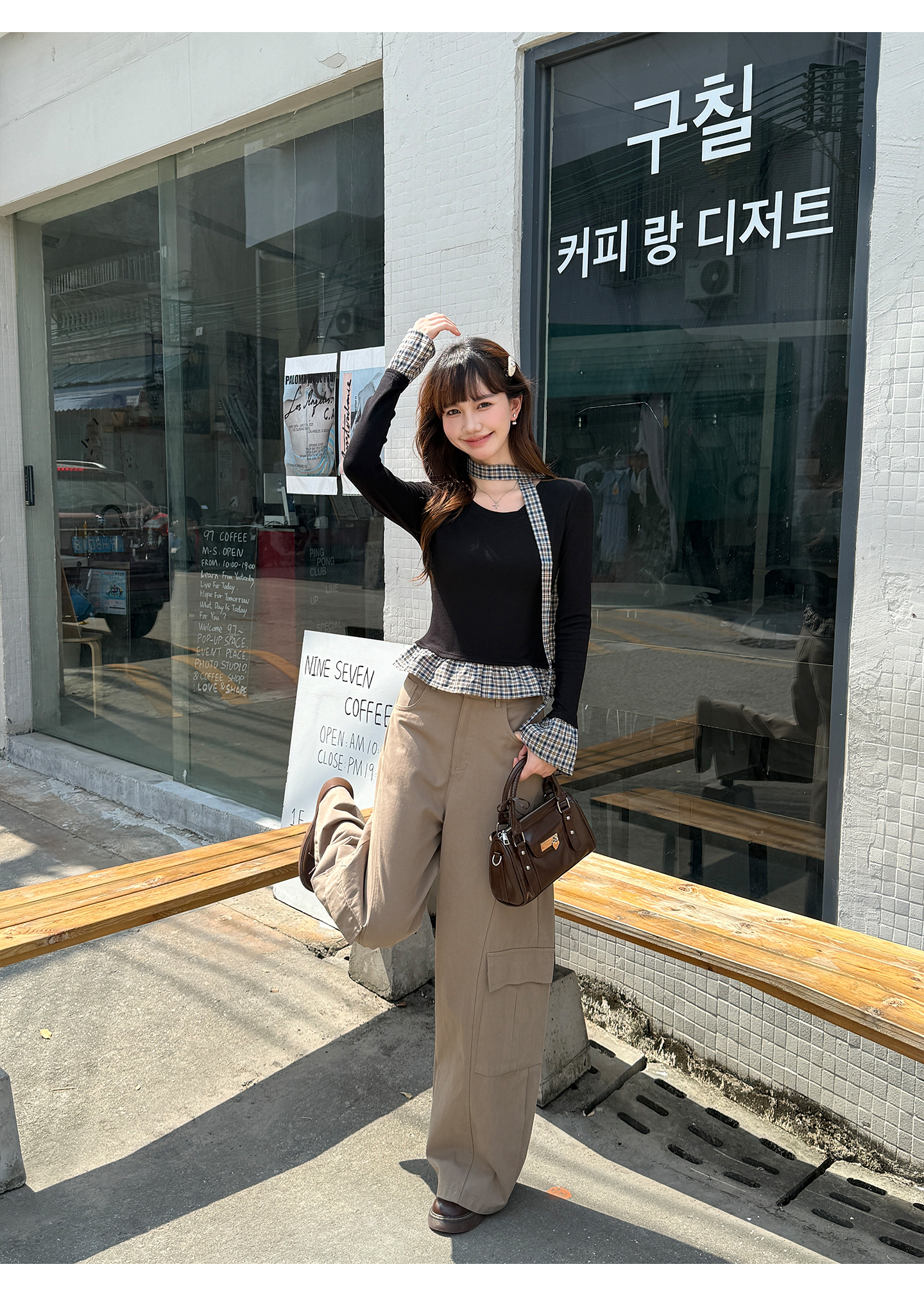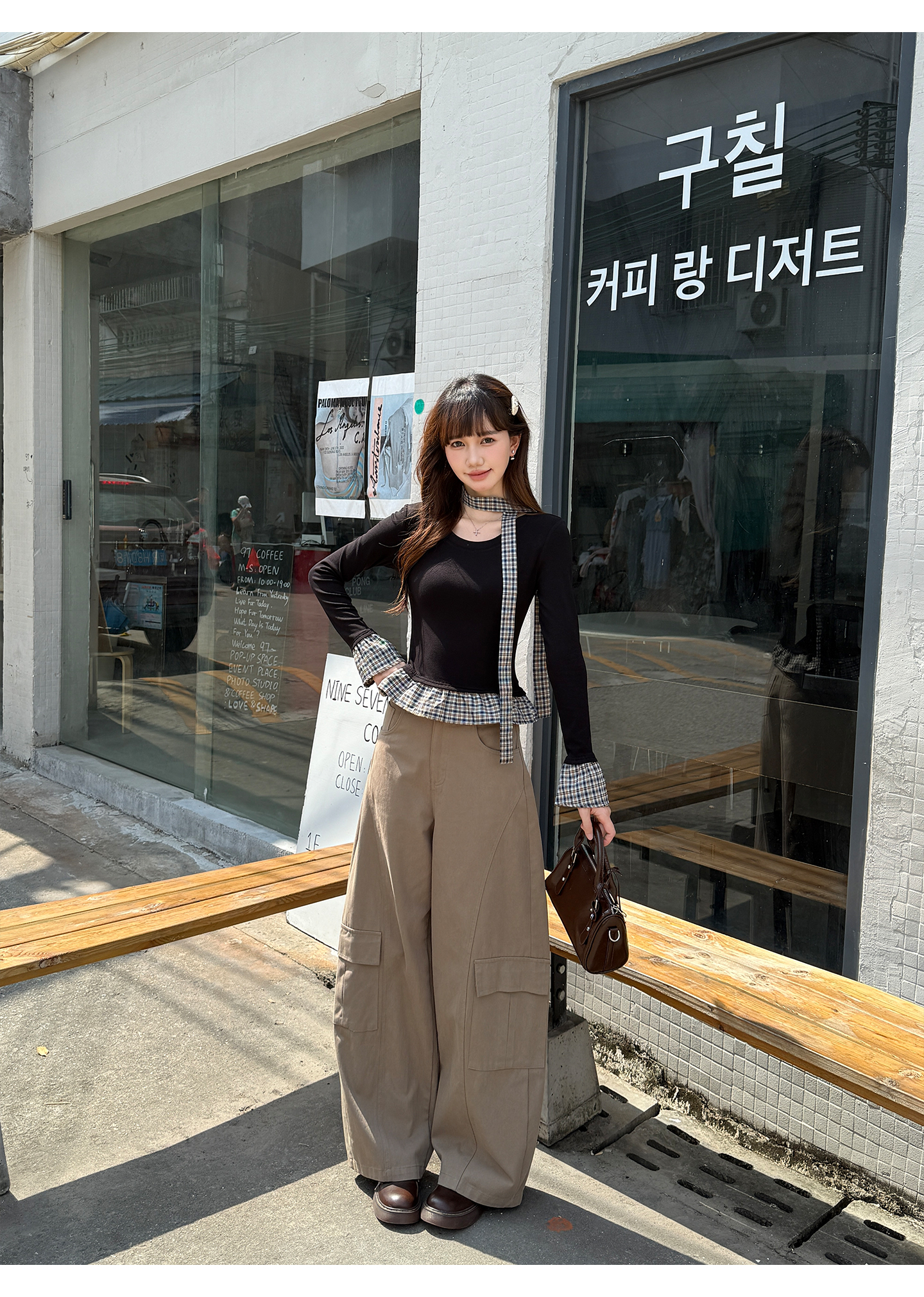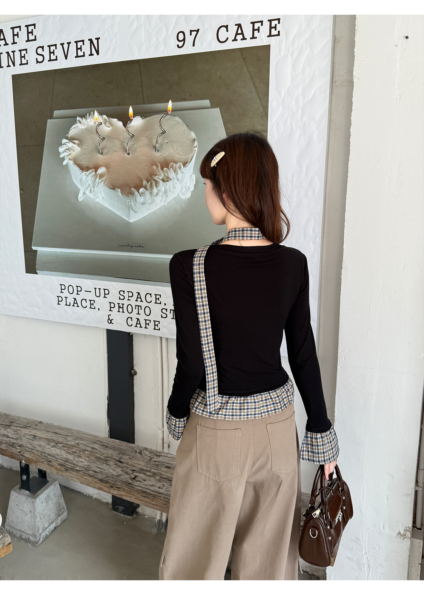 MY14498# 黑色格纹拼接花边假两件打底衫女内搭秋冬设计感长袖t恤女裝貨源服裝批發