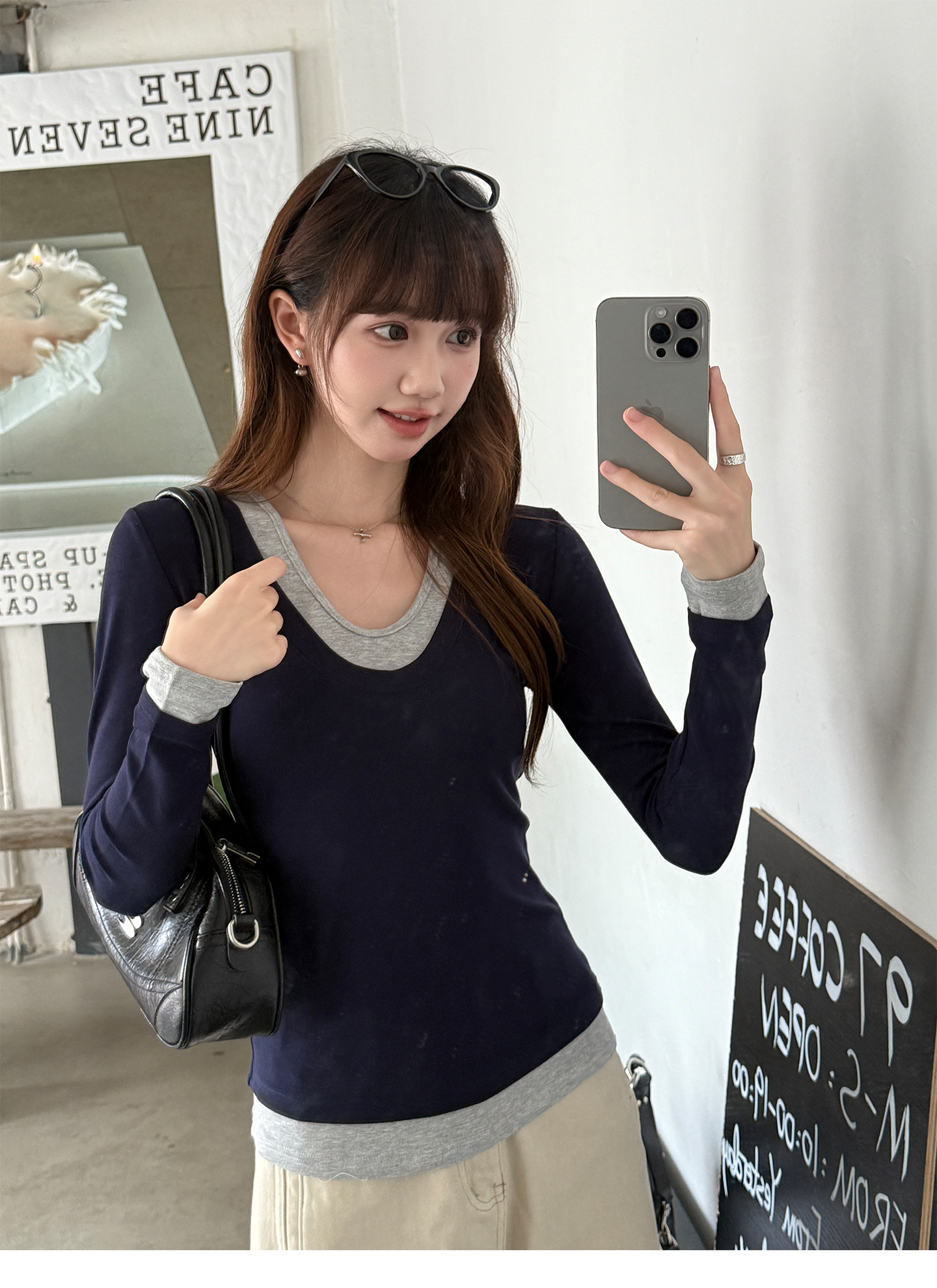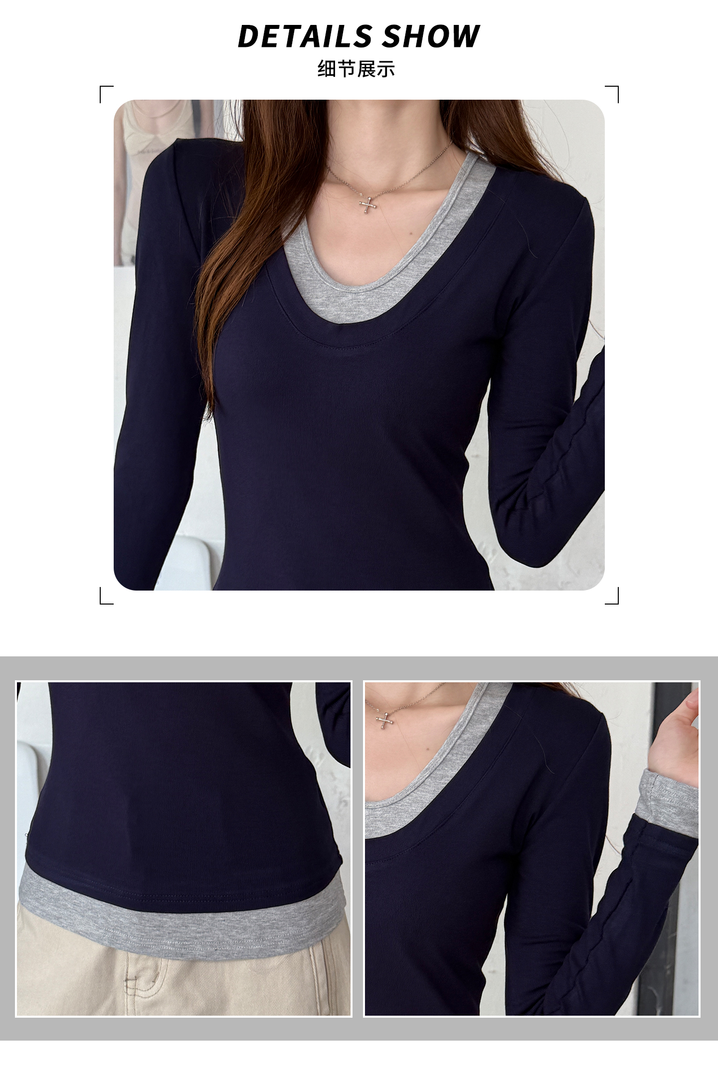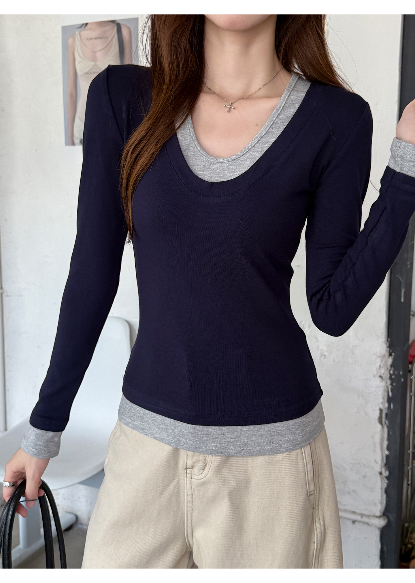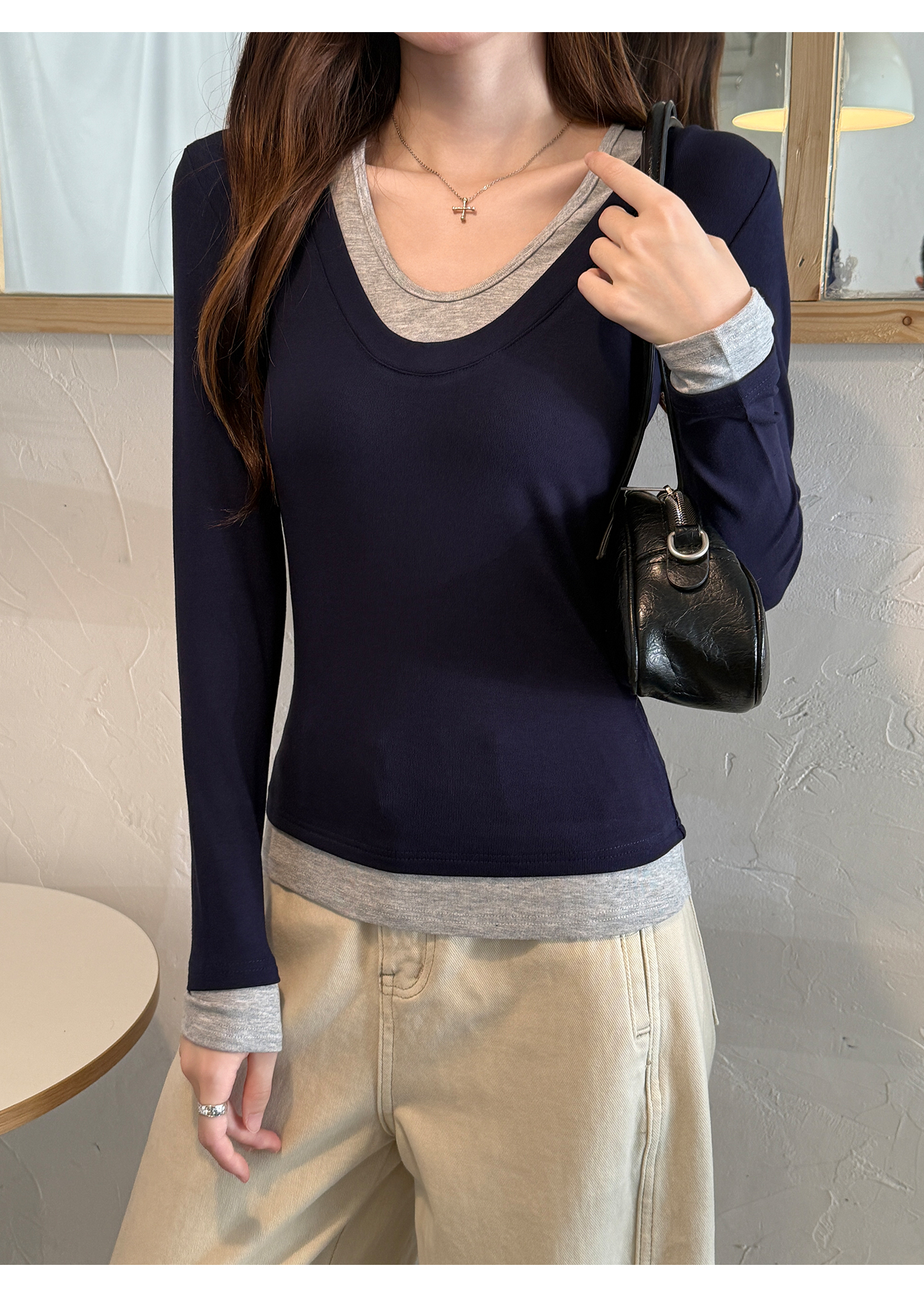 MY14499# 藏青色拼接假两件v领打底衫内搭女秋冬修身显瘦长袖t恤女裝貨源服裝批發