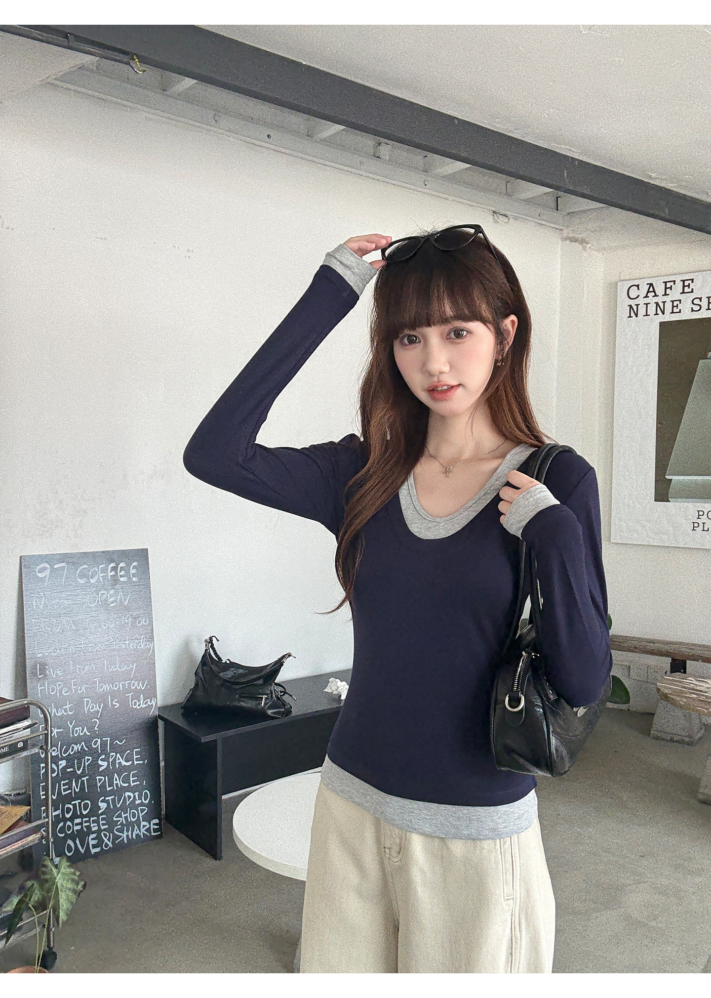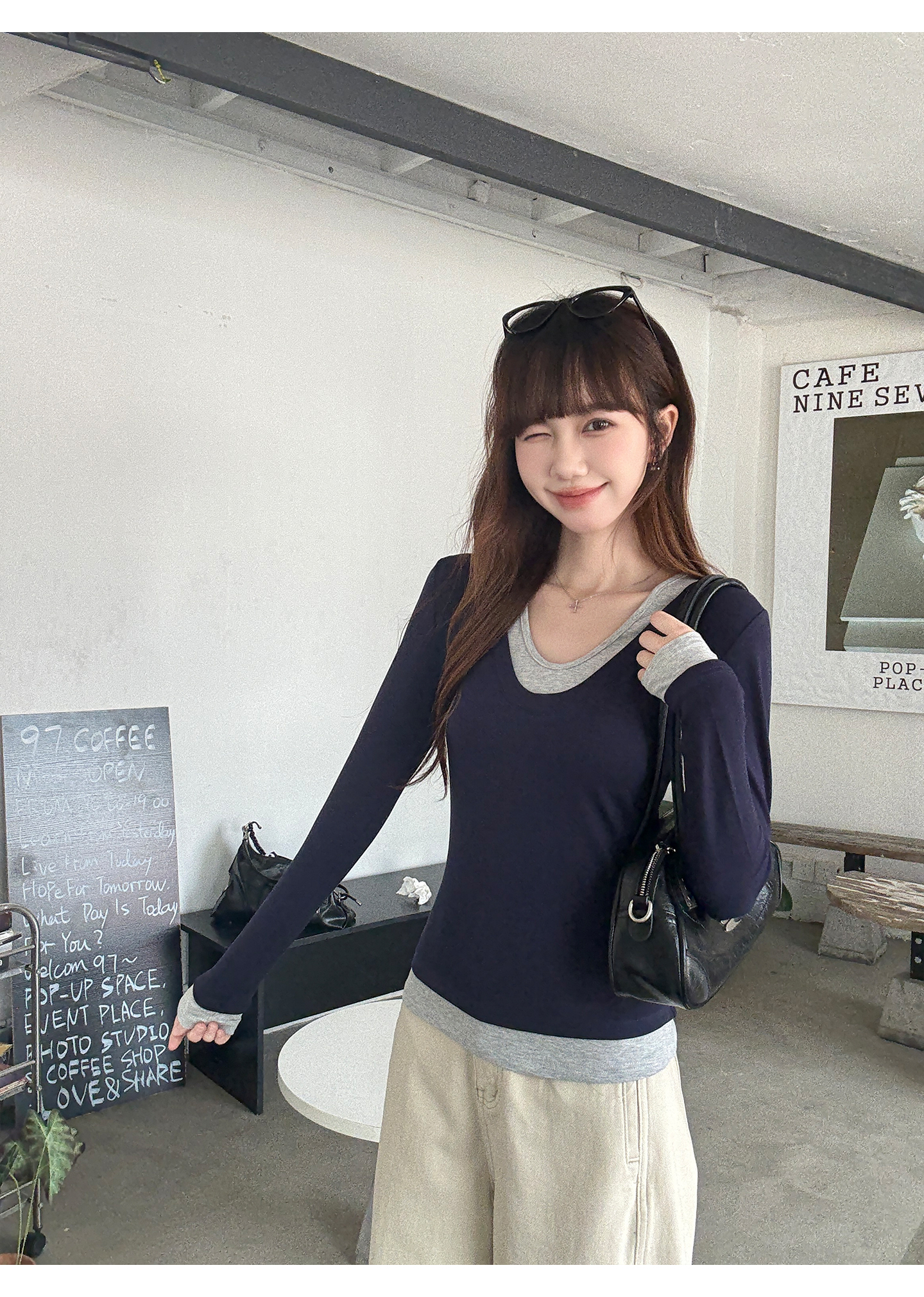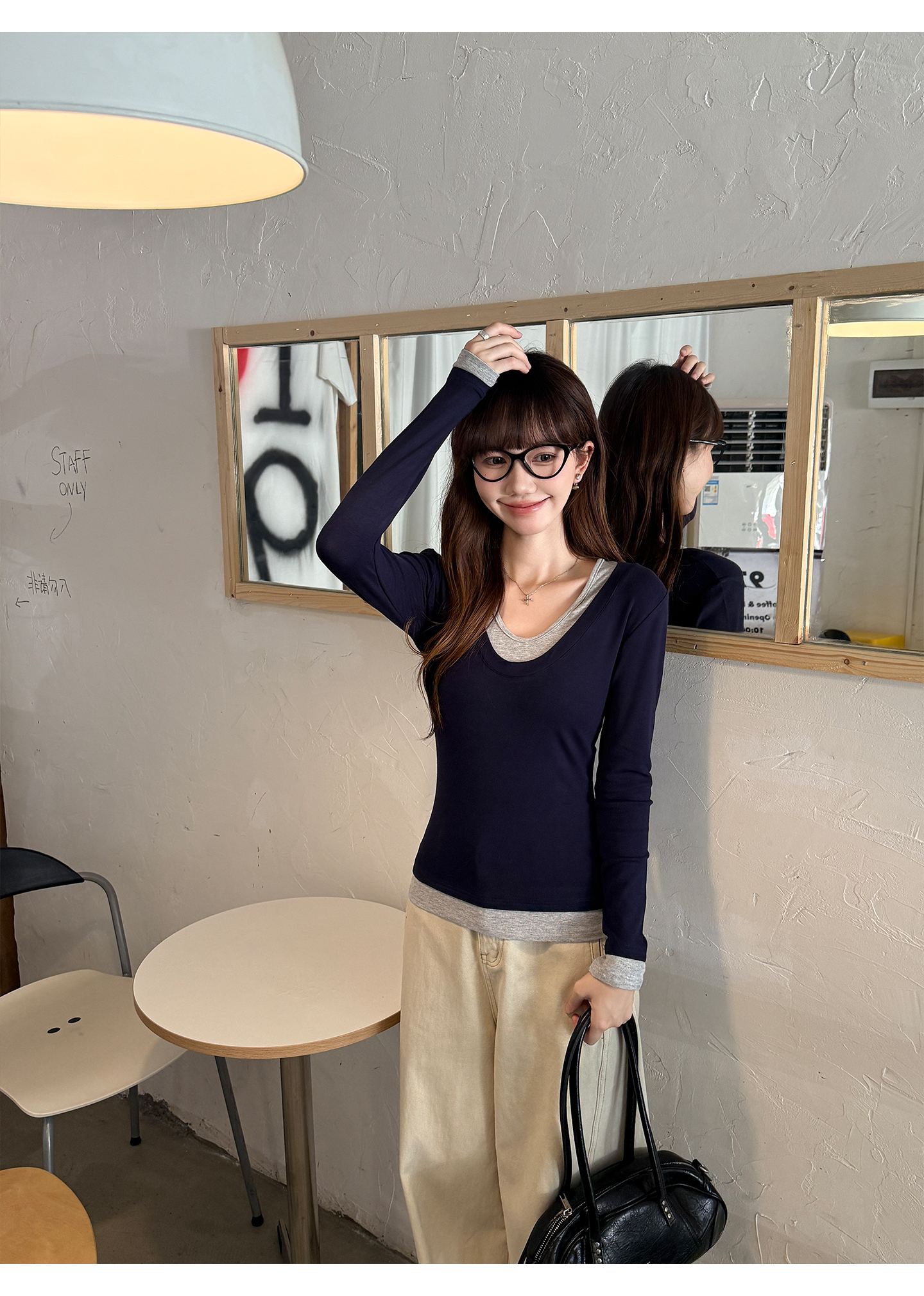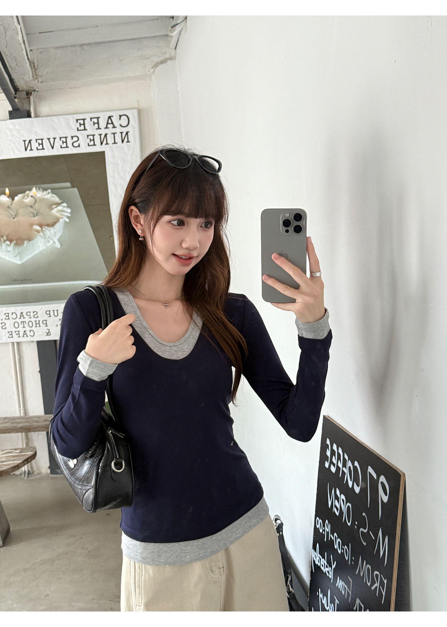 MY14499# 藏青色拼接假两件v领打底衫内搭女秋冬修身显瘦长袖t恤女裝貨源服裝批發