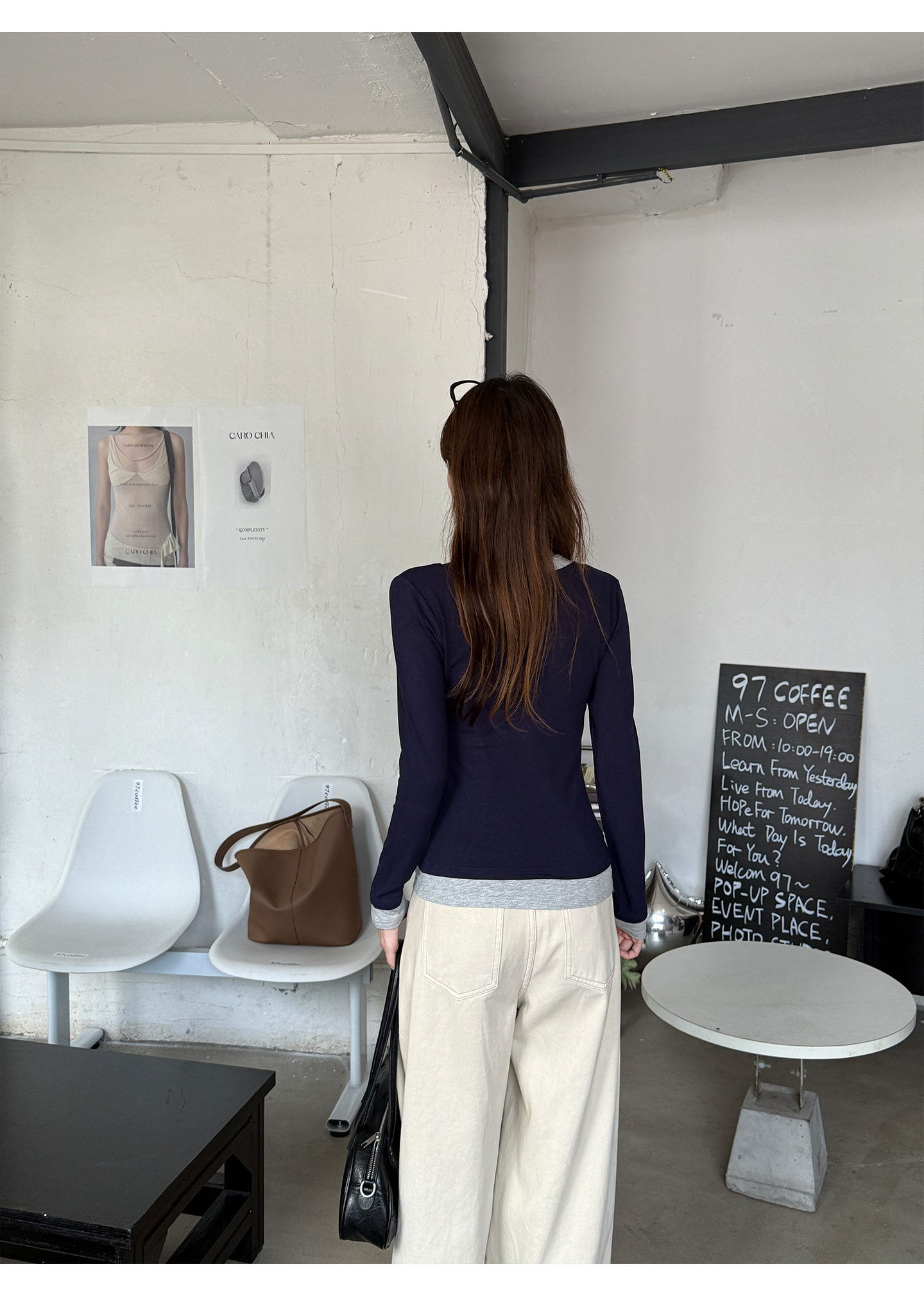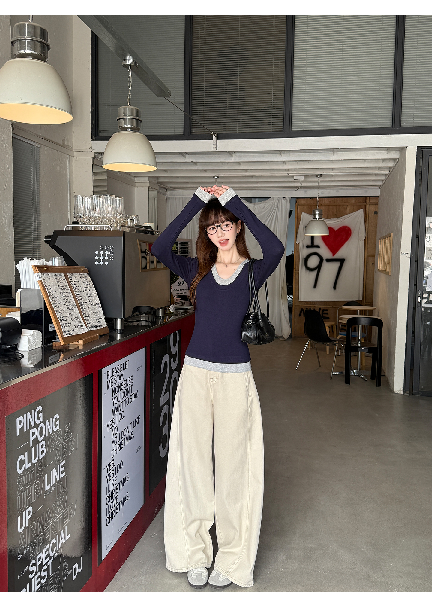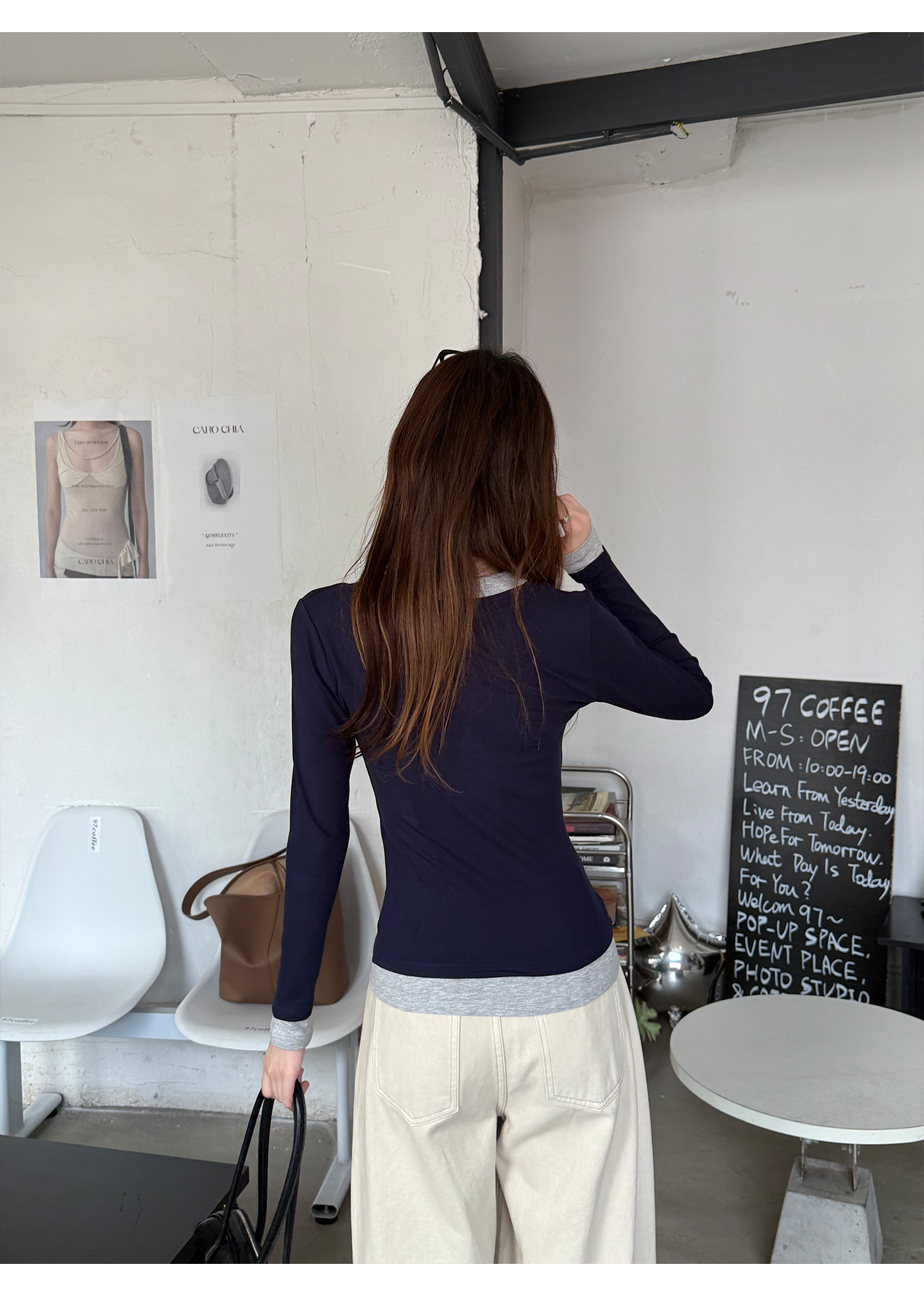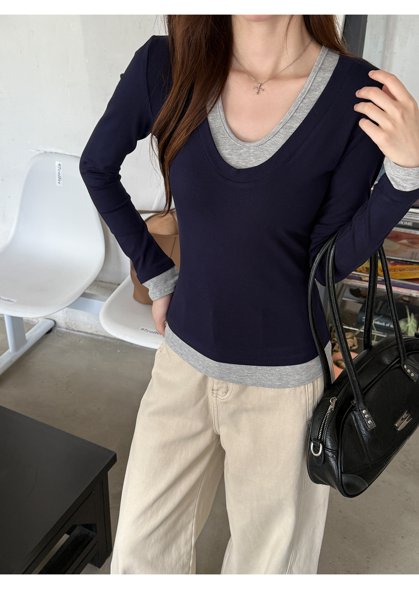 MY14499# 藏青色拼接假两件v领打底衫内搭女秋冬修身显瘦长袖t恤女裝貨源服裝批發