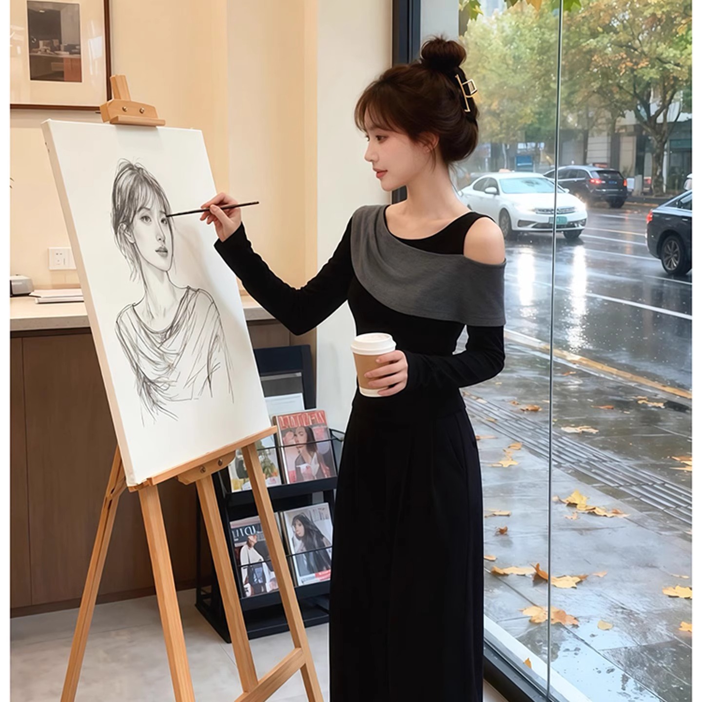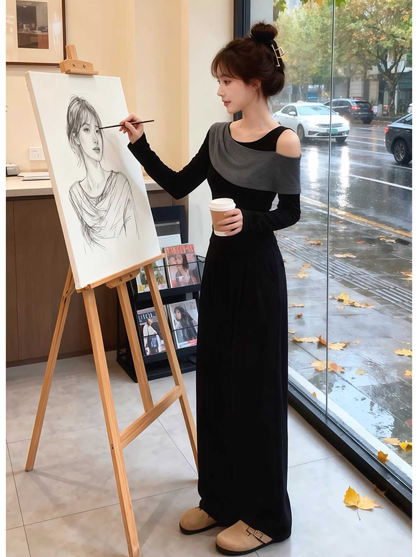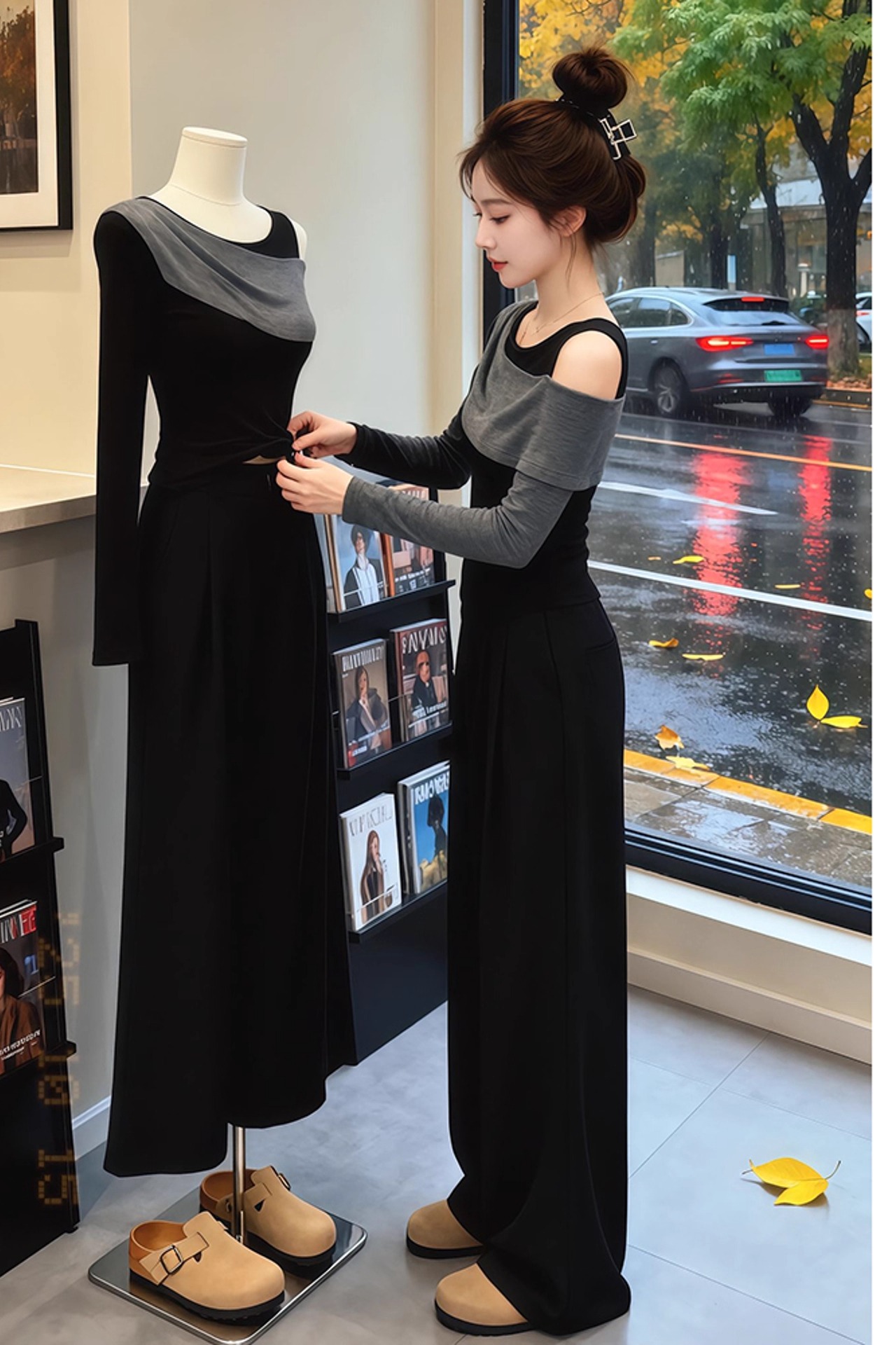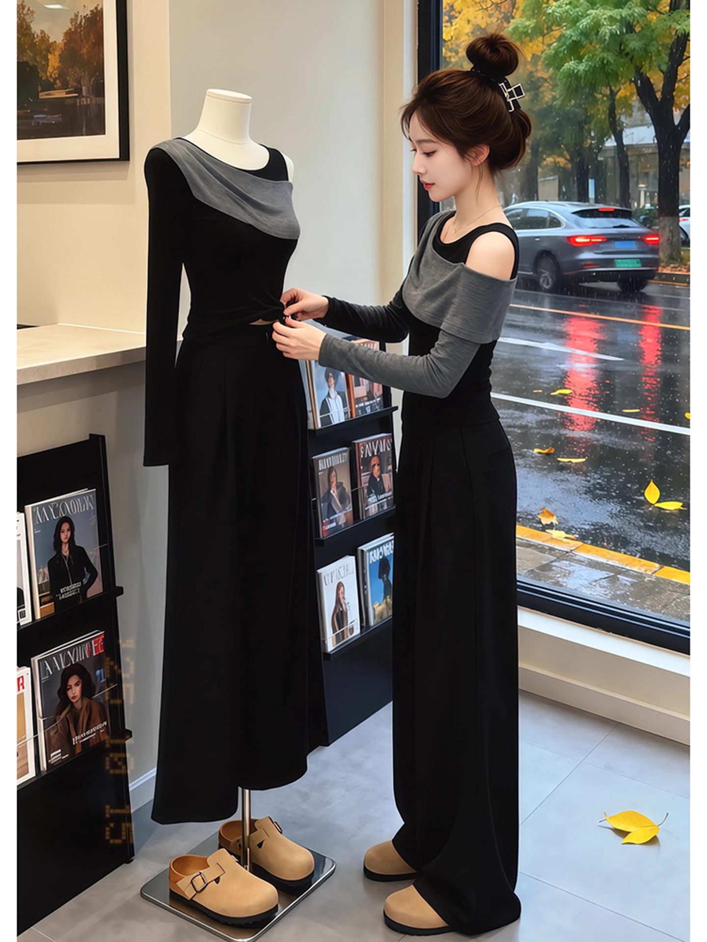 MY14598# 时髦圆领拼接撞色长袖T恤女装今年流行爆款显瘦假两件打底衫上衣女裝貨源服裝批發