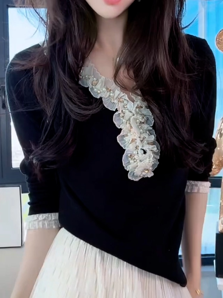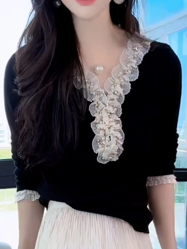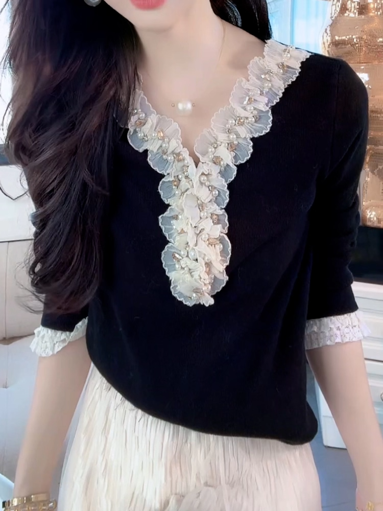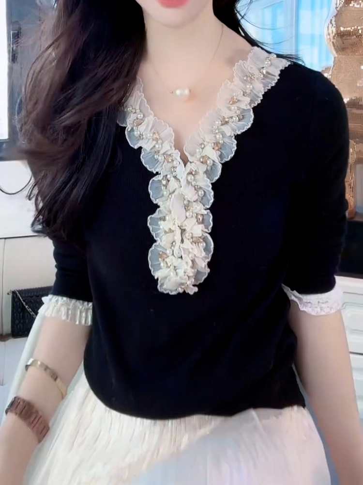 MY14608# 法式木耳边钉珠V领针织衫女高级感蕾丝花边拼接长袖打底上衣女裝貨源服裝批發