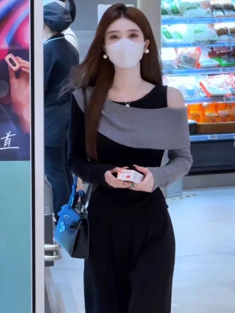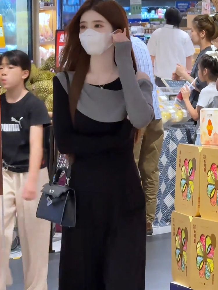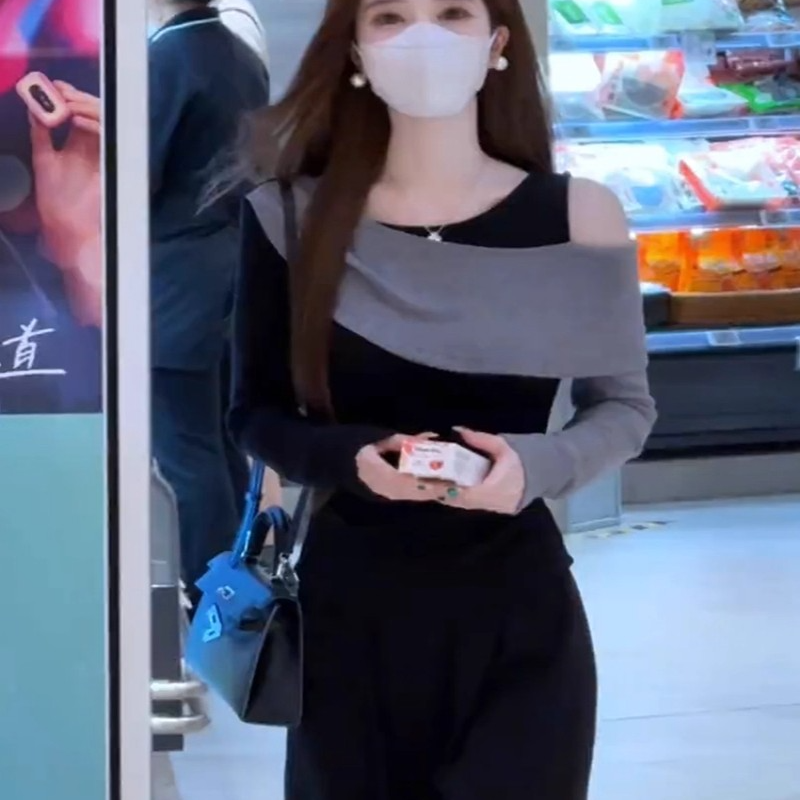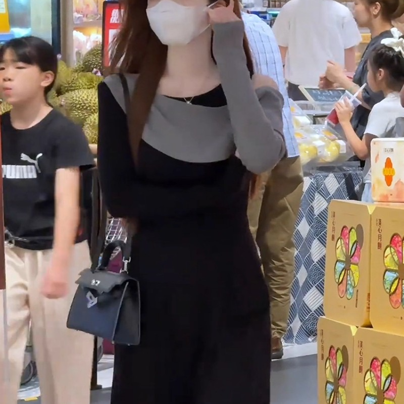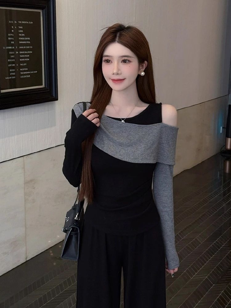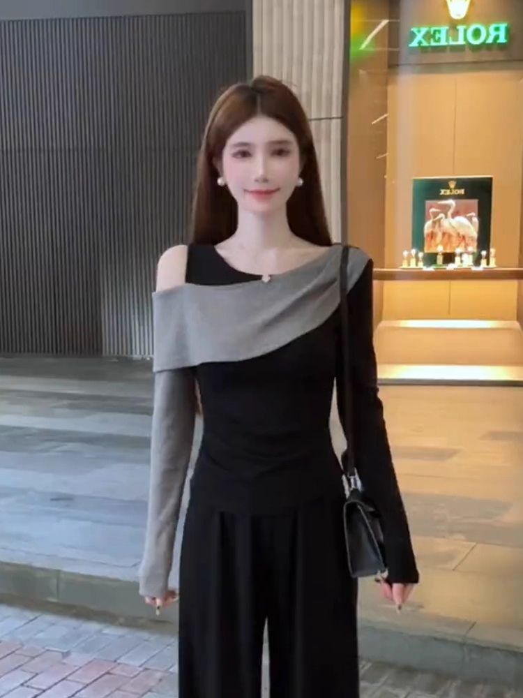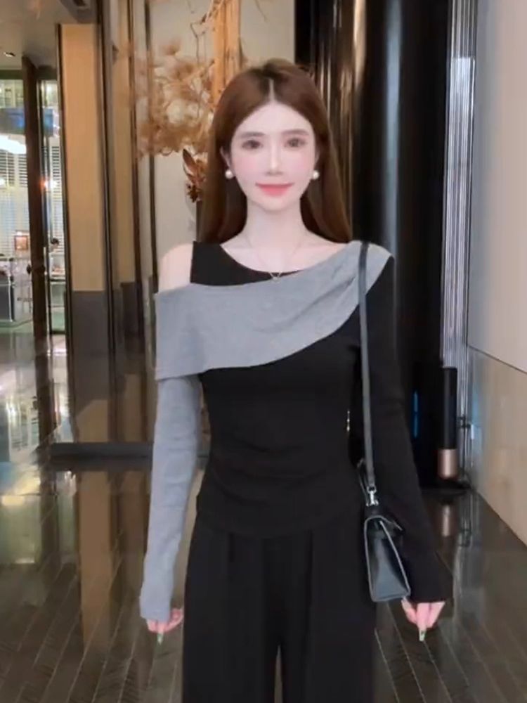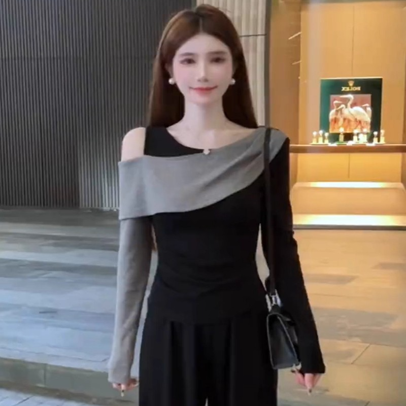 MY14616# 时髦圆领拼接撞色长袖T恤女装今年流行爆款显瘦假两件打底衫上衣女裝貨源服裝批發