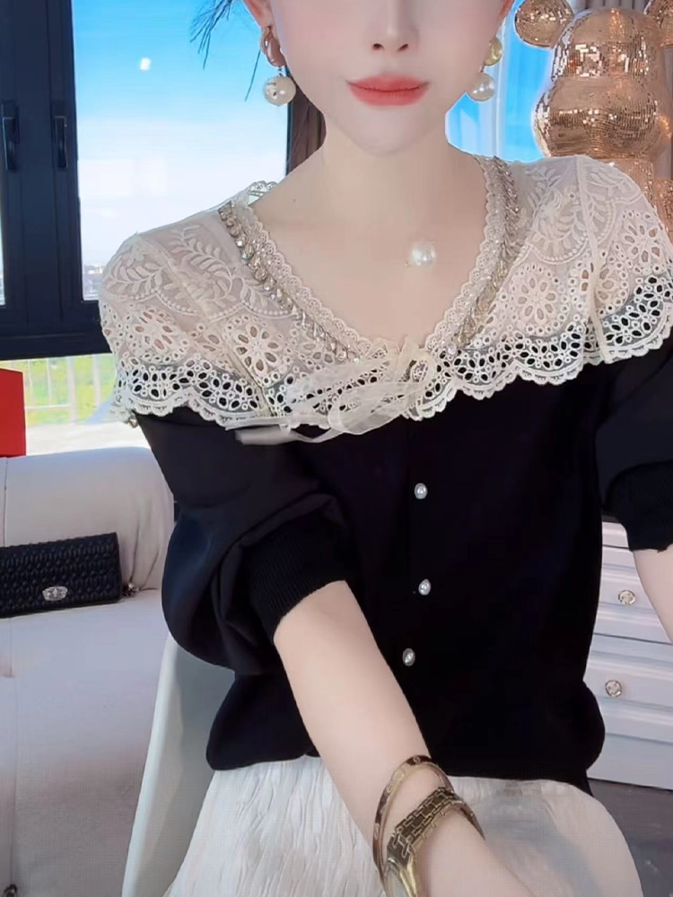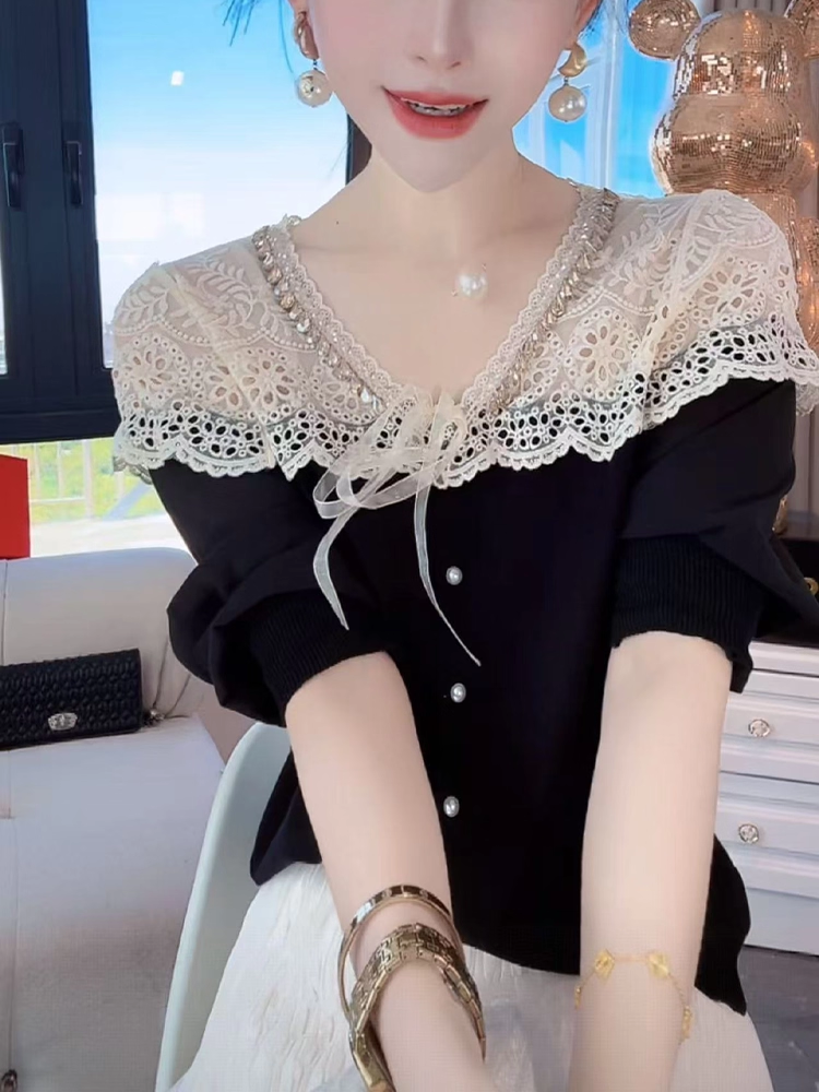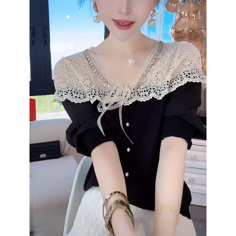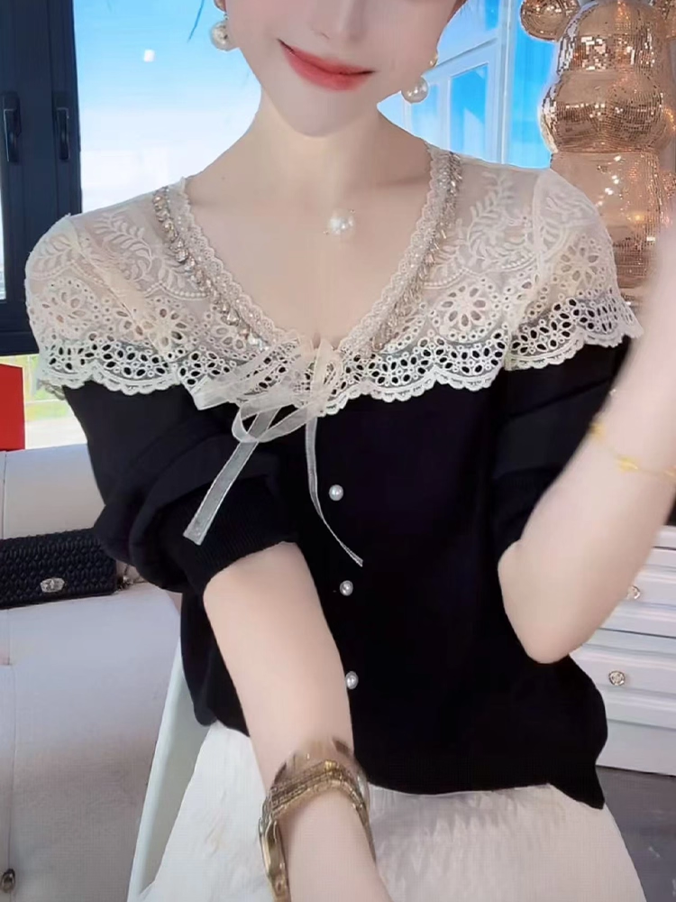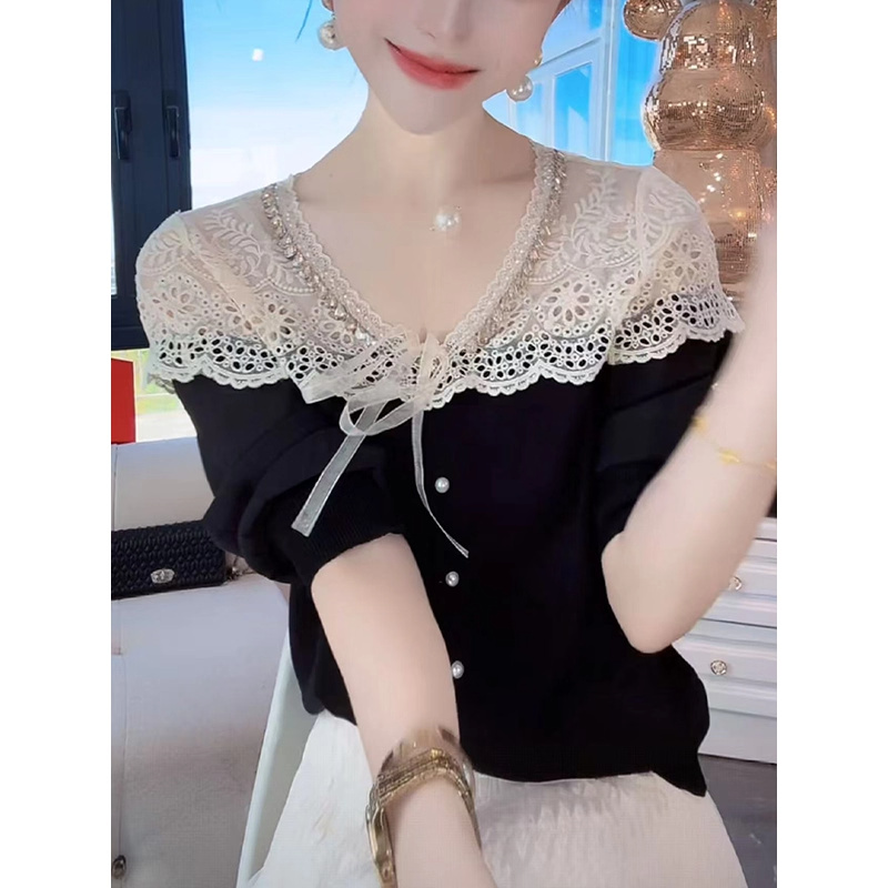 MY14617# 法式气质蕾丝拼接针织衫新款时尚重工镶钻镂空v领上衣女裝貨源服裝批發