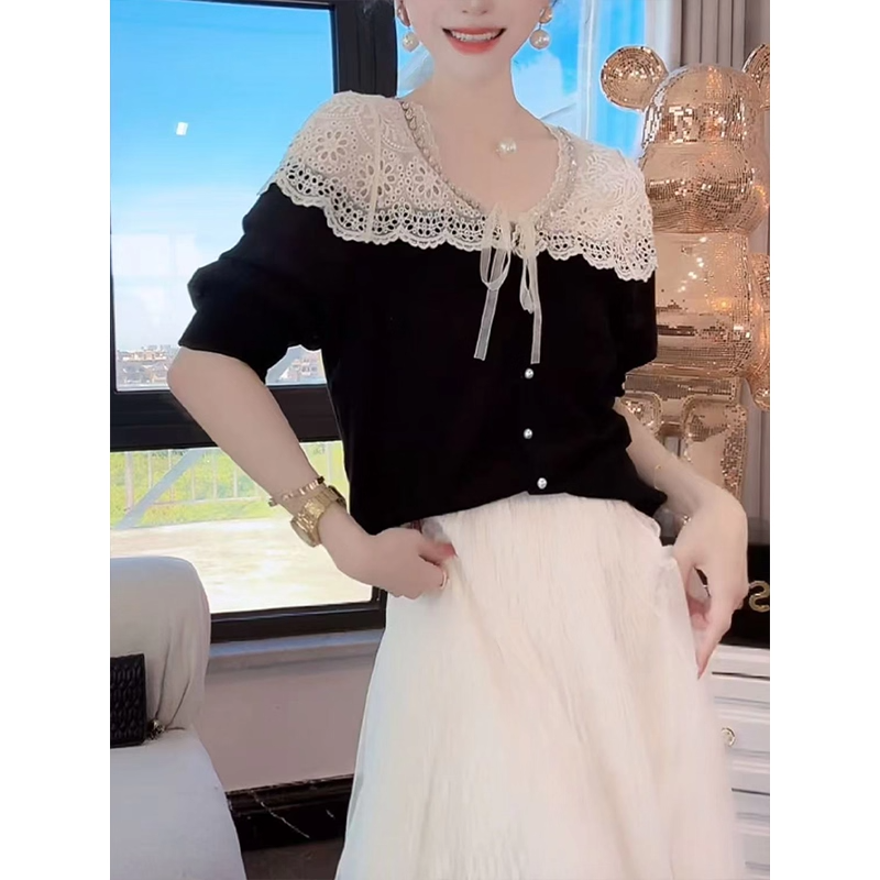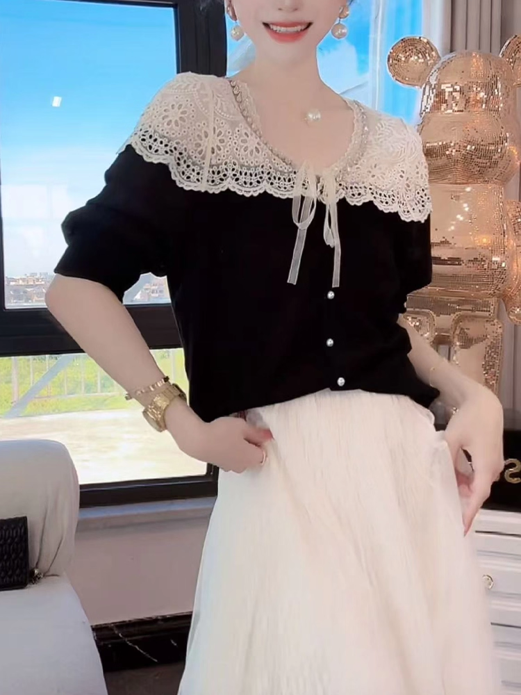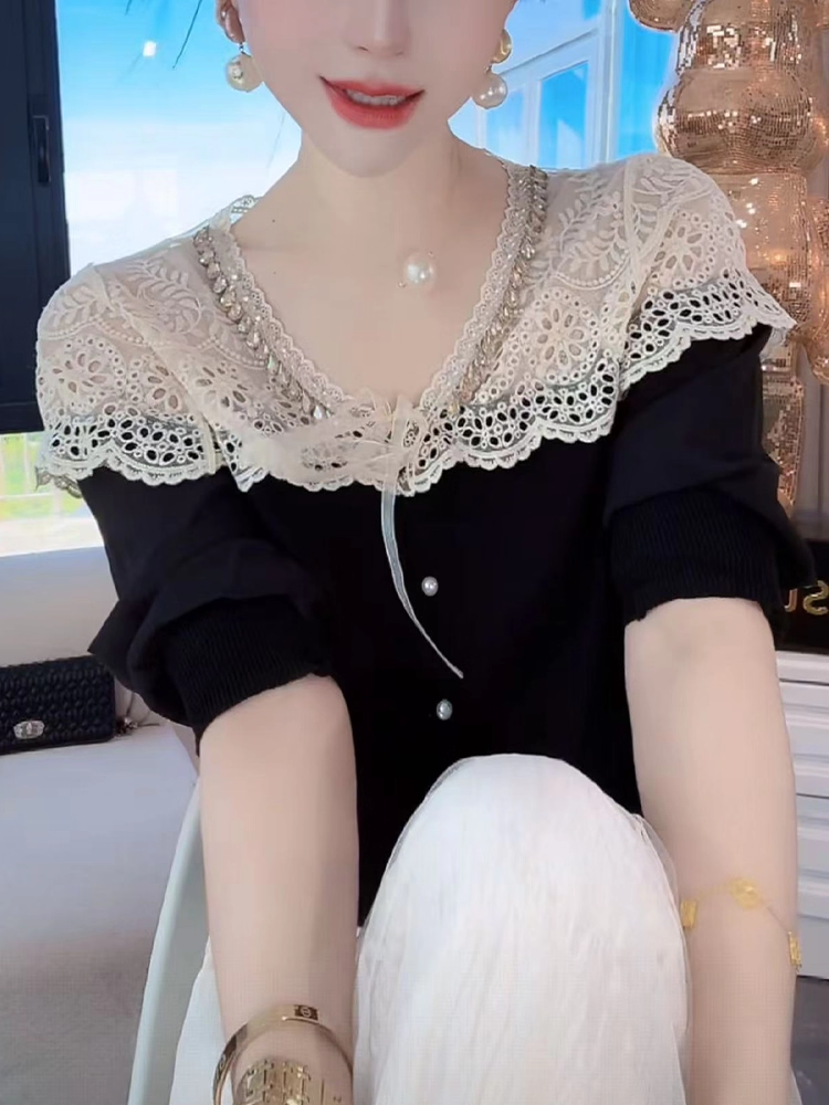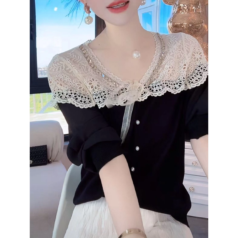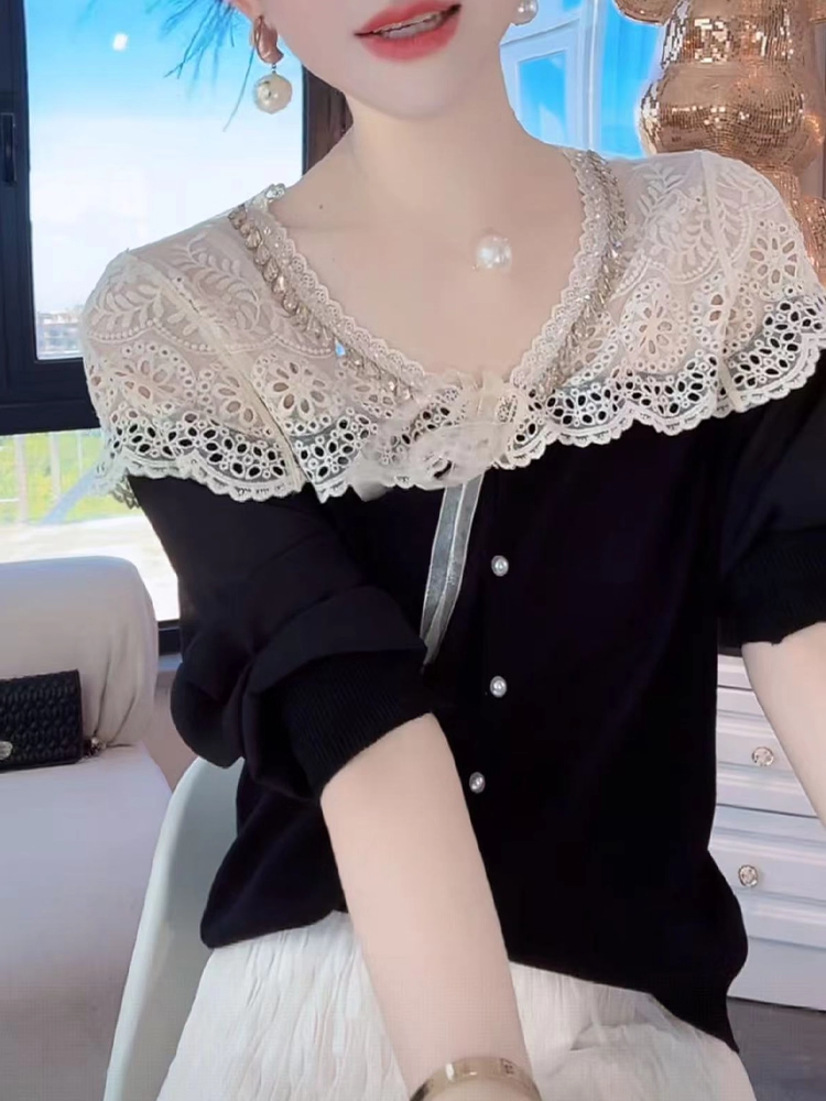 MY14617# 法式气质蕾丝拼接针织衫新款时尚重工镶钻镂空v领上衣女裝貨源服裝批發