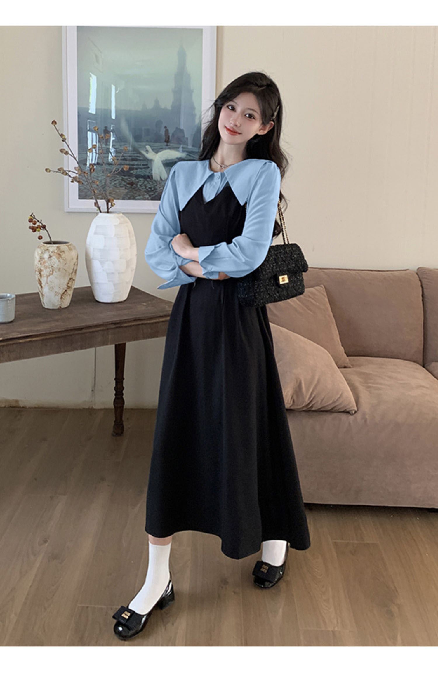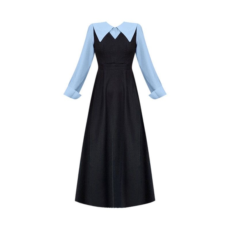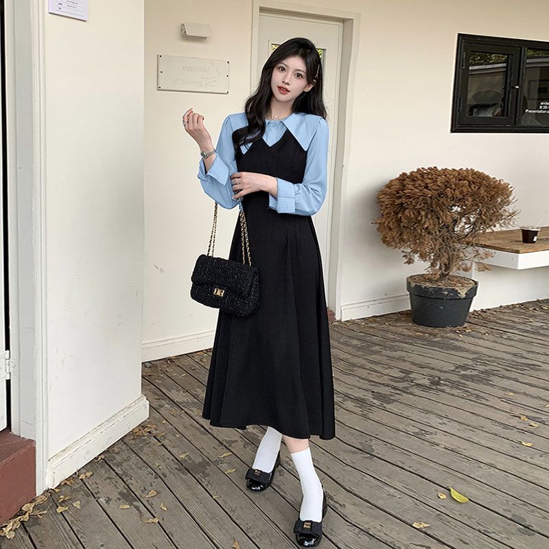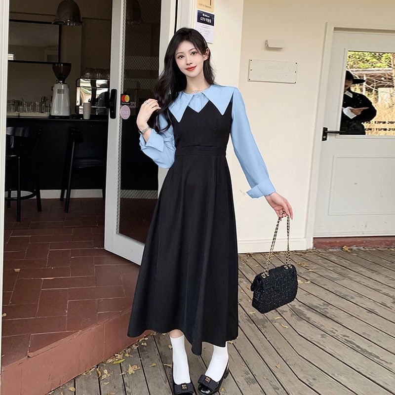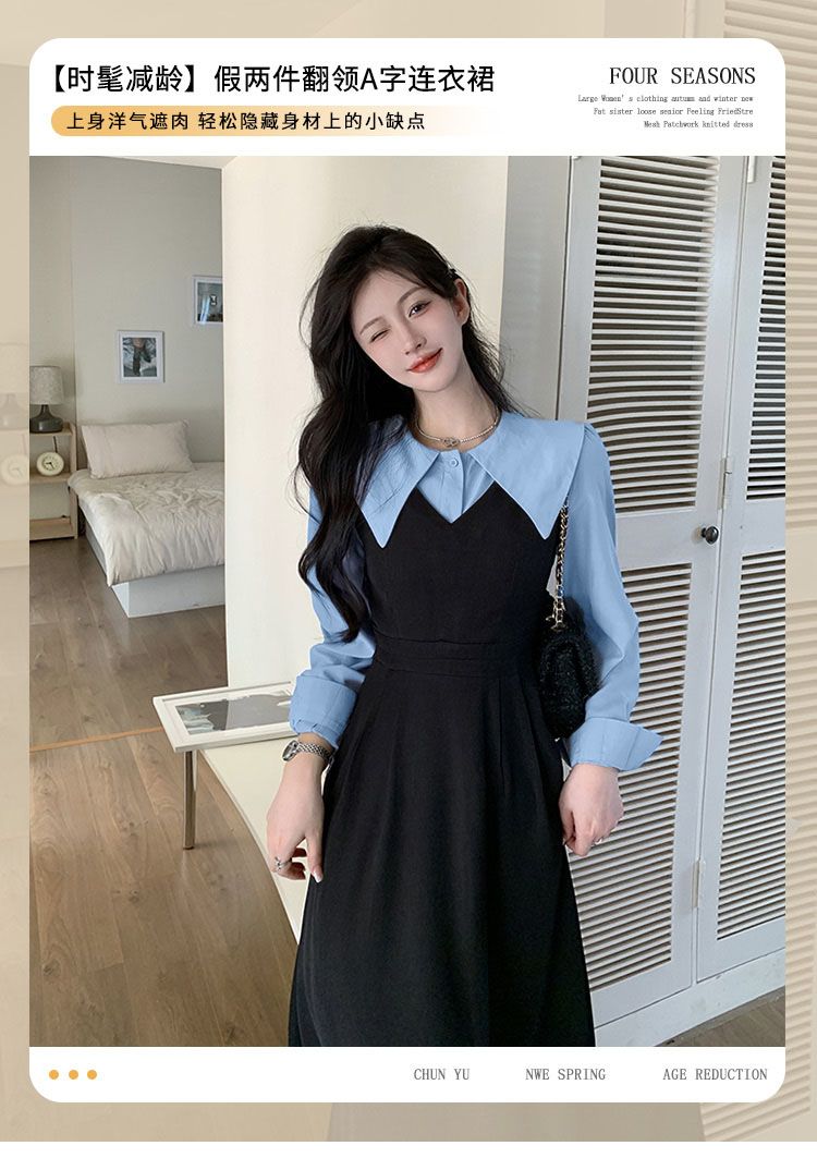 MY14619# 捻丝乱麻秋学院假两件翻领长袖衬衫收腰显瘦A字连衣裙女裝貨源服裝批發