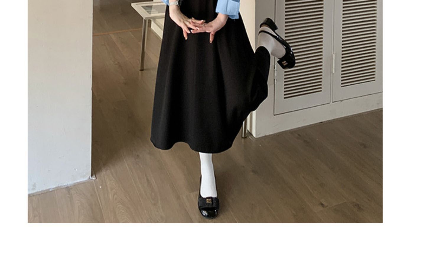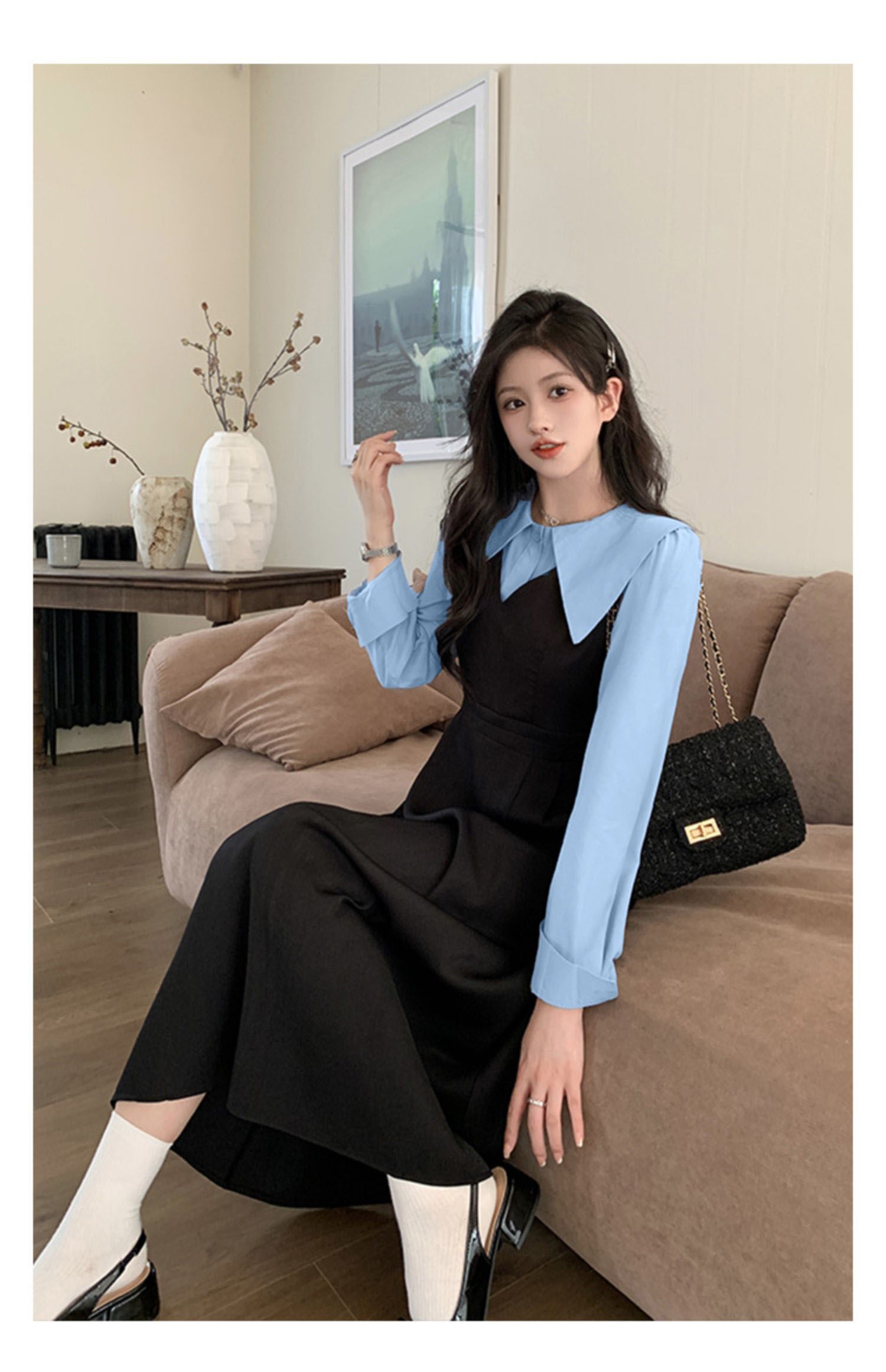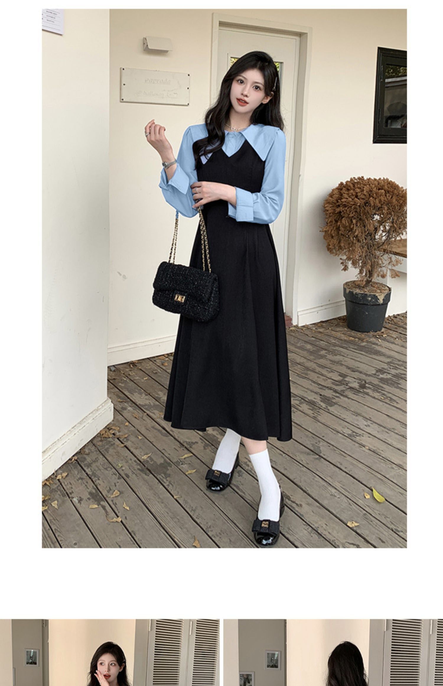 MY14619# 捻丝乱麻秋学院假两件翻领长袖衬衫收腰显瘦A字连衣裙女裝貨源服裝批發