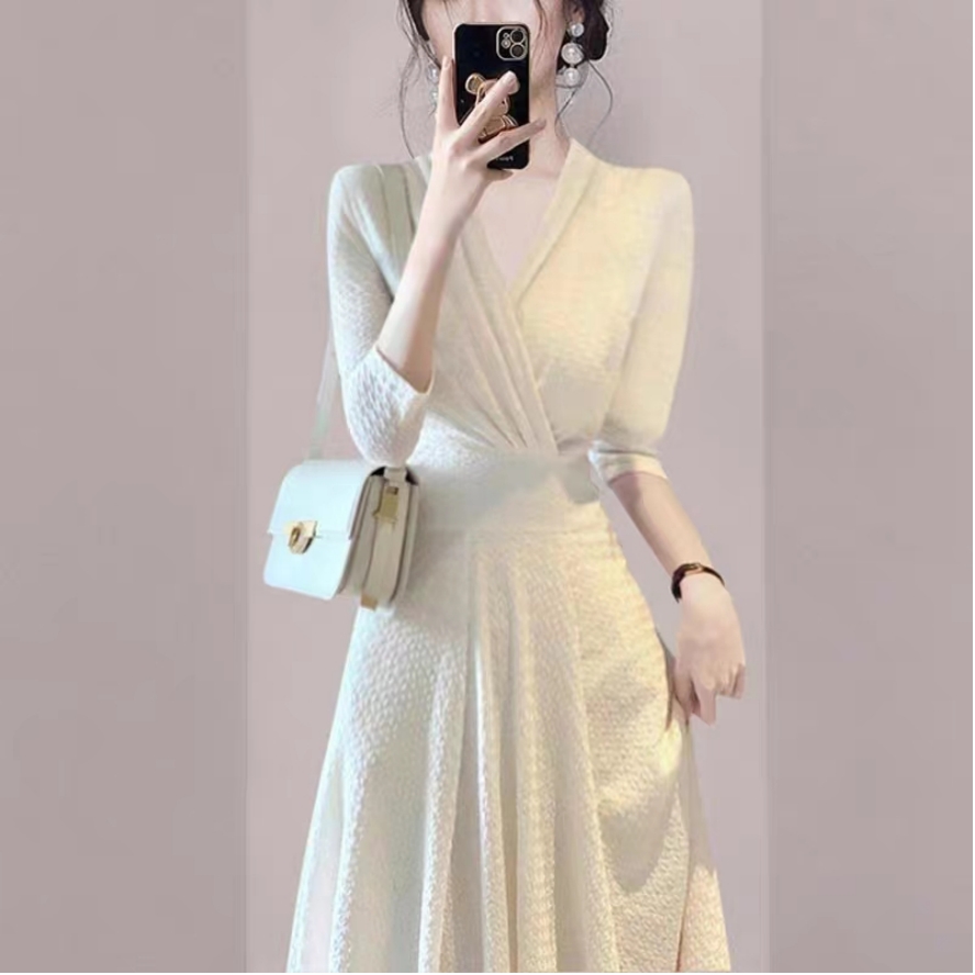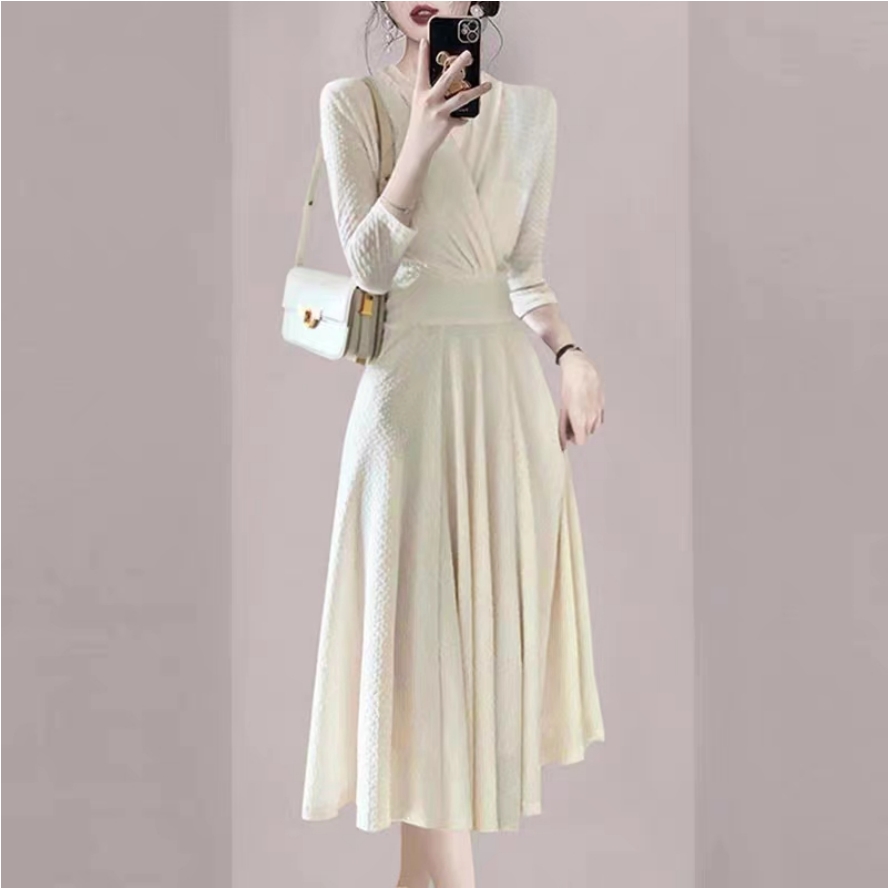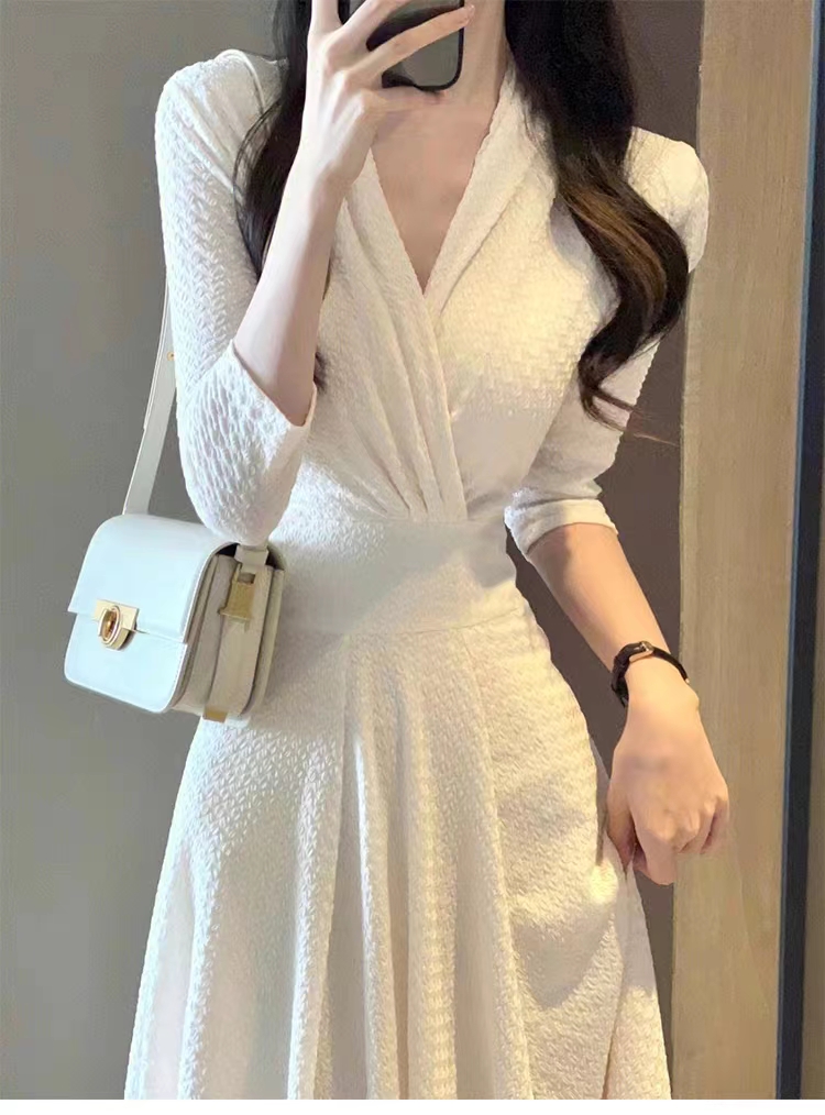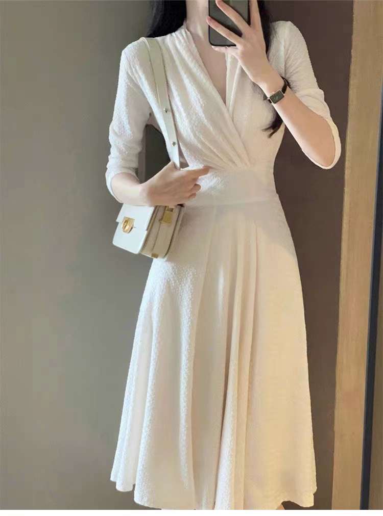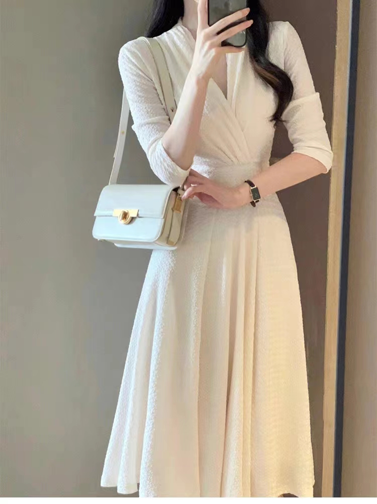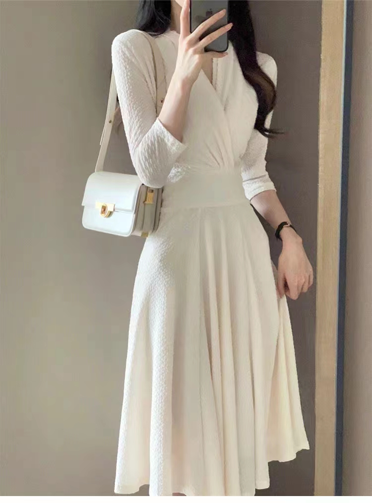 MY14642# 法式长裙气质女神范女装白色长袖连衣裙过膝裙子有内衬女裝貨源服裝批發