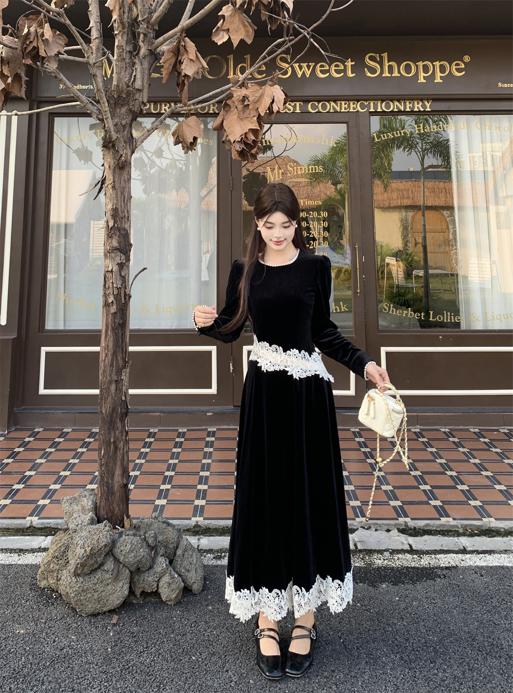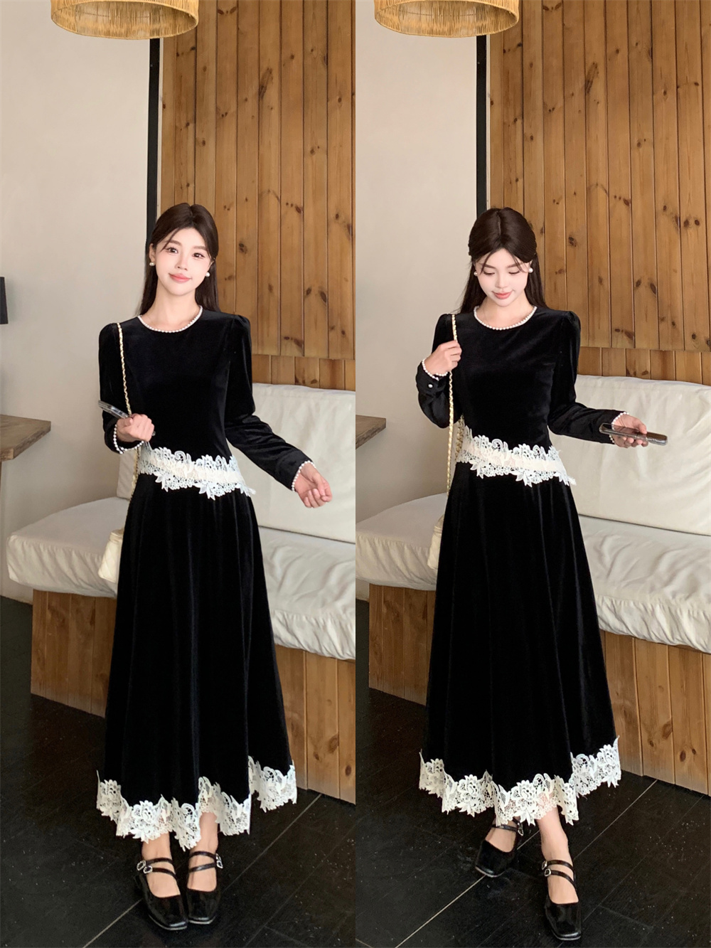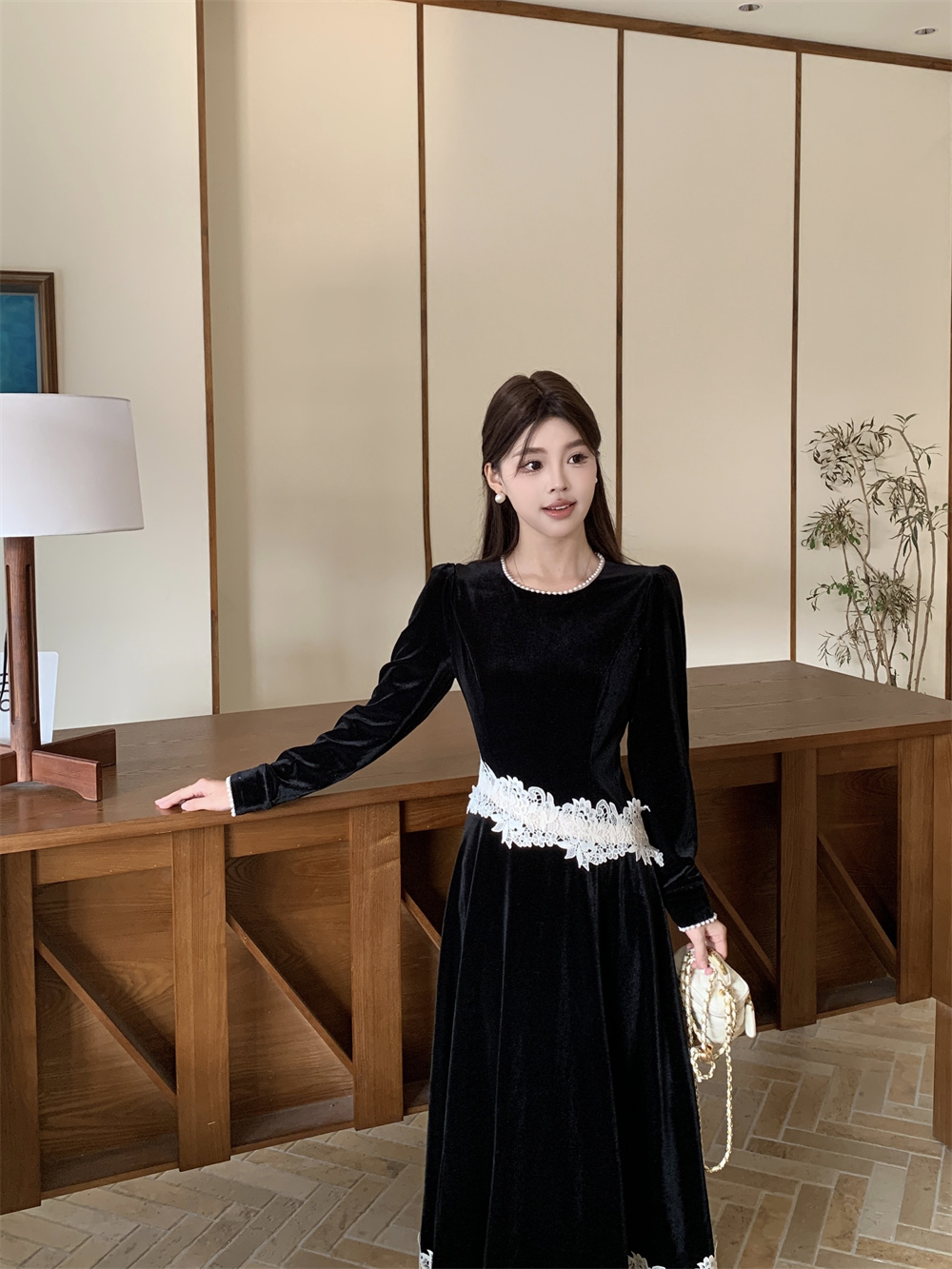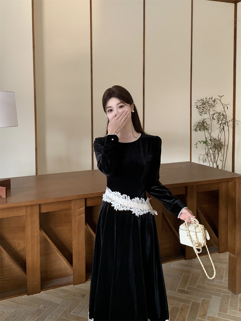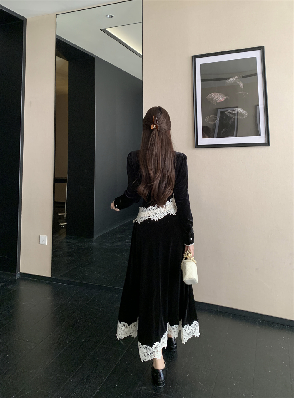 MY14653# 大码法式精致风假两件连衣裙秋季撞色黑色丝绒裙女裝貨源服裝批發