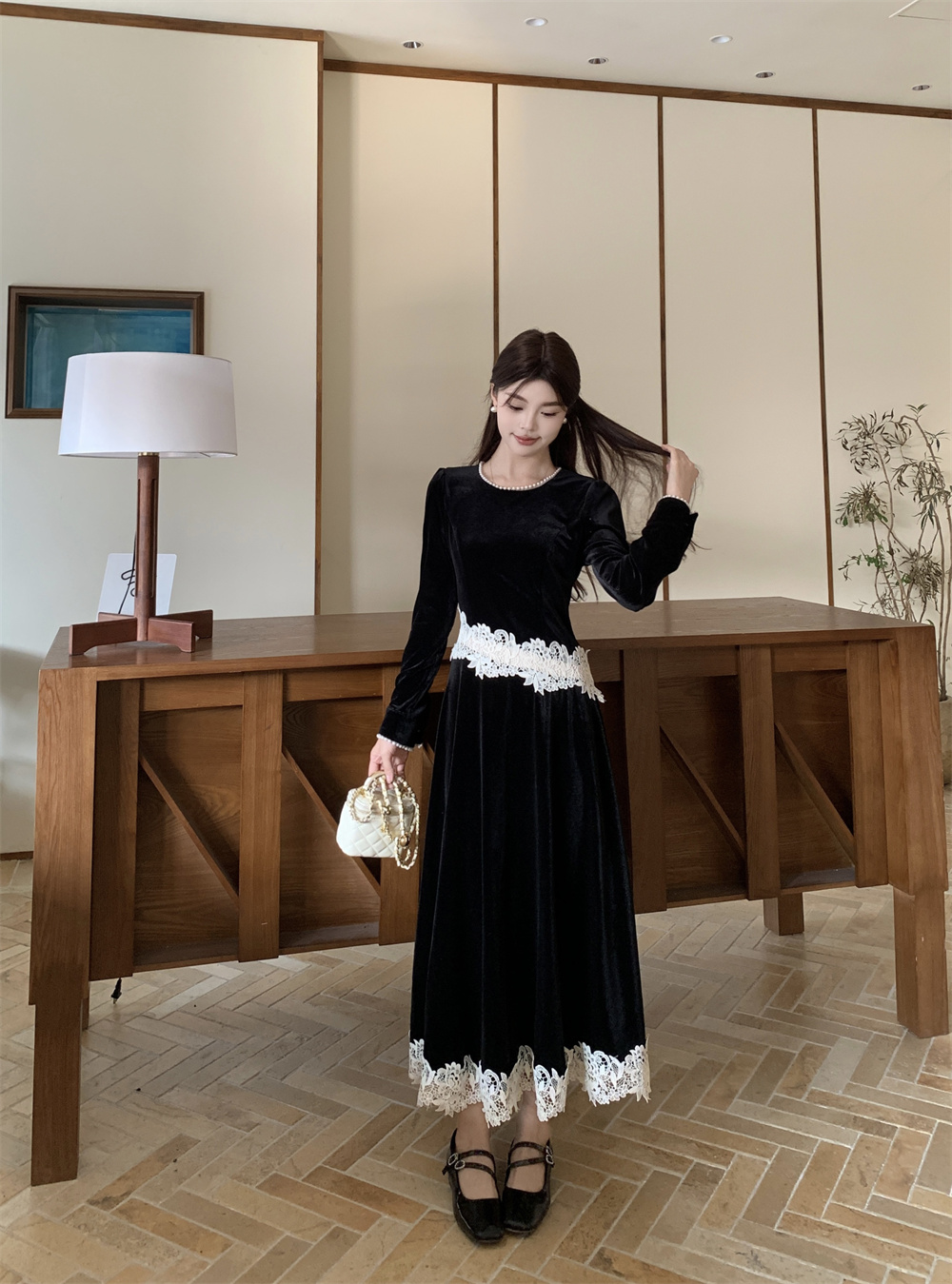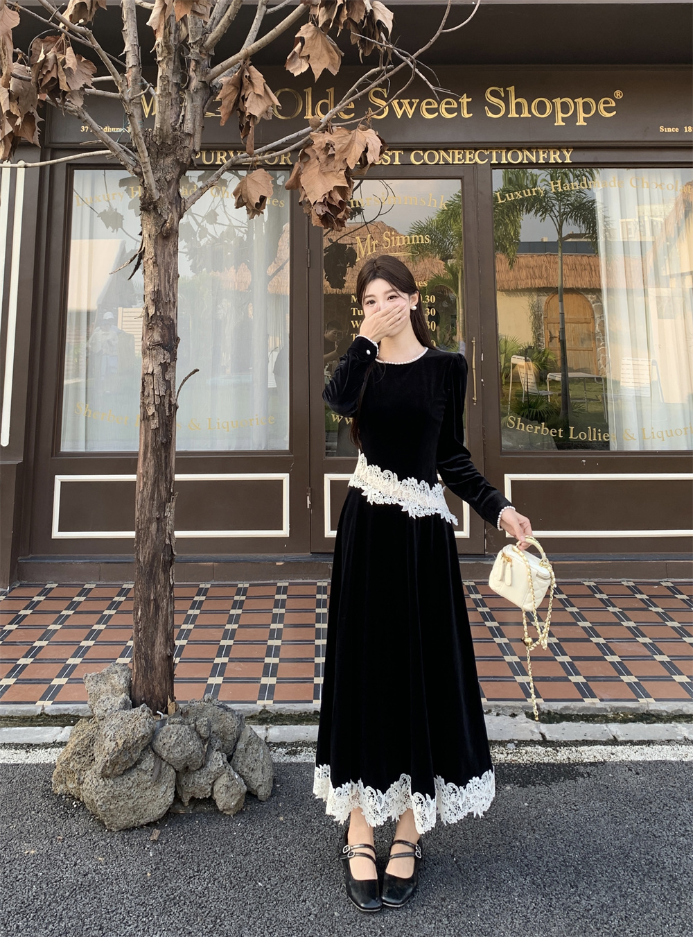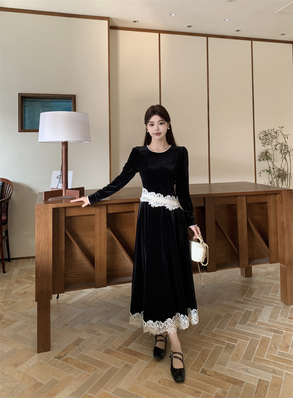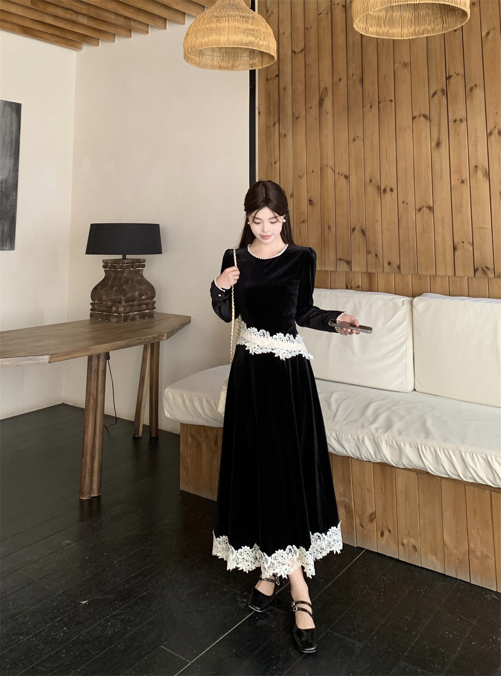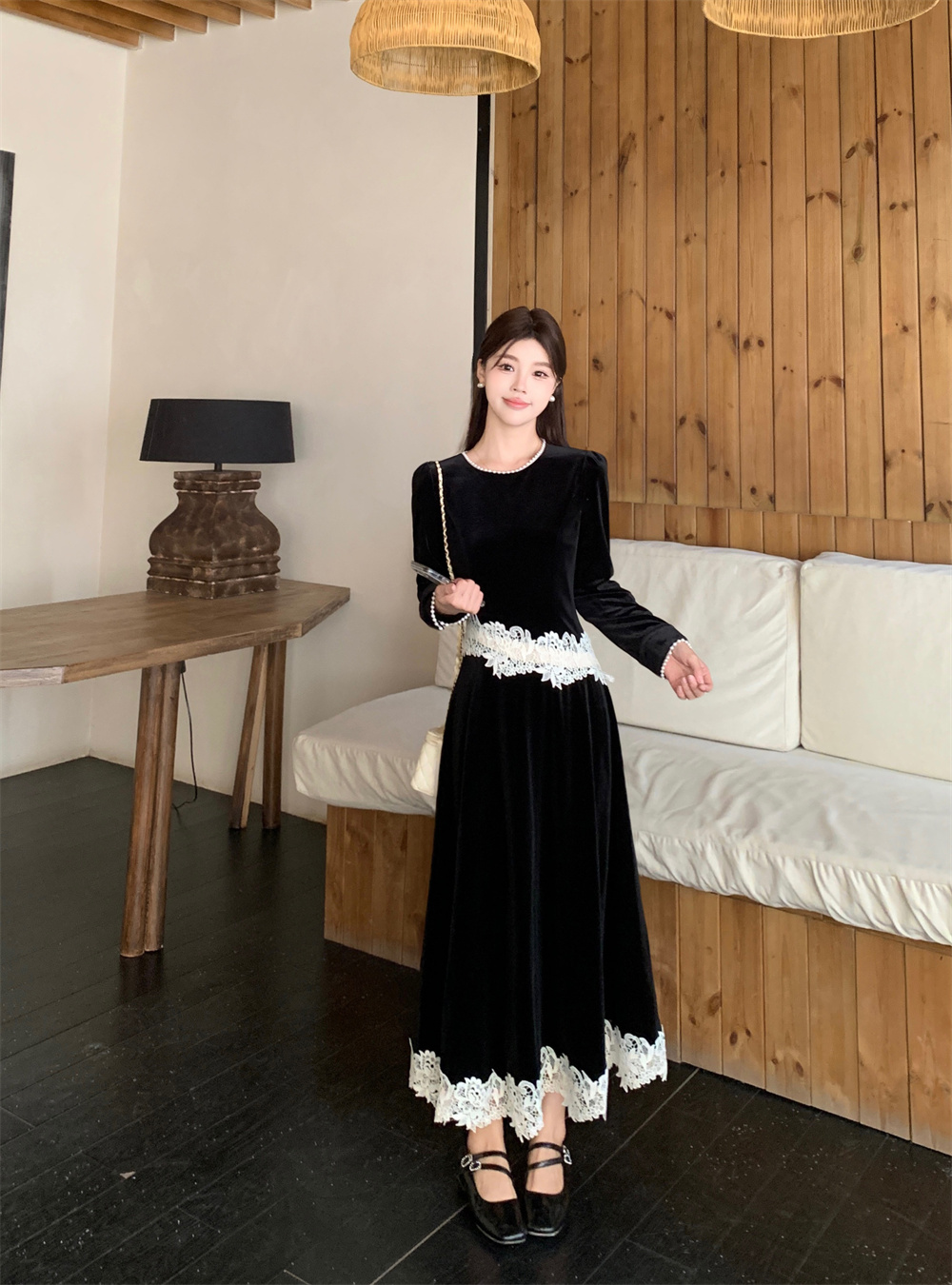 MY14653# 大码法式精致风假两件连衣裙秋季撞色黑色丝绒裙女裝貨源服裝批發