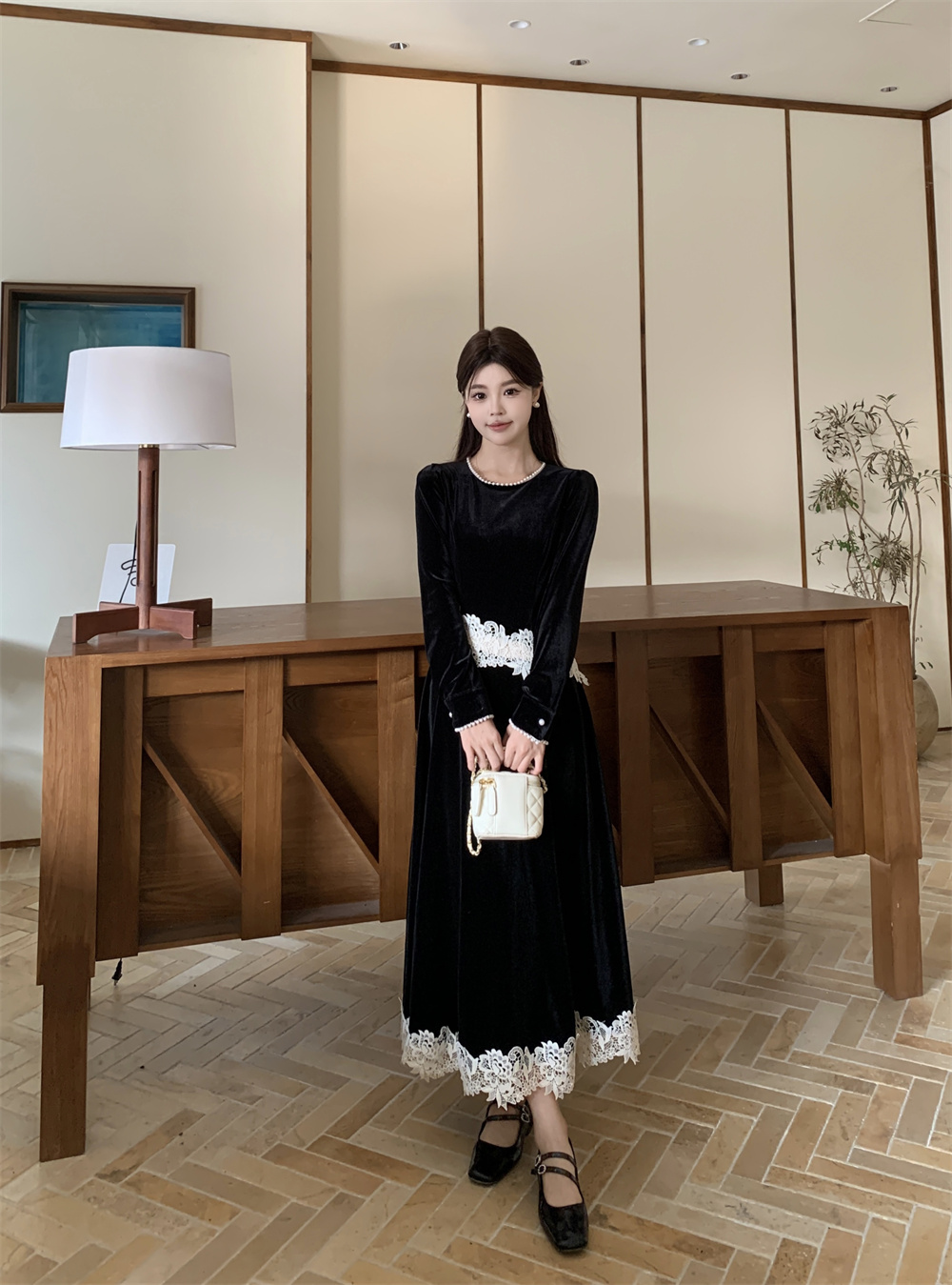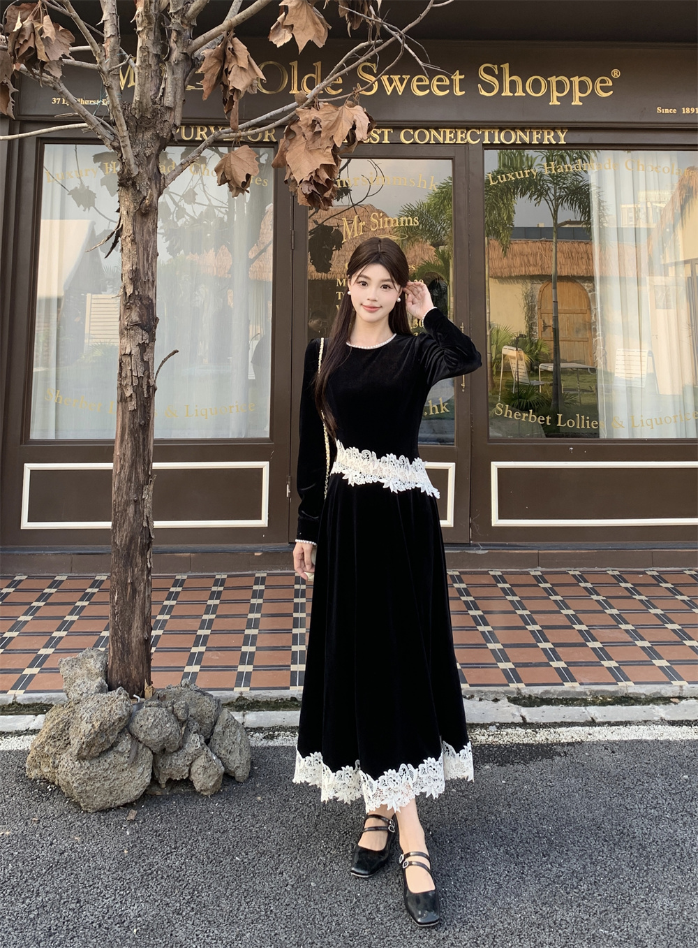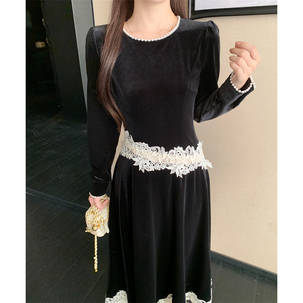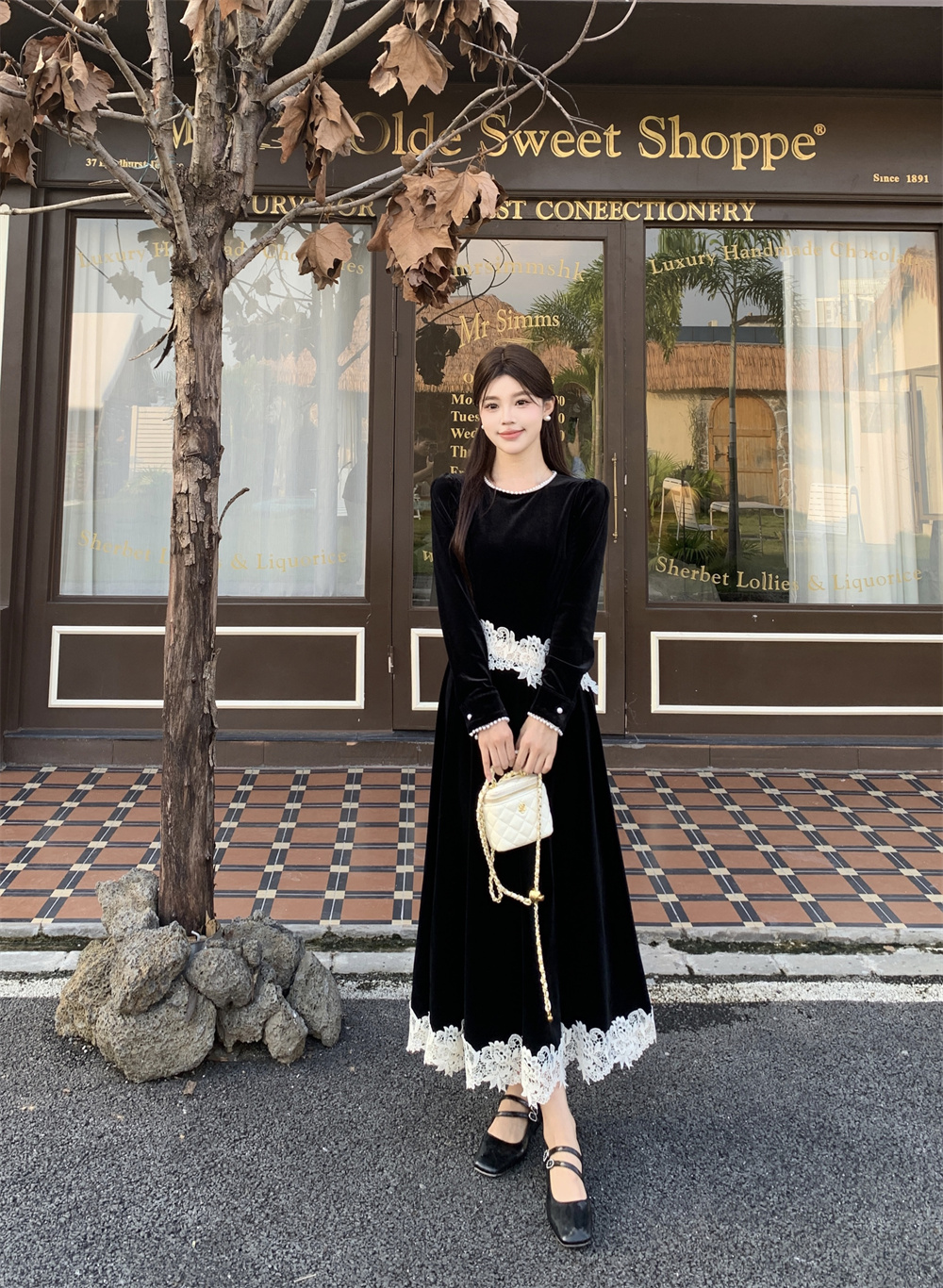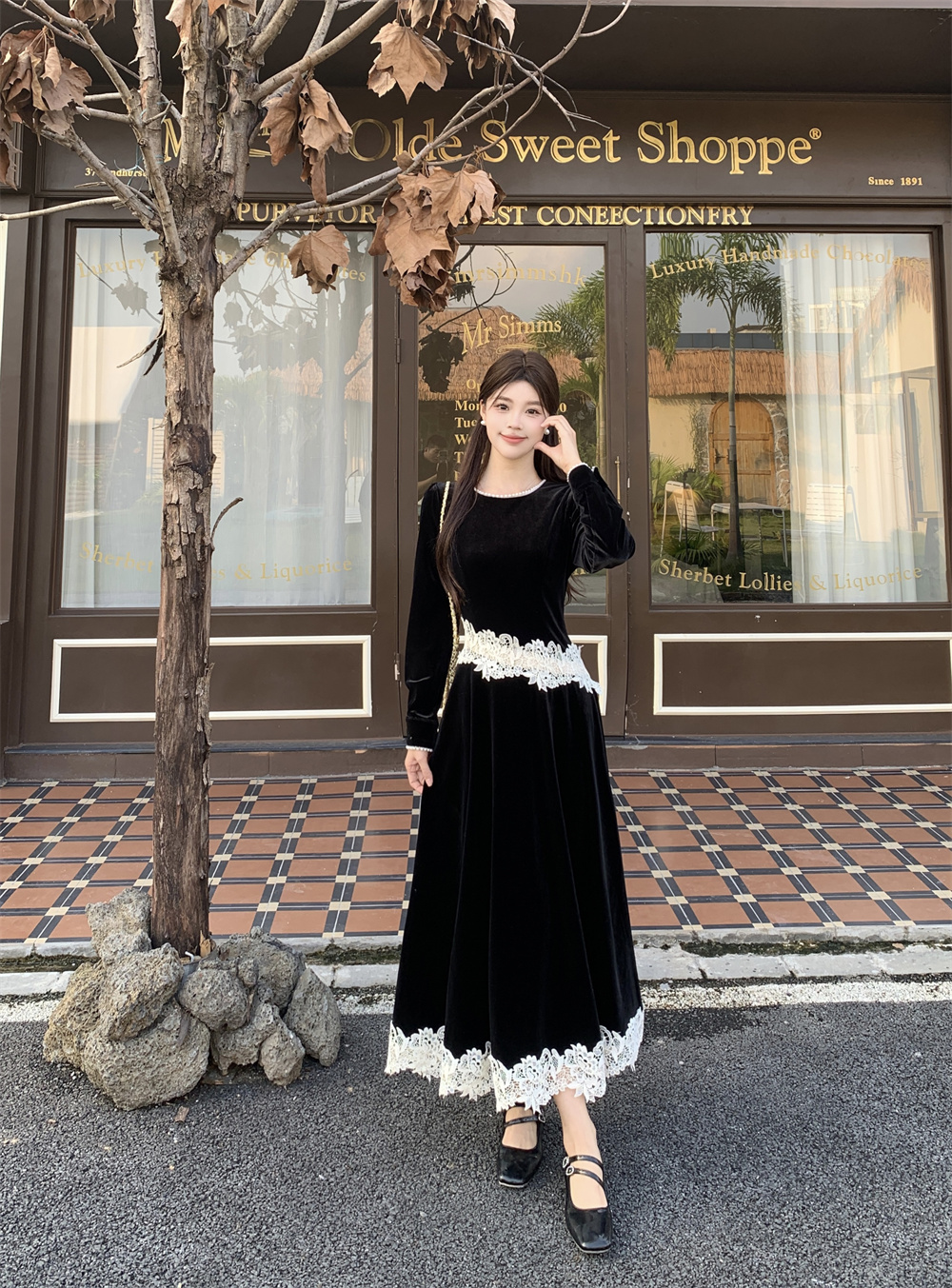 MY14653# 大码法式精致风假两件连衣裙秋季撞色黑色丝绒裙女裝貨源服裝批發