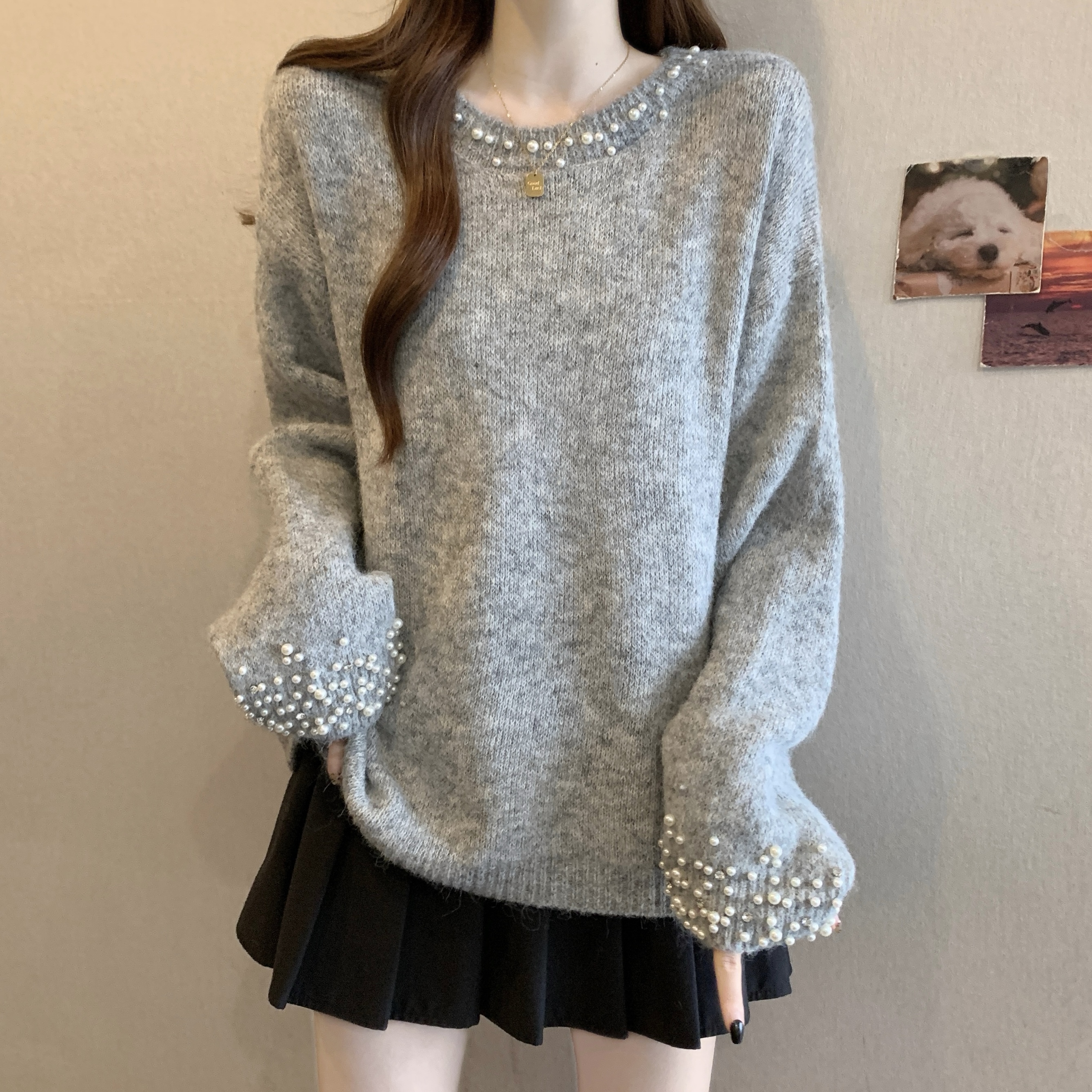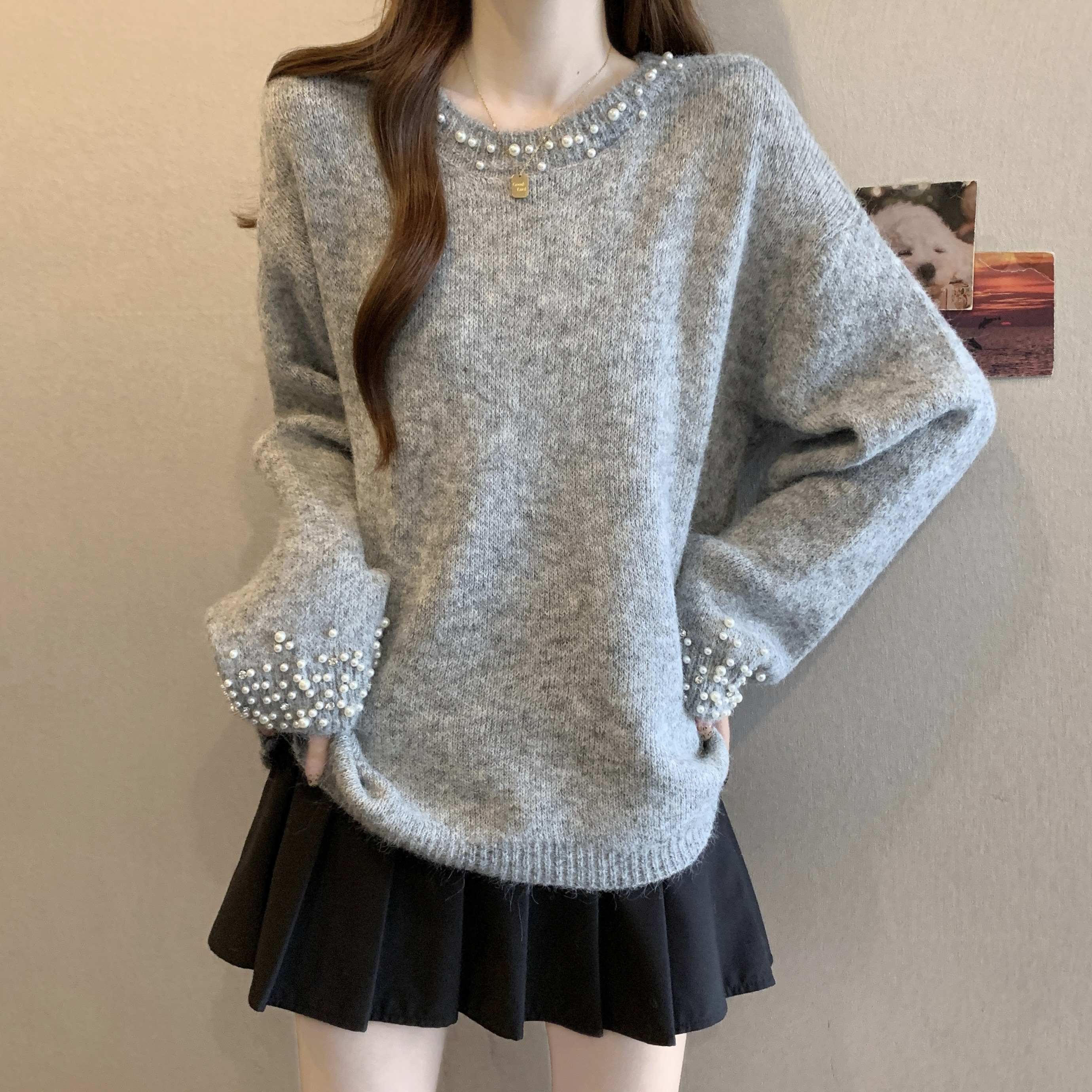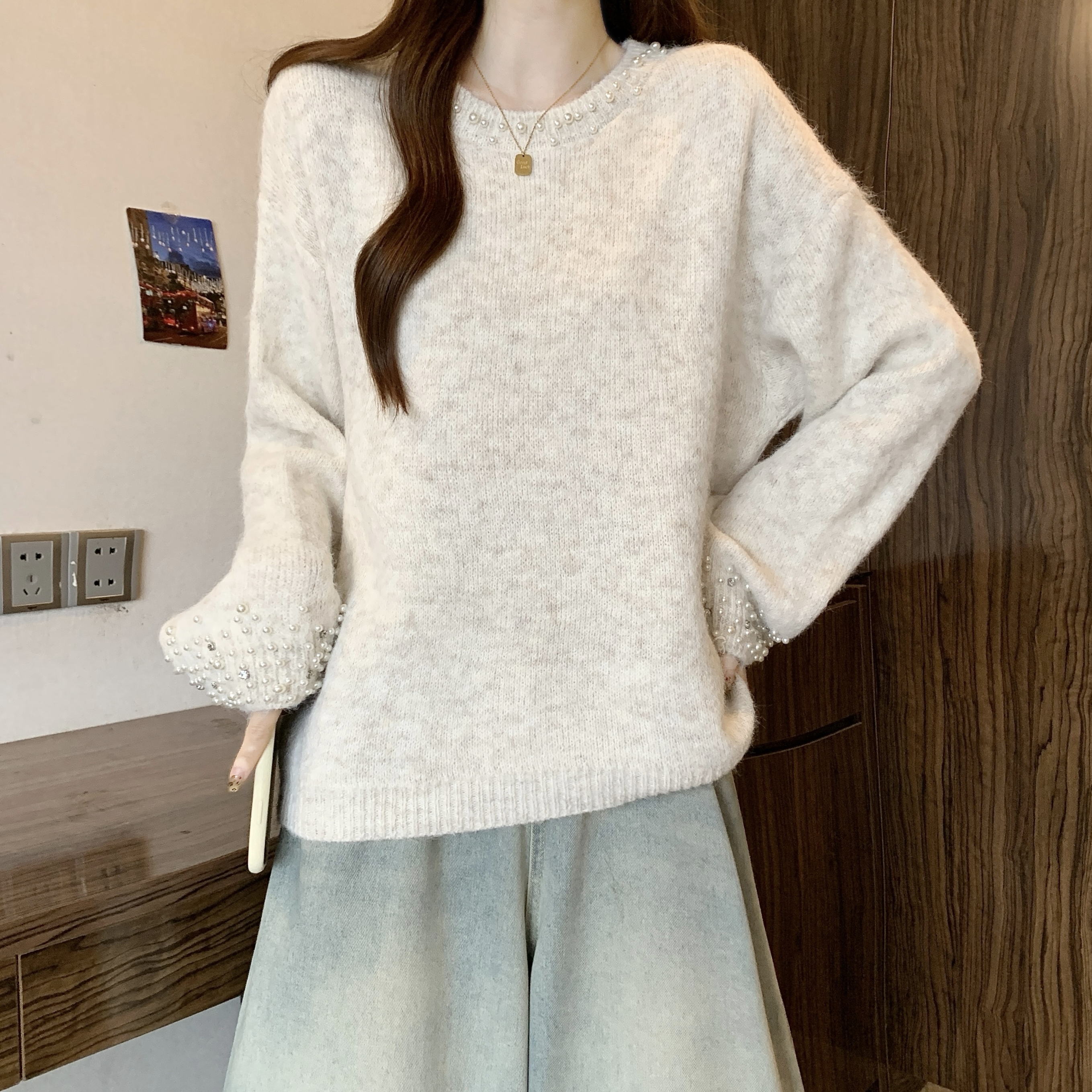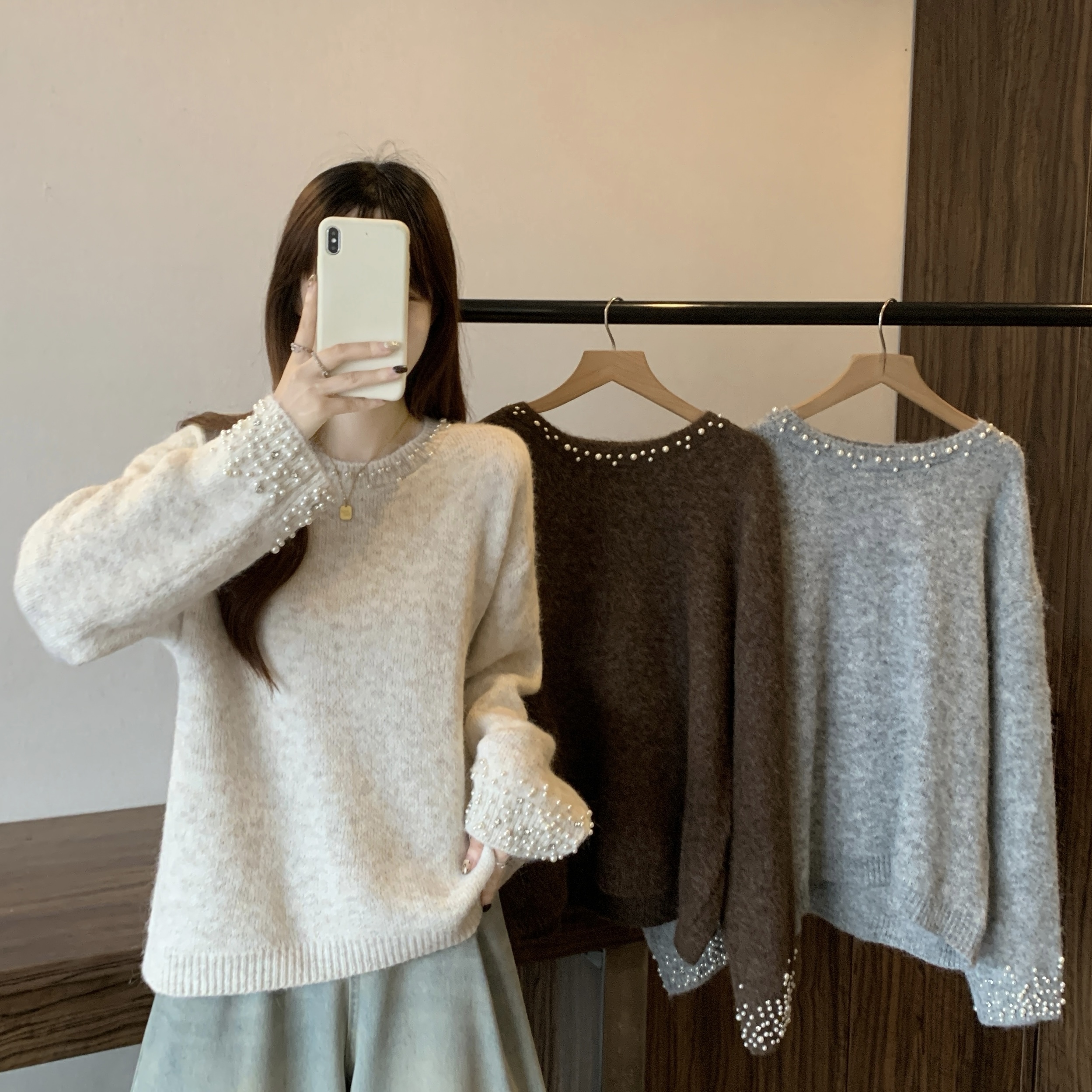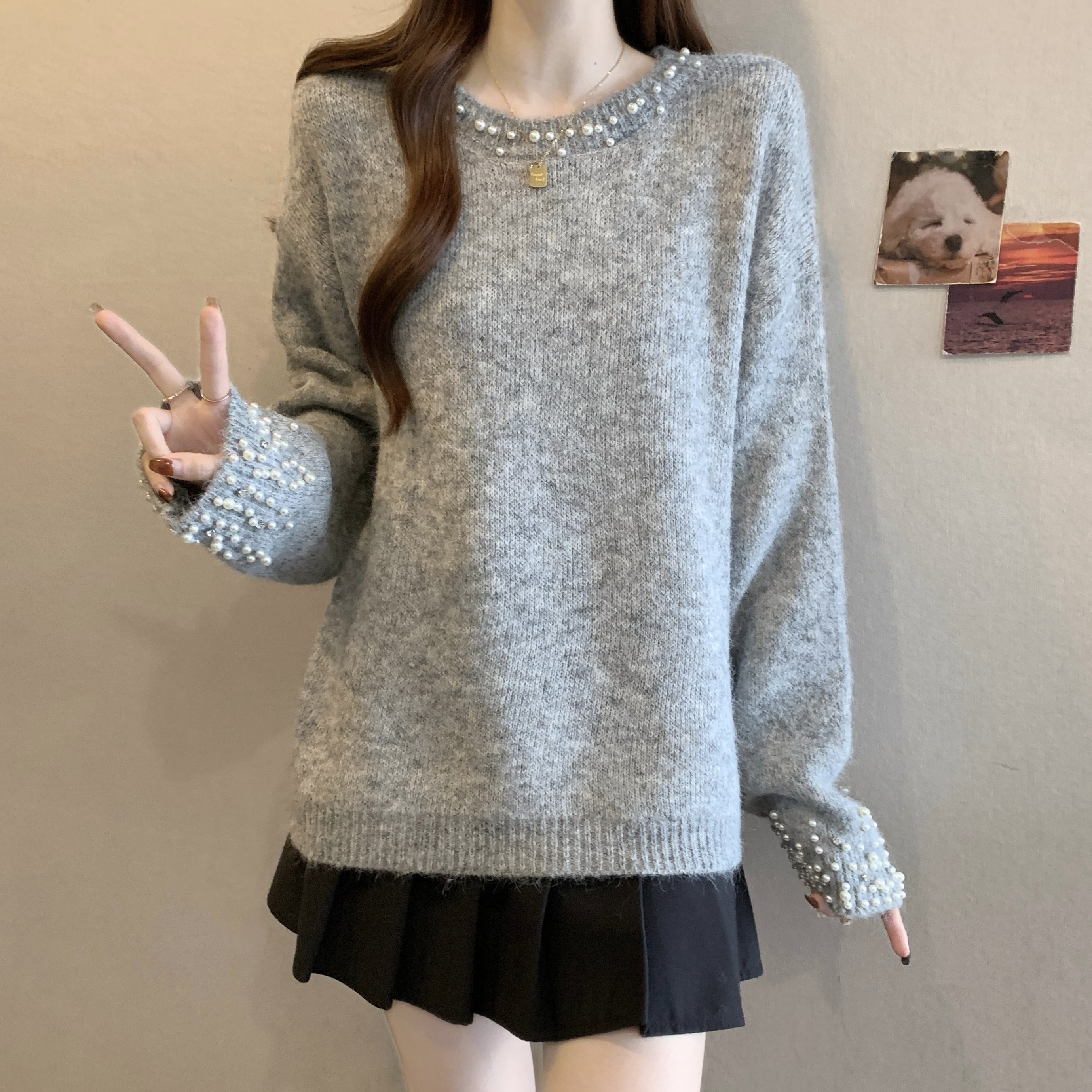MY14659# 大码女装长袖重工钉珠圆领套头毛衣胖MM宽松上衣女女裝貨源服裝批發