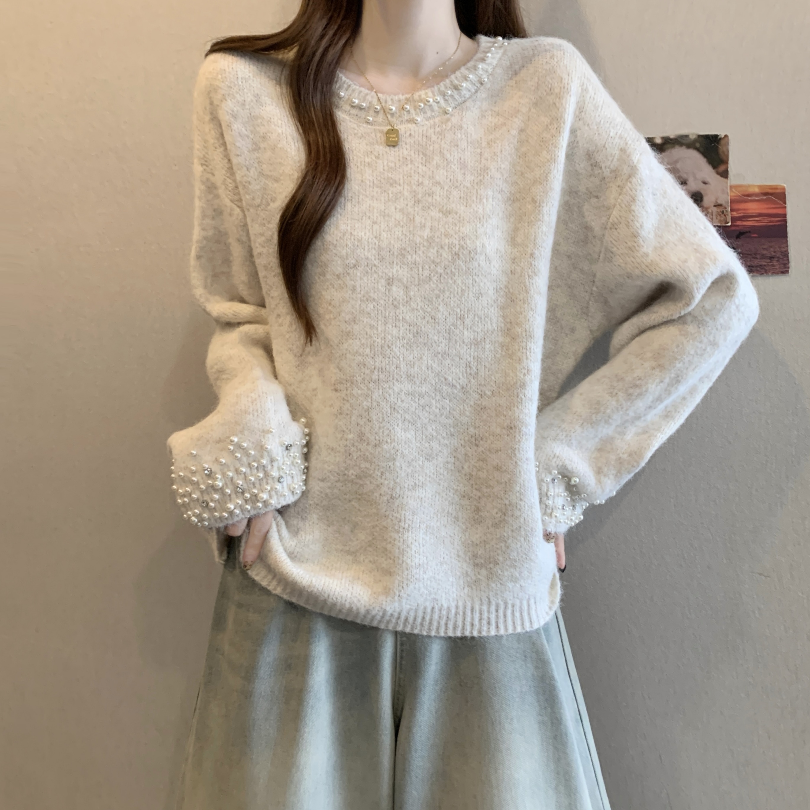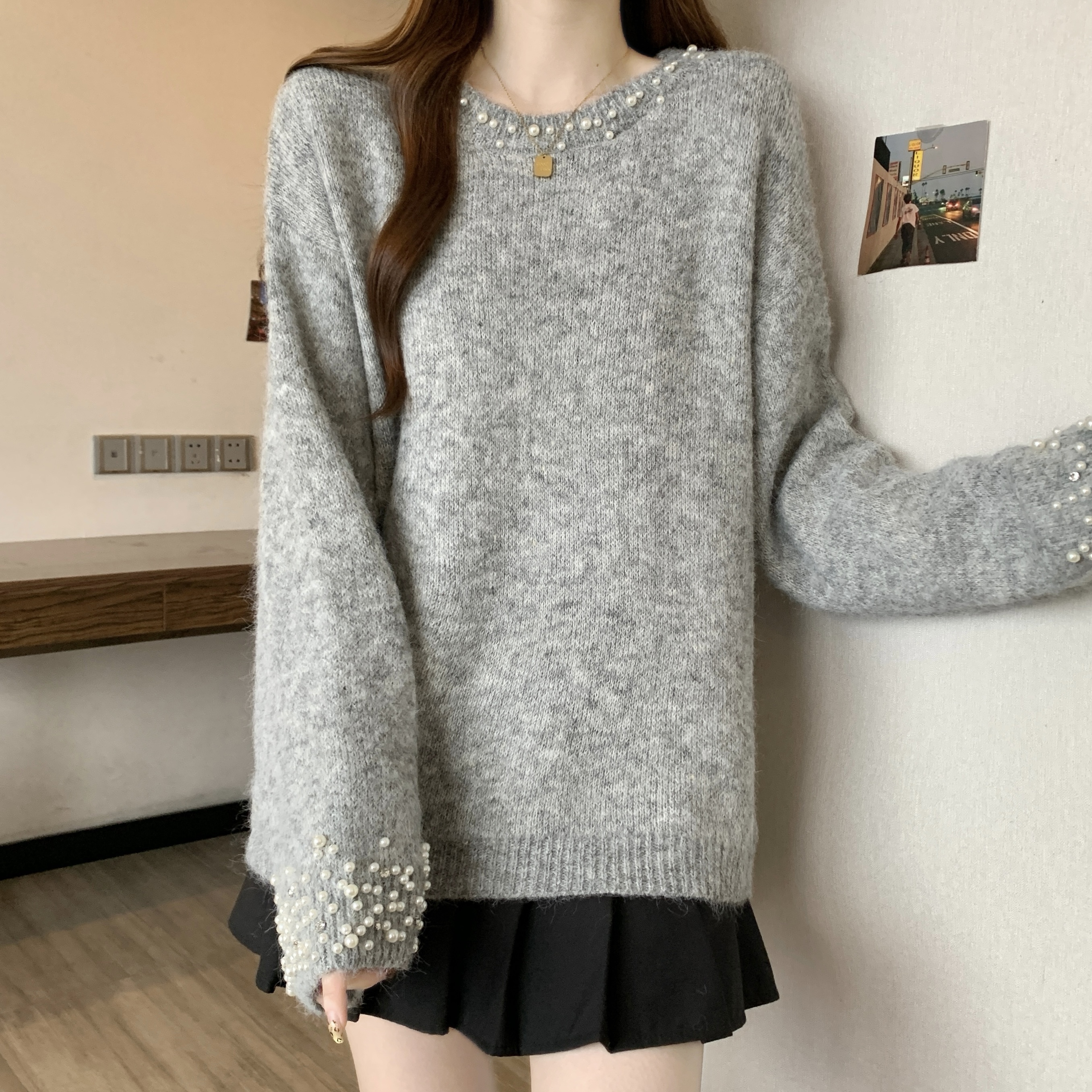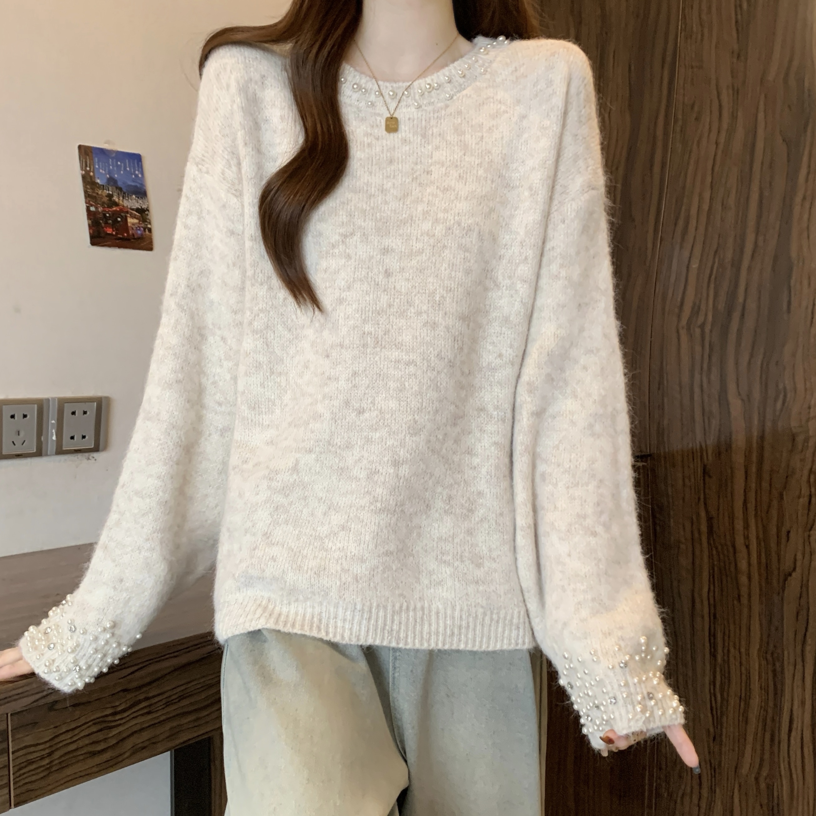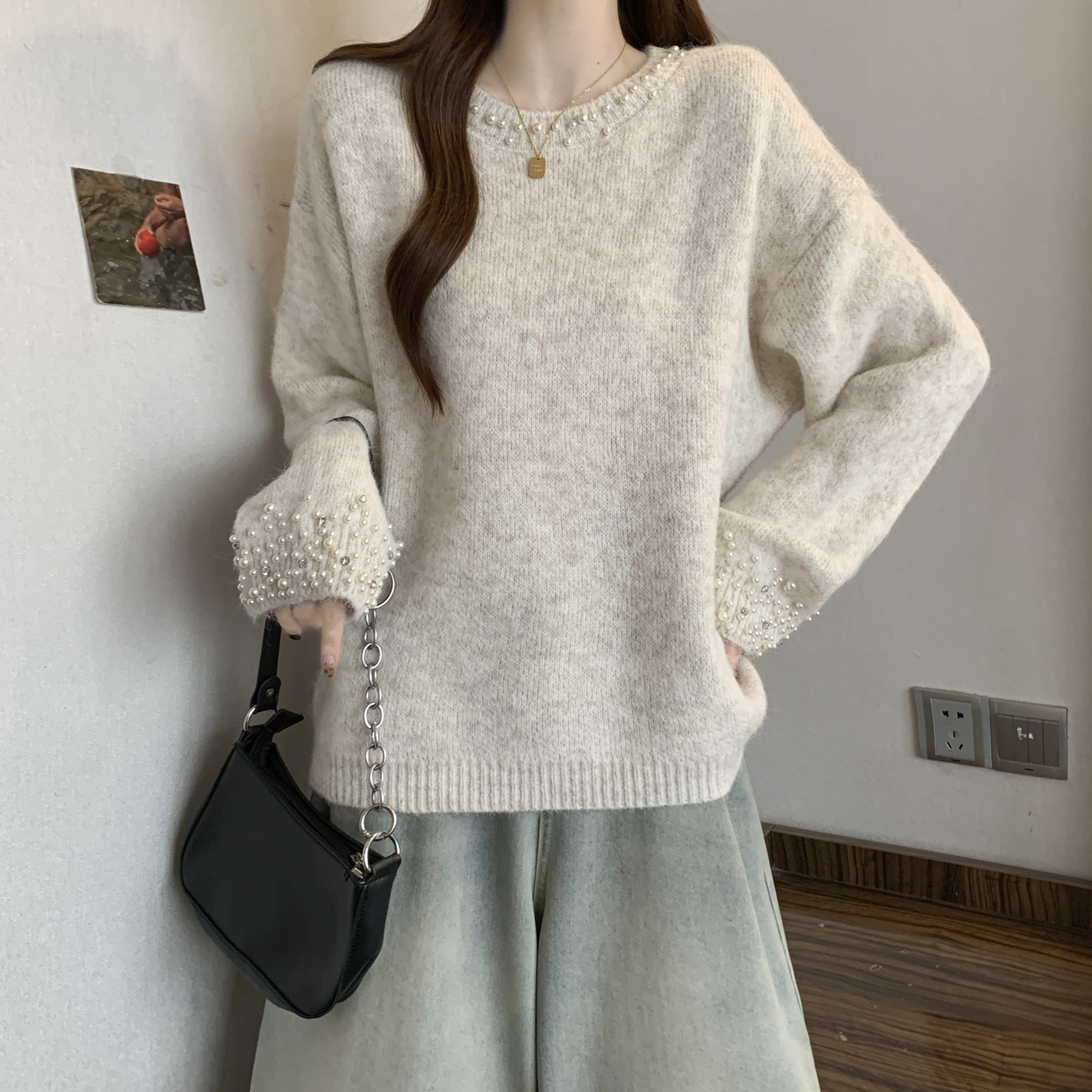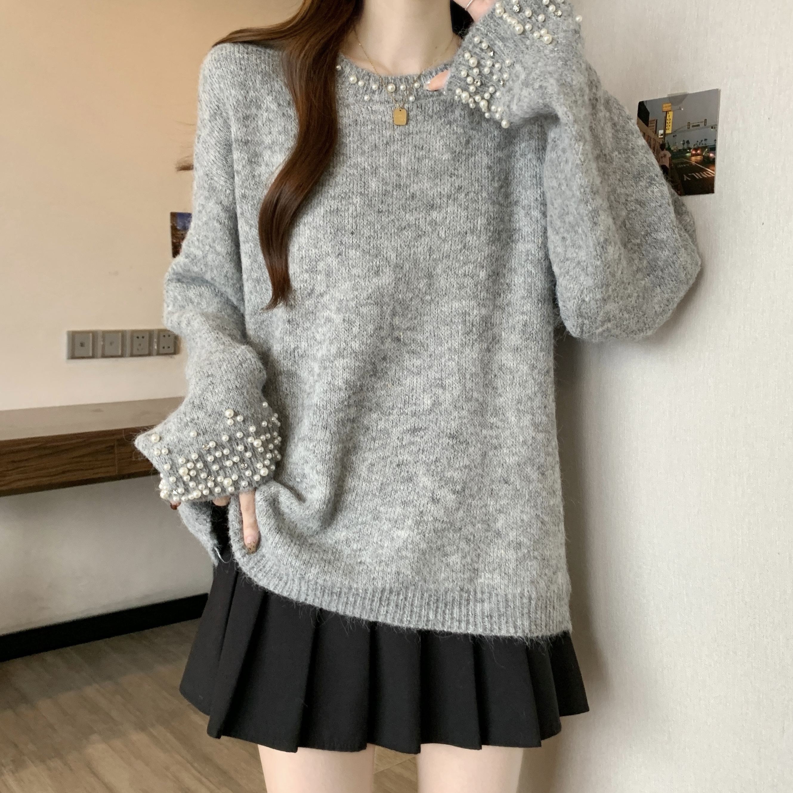MY14659# 大码女装长袖重工钉珠圆领套头毛衣胖MM宽松上衣女女裝貨源服裝批發