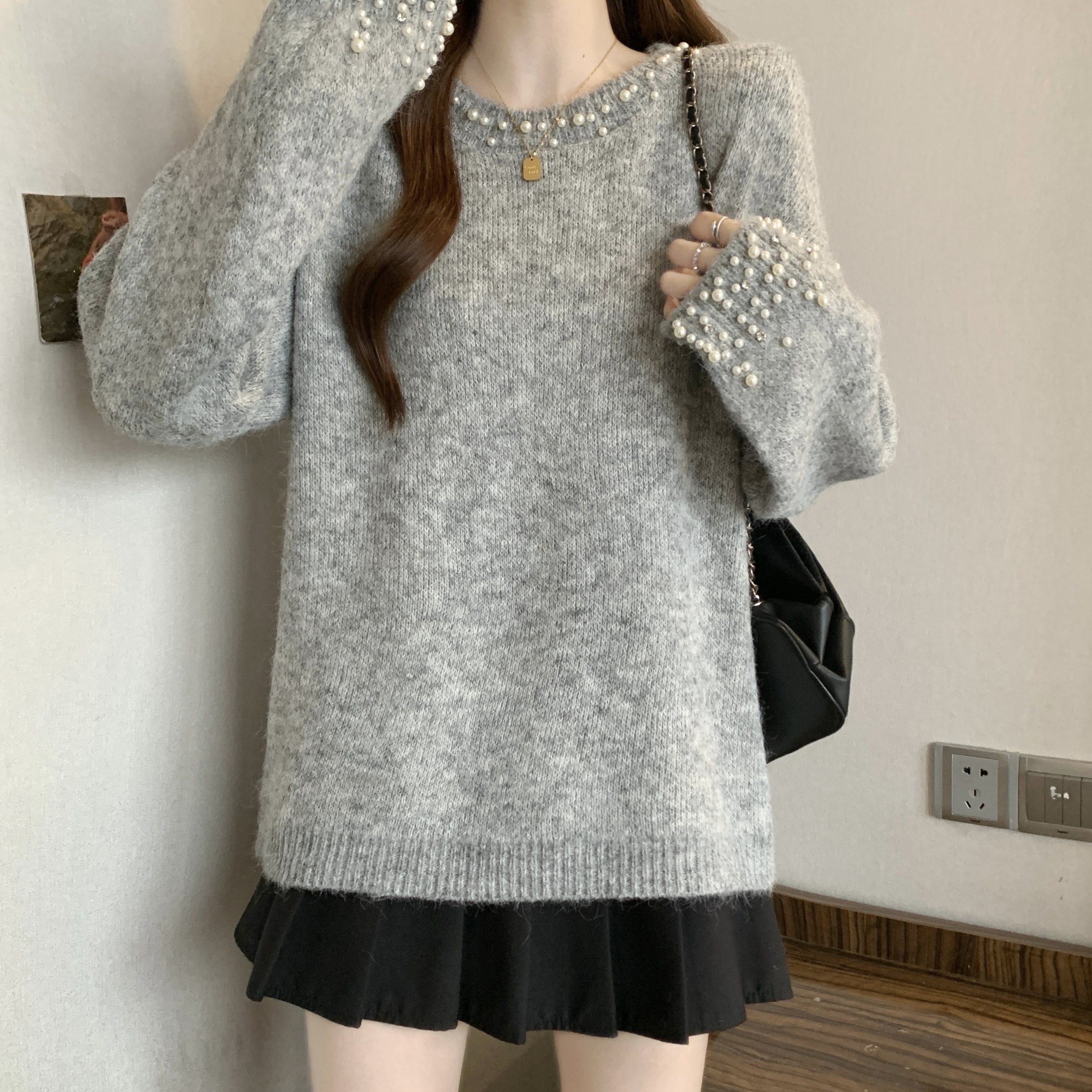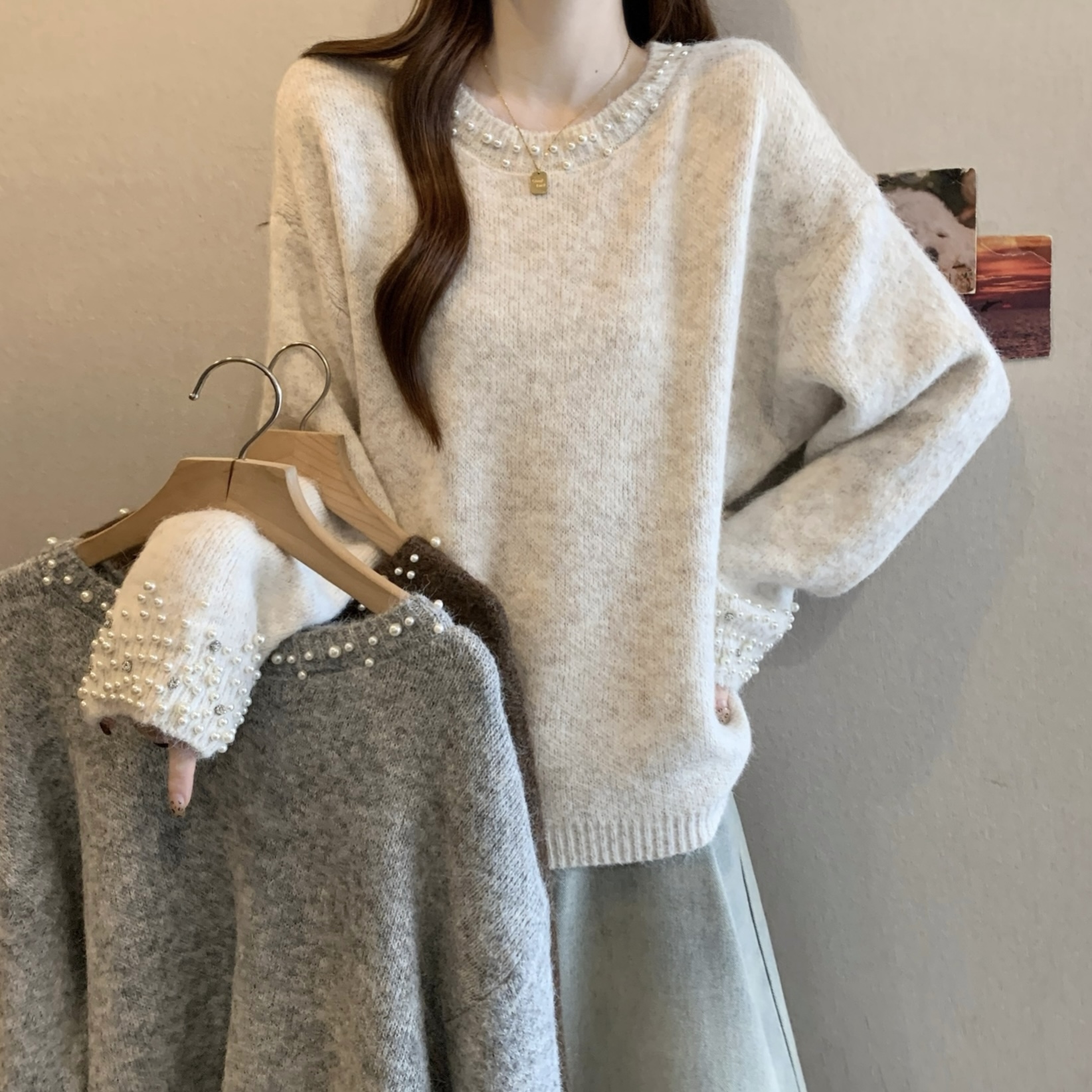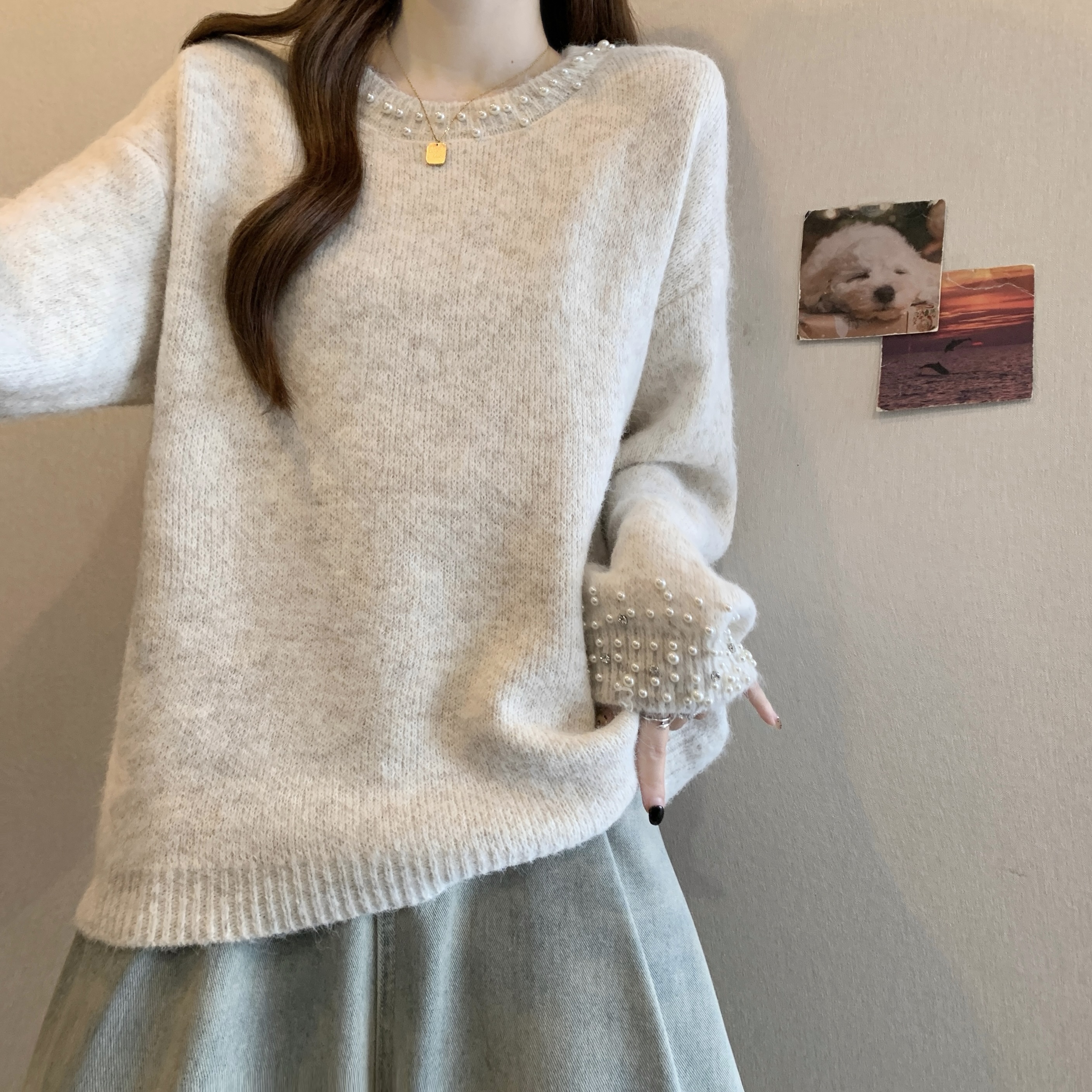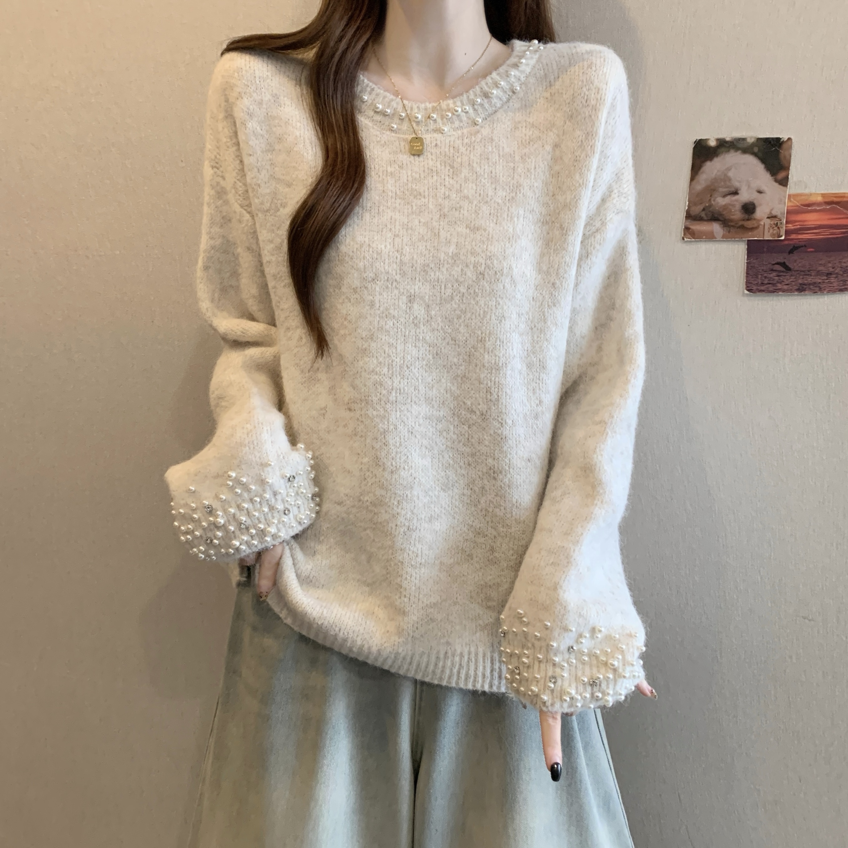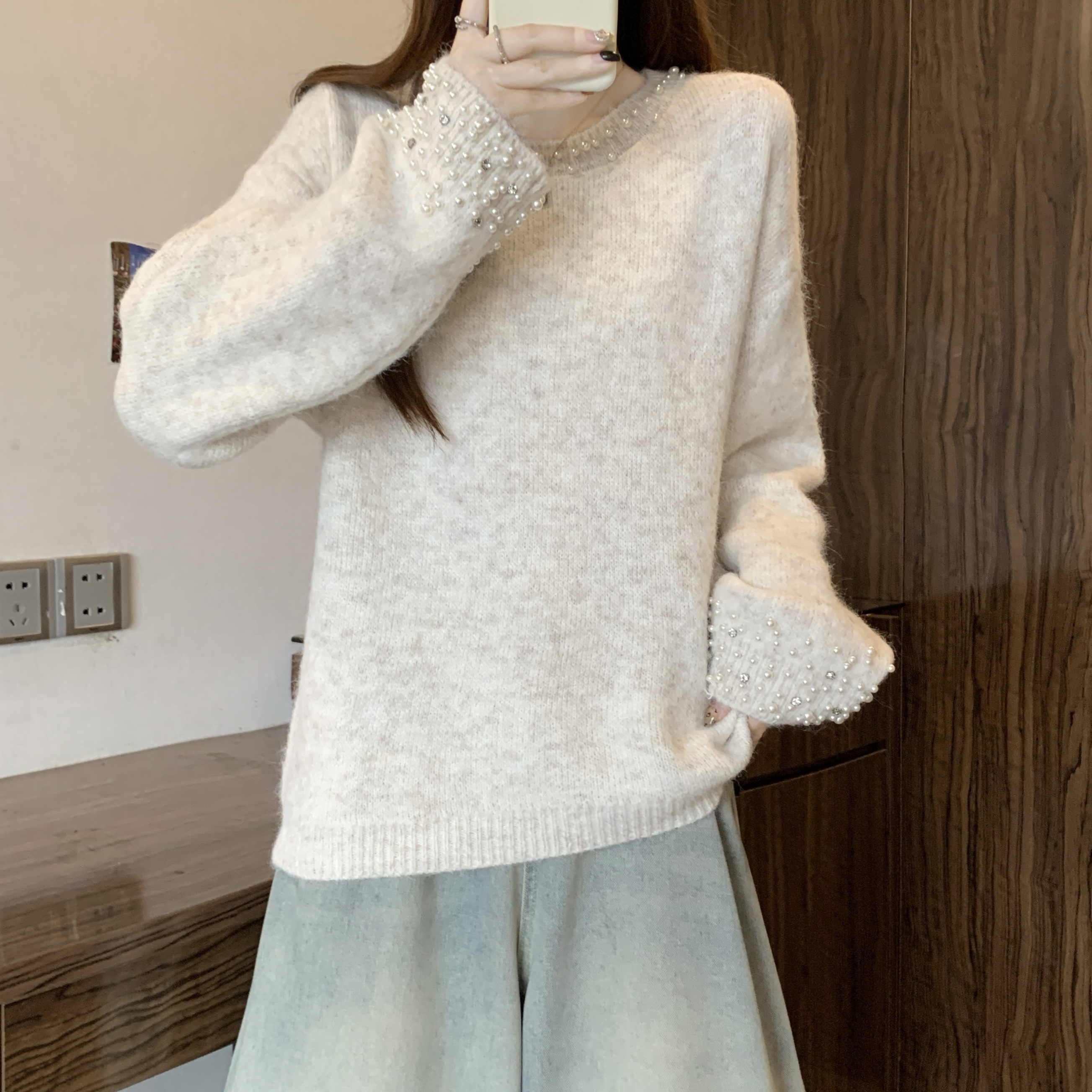 MY14659# 大码女装长袖重工钉珠圆领套头毛衣胖MM宽松上衣女女裝貨源服裝批發