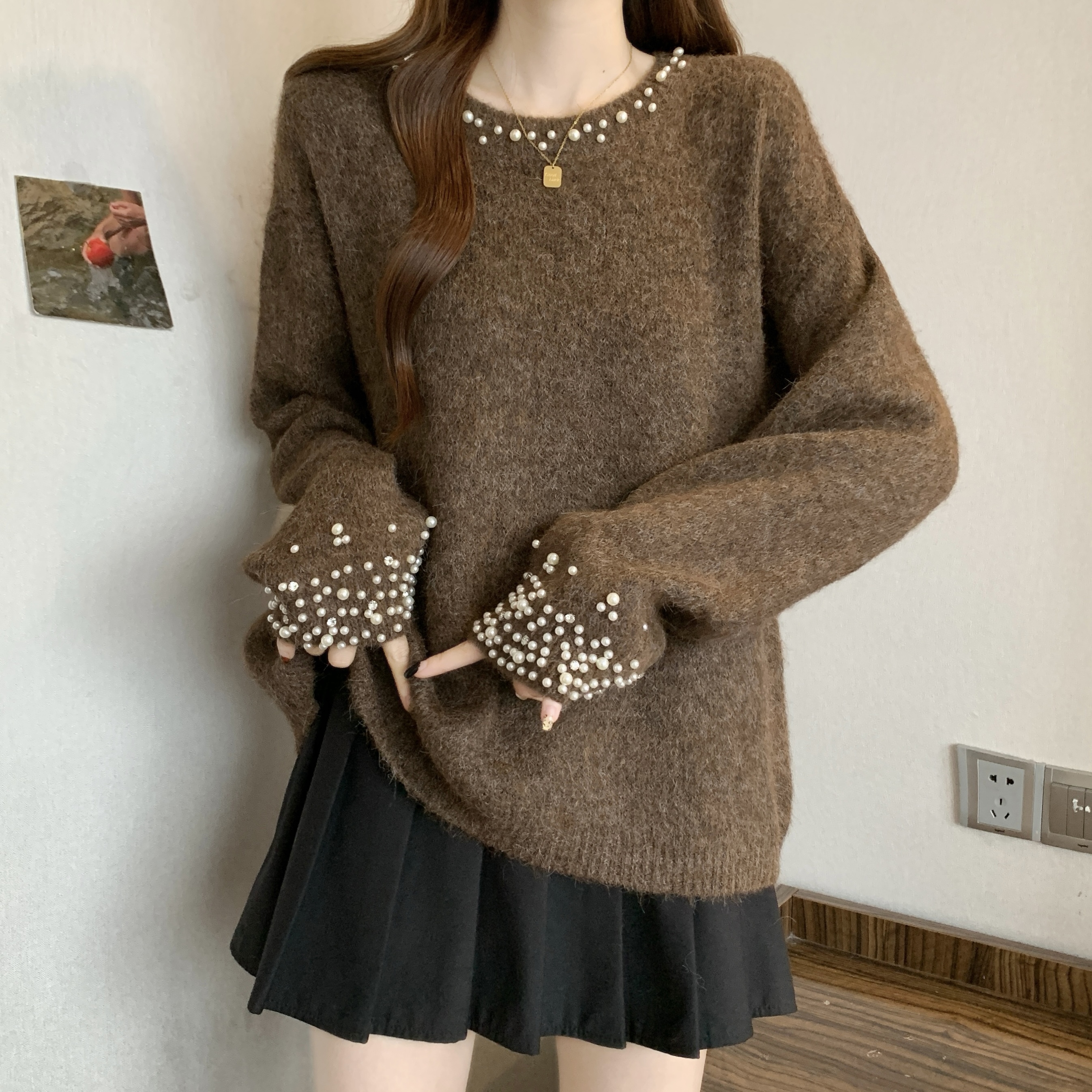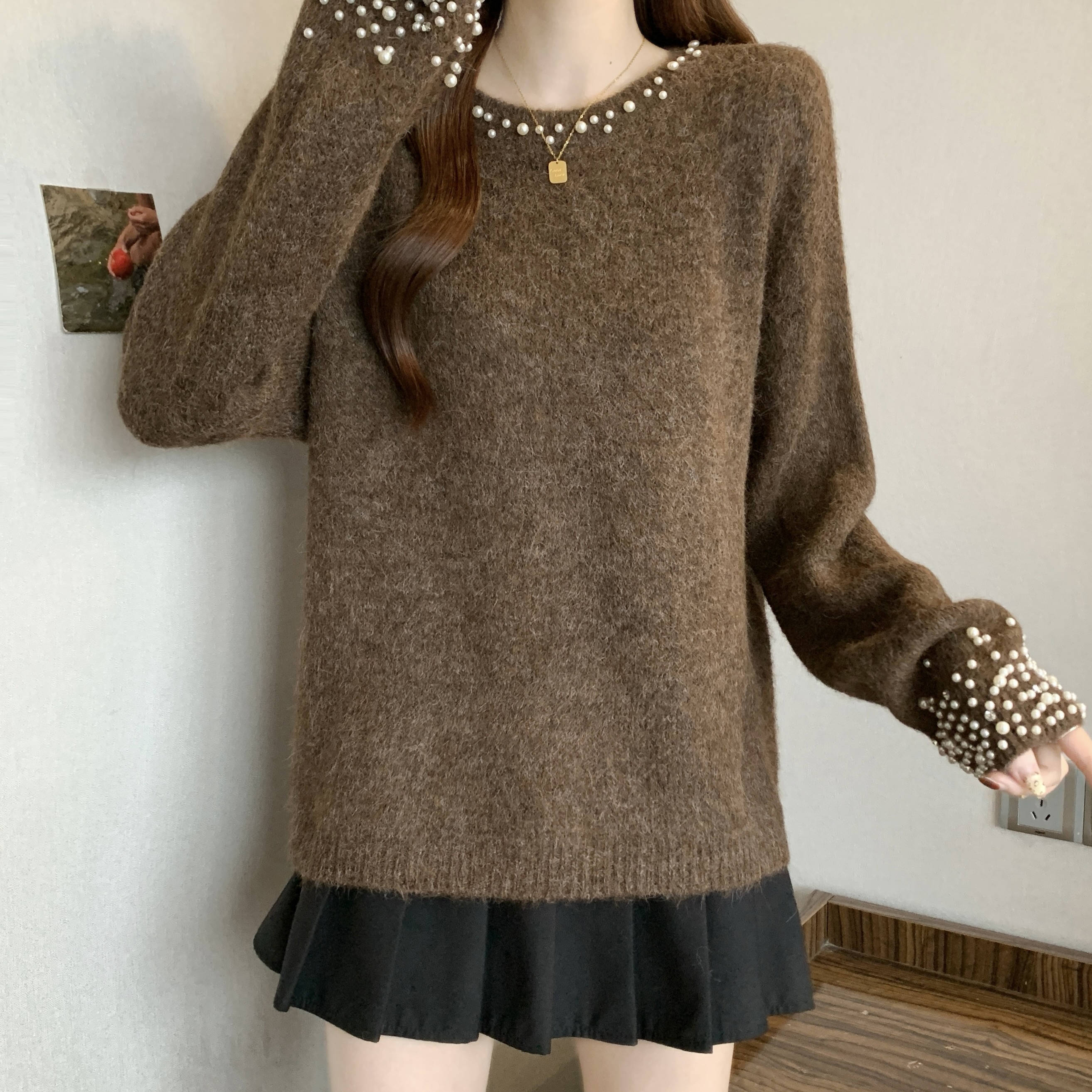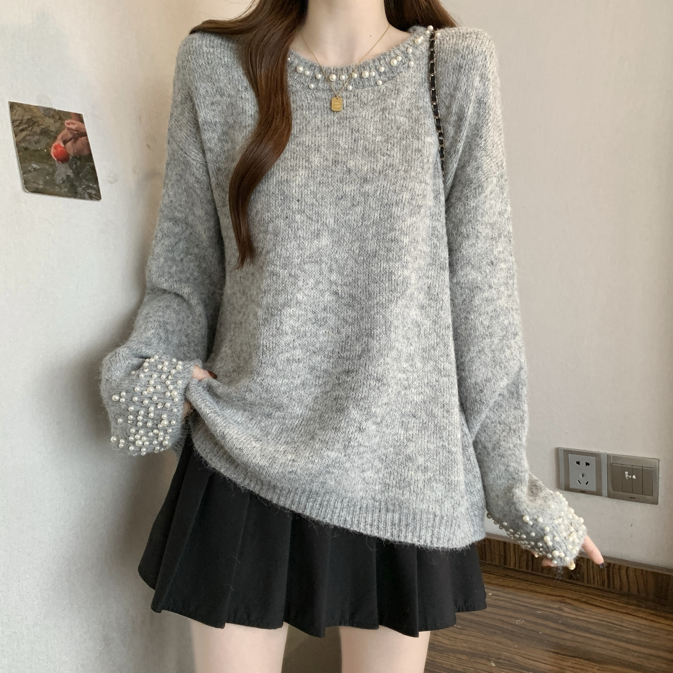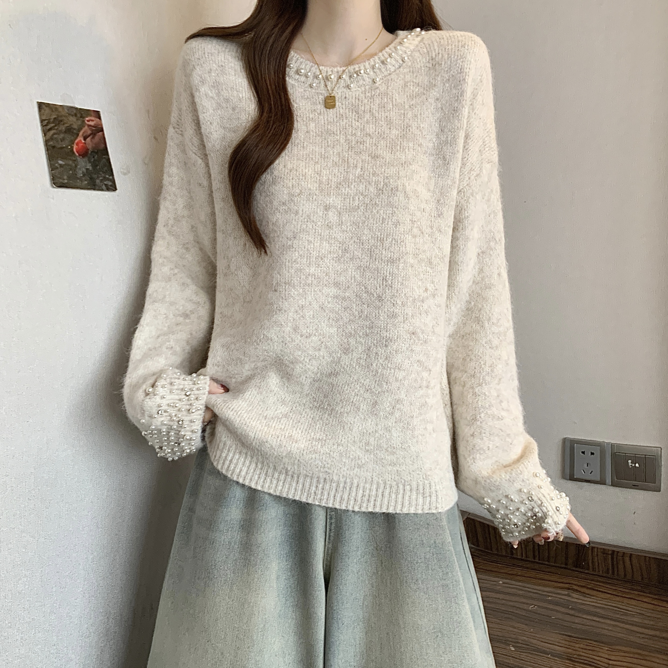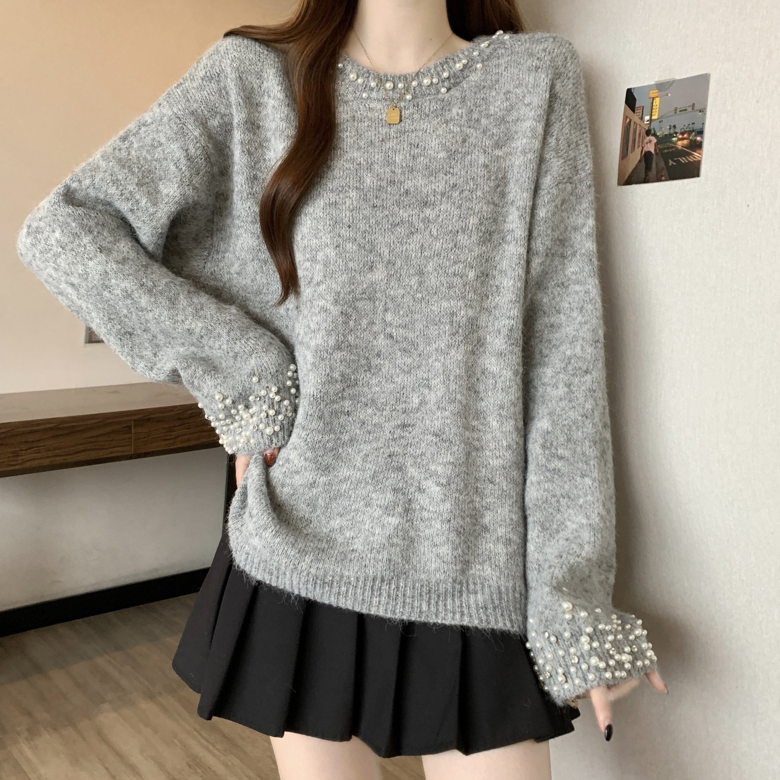 MY14659# 大码女装长袖重工钉珠圆领套头毛衣胖MM宽松上衣女女裝貨源服裝批發
