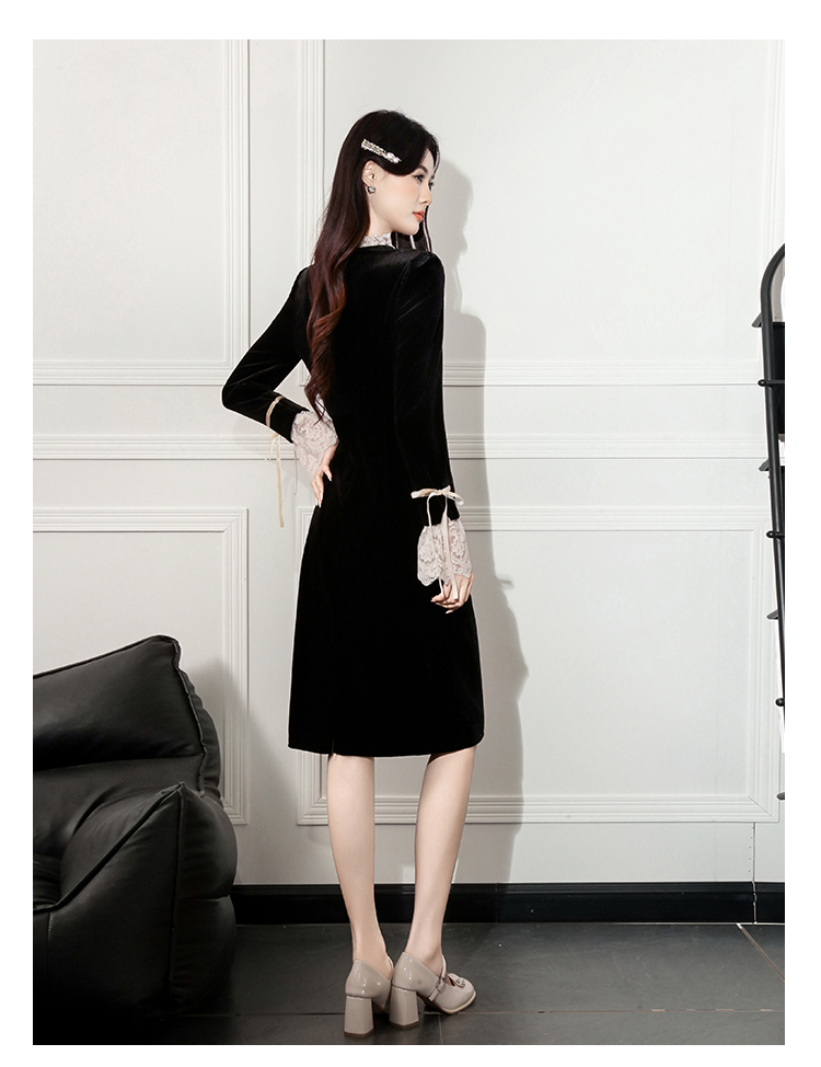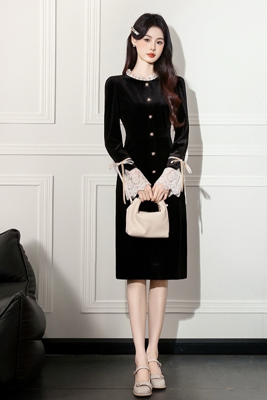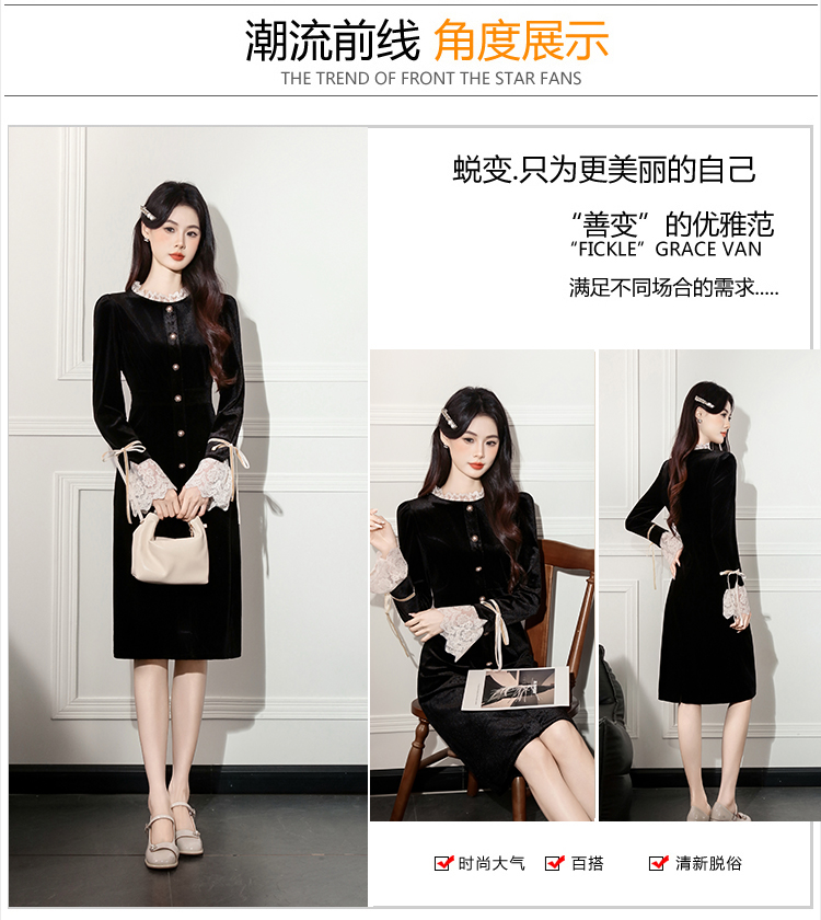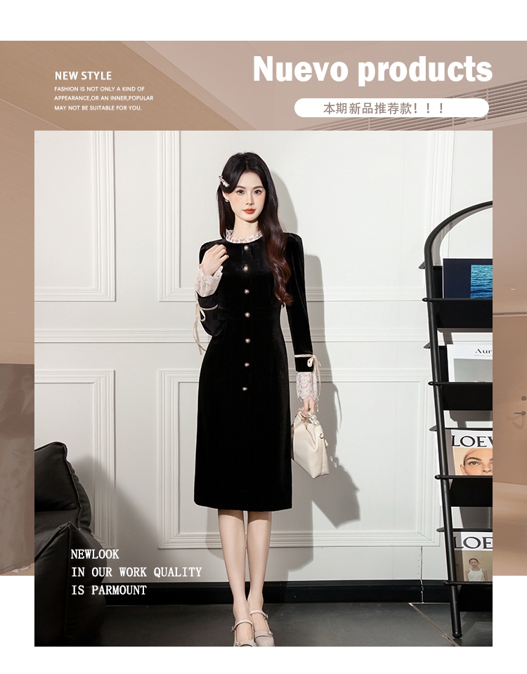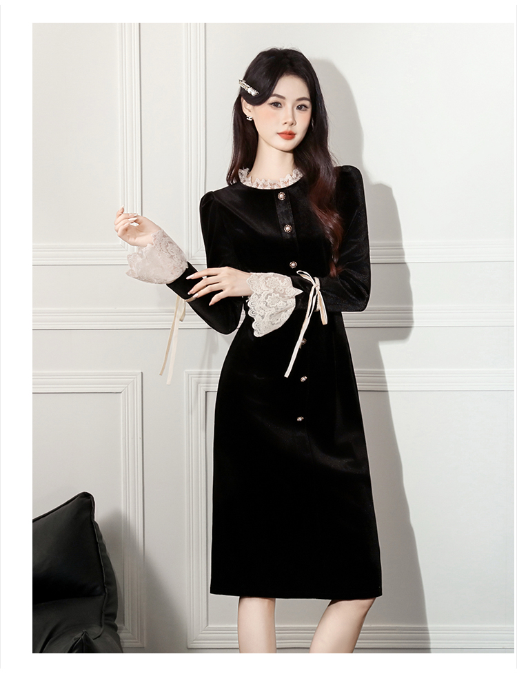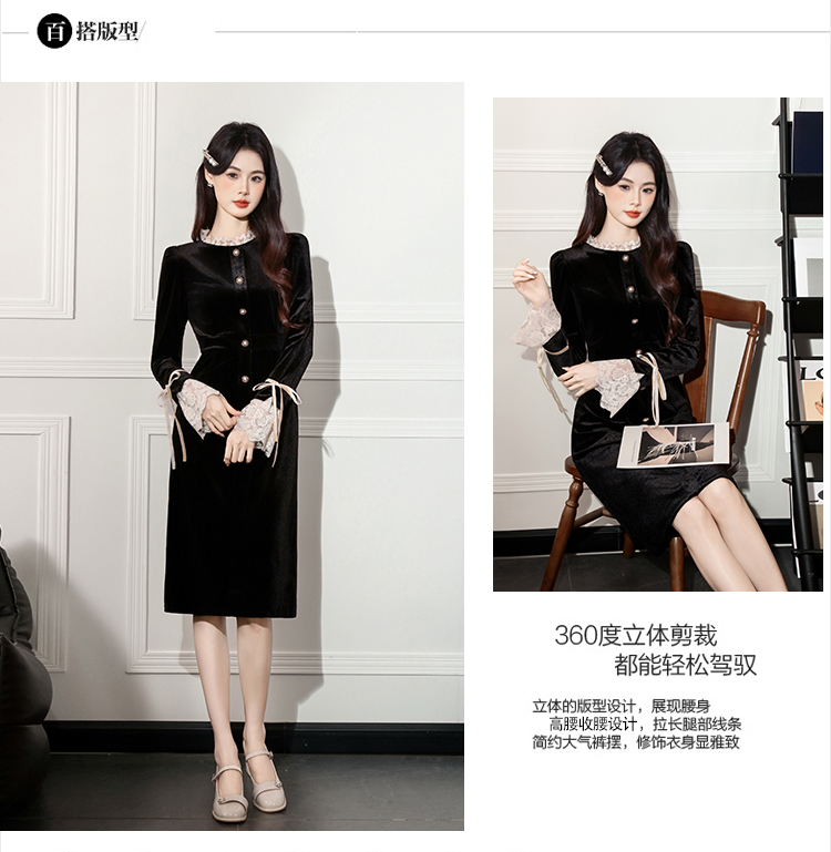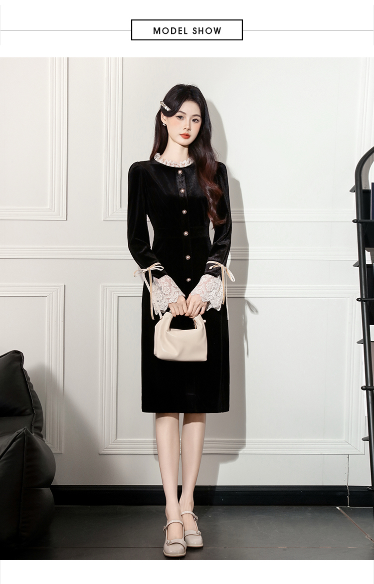 MY14670# 新款法式优雅蕾丝边名媛气质修身显瘦中长款丝绒连衣裙女裝貨源服裝批發