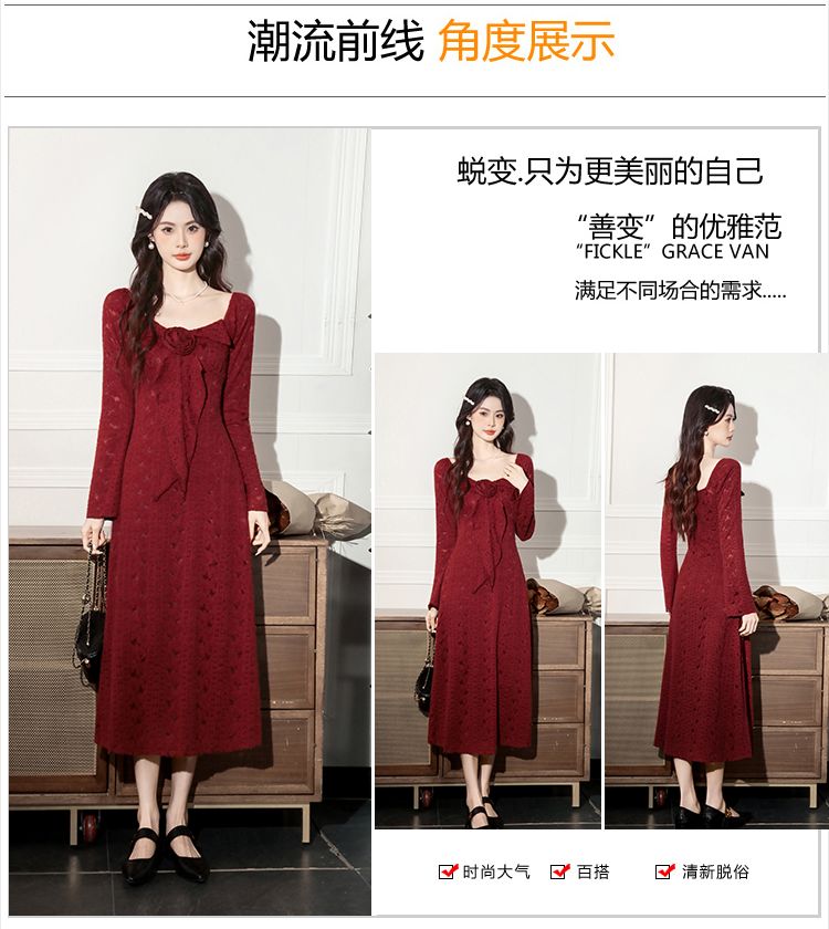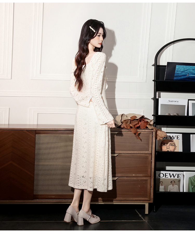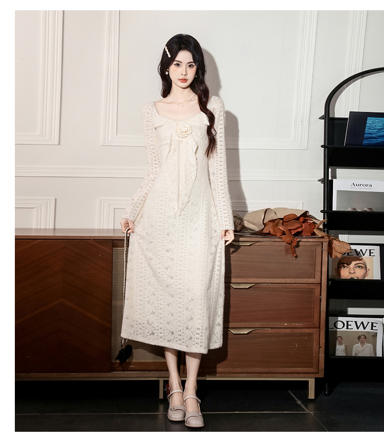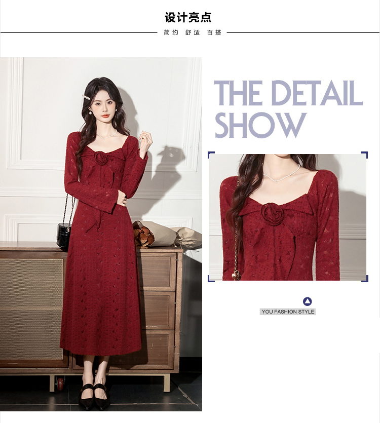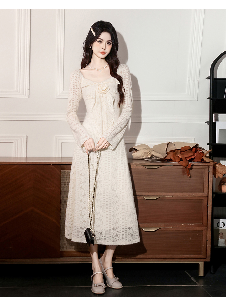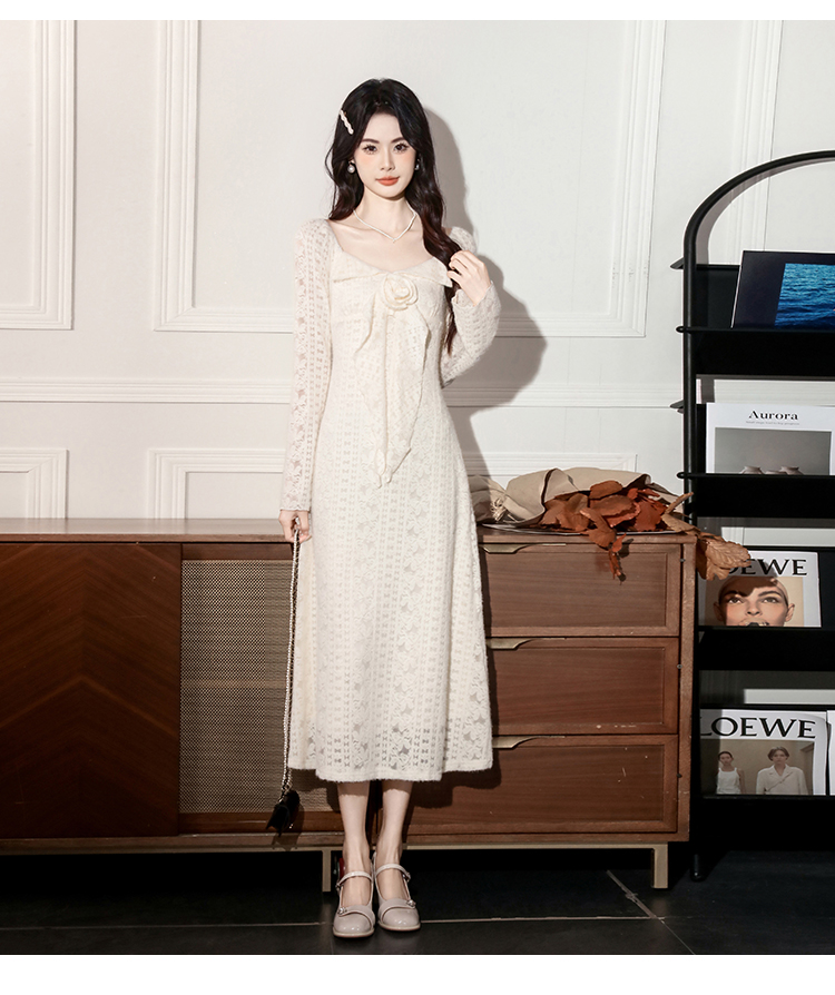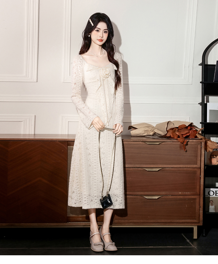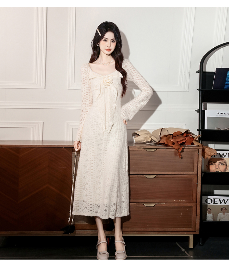 MY14673# 新款温柔优雅花朵磨毛蕾丝修身显瘦长款连衣裙女裝貨源服裝批發