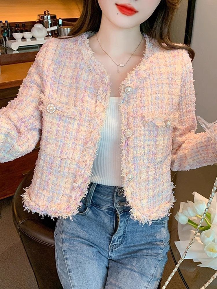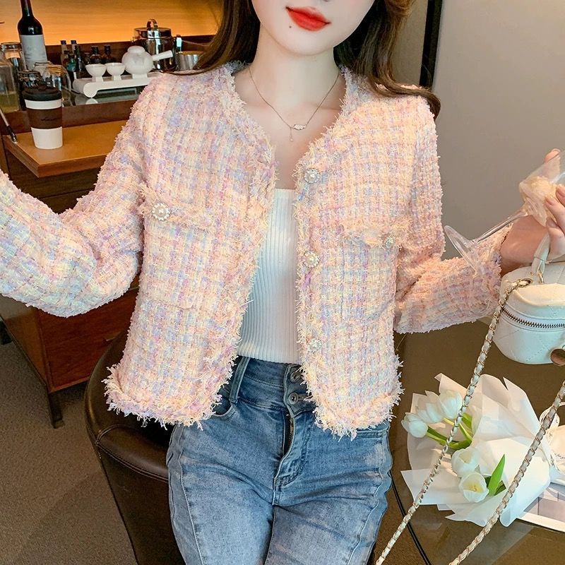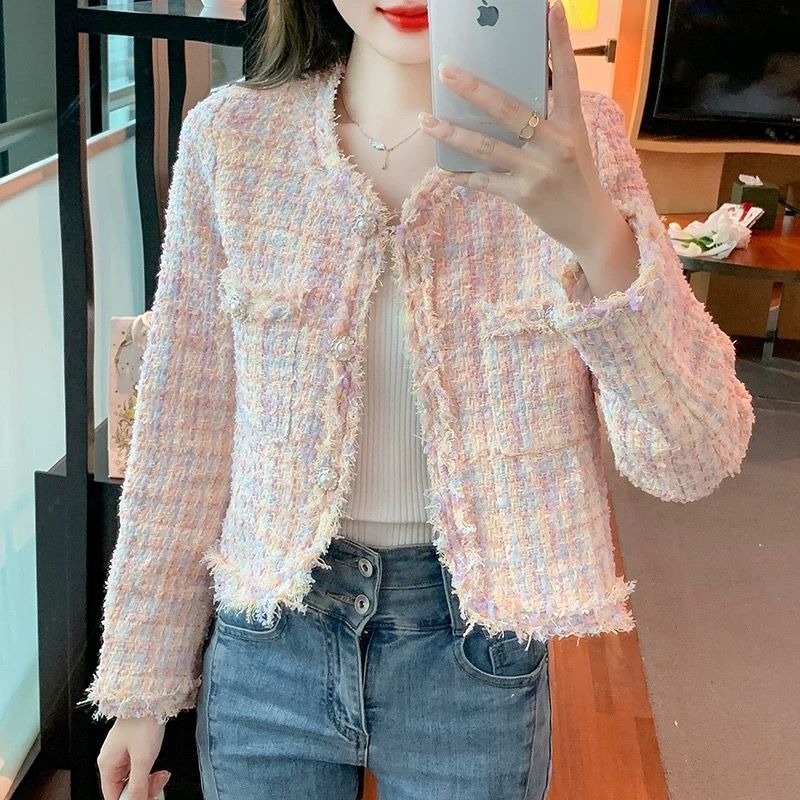 MY14679# 新款高档小香风外套 碎边五彩粉 宽松百搭外贸爆款女裝貨源服裝批發