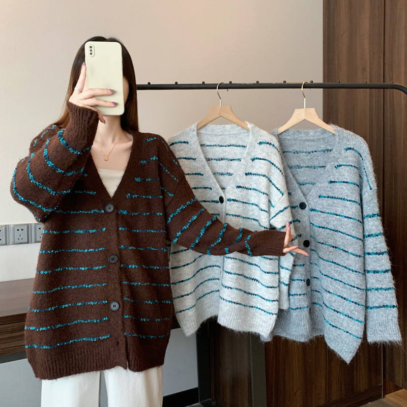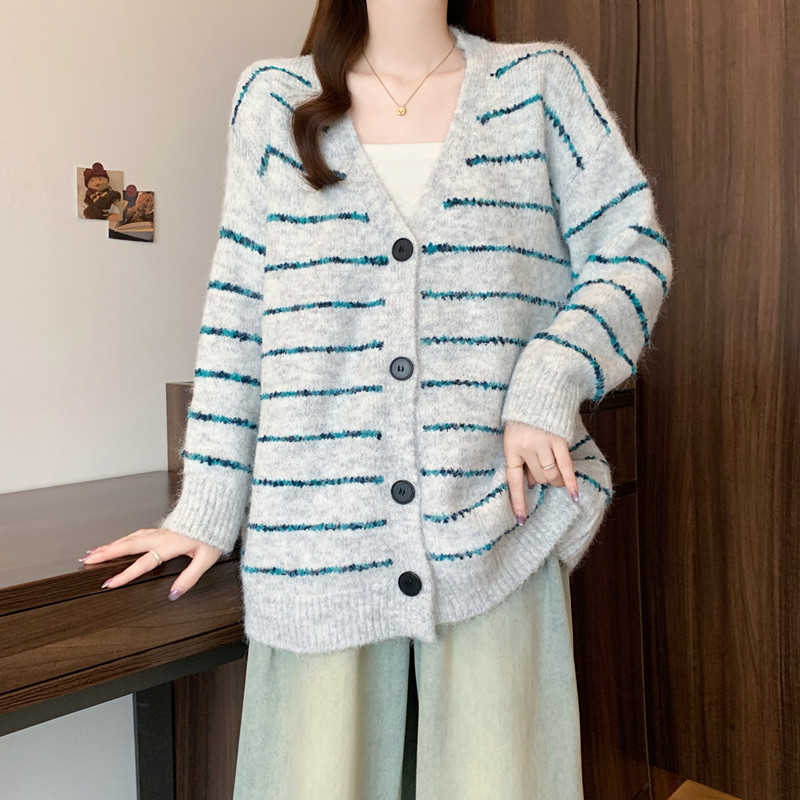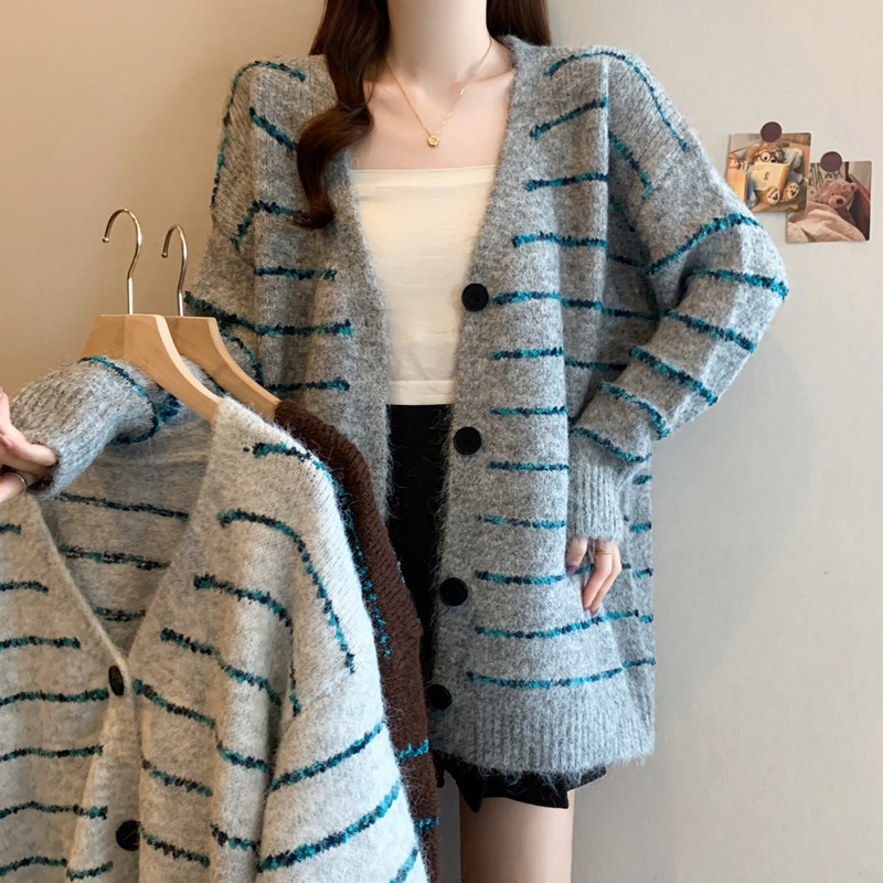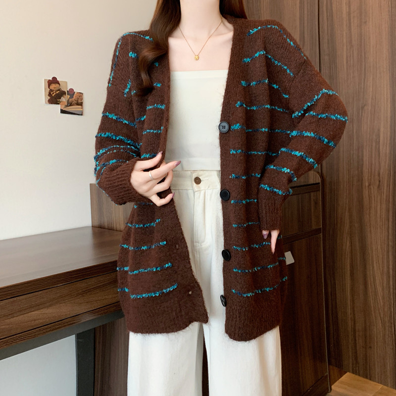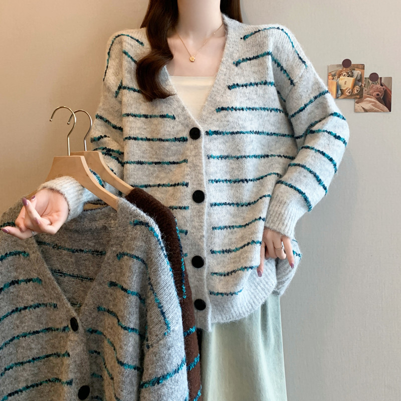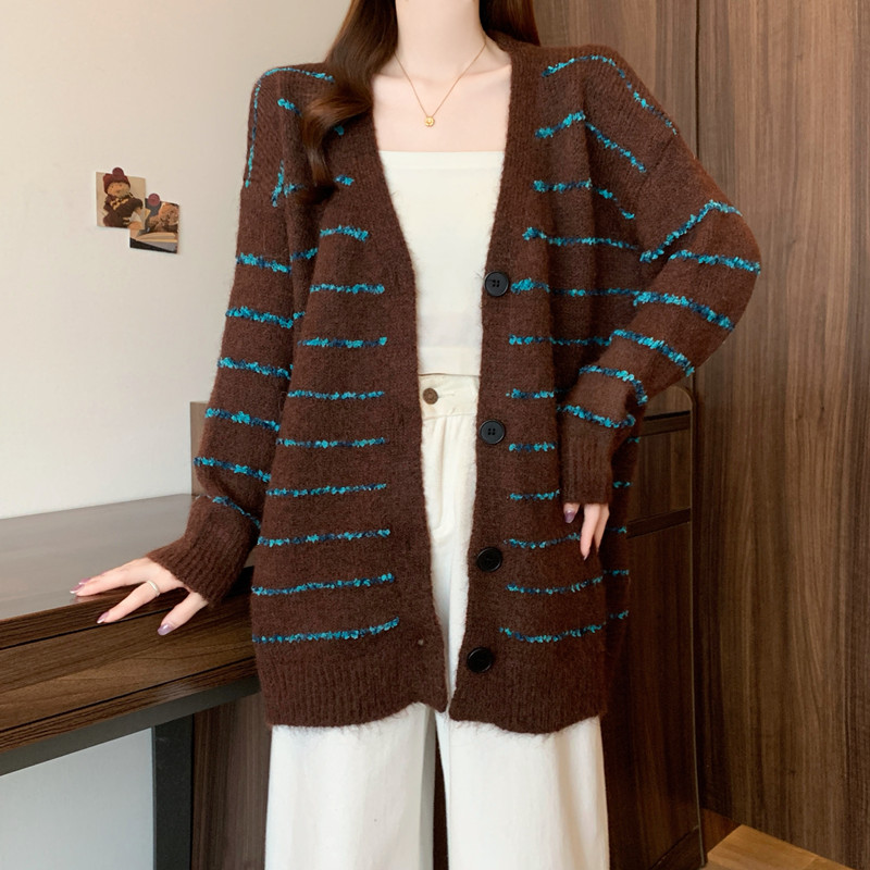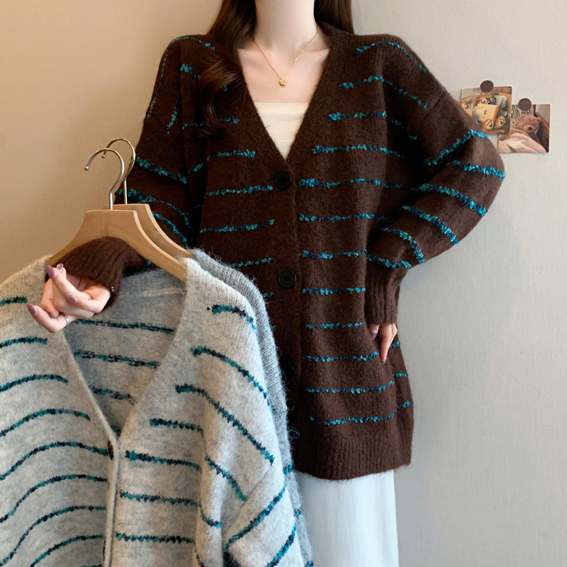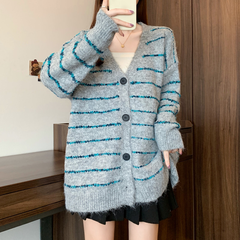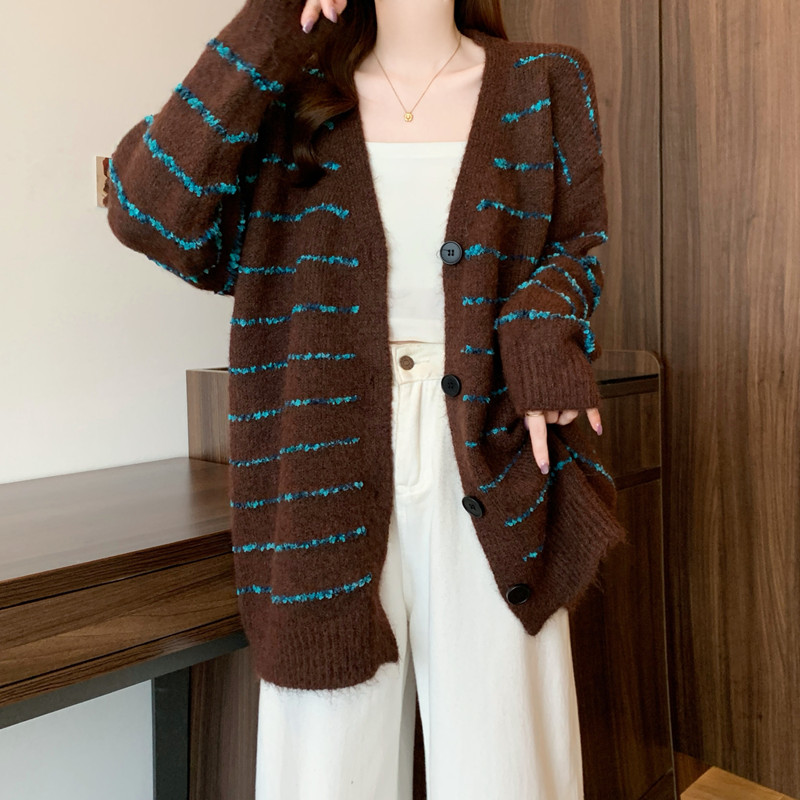 MY14687# 大码女装复古彩带条纹开衫毛衣设计感宽松针织慵懒风外套女裝貨源服裝批發