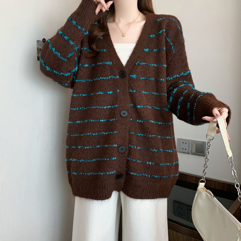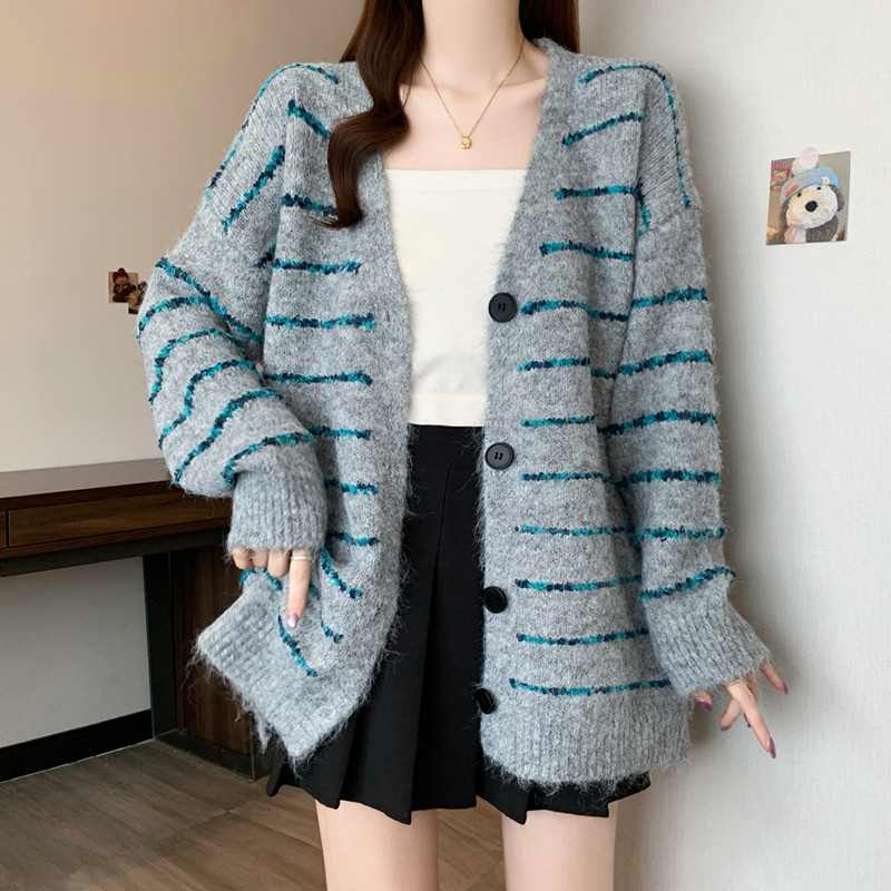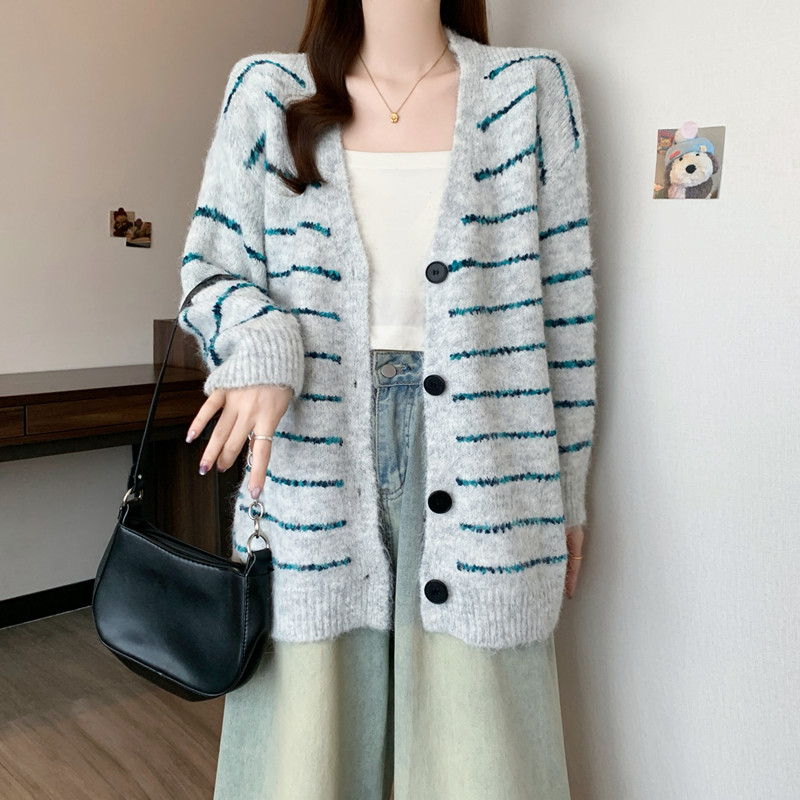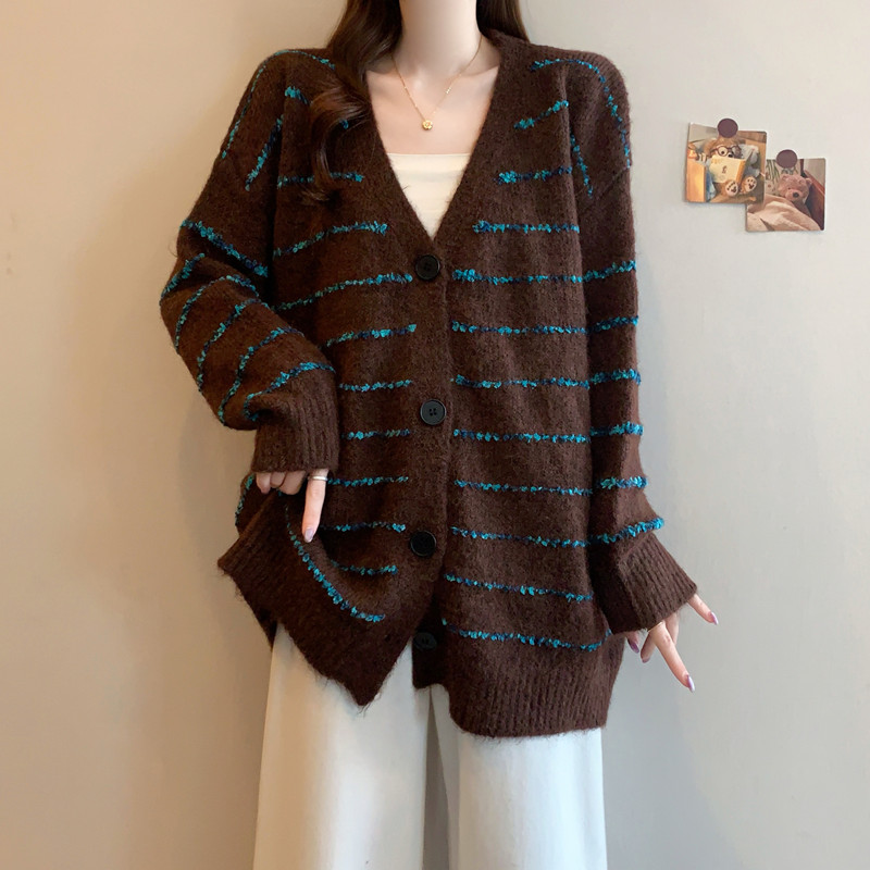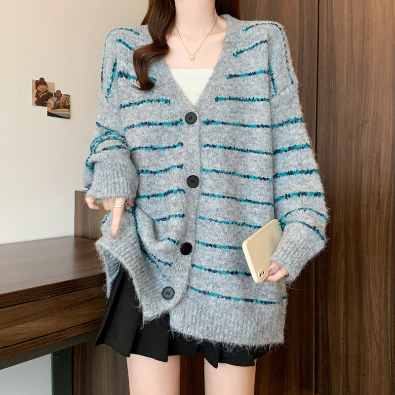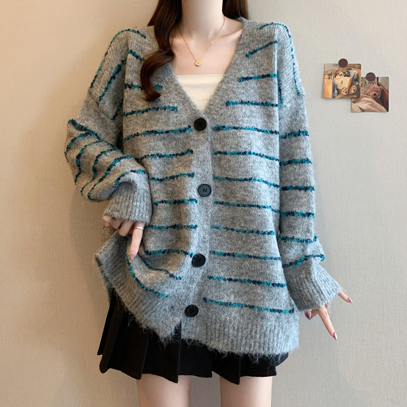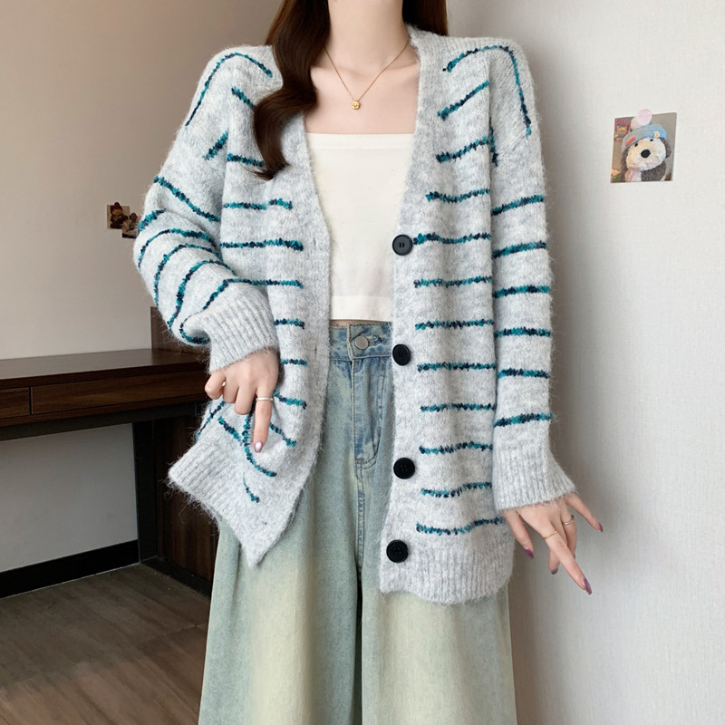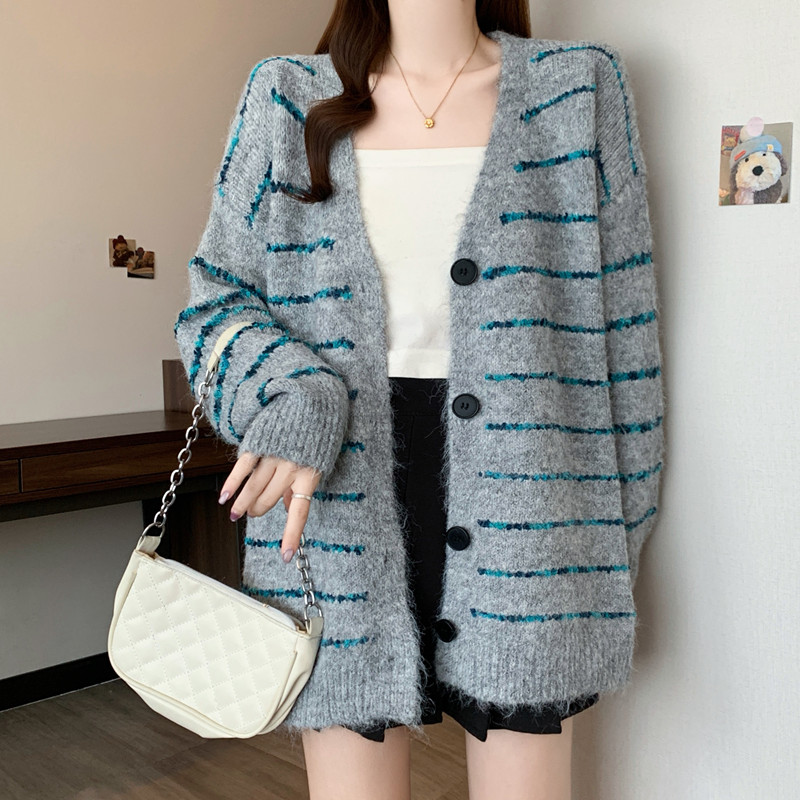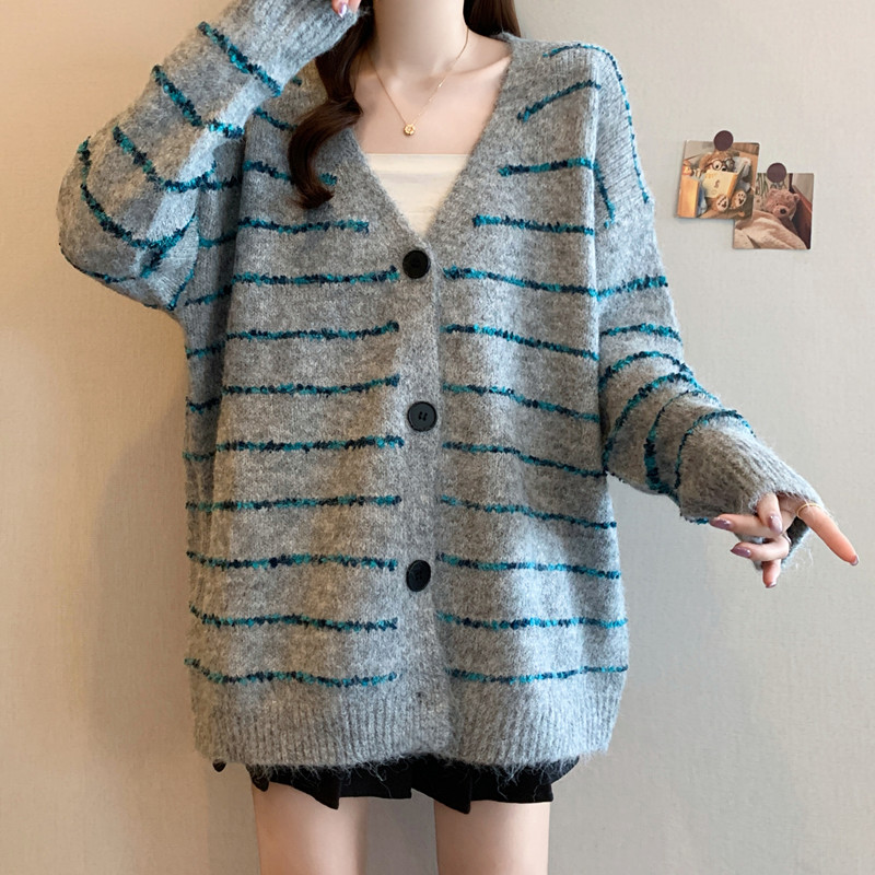 MY14687# 大码女装复古彩带条纹开衫毛衣设计感宽松针织慵懒风外套女裝貨源服裝批發