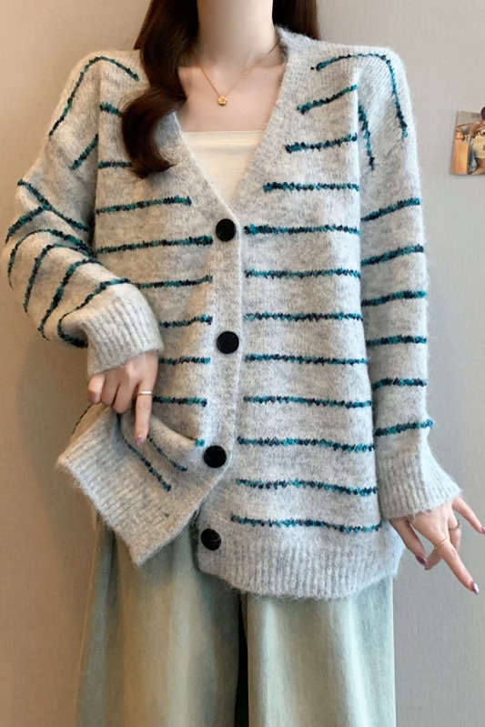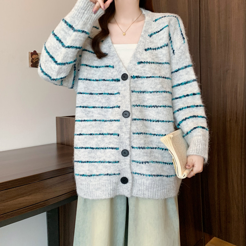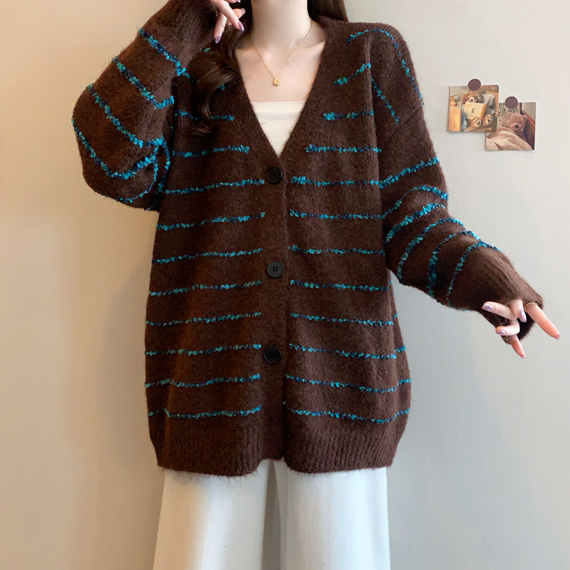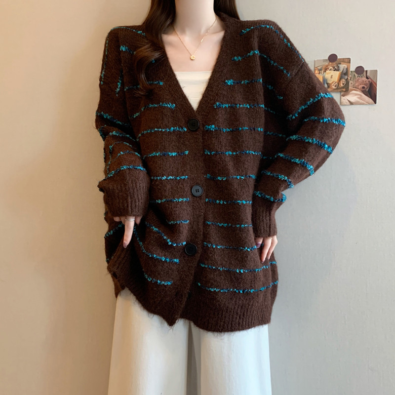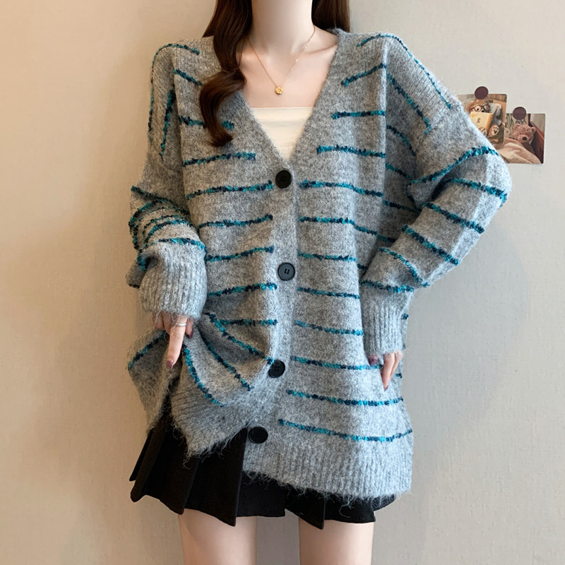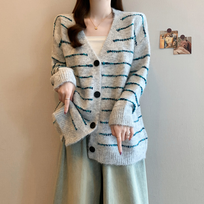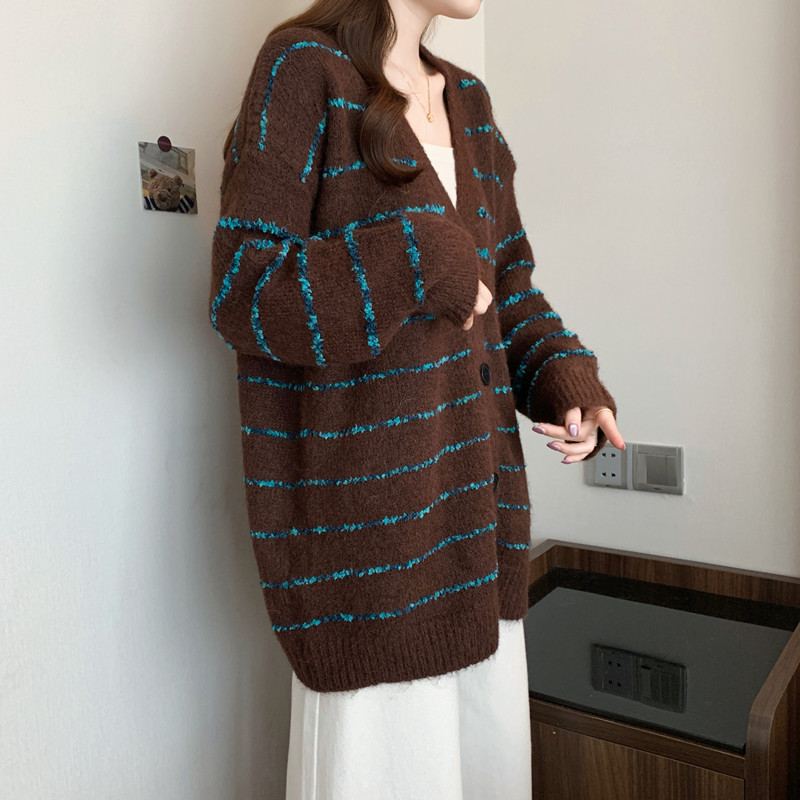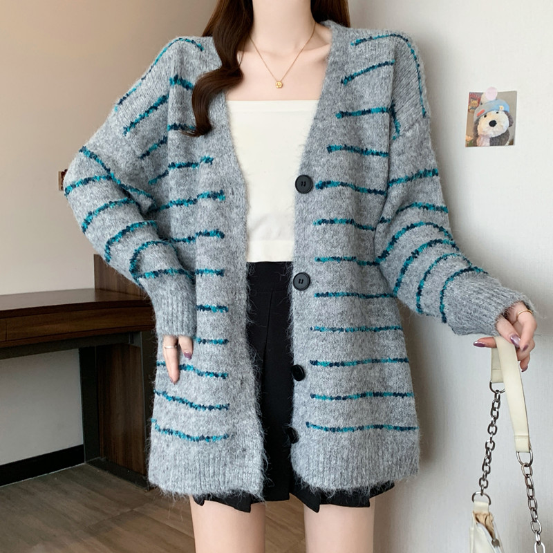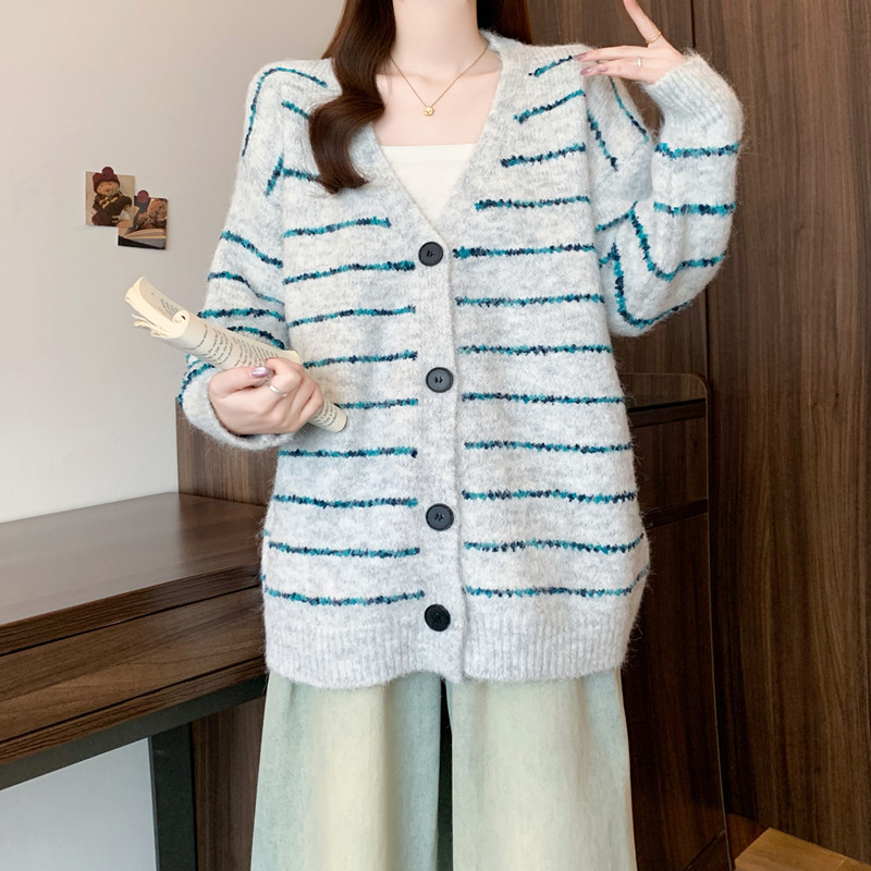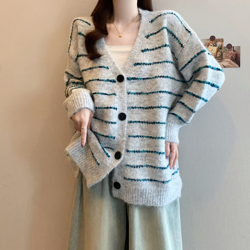 MY14687# 大码女装复古彩带条纹开衫毛衣设计感宽松针织慵懒风外套女裝貨源服裝批發