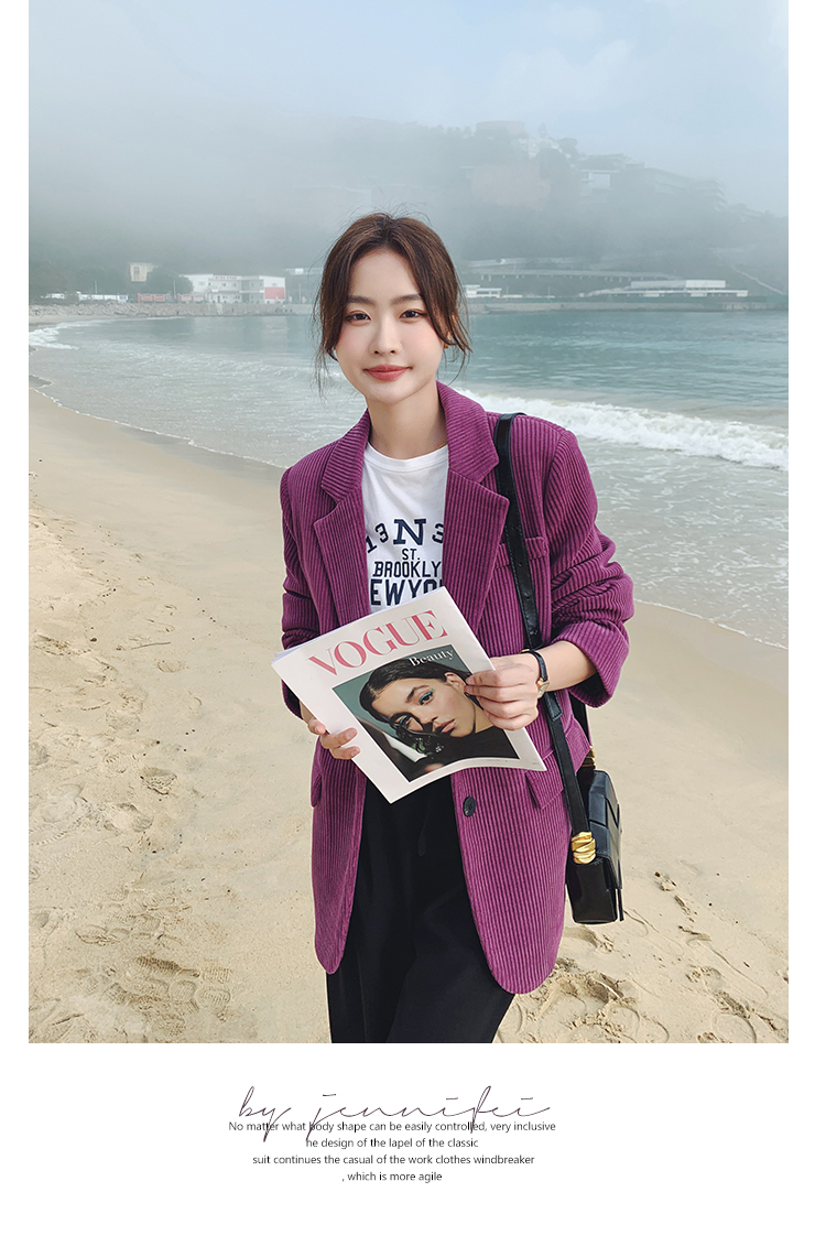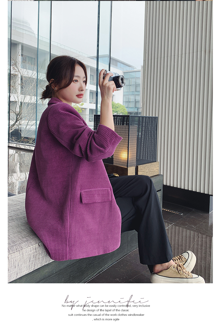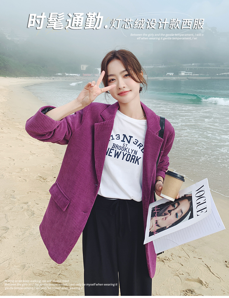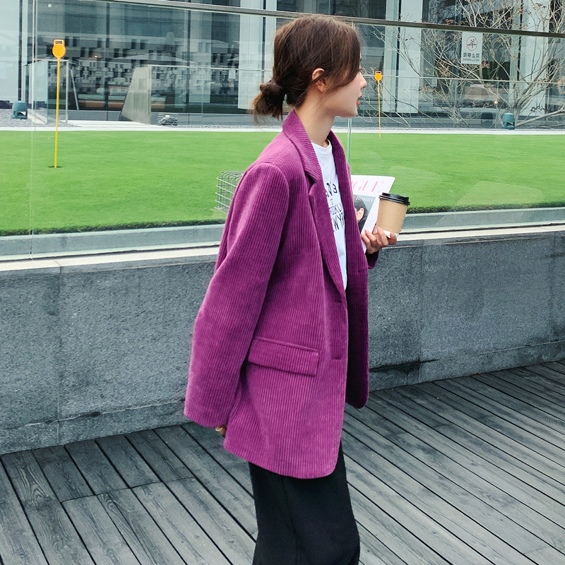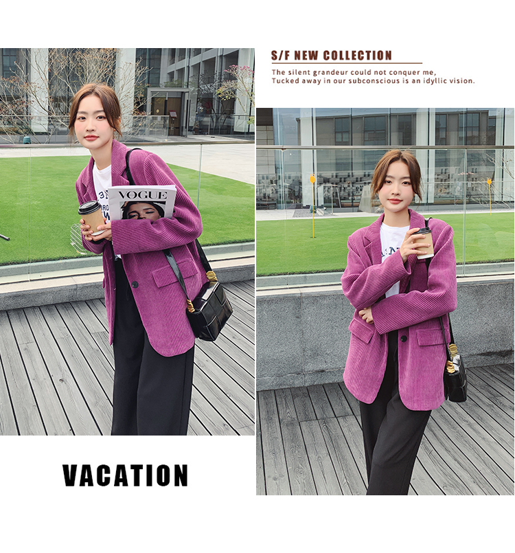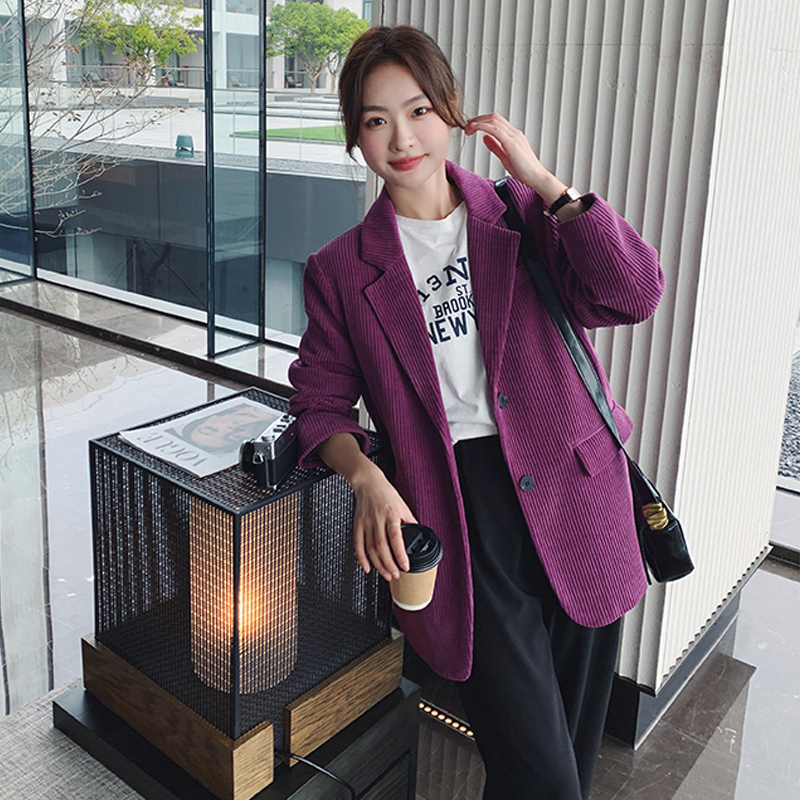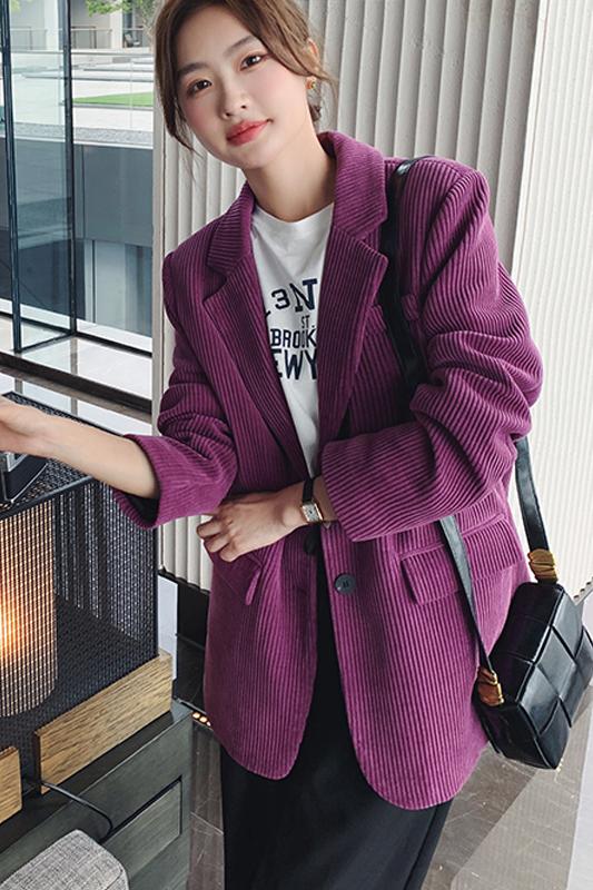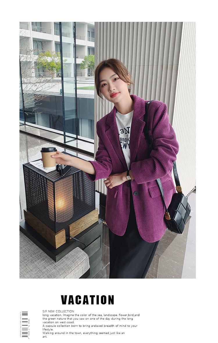 MY14691# 紫色灯芯绒西装外套新款秋冬小个子复古宽松休闲咖色小西服女裝貨源服裝批發