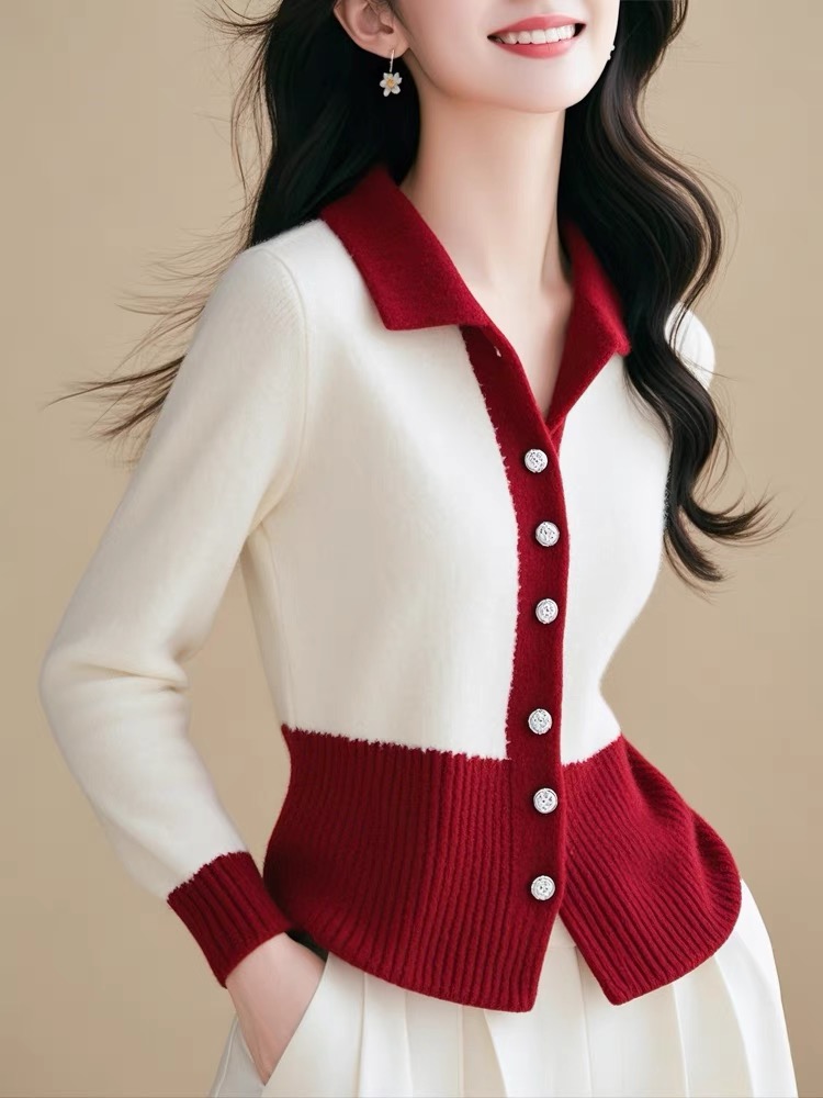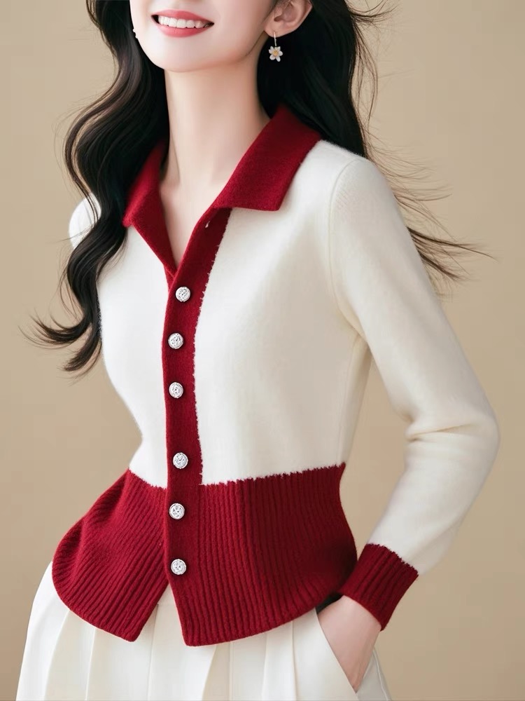 MY14695# 时尚精致优雅风红白撞色翻领长袖毛针织开衫好看软糯小衫女裝貨源服裝批發
